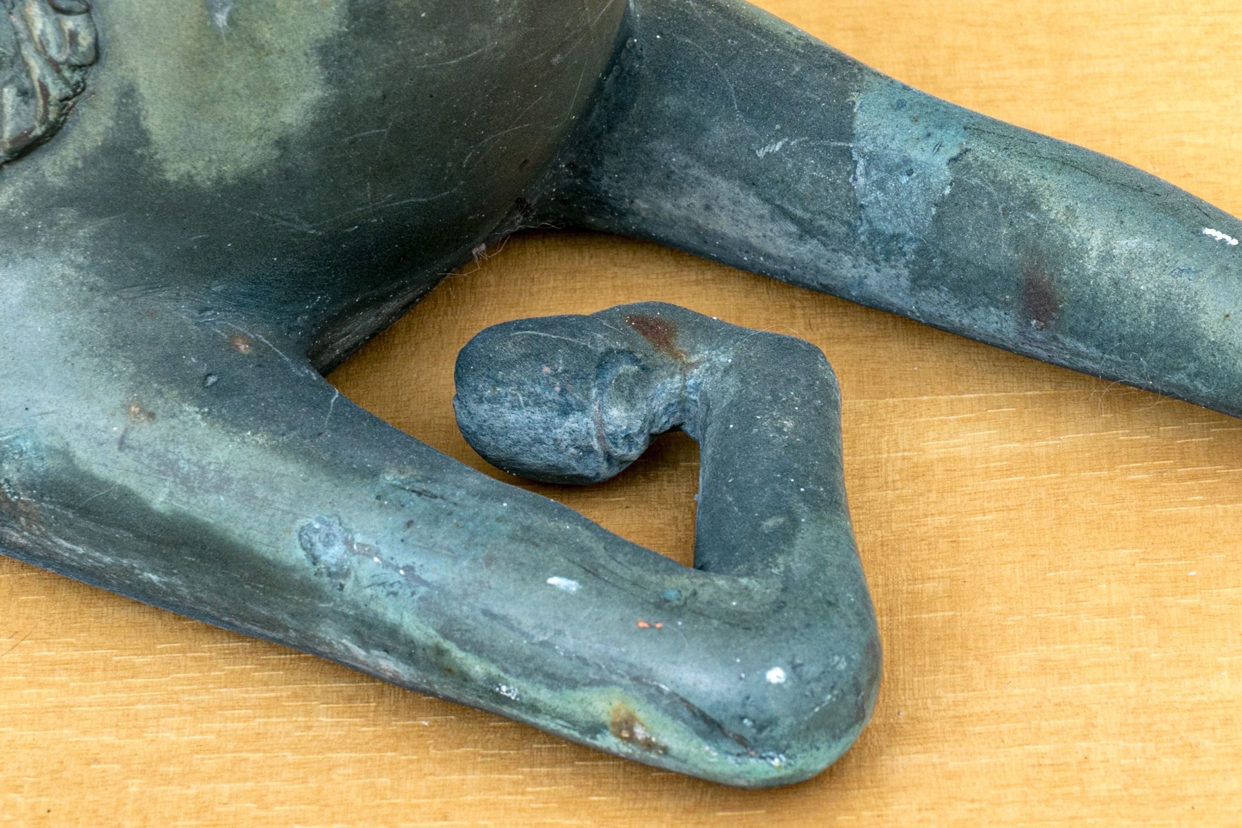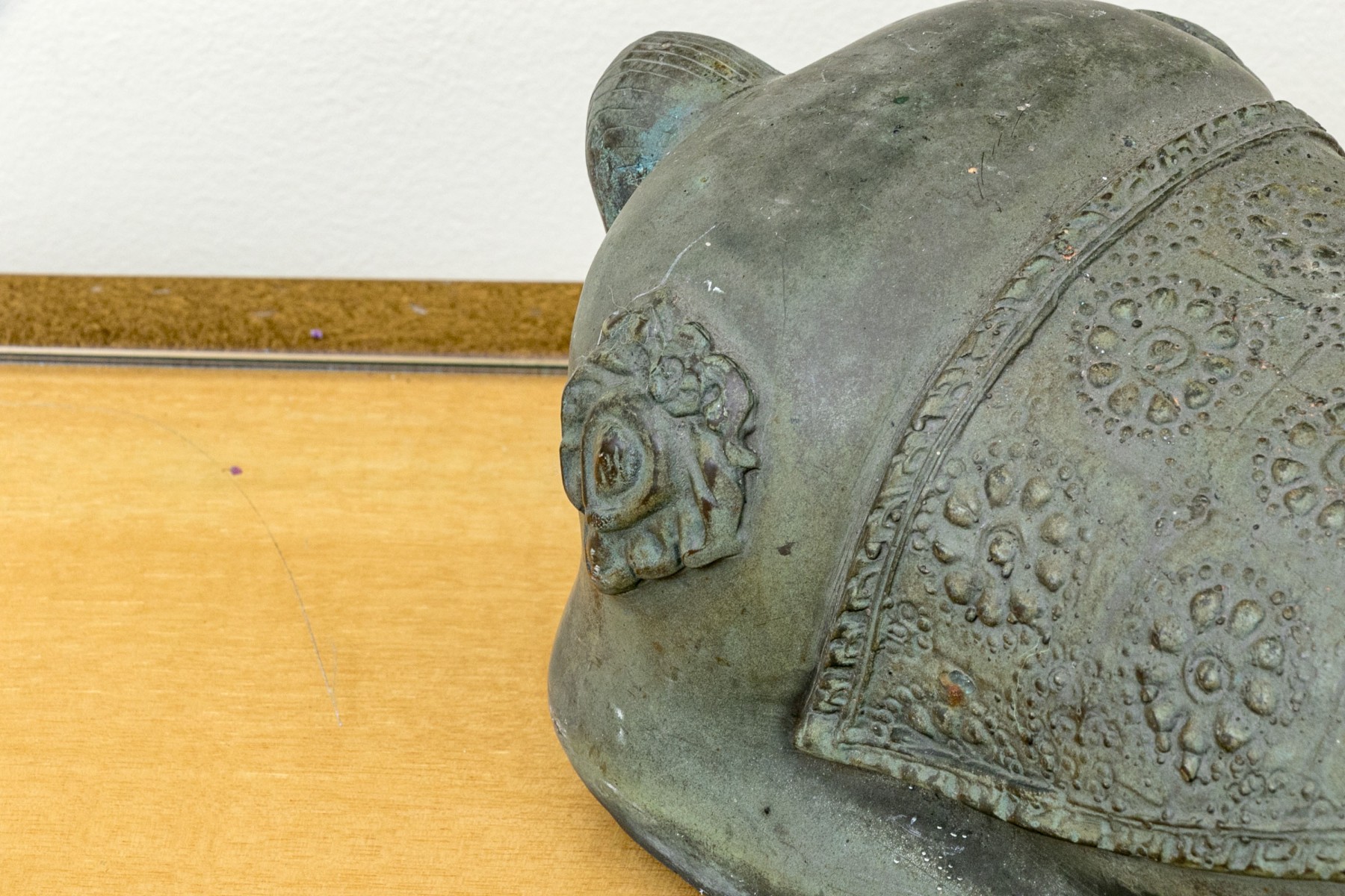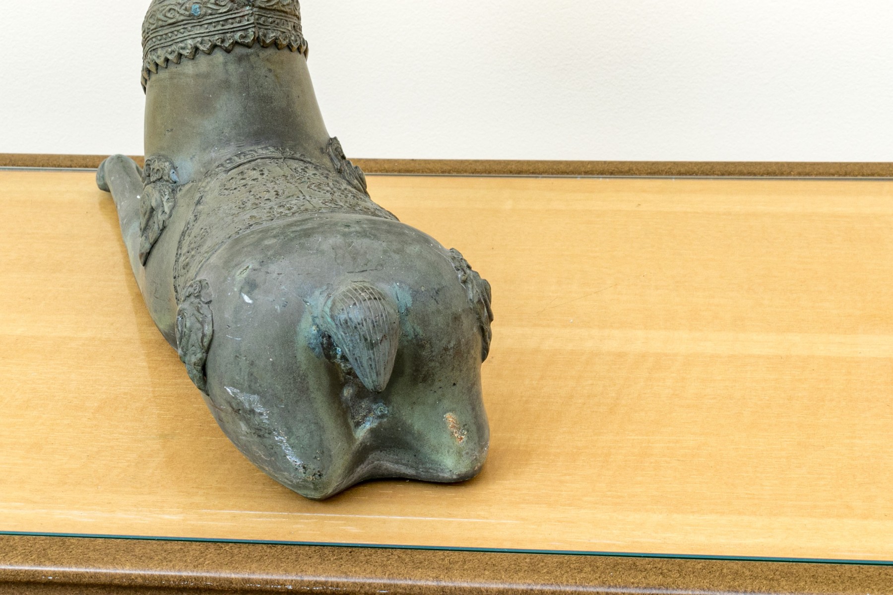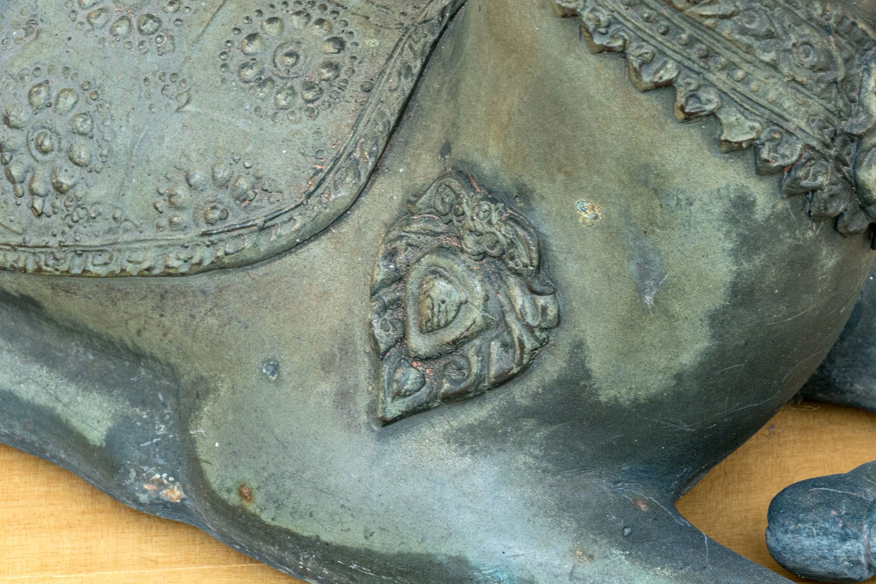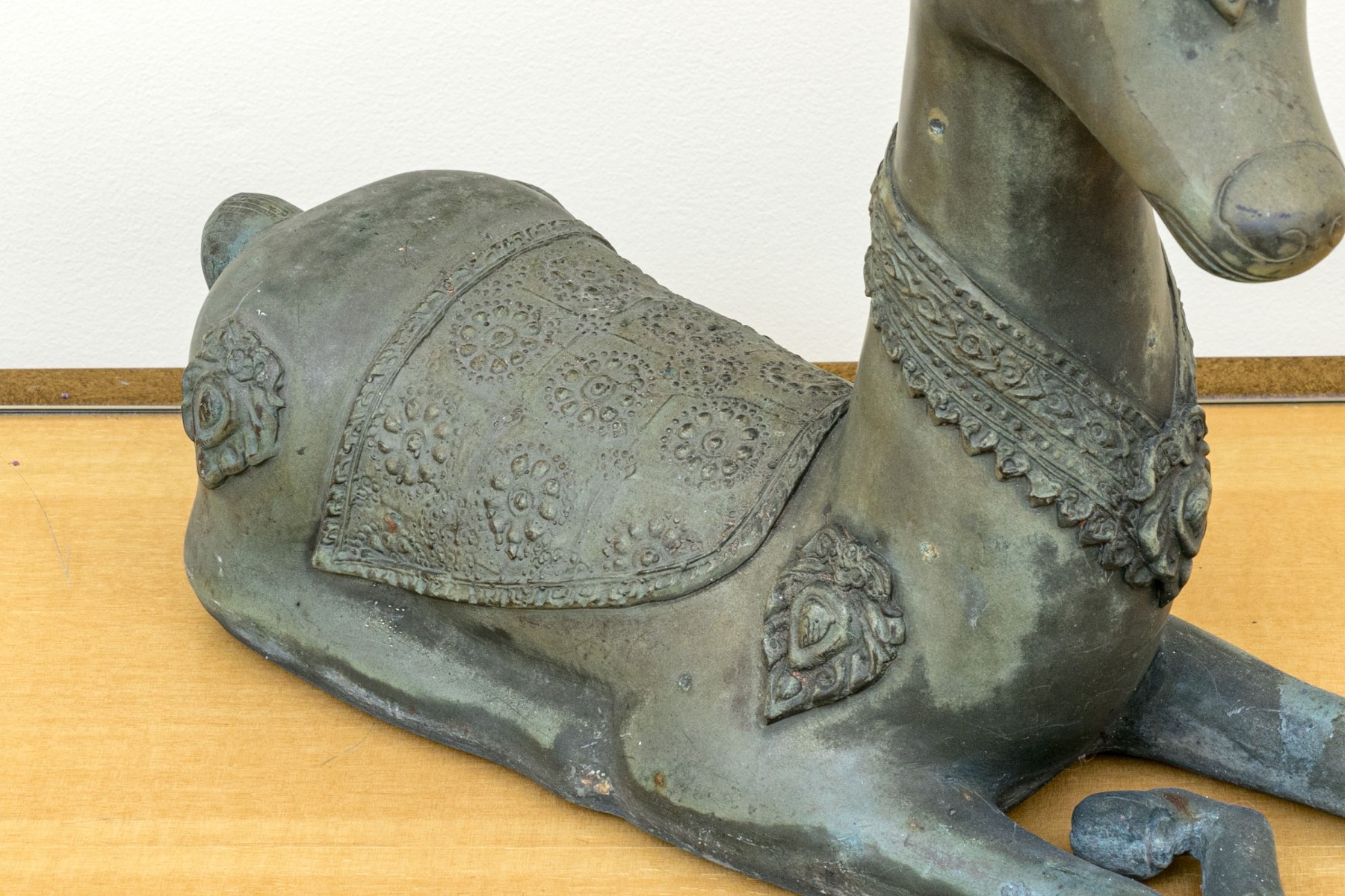 A beautiful Asian brass sculpture of a deer or antelope in a relaxed recumbent pose. Tall, impressively pointed horns are decorated with stippled bands around the bases, complimenting decorative relief on the forehead, neck, and back. Beautifully detailed and finished in an antiqued patina.