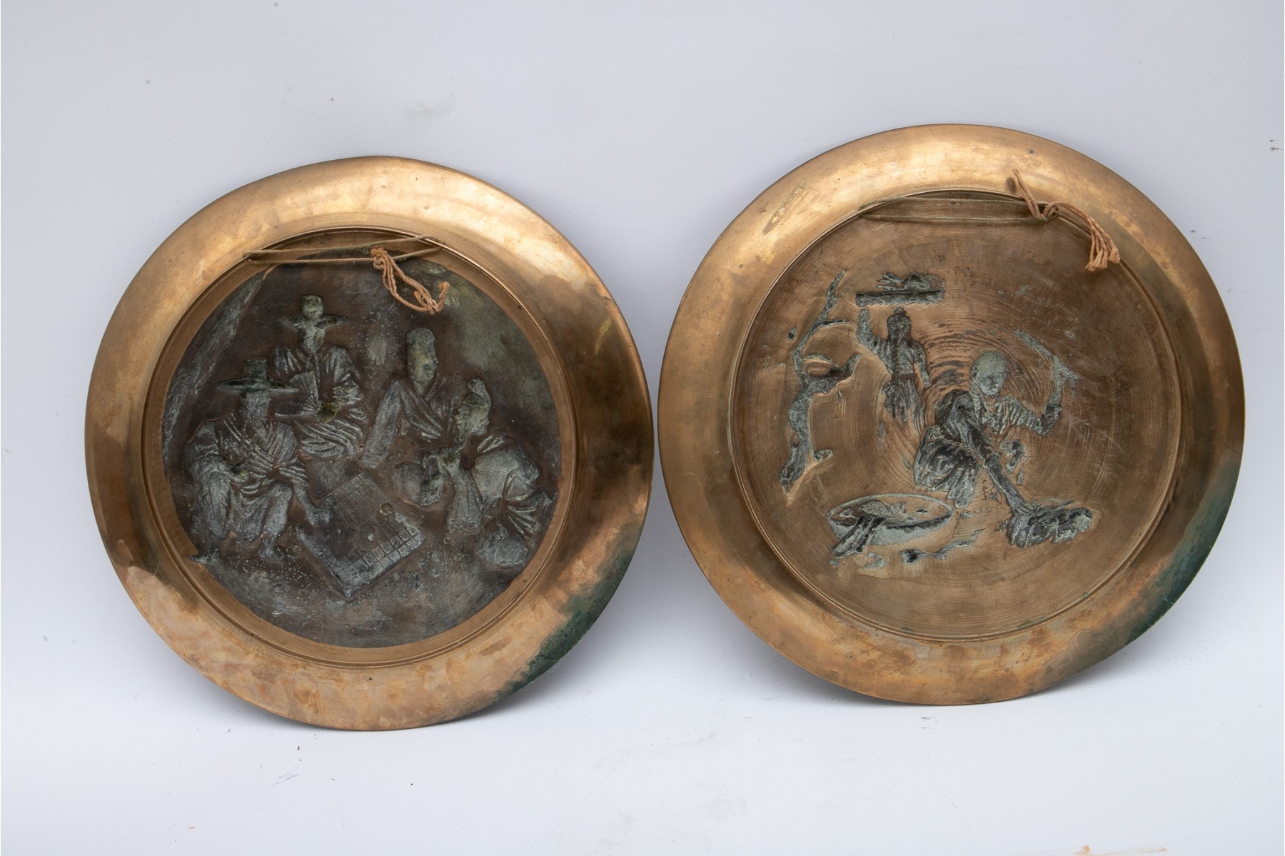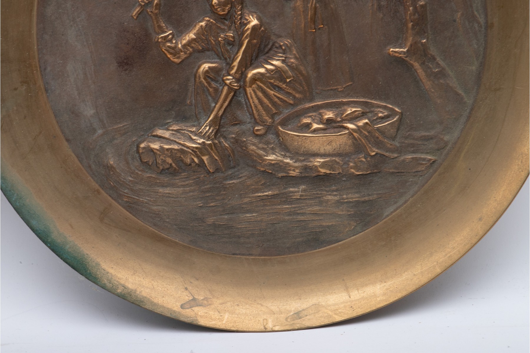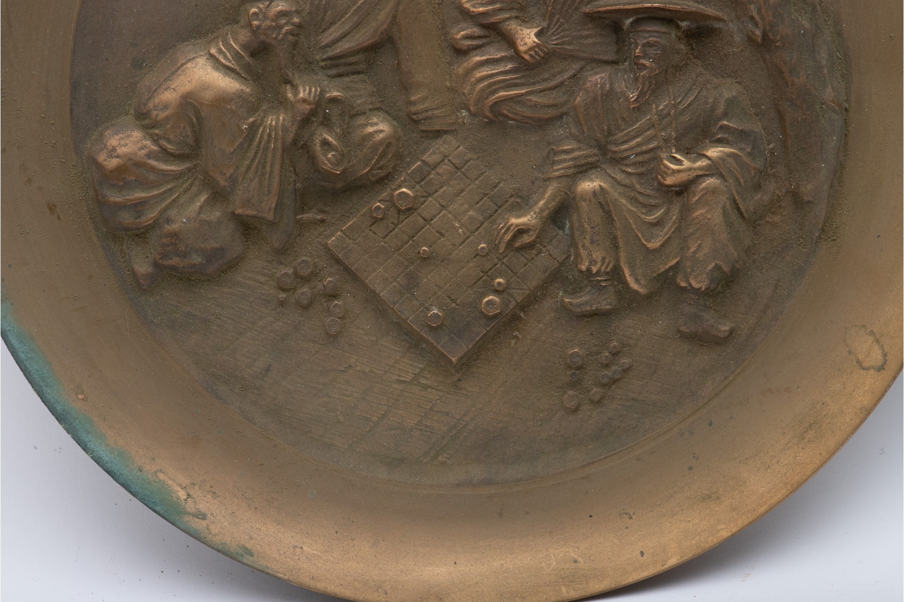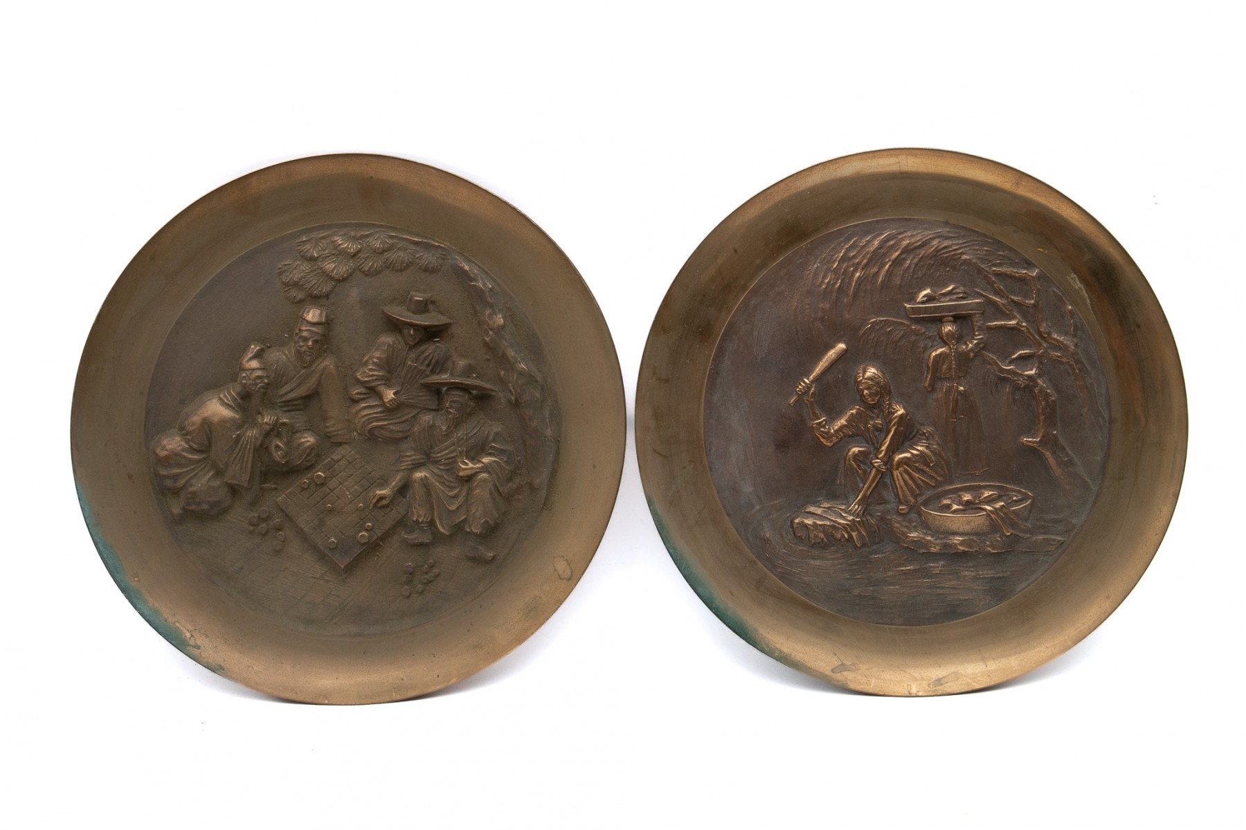 Pair of vintage Asian heavy brass wall chargers with beautifully detailed relief, likely Korean. The first features a scene of women washing laundry in a river, while the other depicts men playing a game while seated under a pine tree.