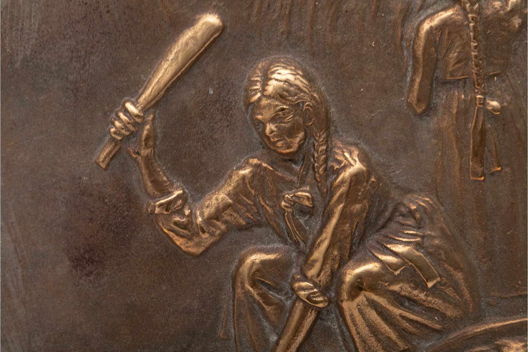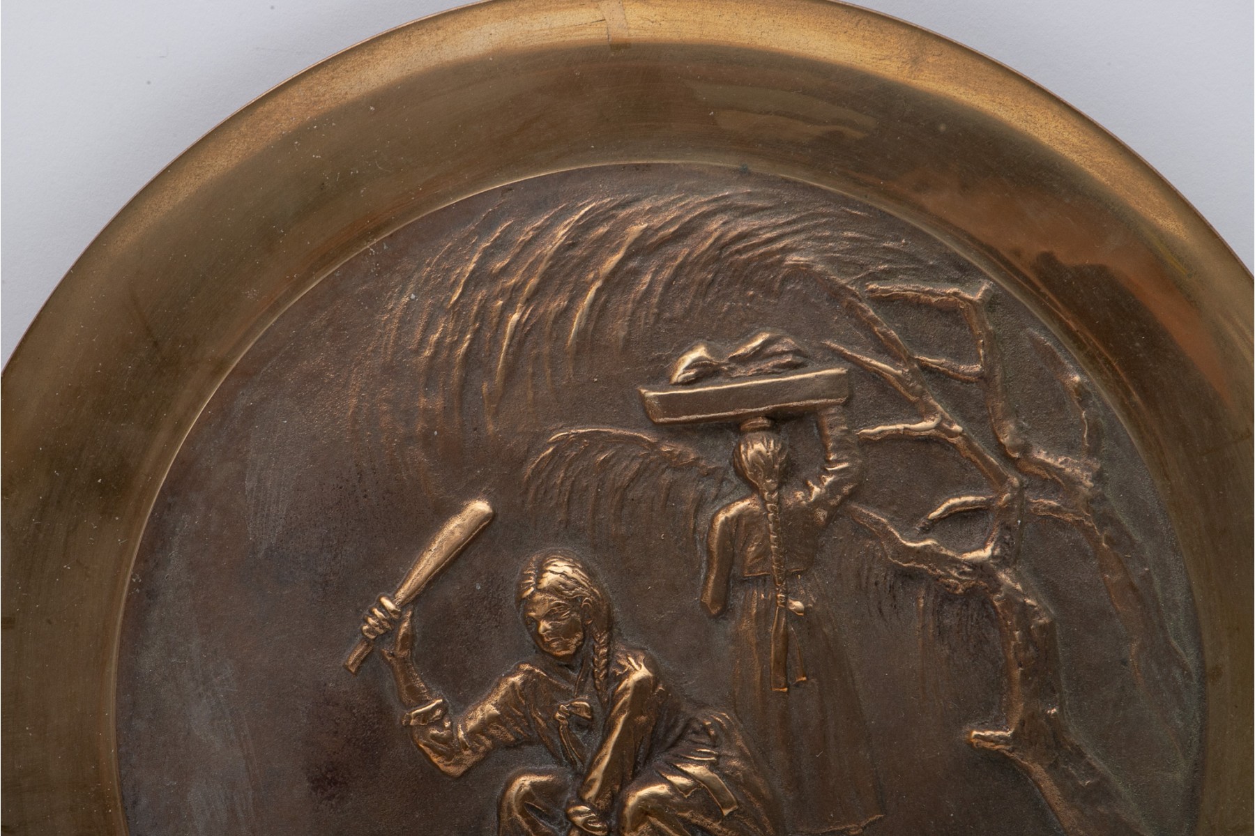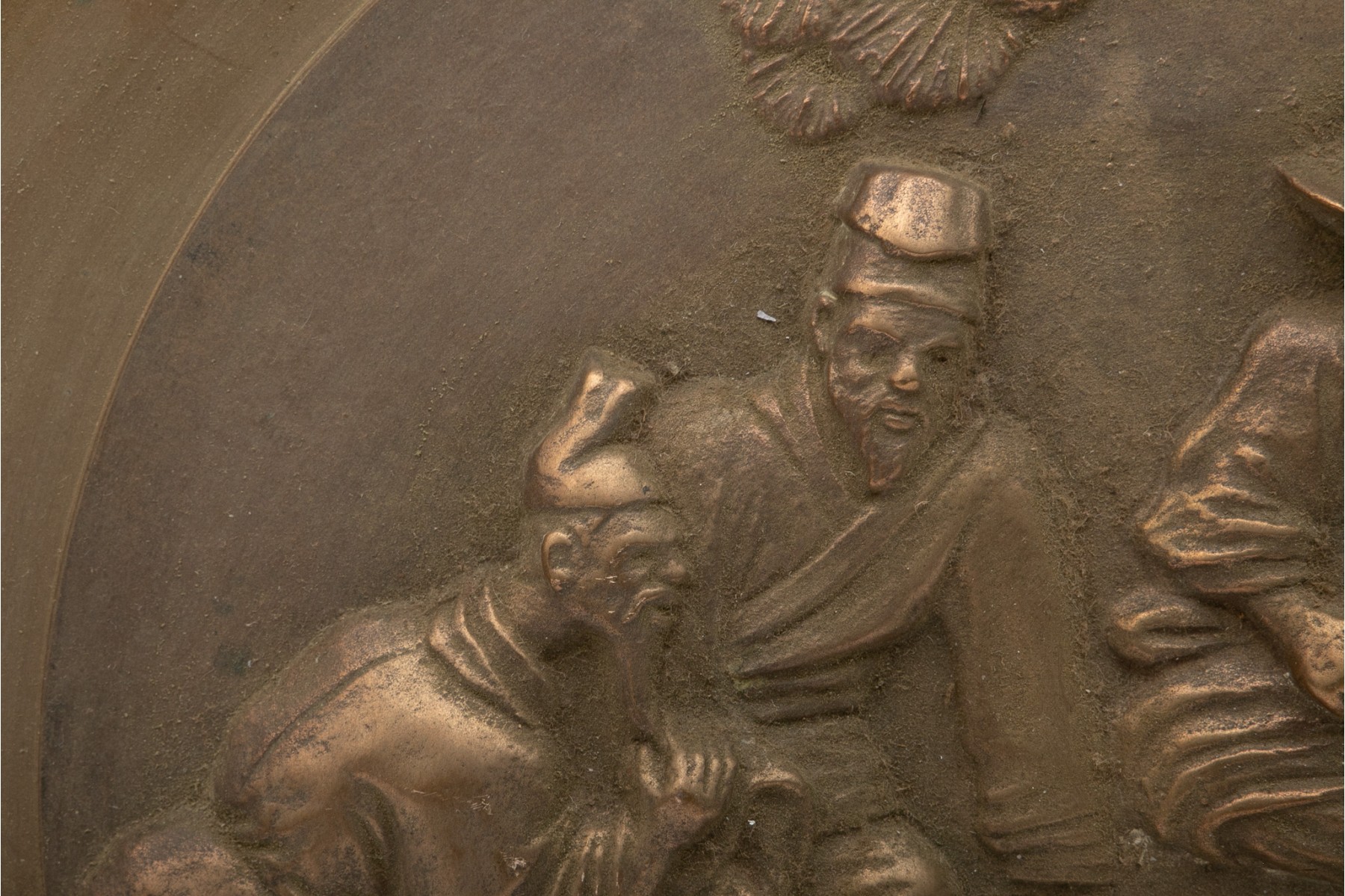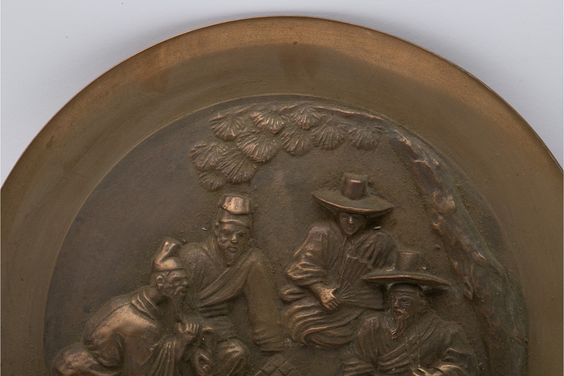 Pair of vintage Asian heavy brass wall chargers with beautifully detailed relief, likely Korean. The first features a scene of women washing laundry in a river, while the other depicts men playing a game while seated under a pine tree.