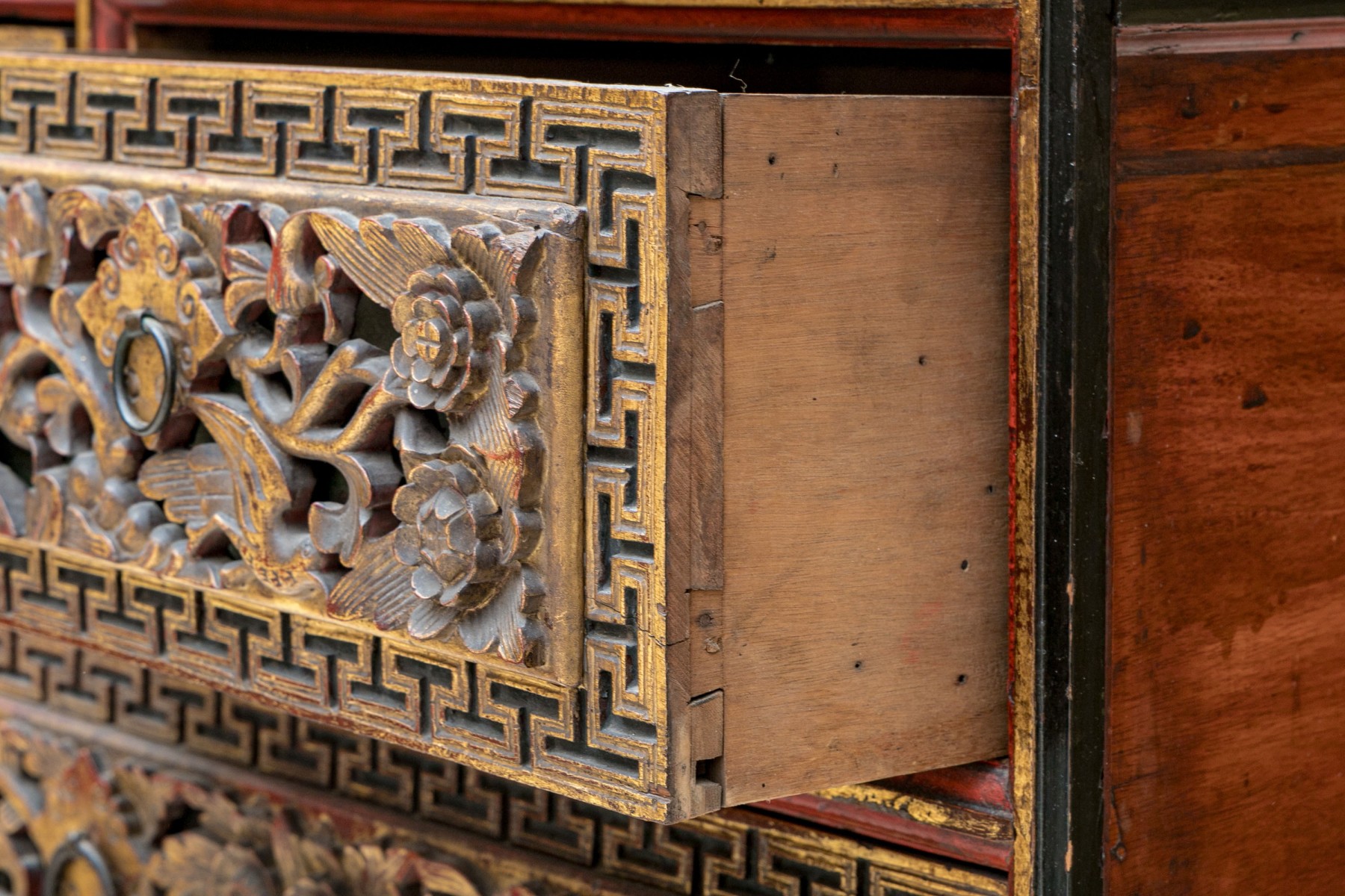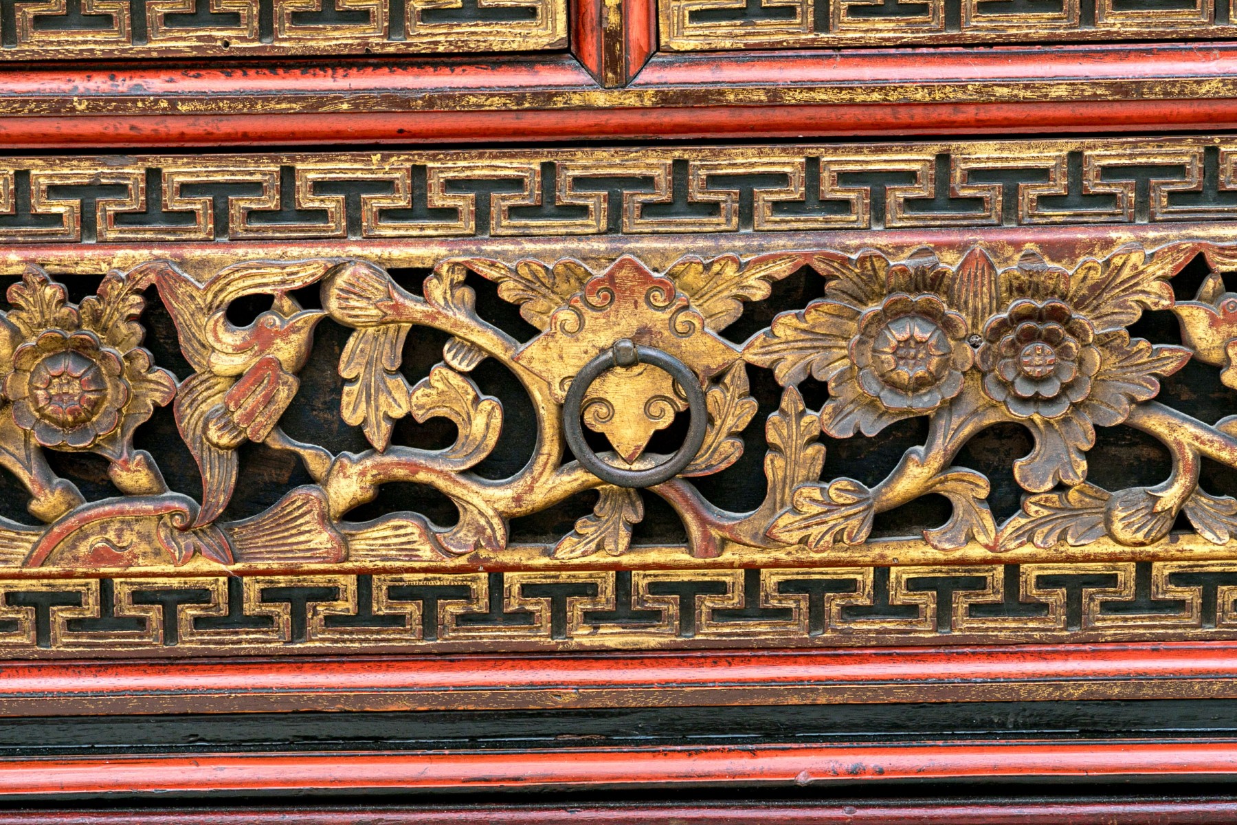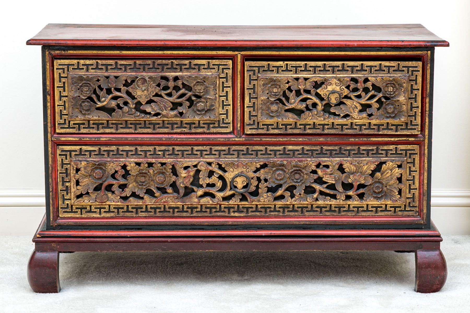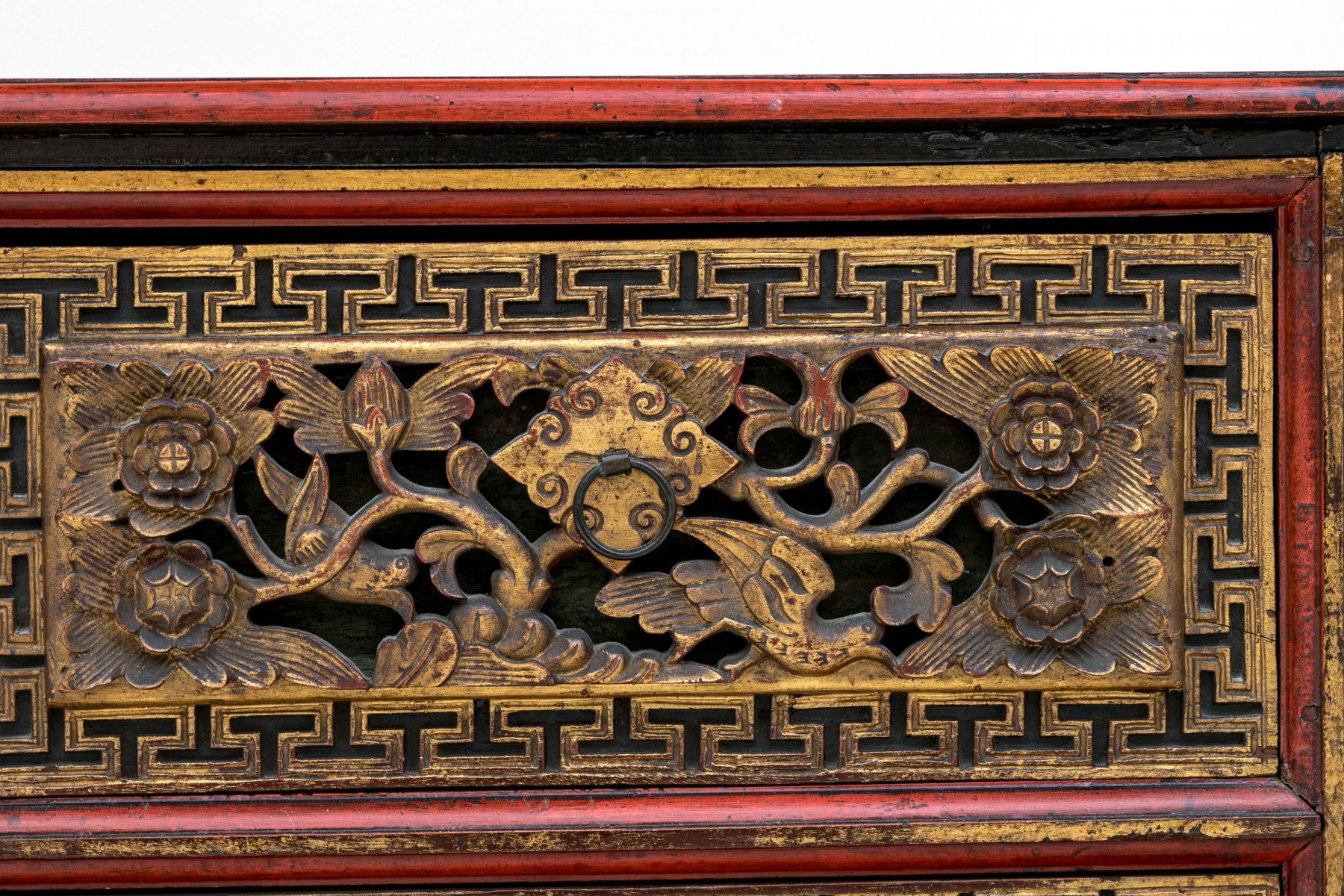 Carved and gilt finished drawer fronts with greek key / keyfret embellished trim borders.