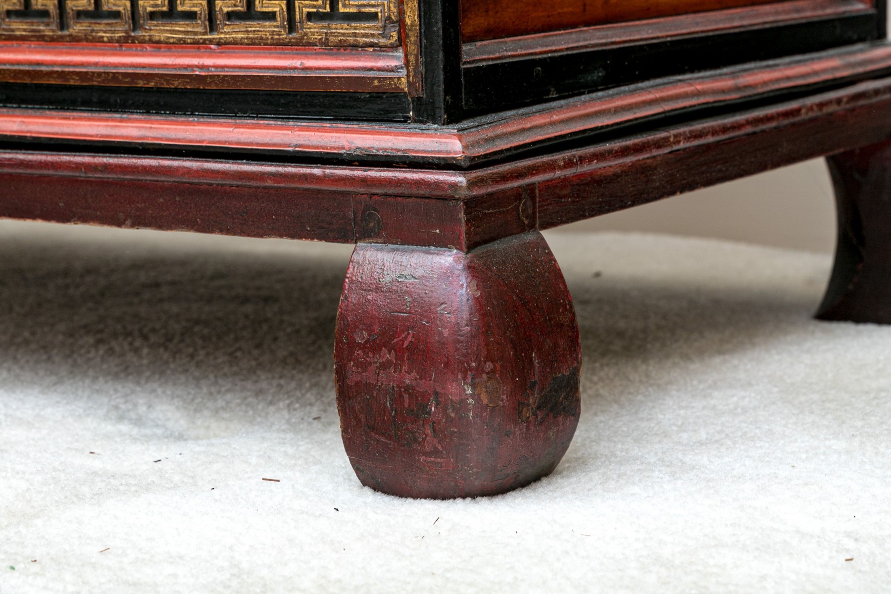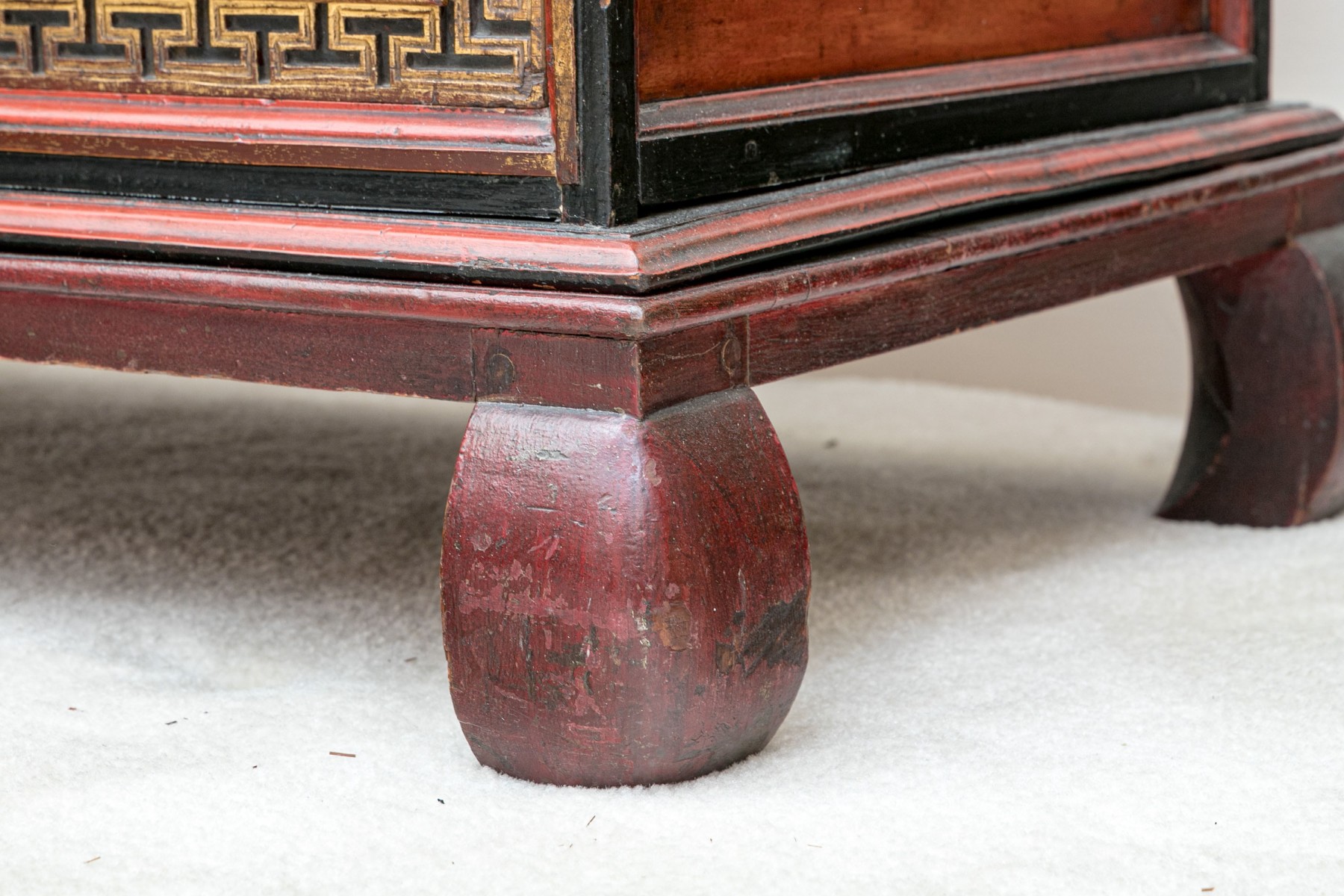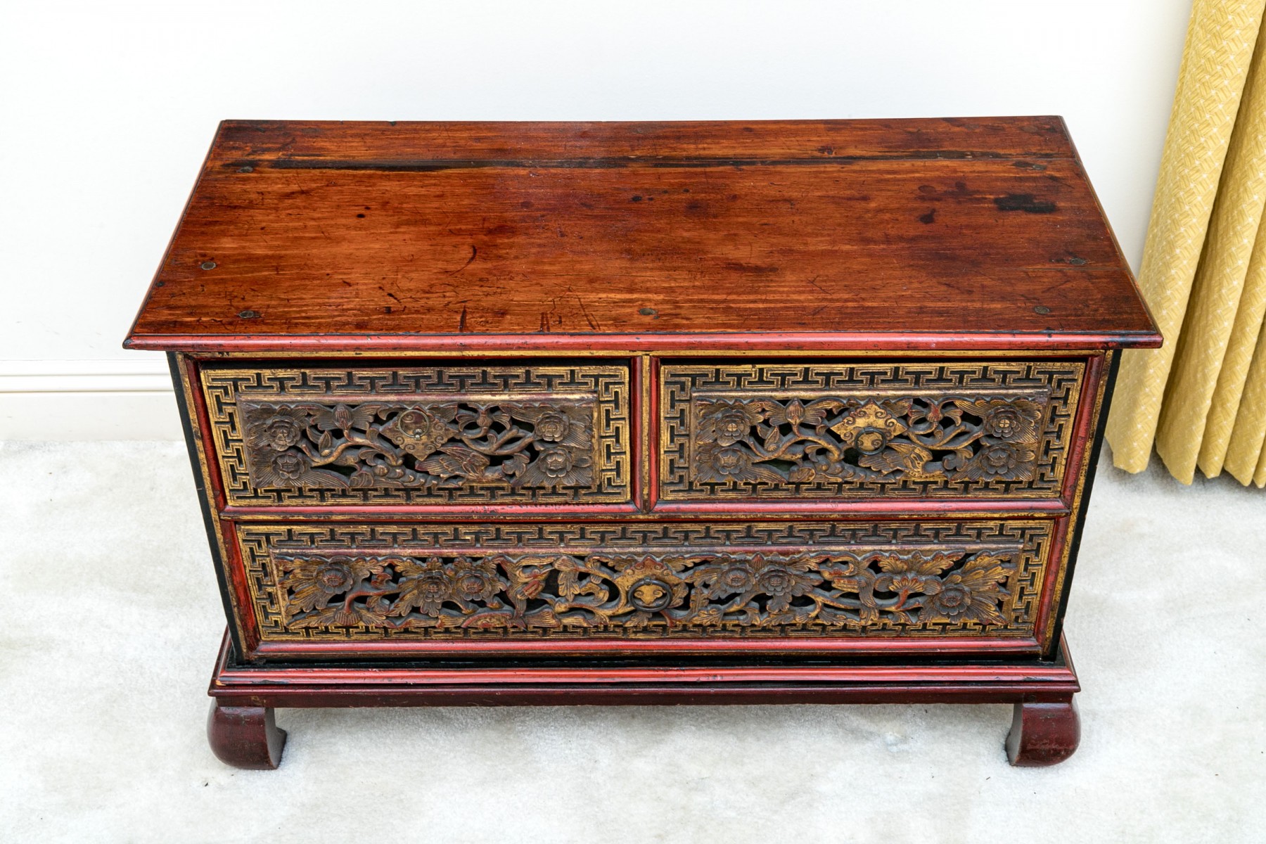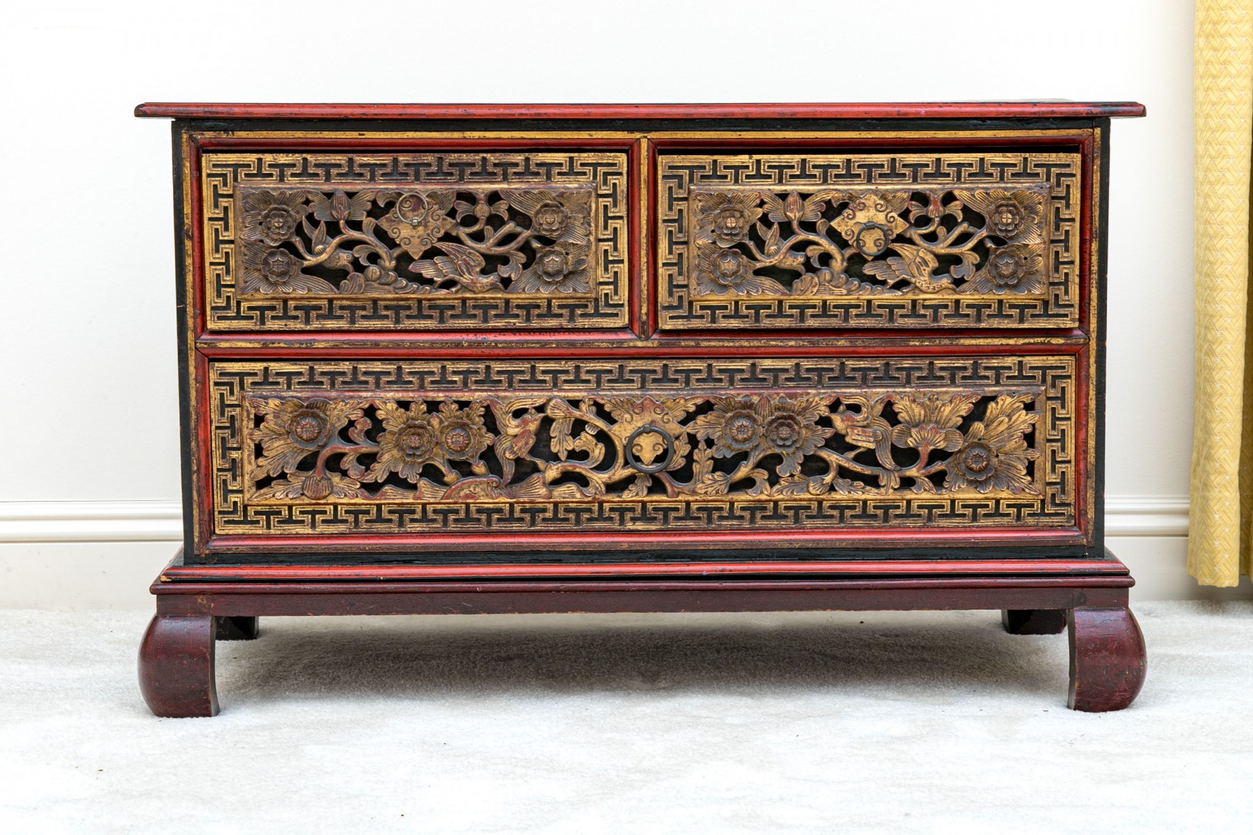 Carved and gilt finished drawer fronts with greek key / keyfret embellished trim borders.