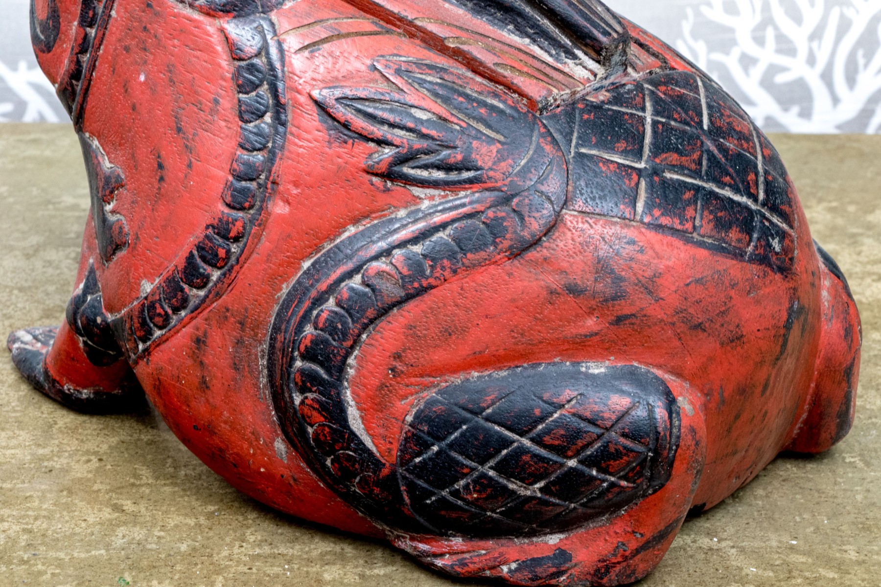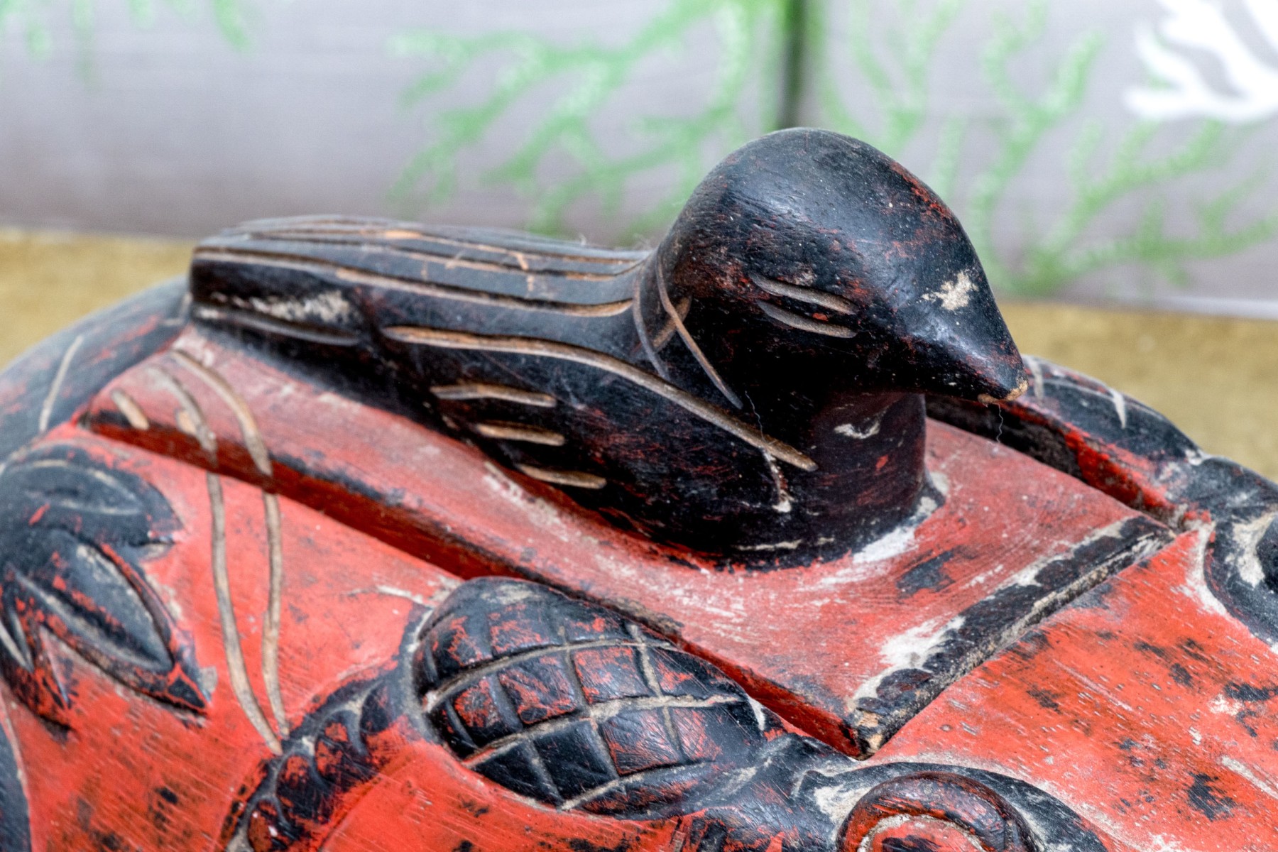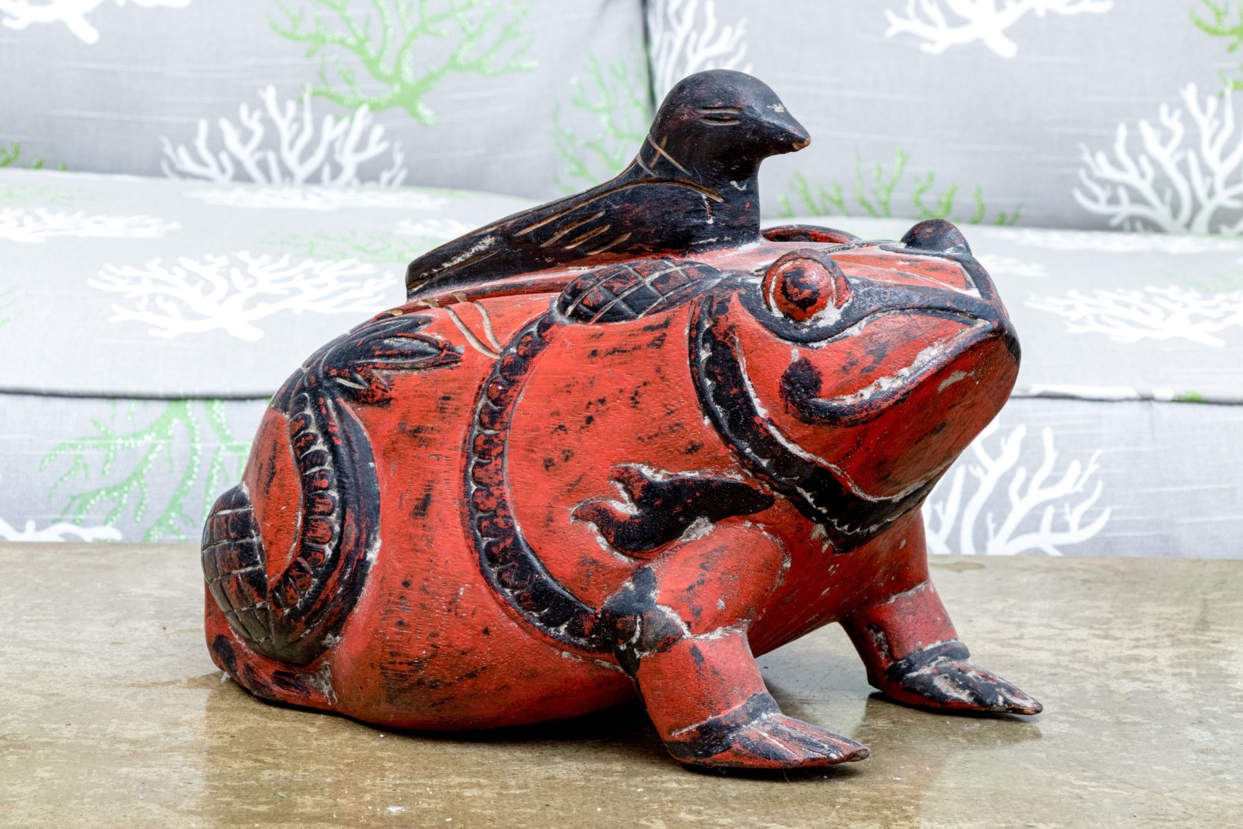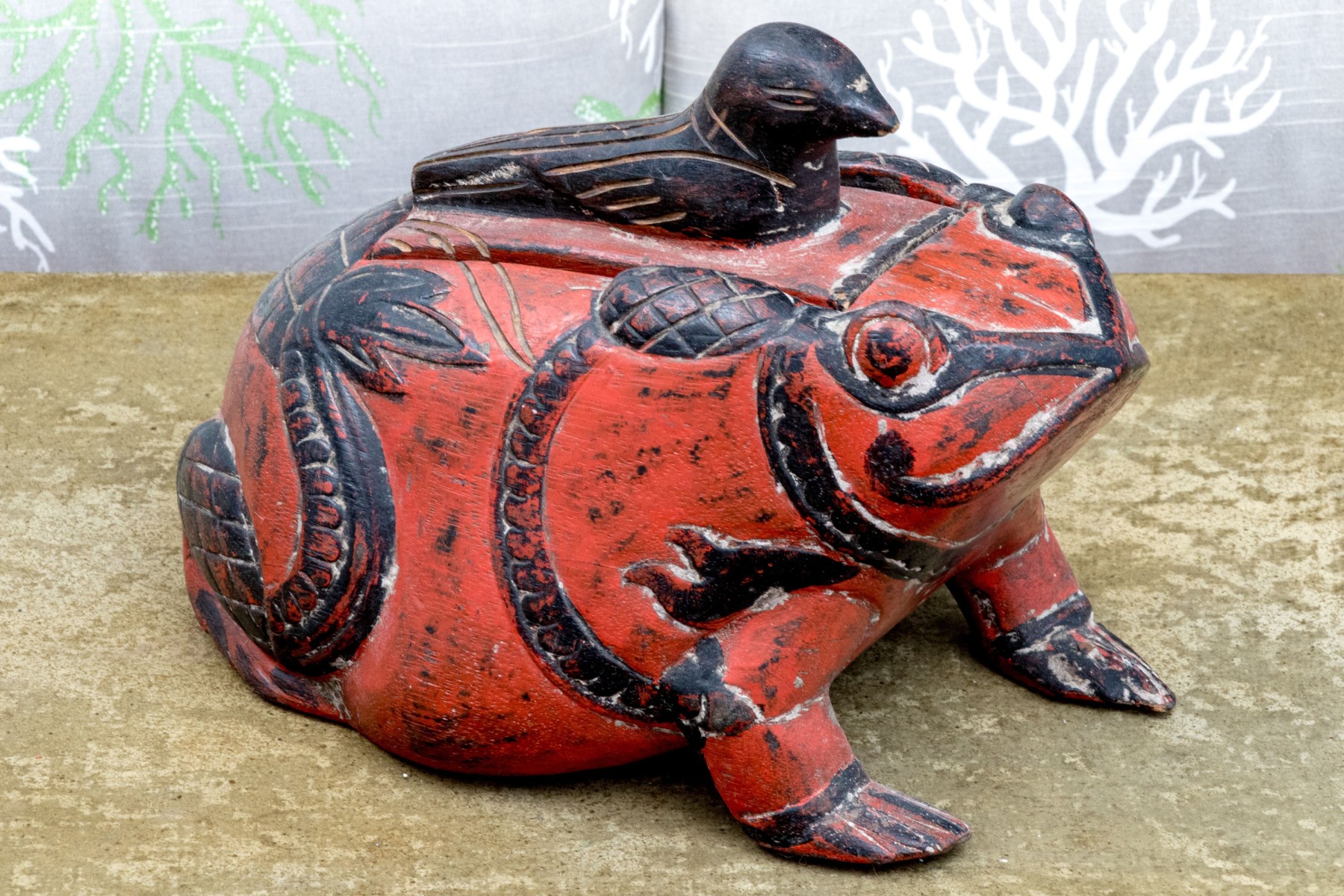 A fabulous first half 20th century south or southeastern Asian carved wood box in the form of a black bird seated atop a rotund, auspicious toad. The bird acts as a handle to lift the lid off of the rectangular storage space within, while the toad is lacquered vibrant orange-red and carved with winding black foliage throughout.