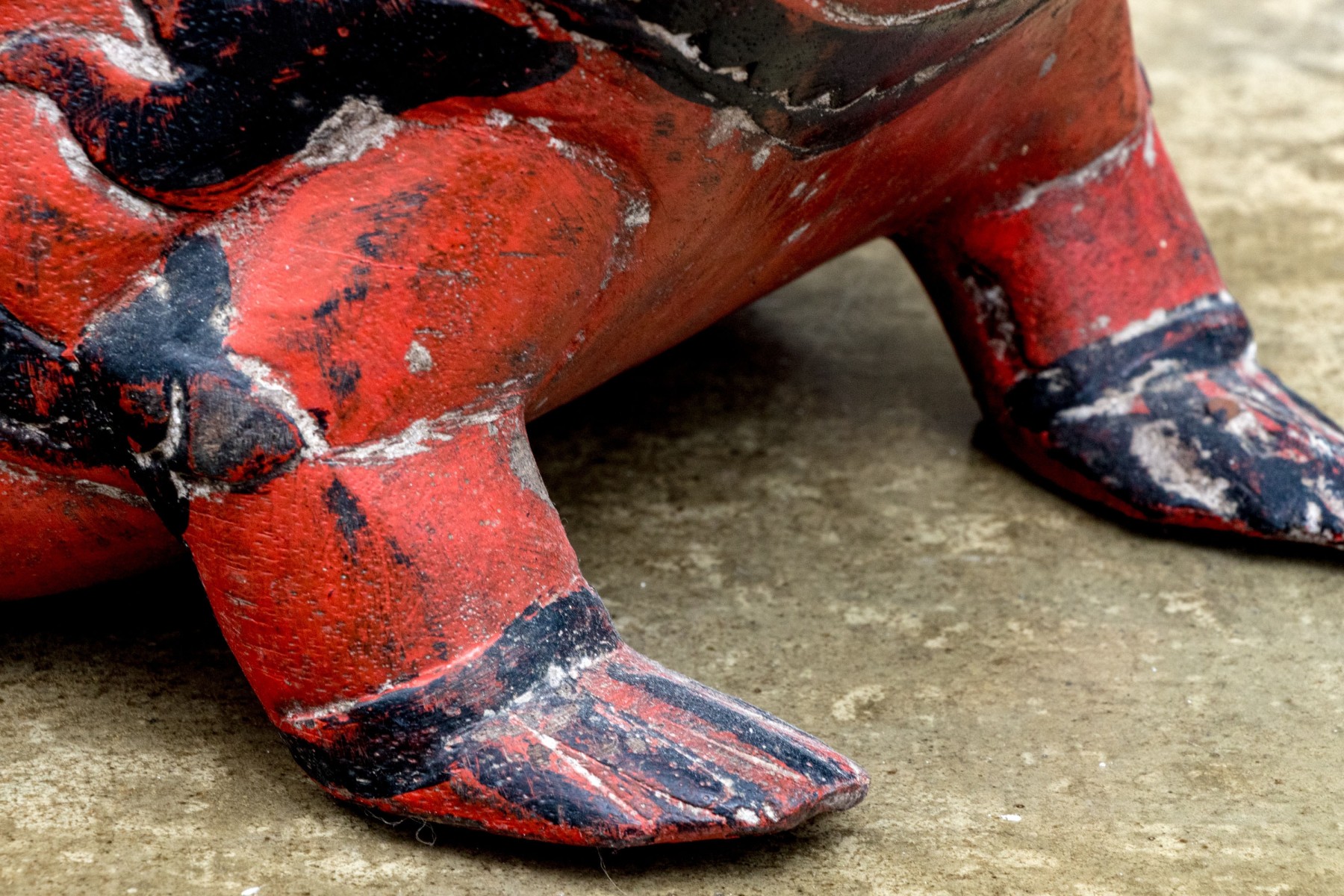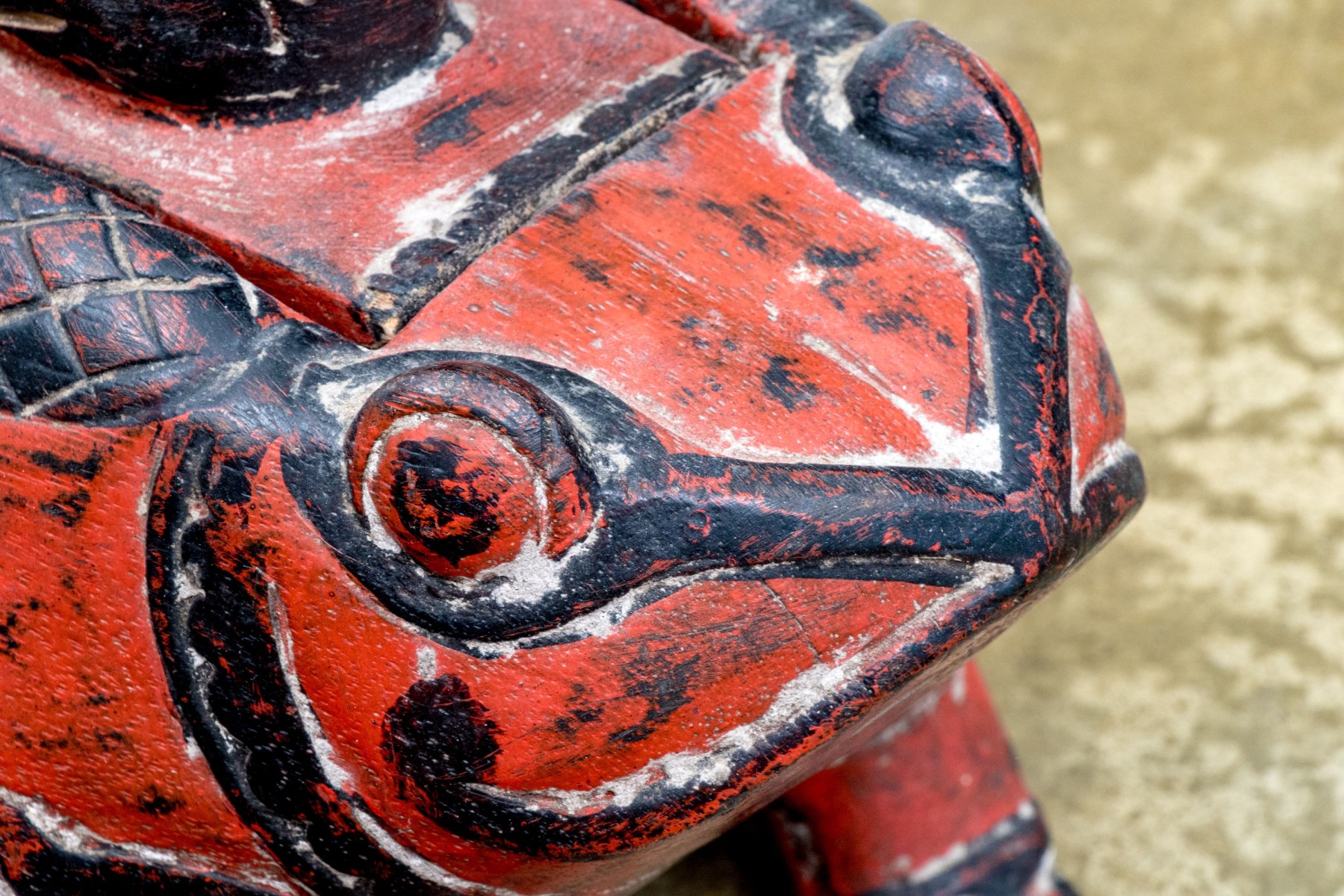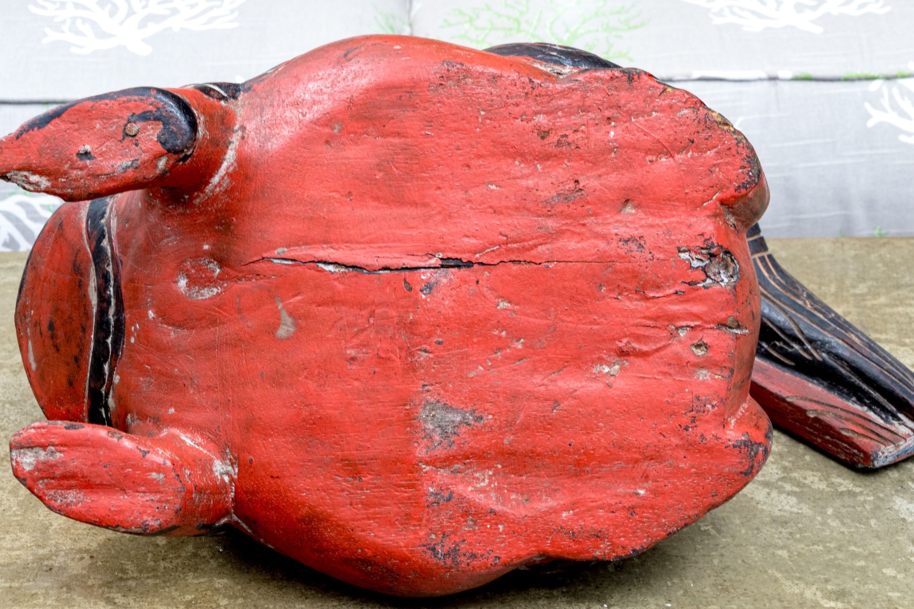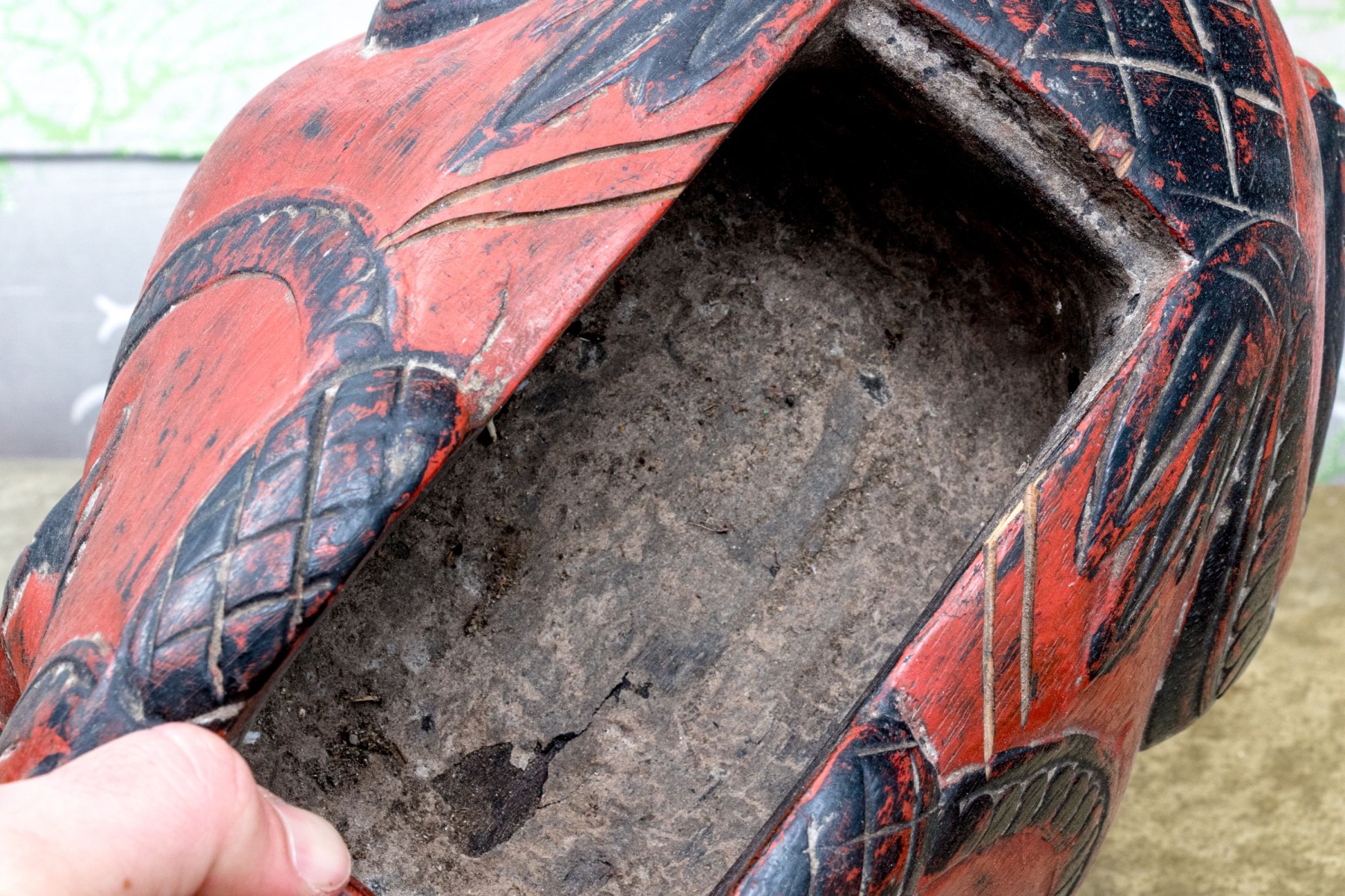 A fabulous first half 20th century south or southeastern Asian carved wood box in the form of a black bird seated atop a rotund, auspicious toad. The bird acts as a handle to lift the lid off of the rectangular storage space within, while the toad is lacquered vibrant orange-red and carved with winding black foliage throughout.