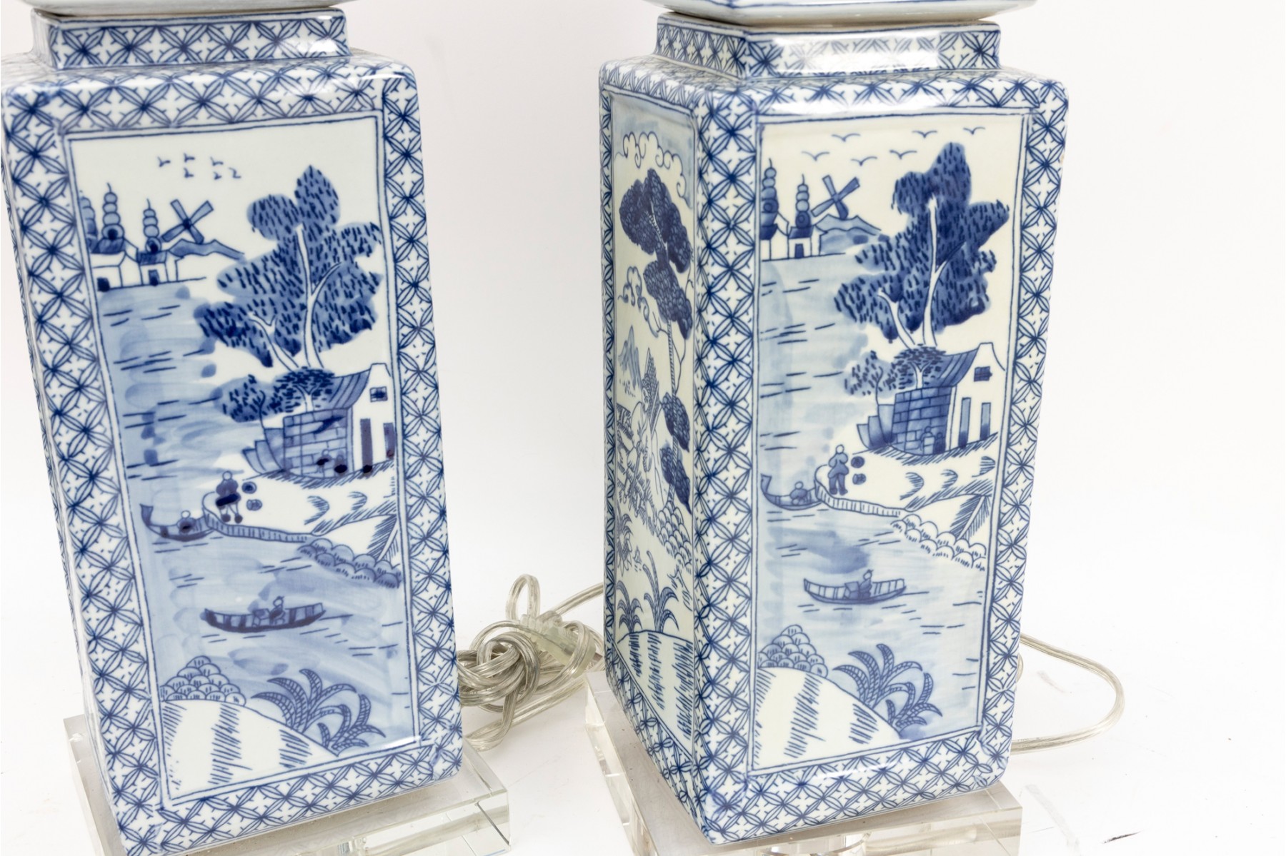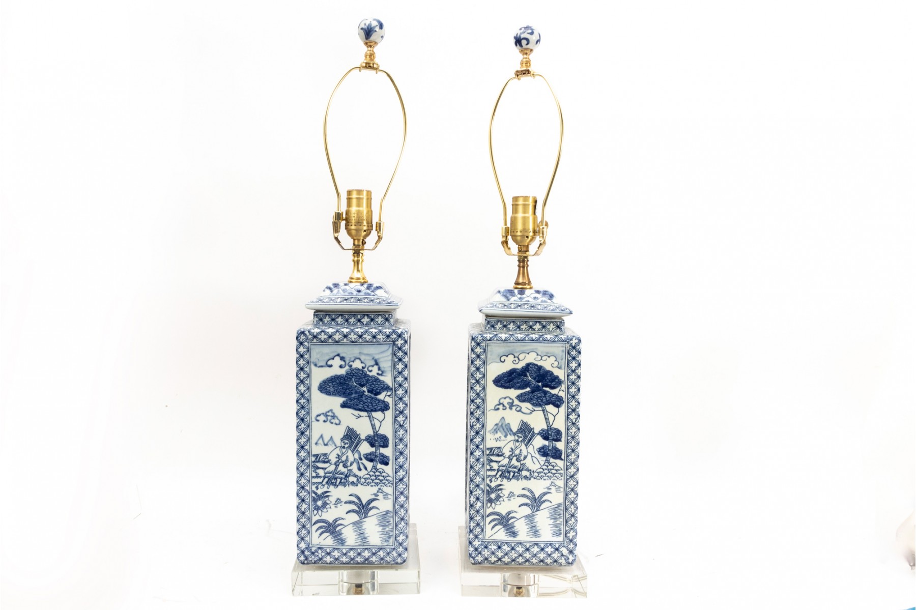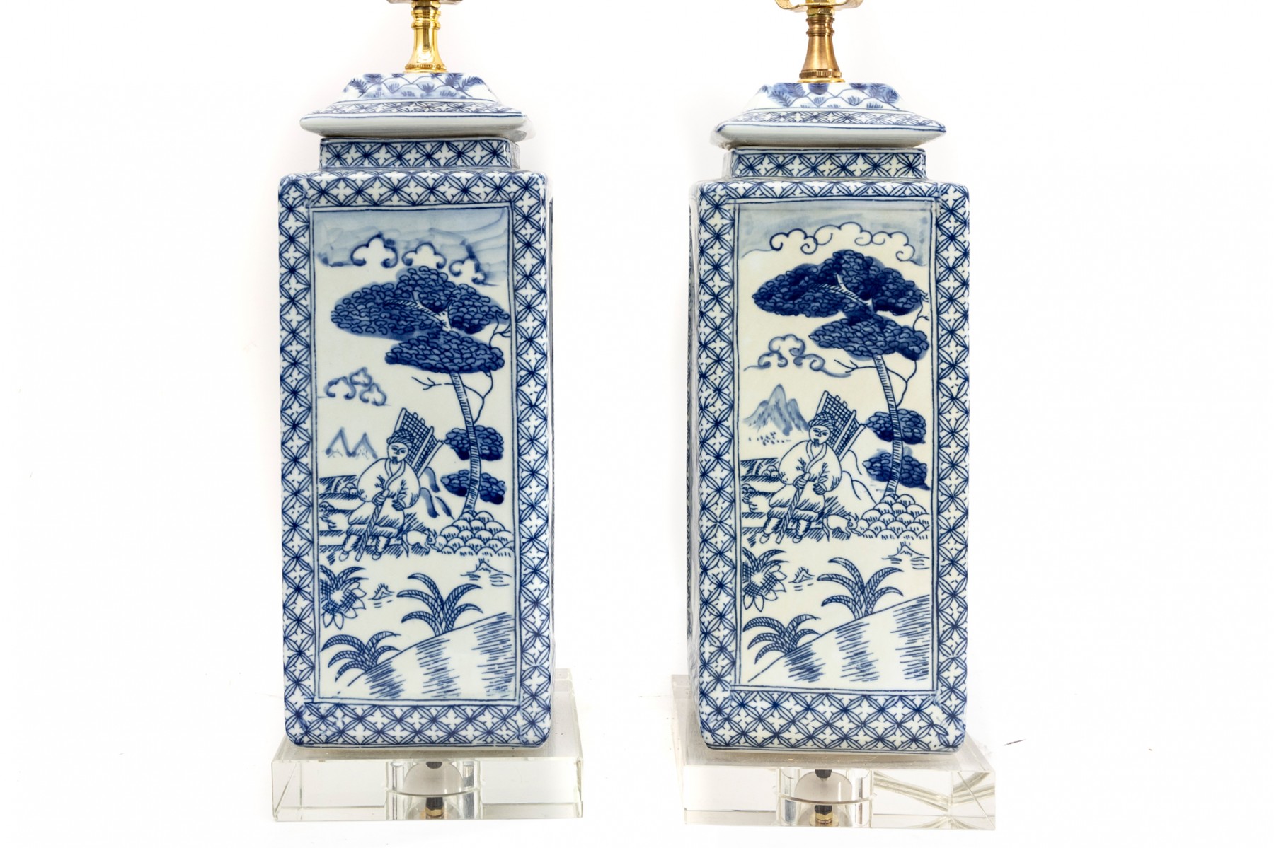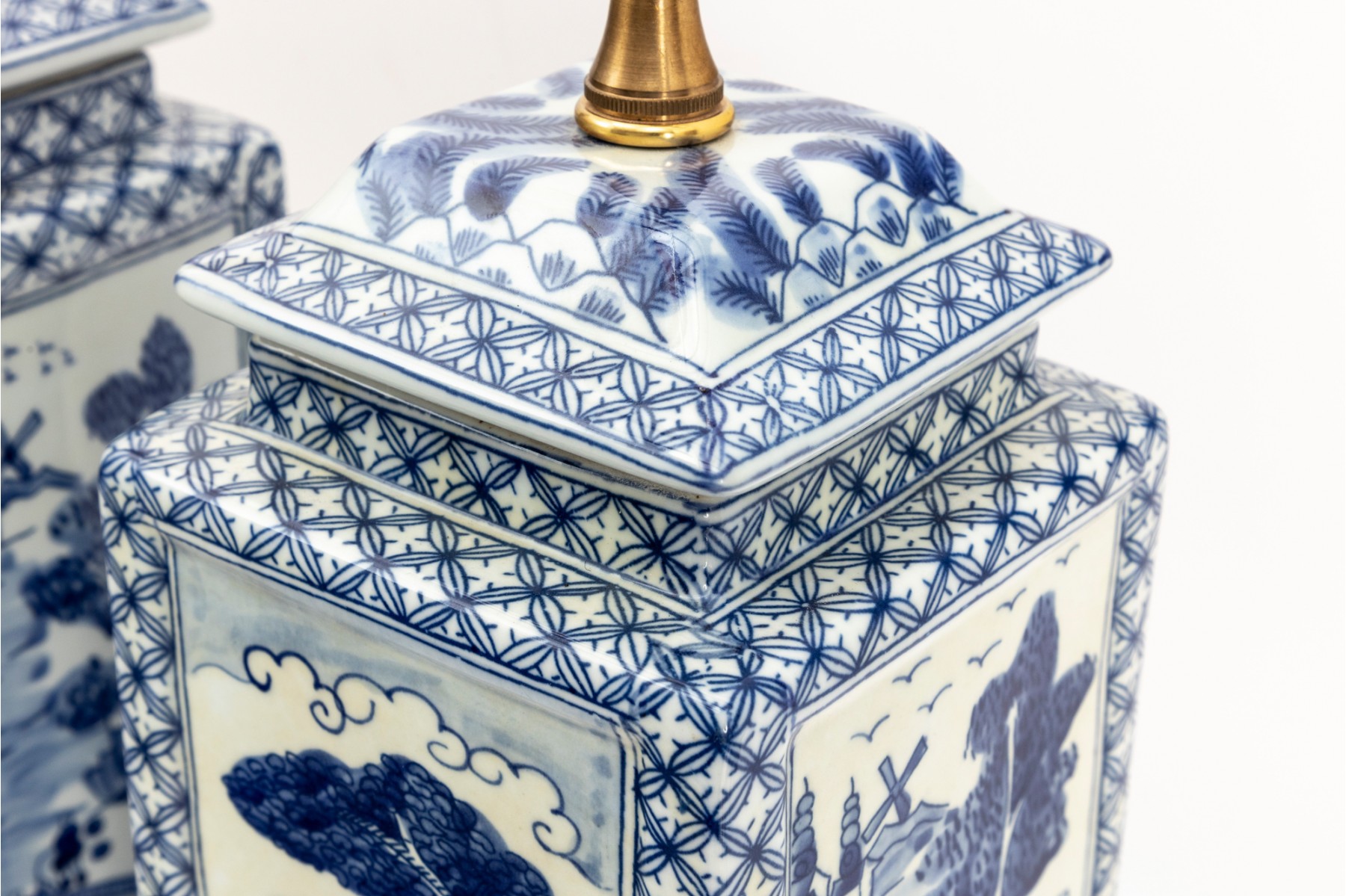 A wonderful pair of Asian ceramic rectangular canisters mounted as table lamps, displaying gently recessed scenes of figures on boats and enjoying nature, surrounded by lush foliage, trees, and buildings. The canisters finish with square glass bases on the bottom and spherical ceramic finials at the top.