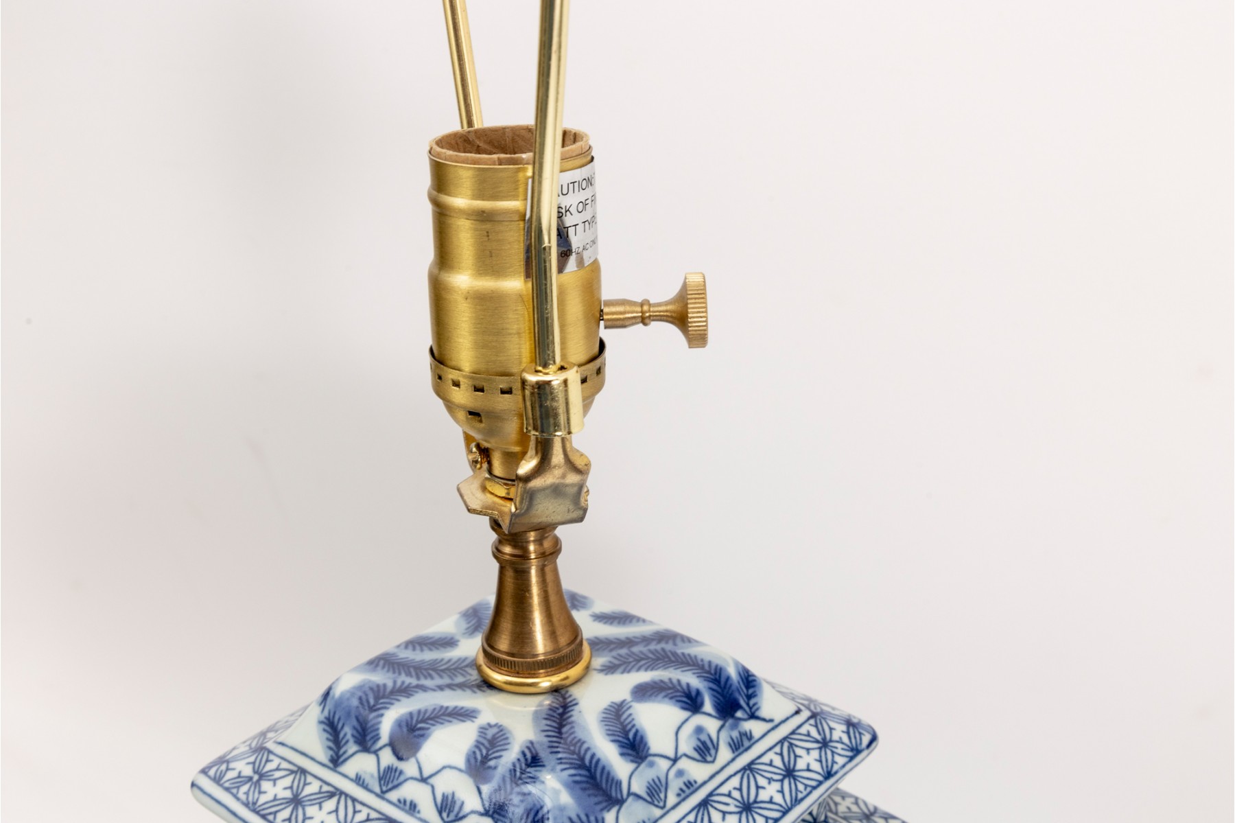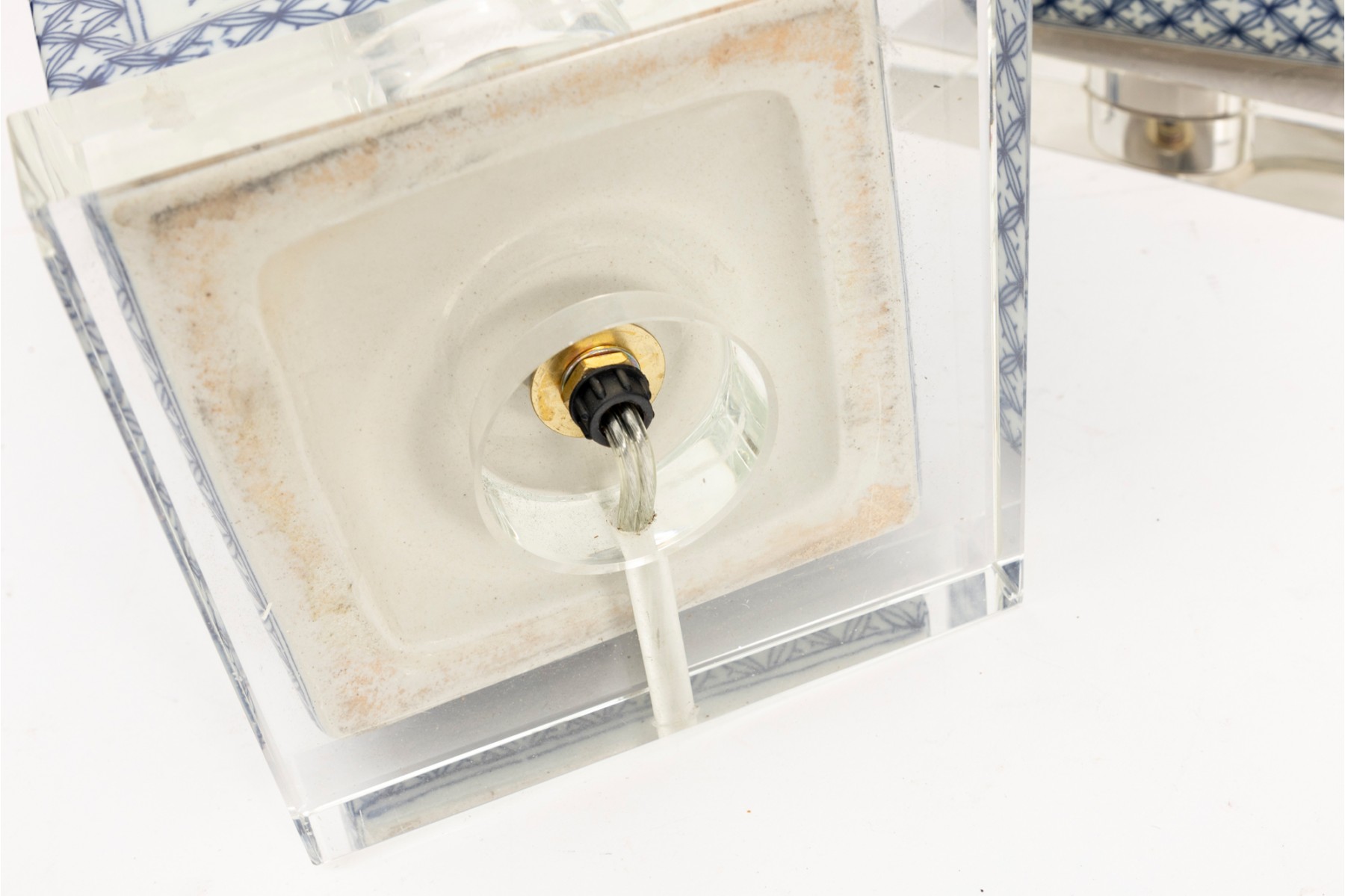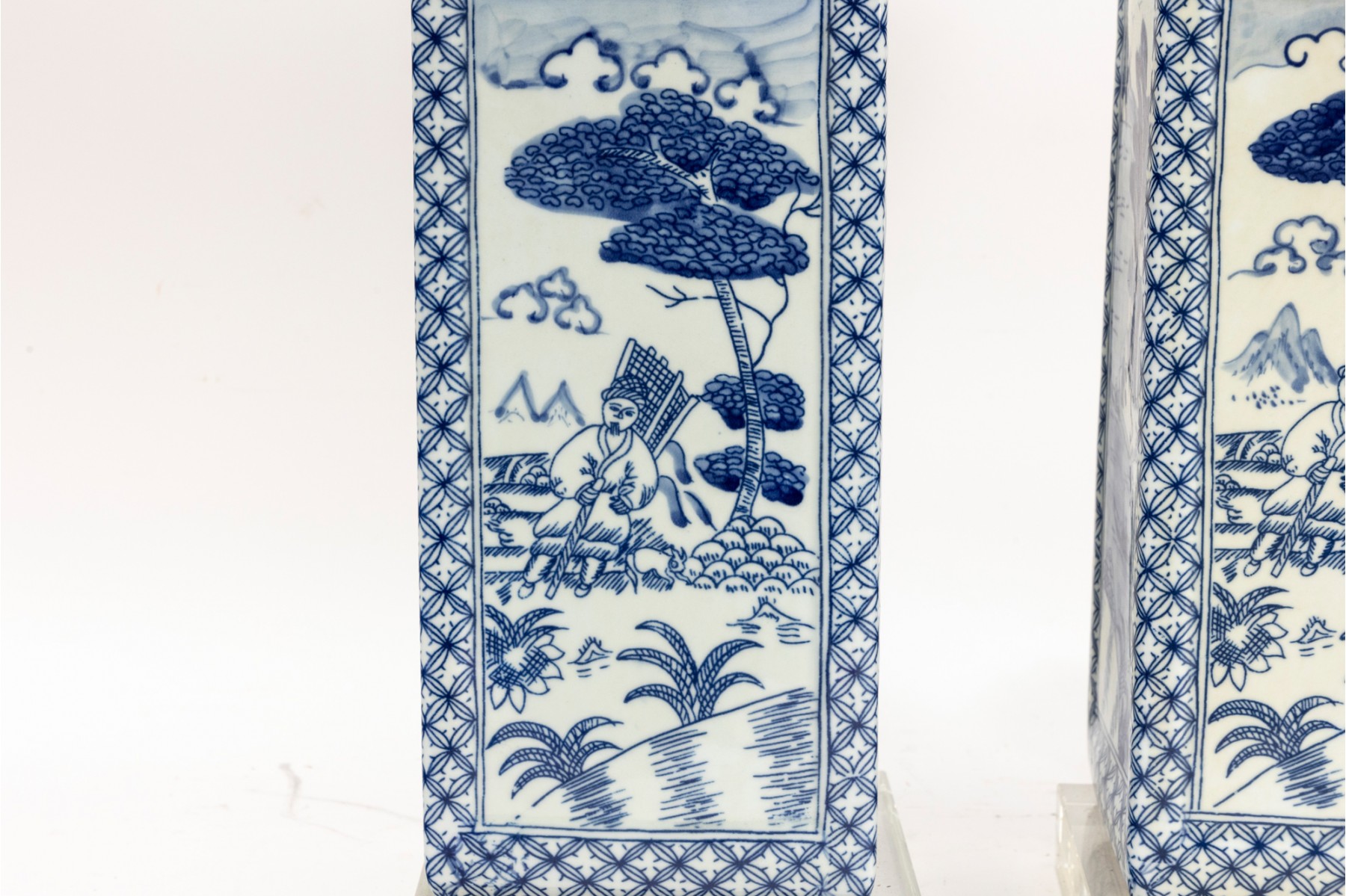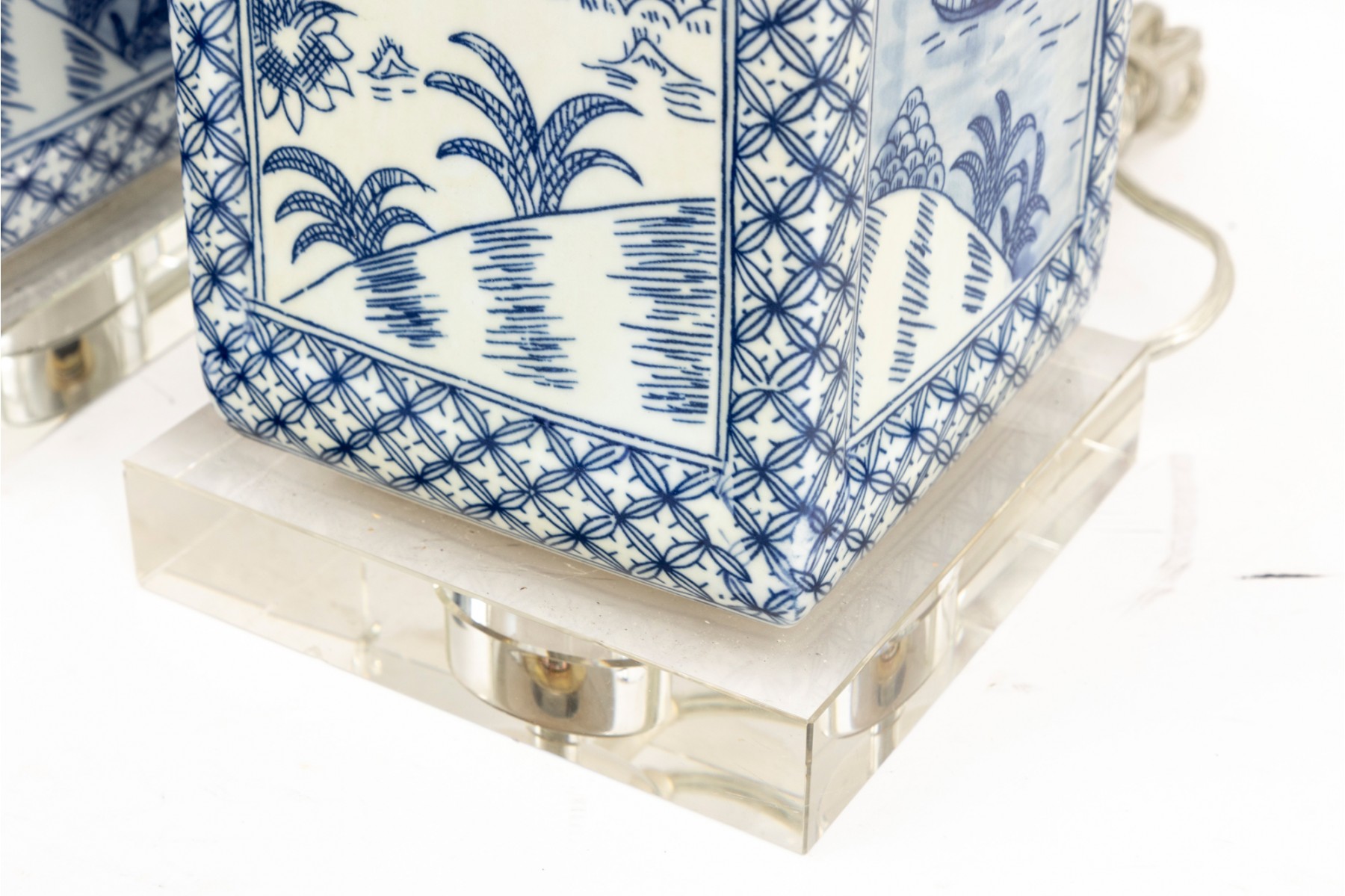 A wonderful pair of Asian ceramic rectangular canisters mounted as table lamps, displaying gently recessed scenes of figures on boats and enjoying nature, surrounded by lush foliage, trees, and buildings. The canisters finish with square glass bases on the bottom and spherical ceramic finials at the top.