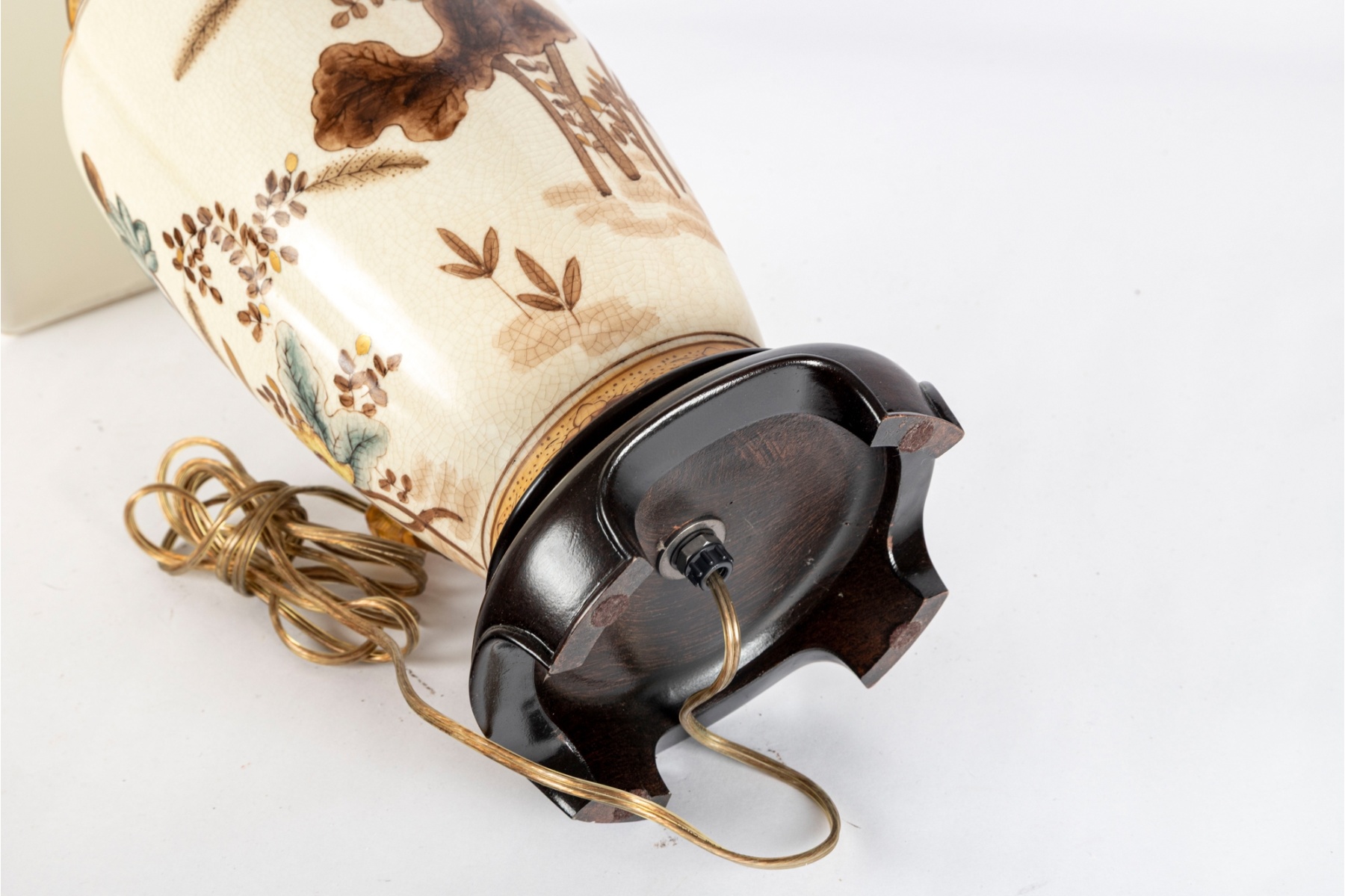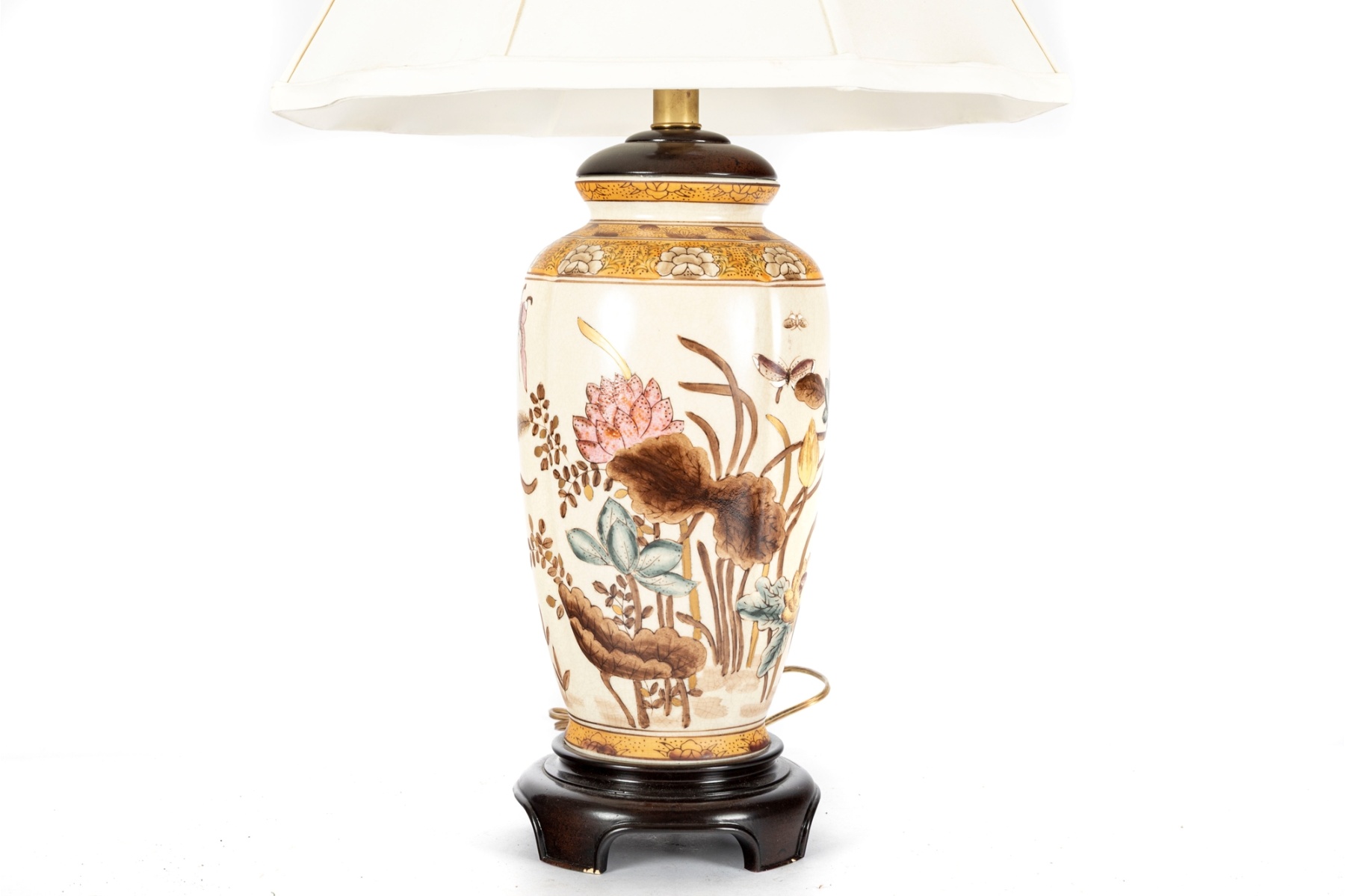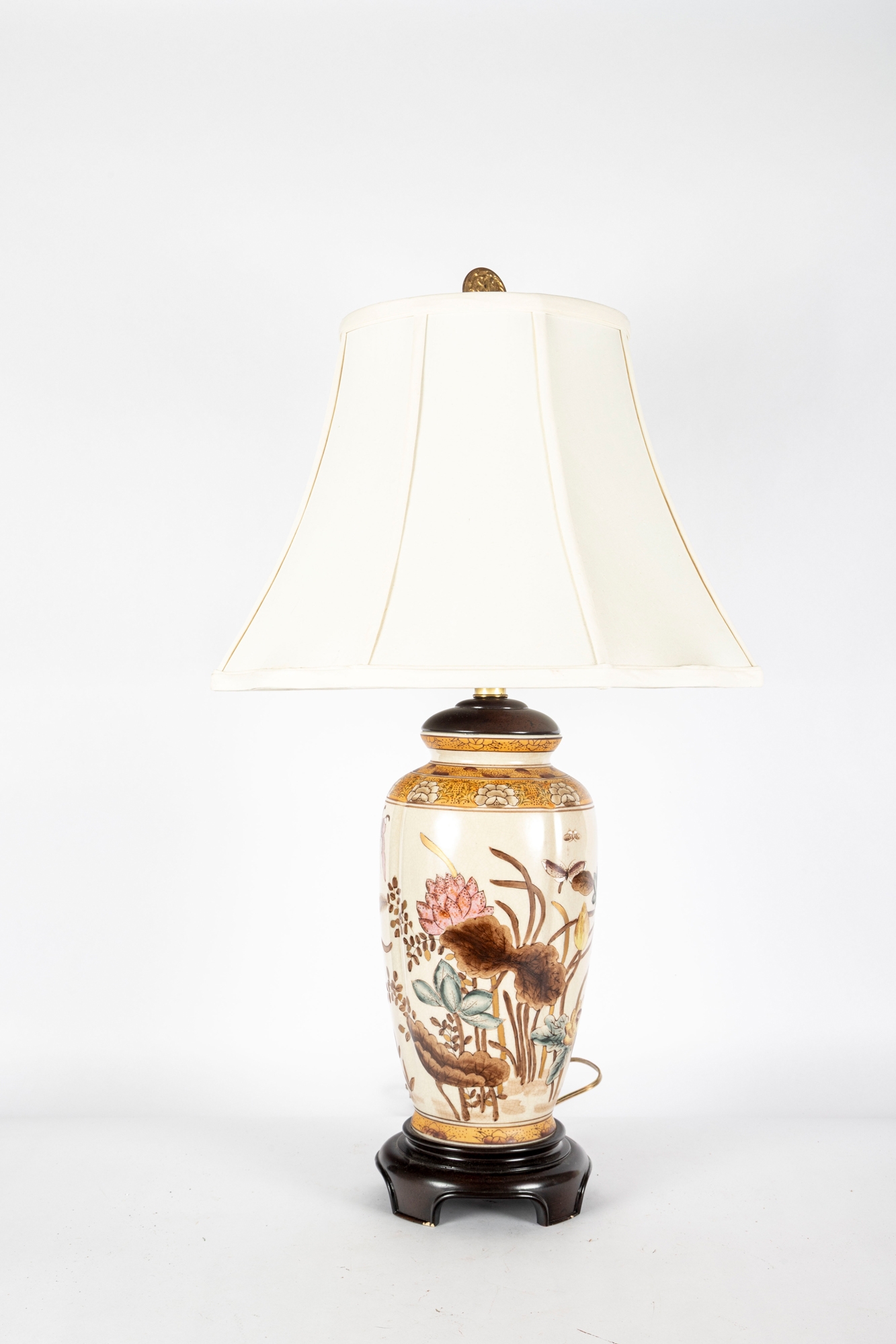 Hand-painted ceramic table lamp featuring a detailed floral and botanical motif with lotus blossoms and foliage in warm, natural tones. The vase-form body sits on a carved wooden base and is topped with a classic cream fabric shade.