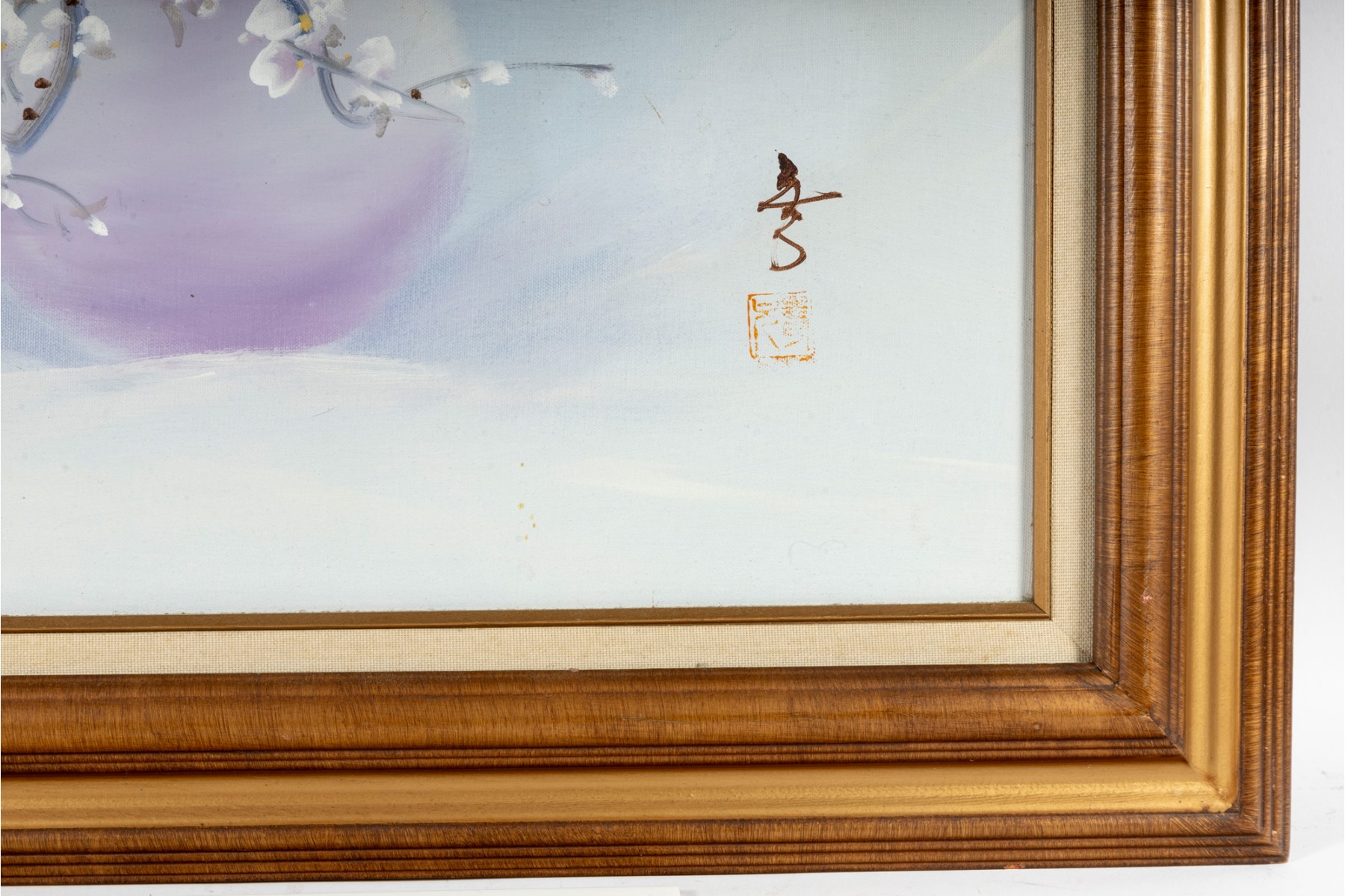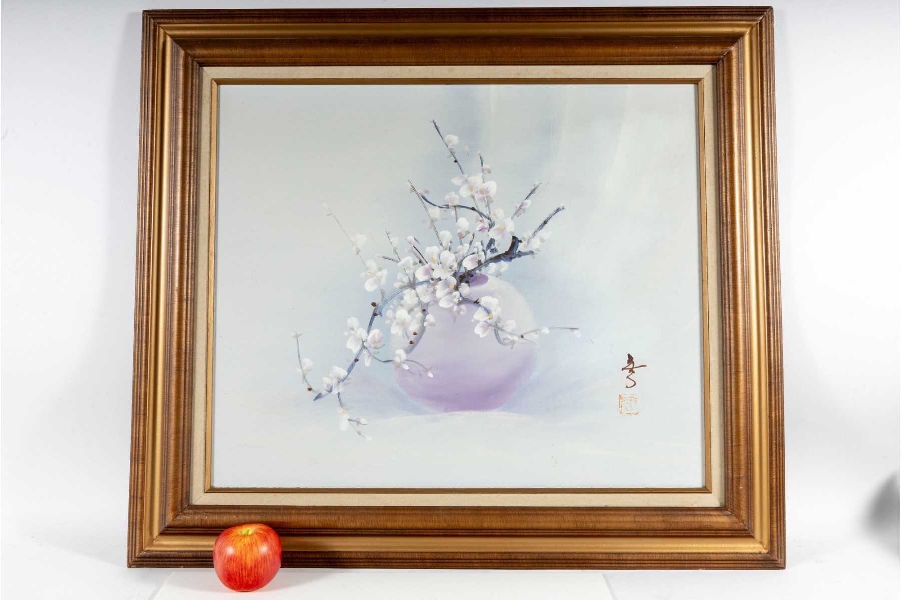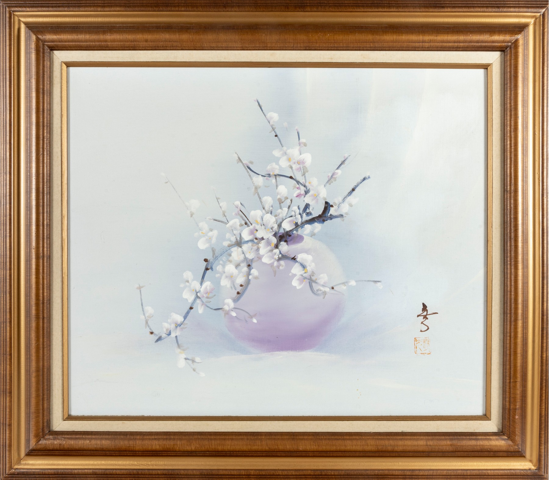 This exquisite Asian oil on masonite board still-life painting features a stunning arrangement of blossoms elegantly displayed in a vase, rich with depth and subtle texture. The artwork is signed (With seal) and presented openly within a a gold-tone wood frame with canvas accents.