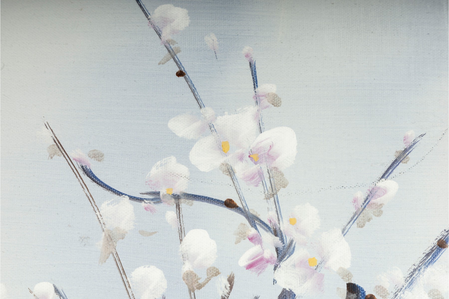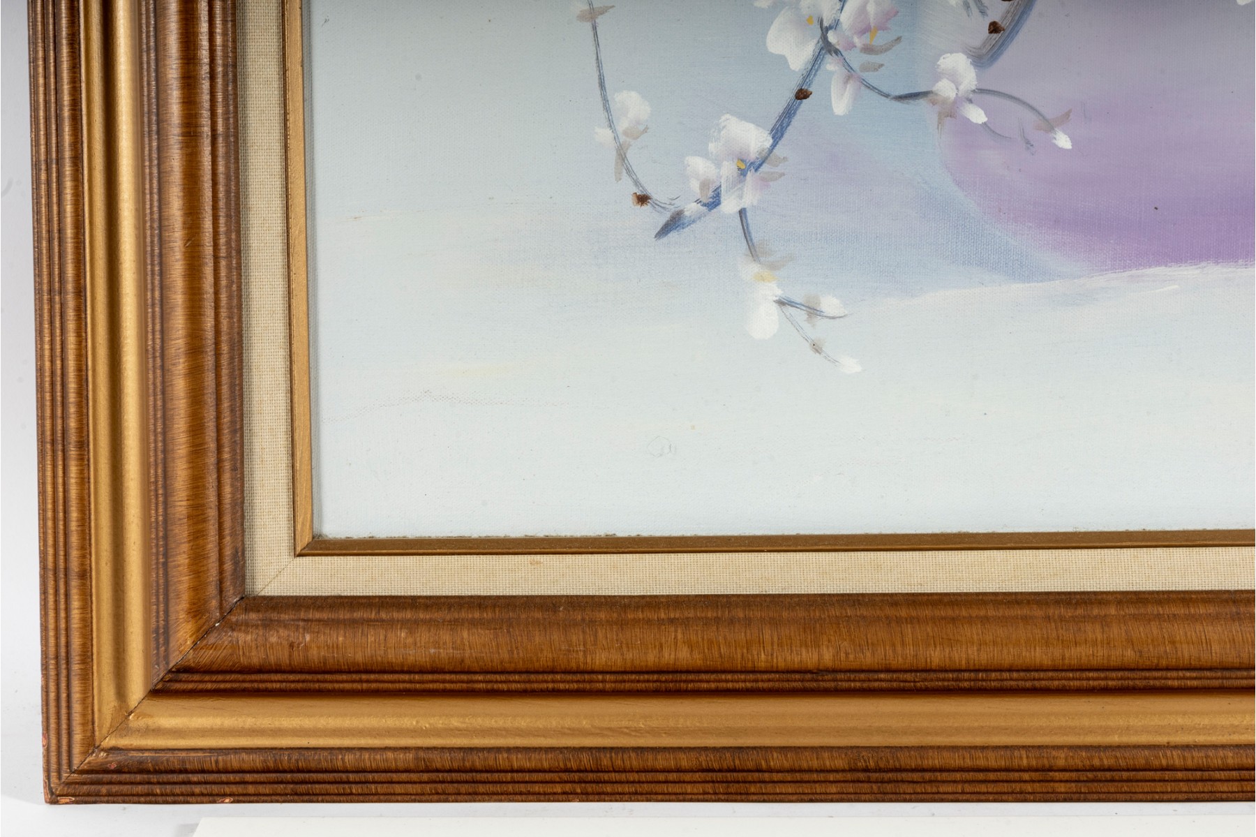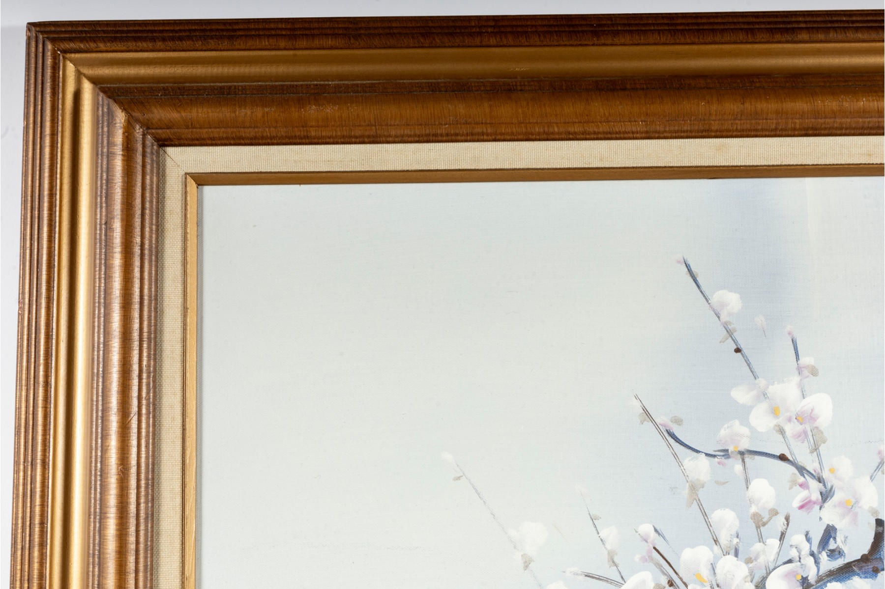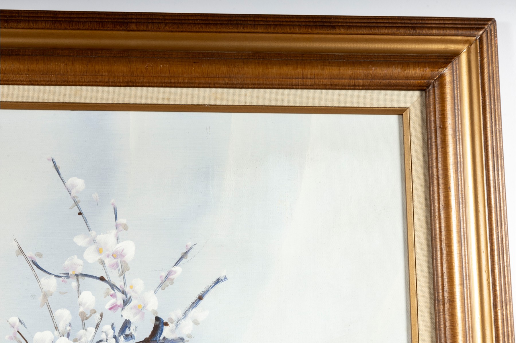This exquisite Asian oil on masonite board still-life painting features a stunning arrangement of blossoms elegantly displayed in a vase, rich with depth and subtle texture. The artwork is signed (With seal) and presented openly within a a gold-tone wood frame with canvas accents.