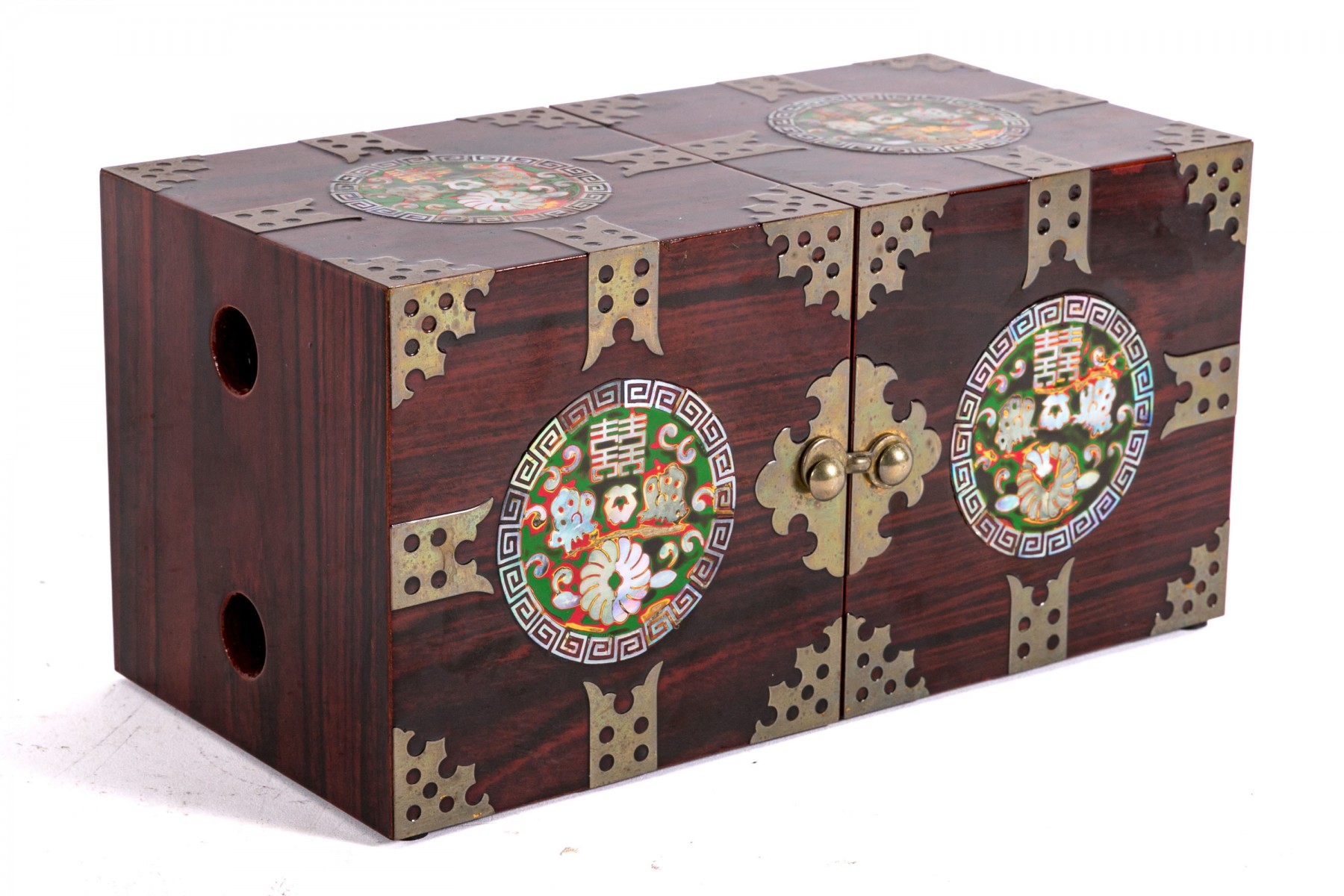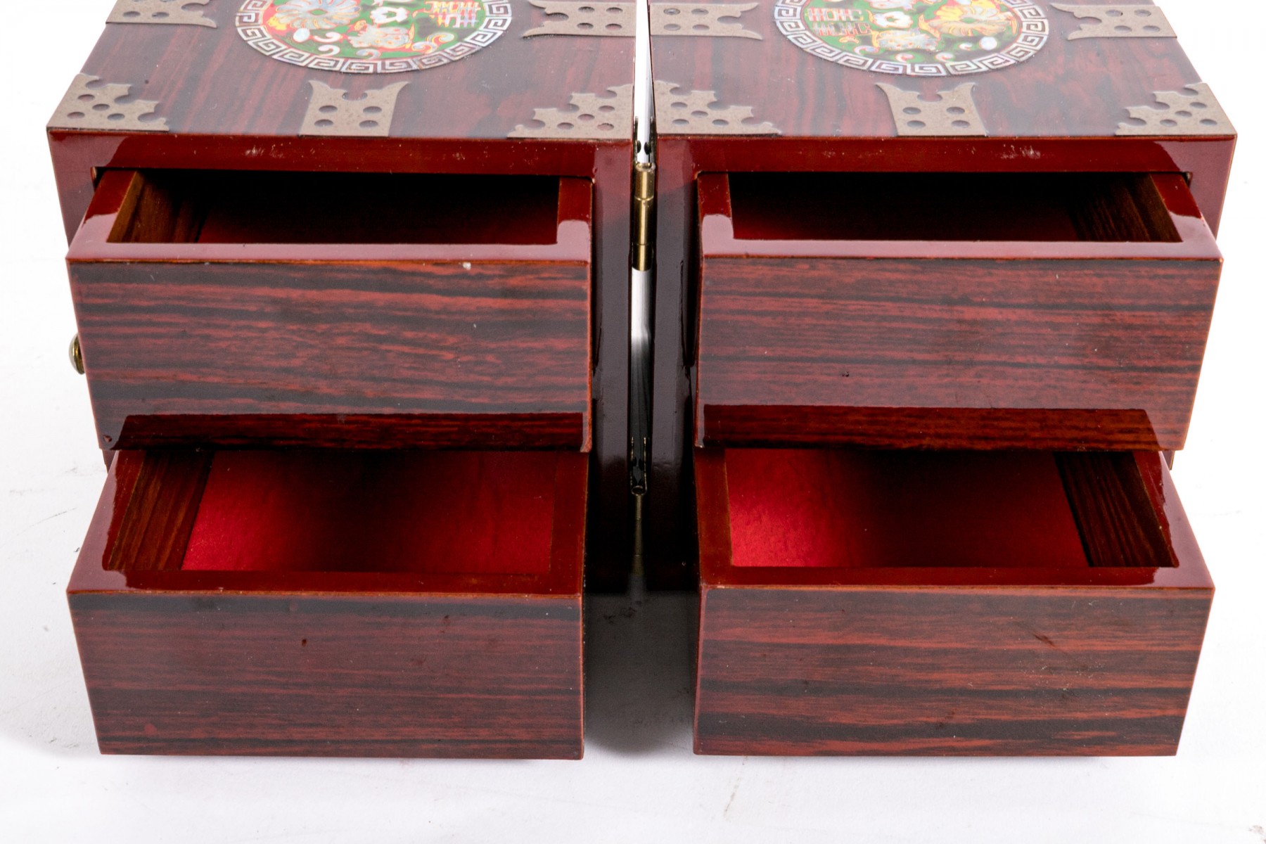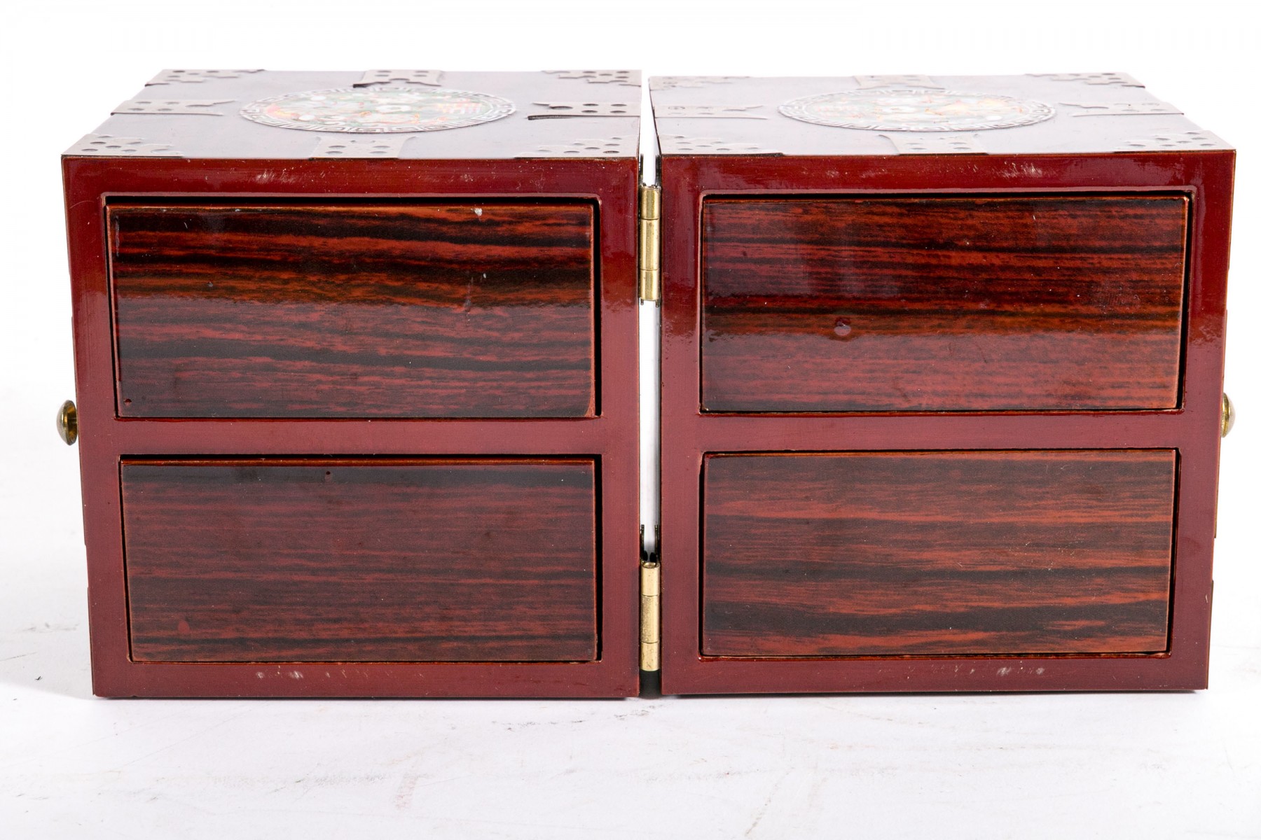 An excellent Asian rosewood tansu-style jewelry box, displaying a rectangular form with two halves joined at a hinge. The exterior sports circular medallions inlaid with mother of pearl, with green, red, and yellow hues around flowers and script. The box opens to reveal two handle-less drawers on each side, opened by pushing the pierced holes at the backs. The drawers are lined in red felt.