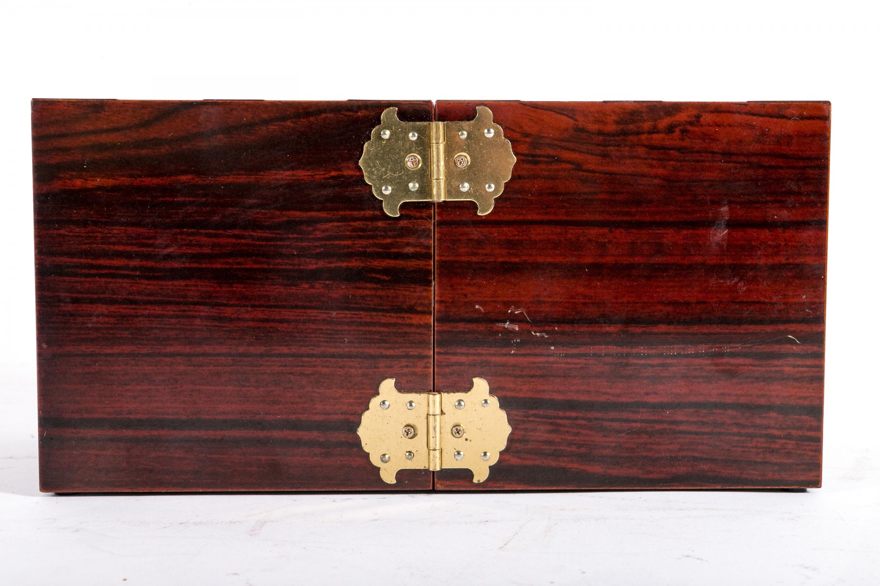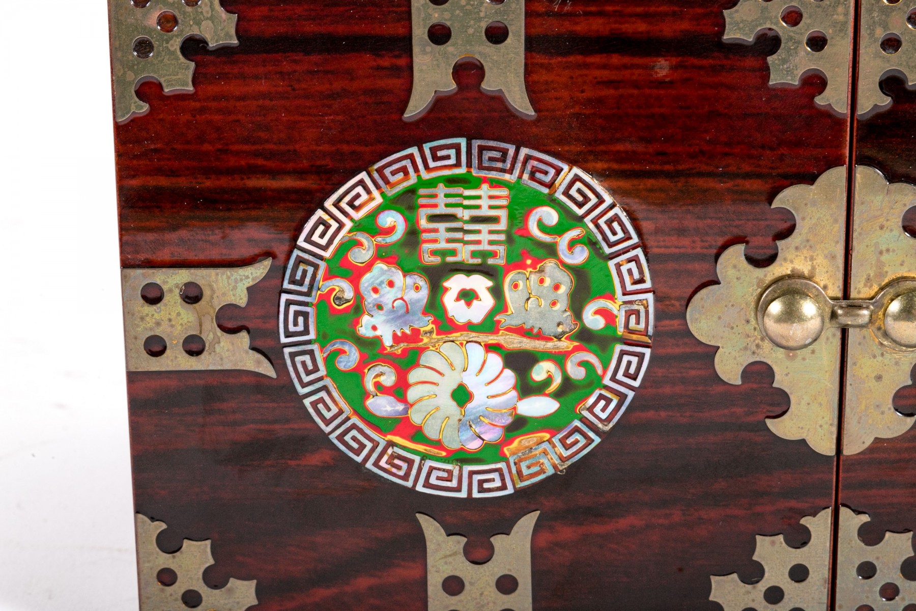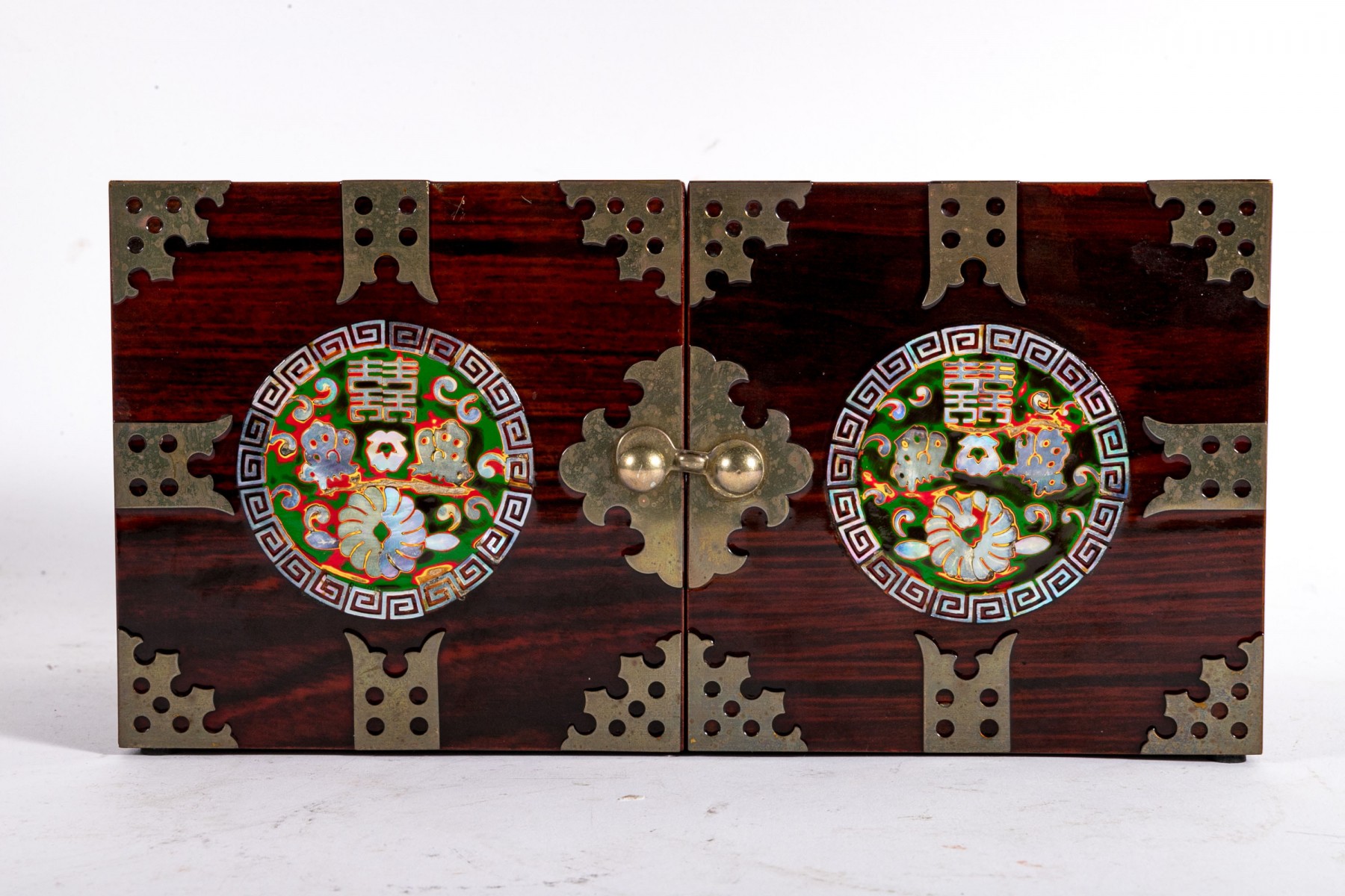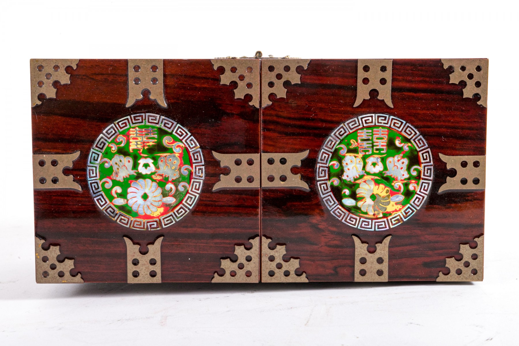 An excellent Asian rosewood tansu-style jewelry box, displaying a rectangular form with two halves joined at a hinge. The exterior sports circular medallions inlaid with mother of pearl, with green, red, and yellow hues around flowers and script. The box opens to reveal two handle-less drawers on each side, opened by pushing the pierced holes at the backs. The drawers are lined in red felt.