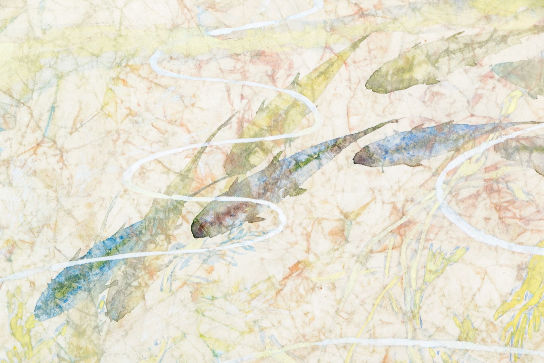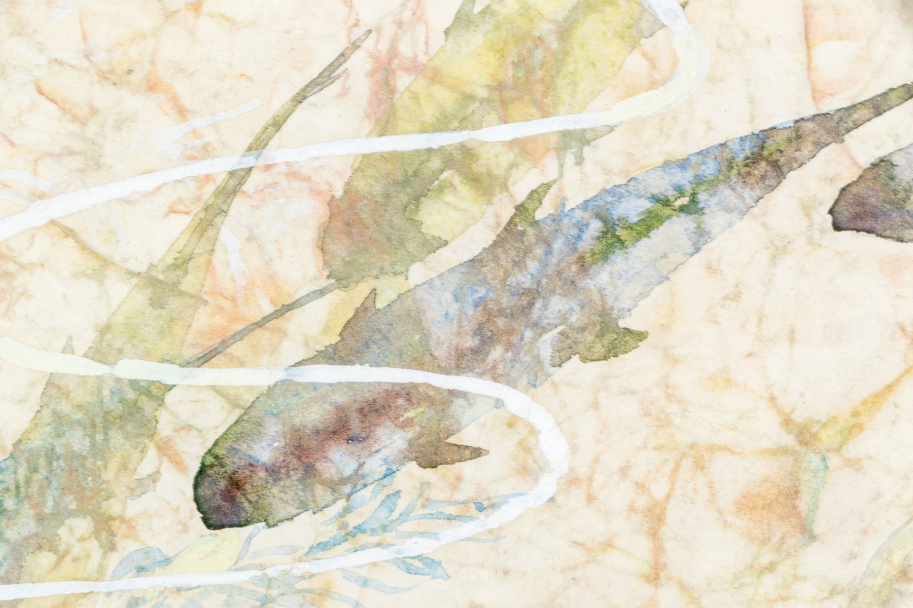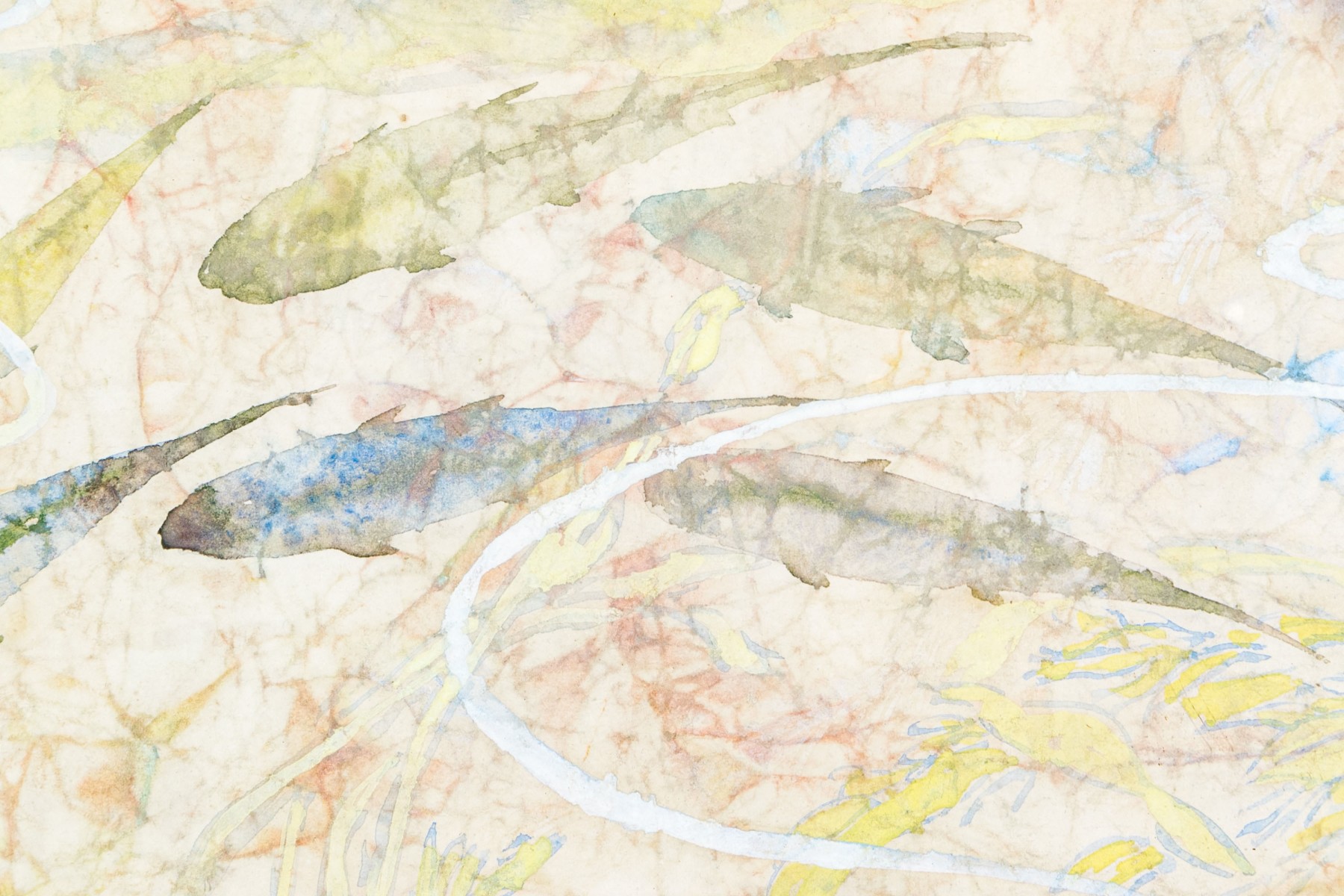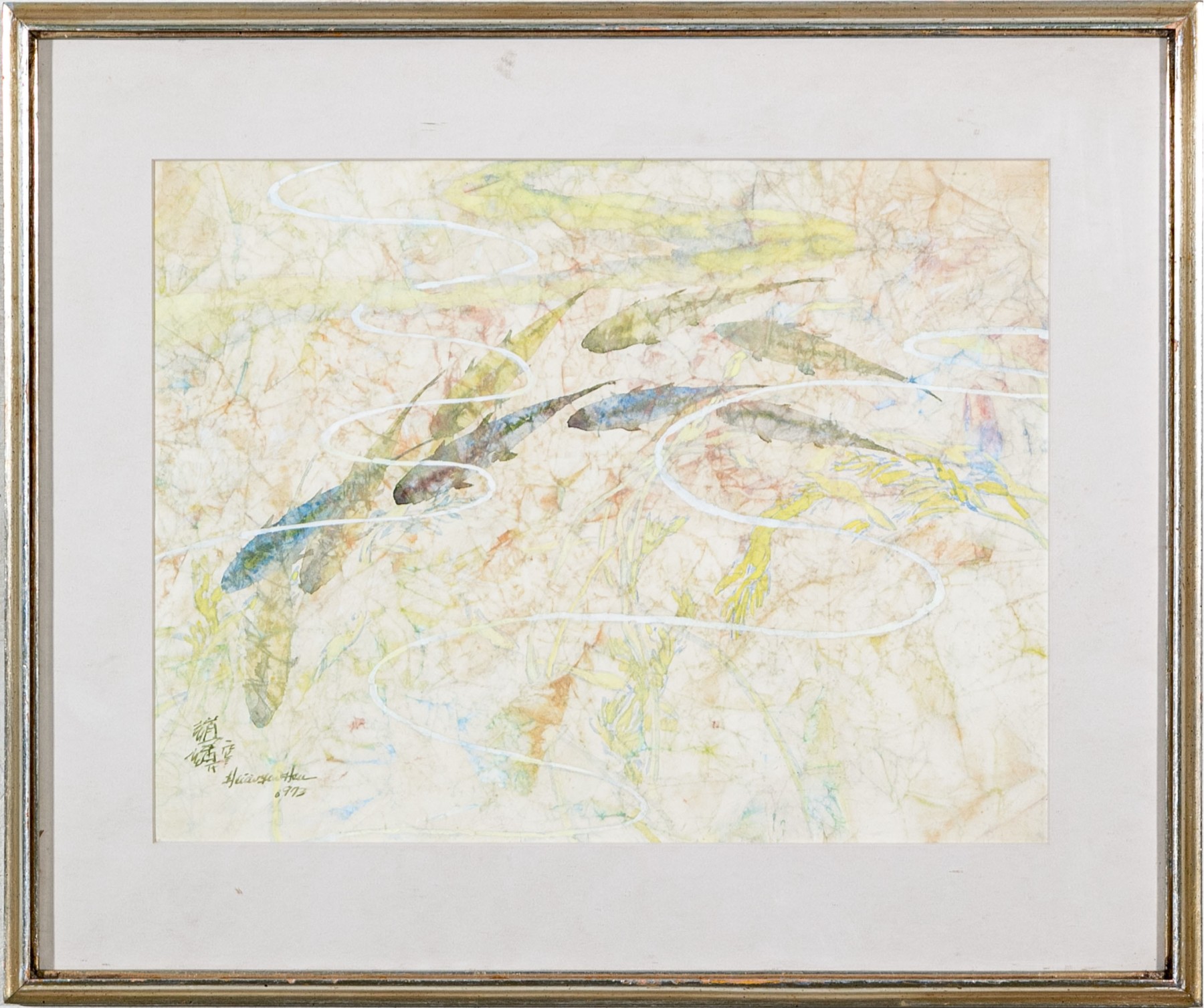 Signed and dated 1973 lower left. A pastel tone composition of a school of fish swimming in waters with yellow grasses. Presented in a gilt frame with glass.