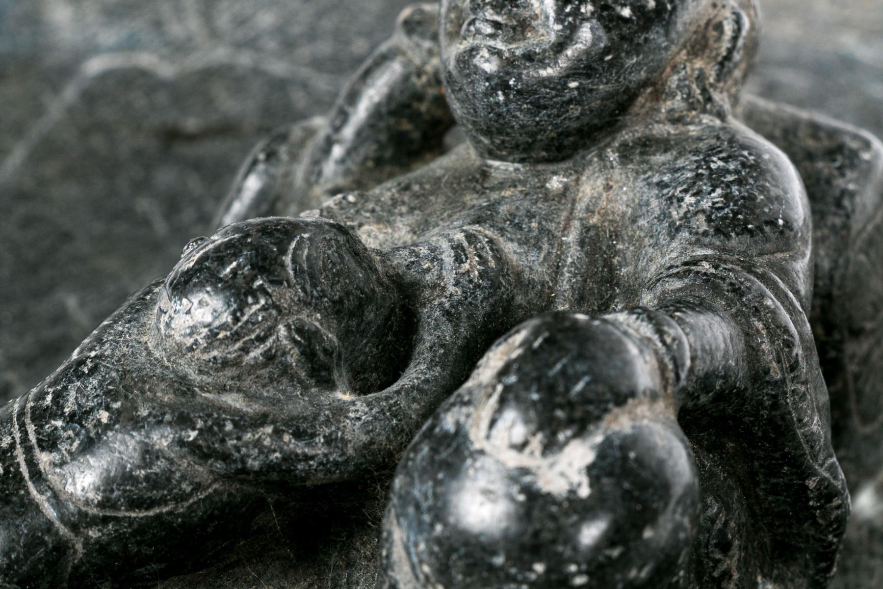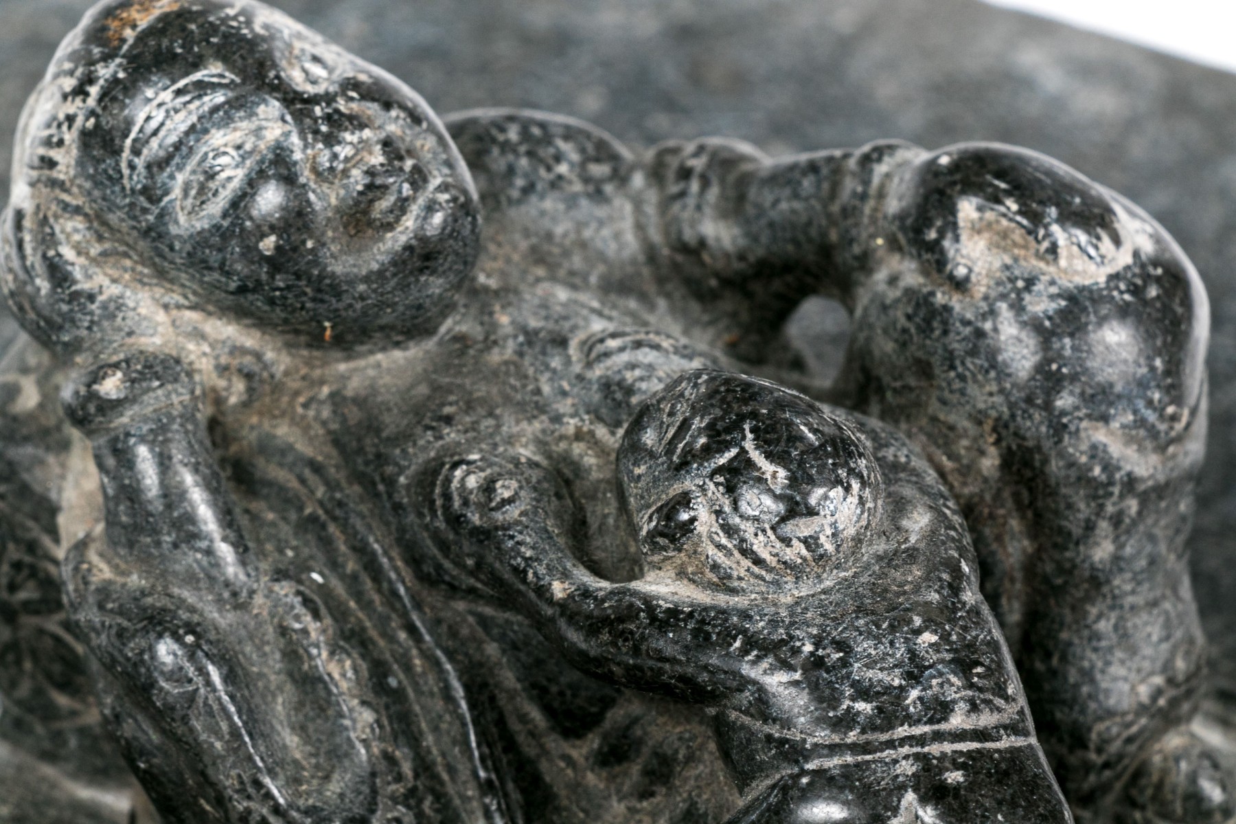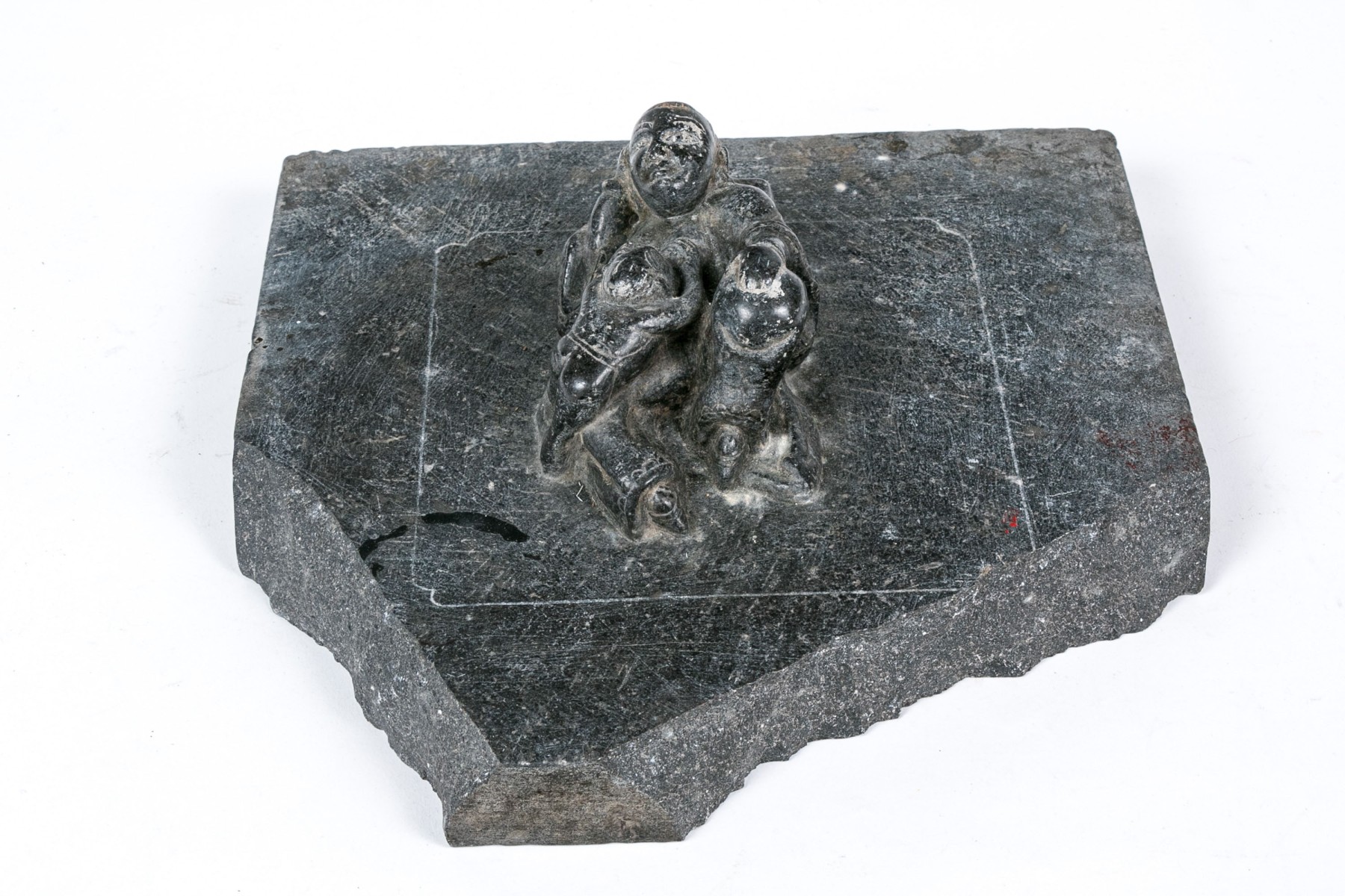 A heavy fragmentary gray stone plaque with high relief figural decoration of a reclining robed figure with a child on the lap.