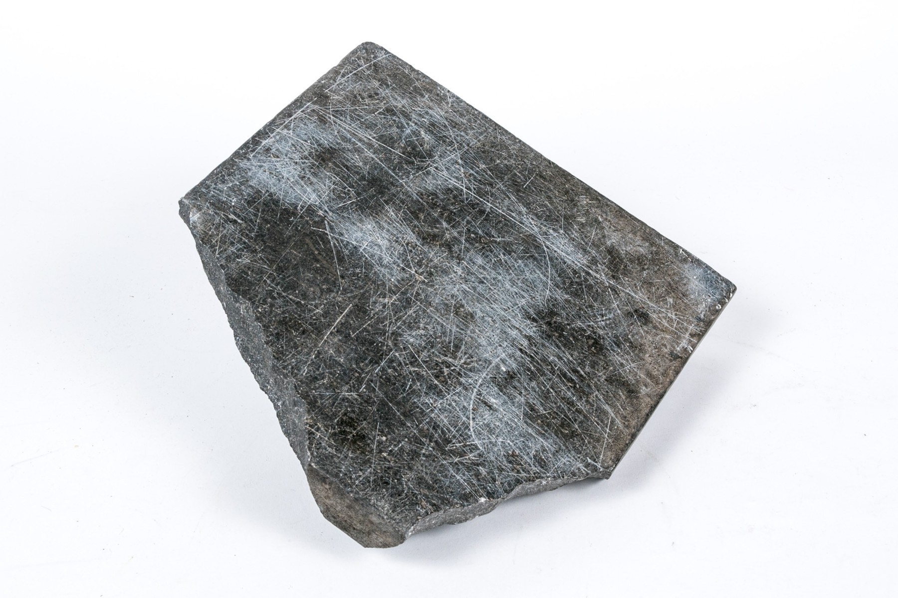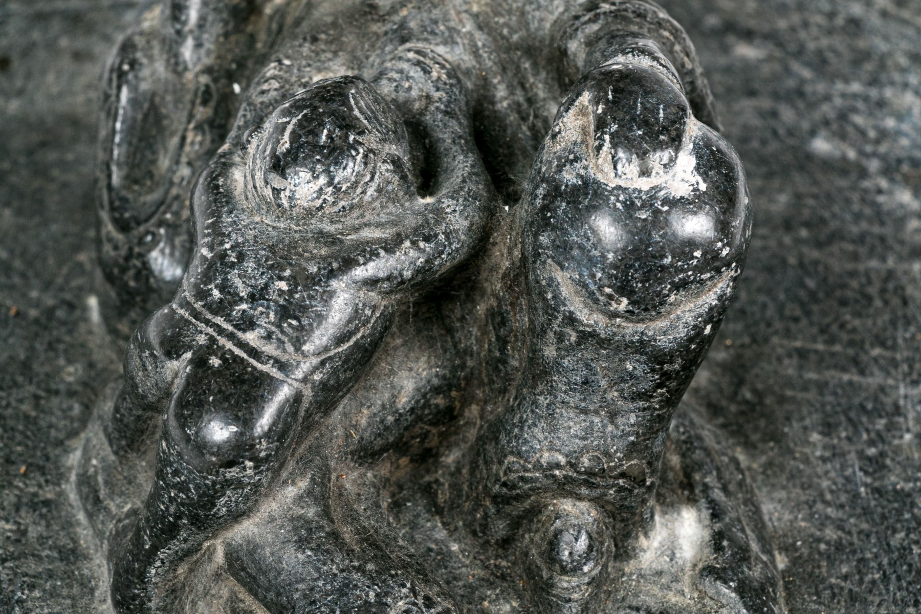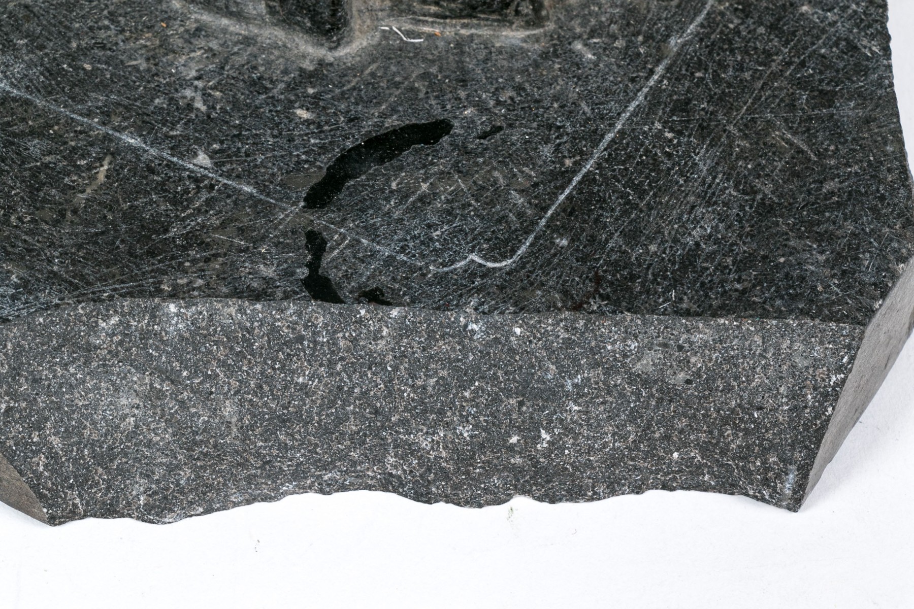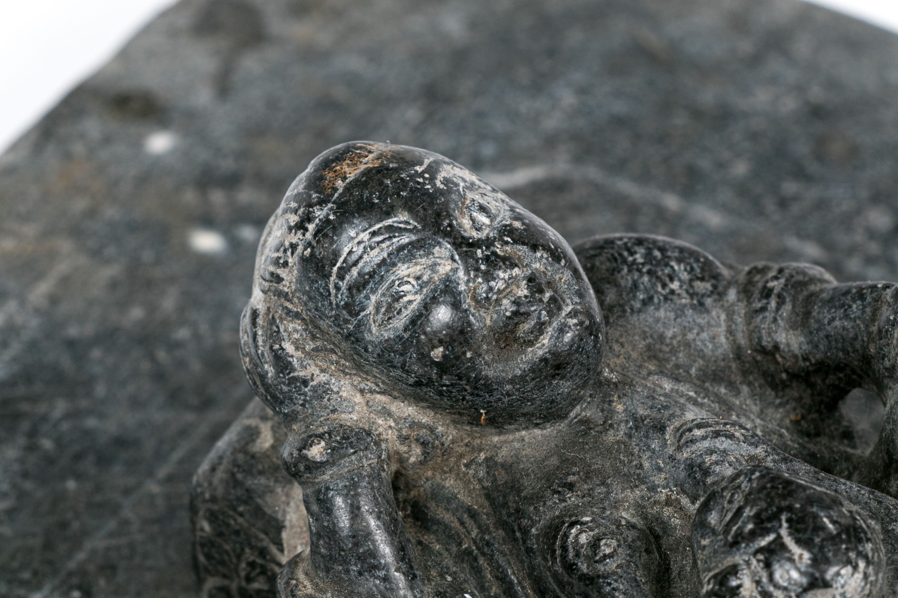 A heavy fragmentary gray stone plaque with high relief figural decoration of a reclining robed figure with a child on the lap.