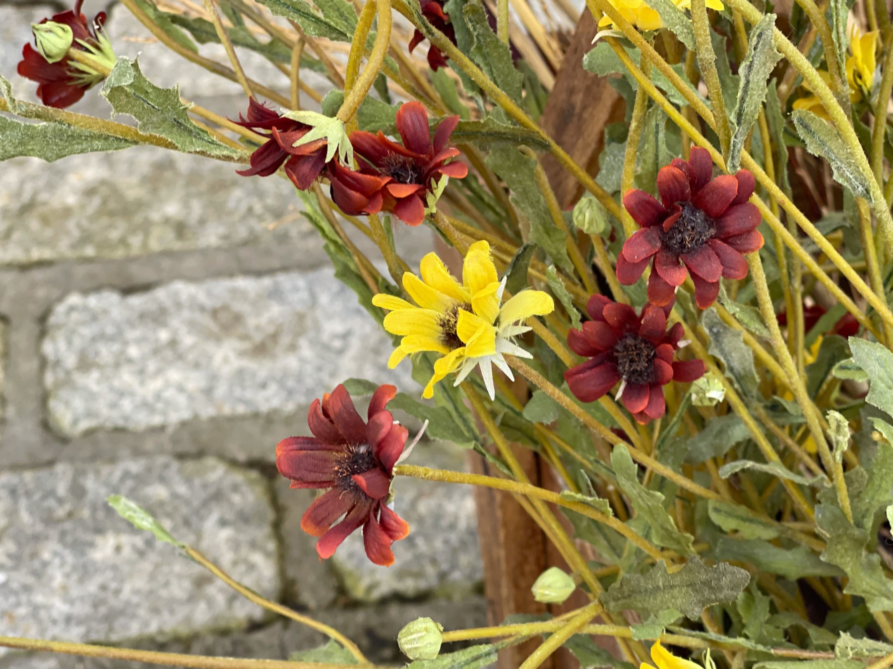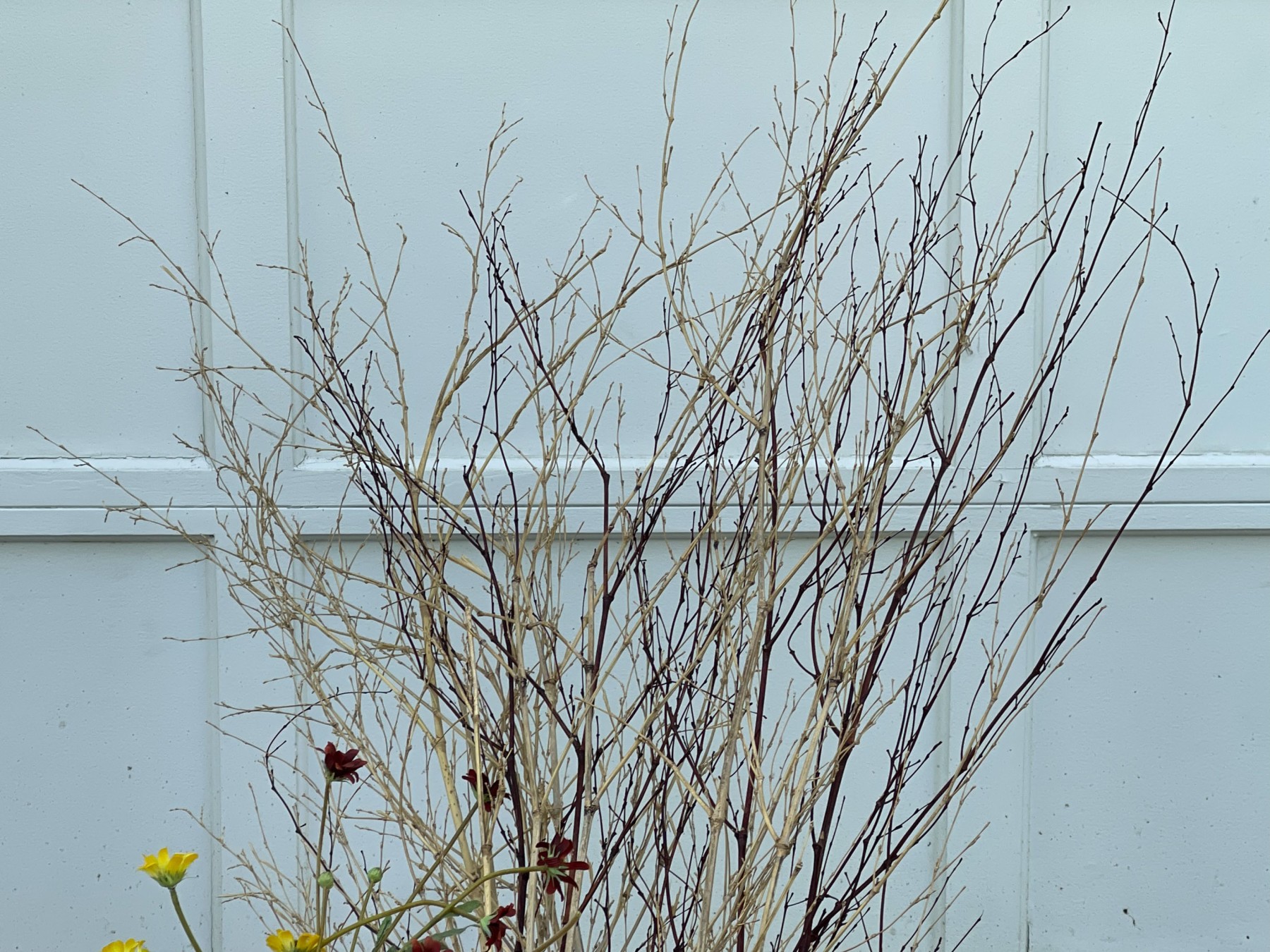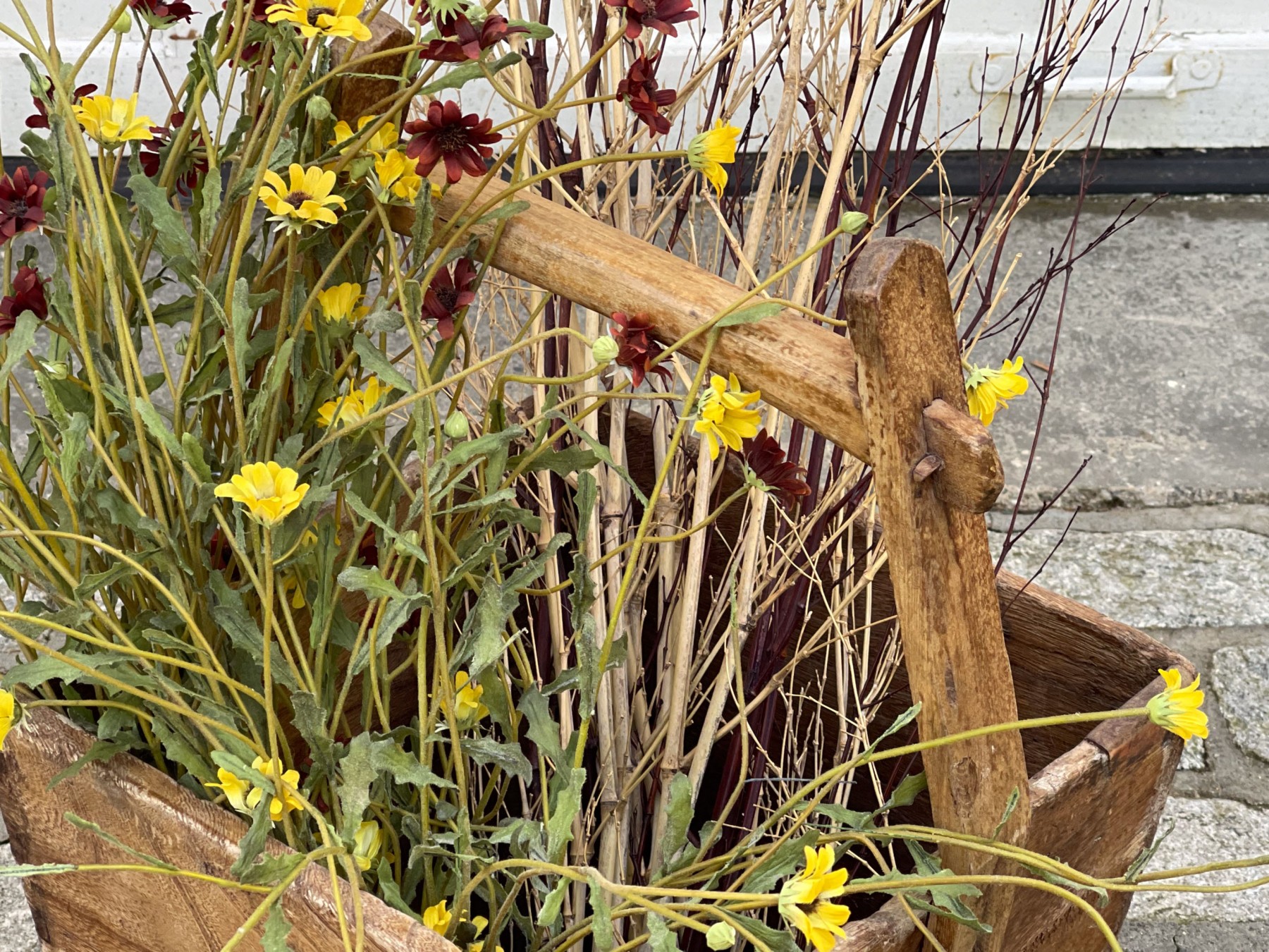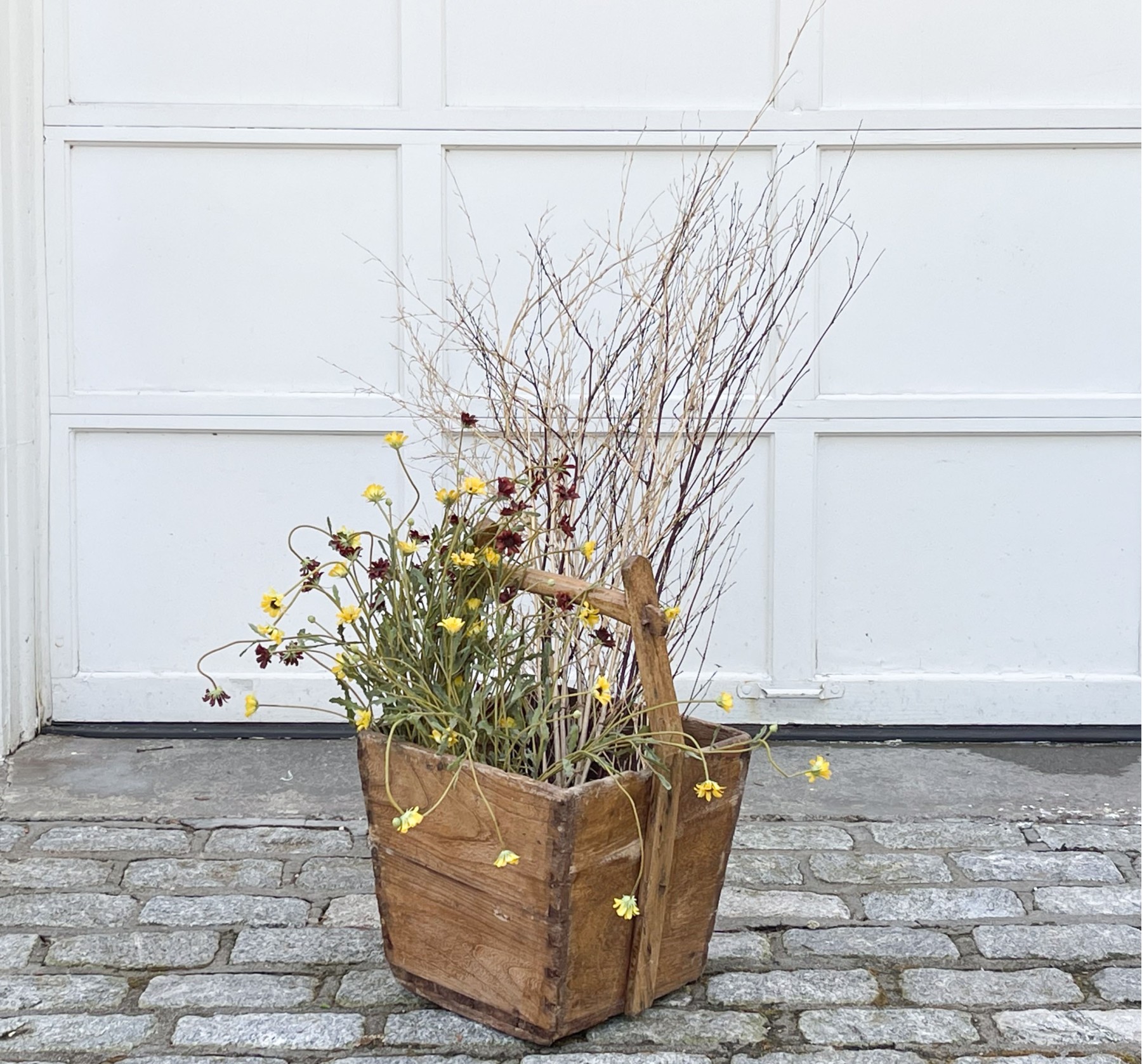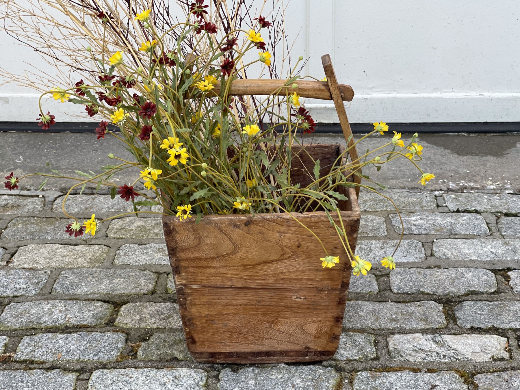 An Asian wooden container with a top handle filled with long stemmed faux flowers and branches.