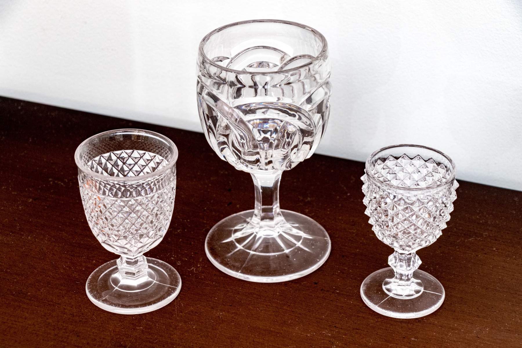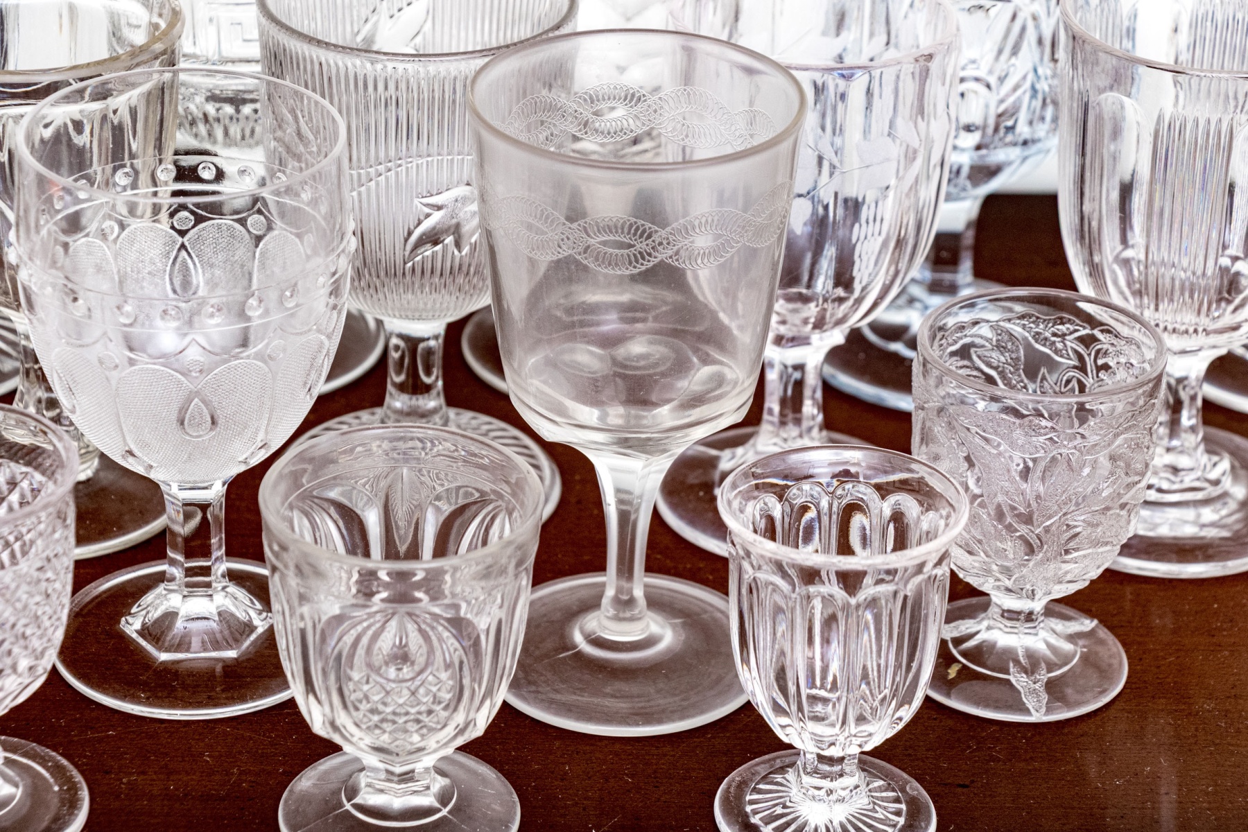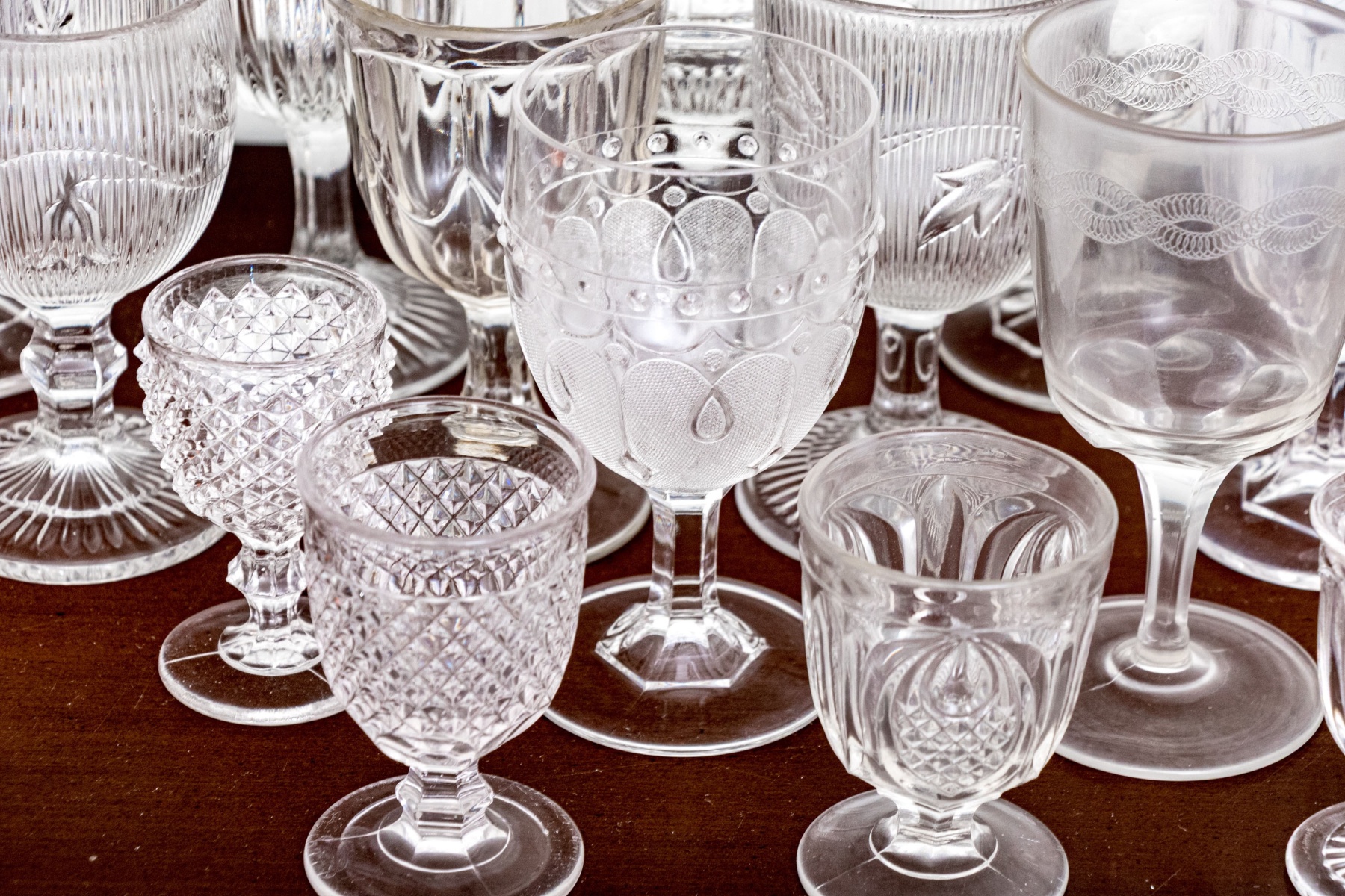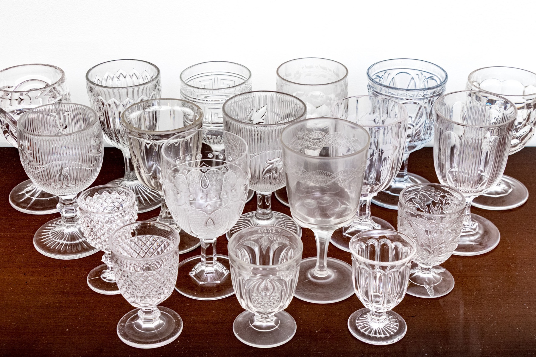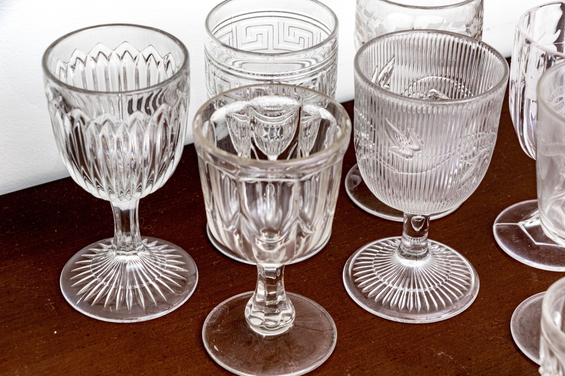 An elegant collection of eighteen glass goblets of varied sizes for wine, water, and spirits. Sizes range from 3 1/2” H to 6 1/4” H.