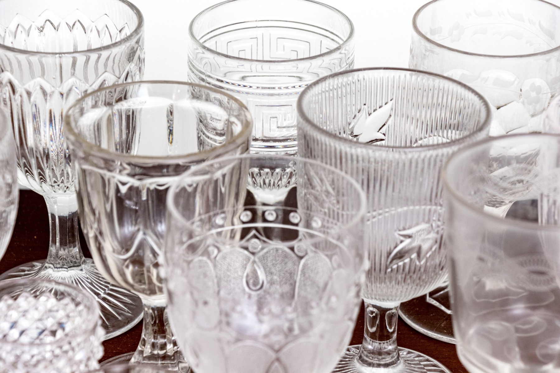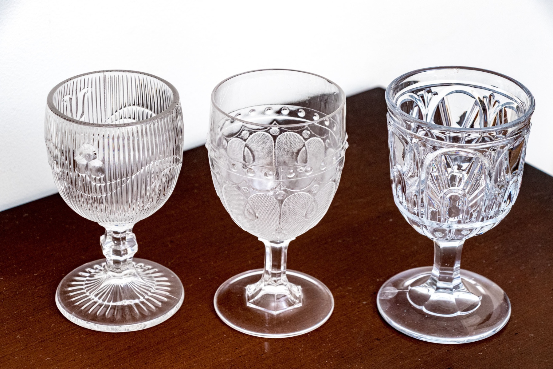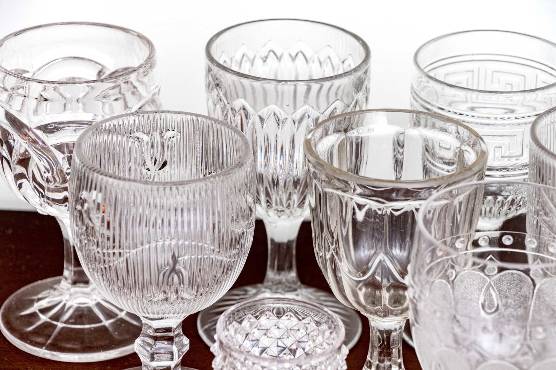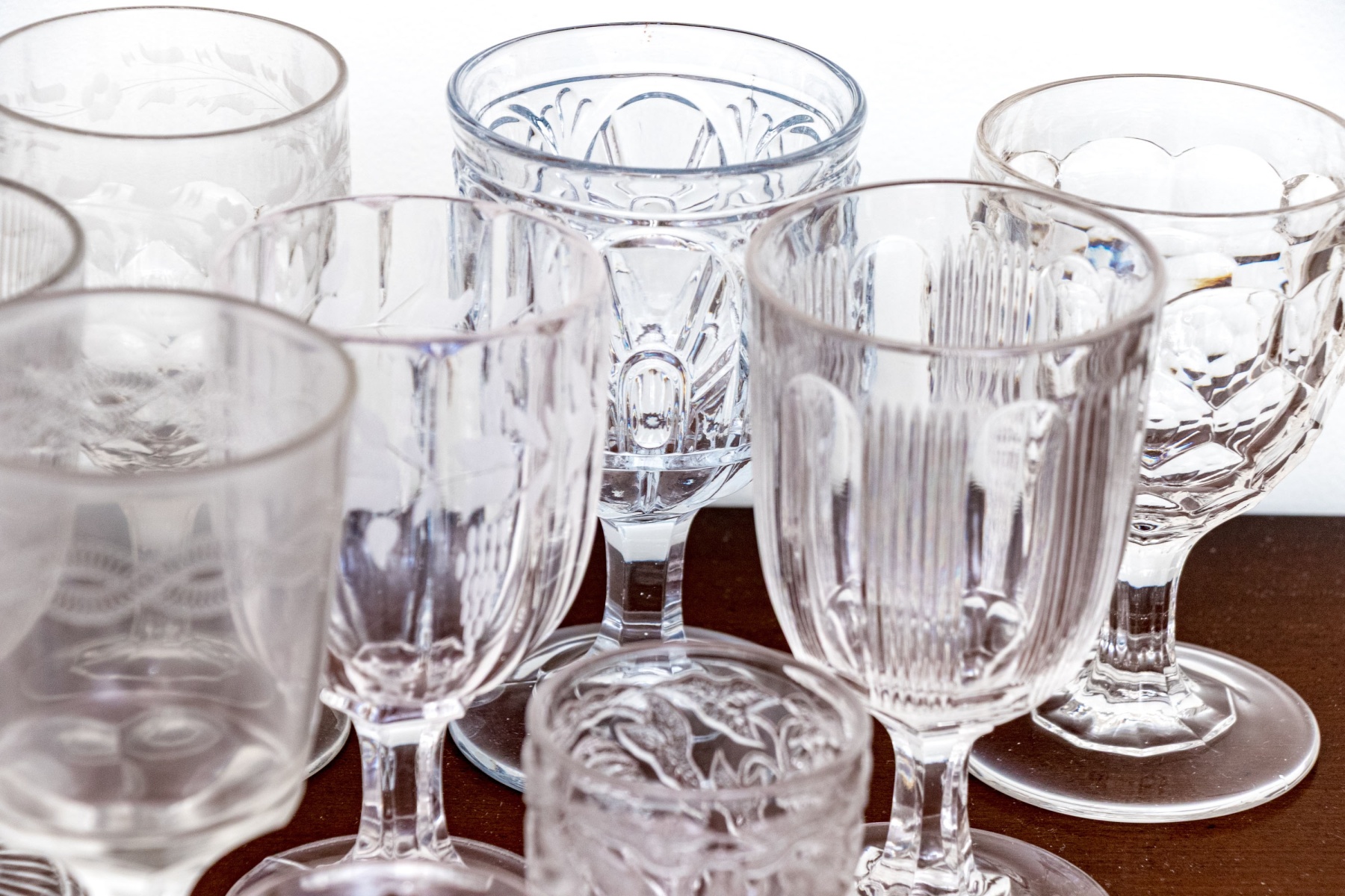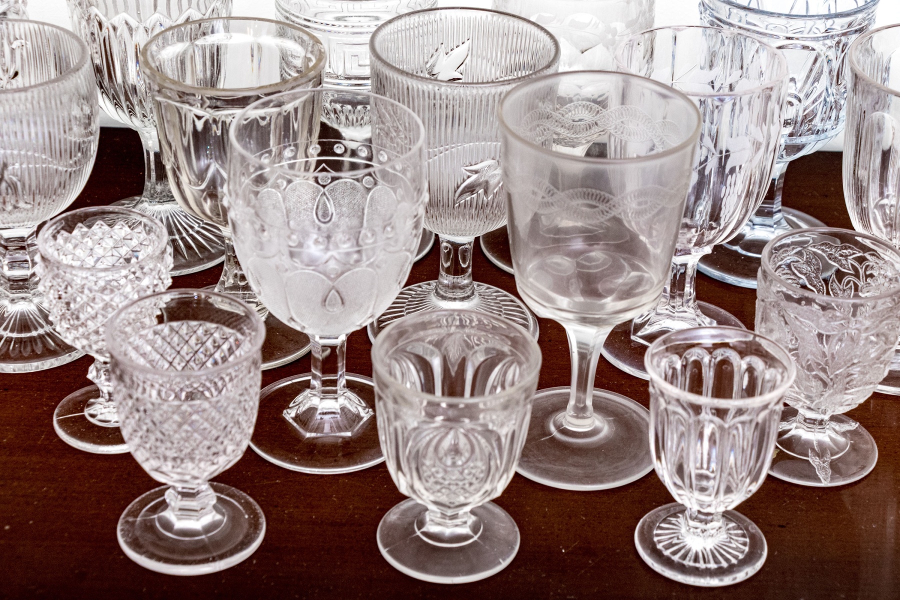 An elegant collection of eighteen glass goblets of varied sizes for wine, water, and spirits. Sizes range from 3 1/2” H to 6 1/4” H.