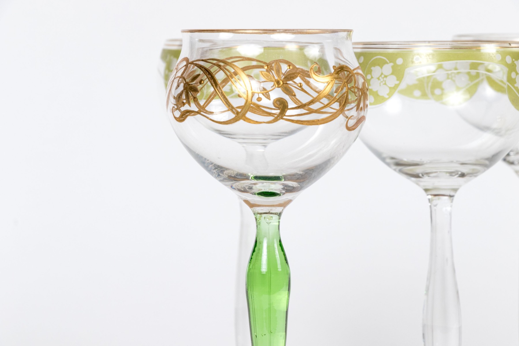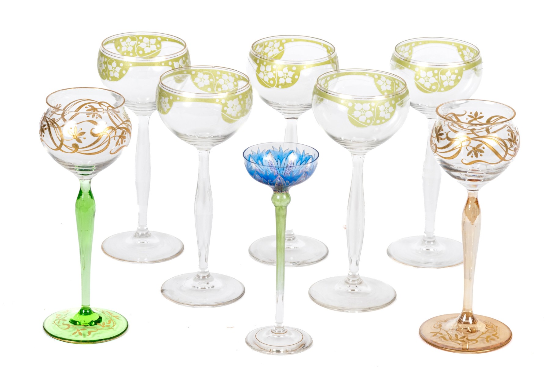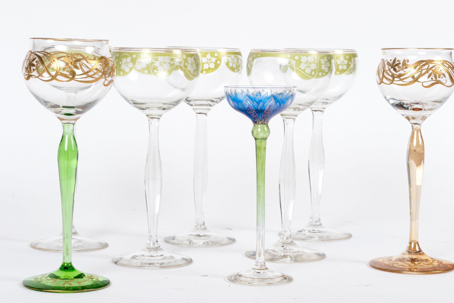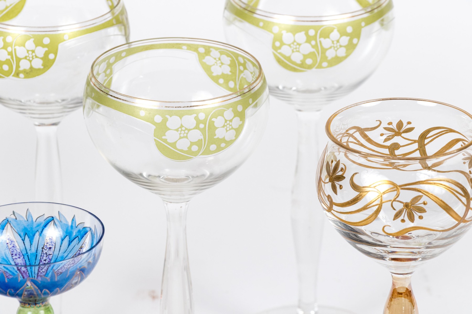 A delightful collection of glass goblets with round bowls, tall and dramatically tapered stems, and circular feet. Beautifully decorated with gilt, green, and blue floral motifs.