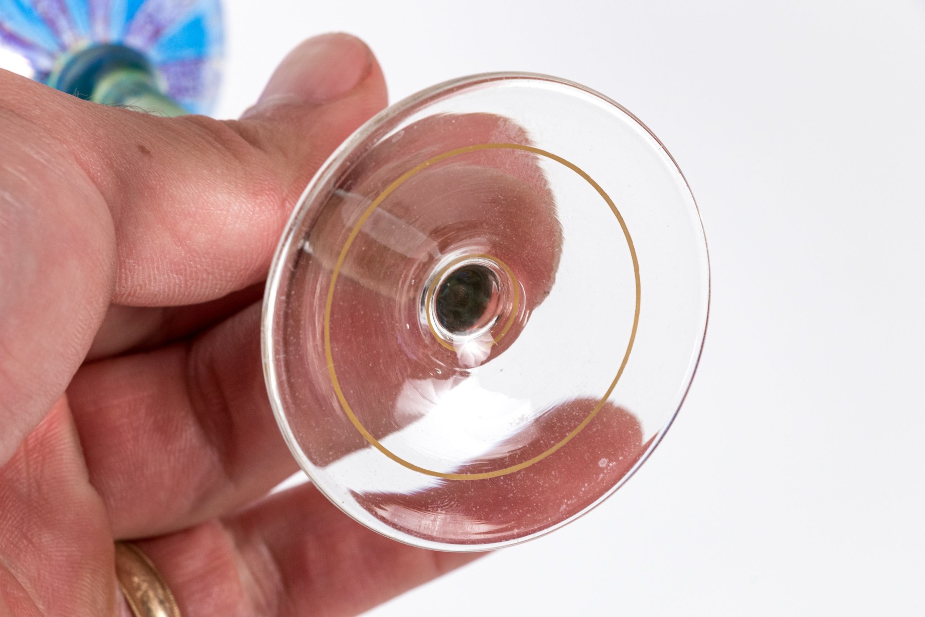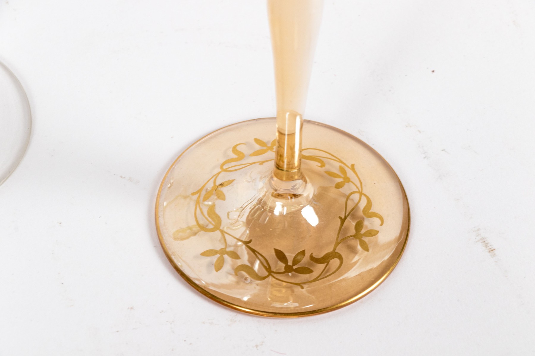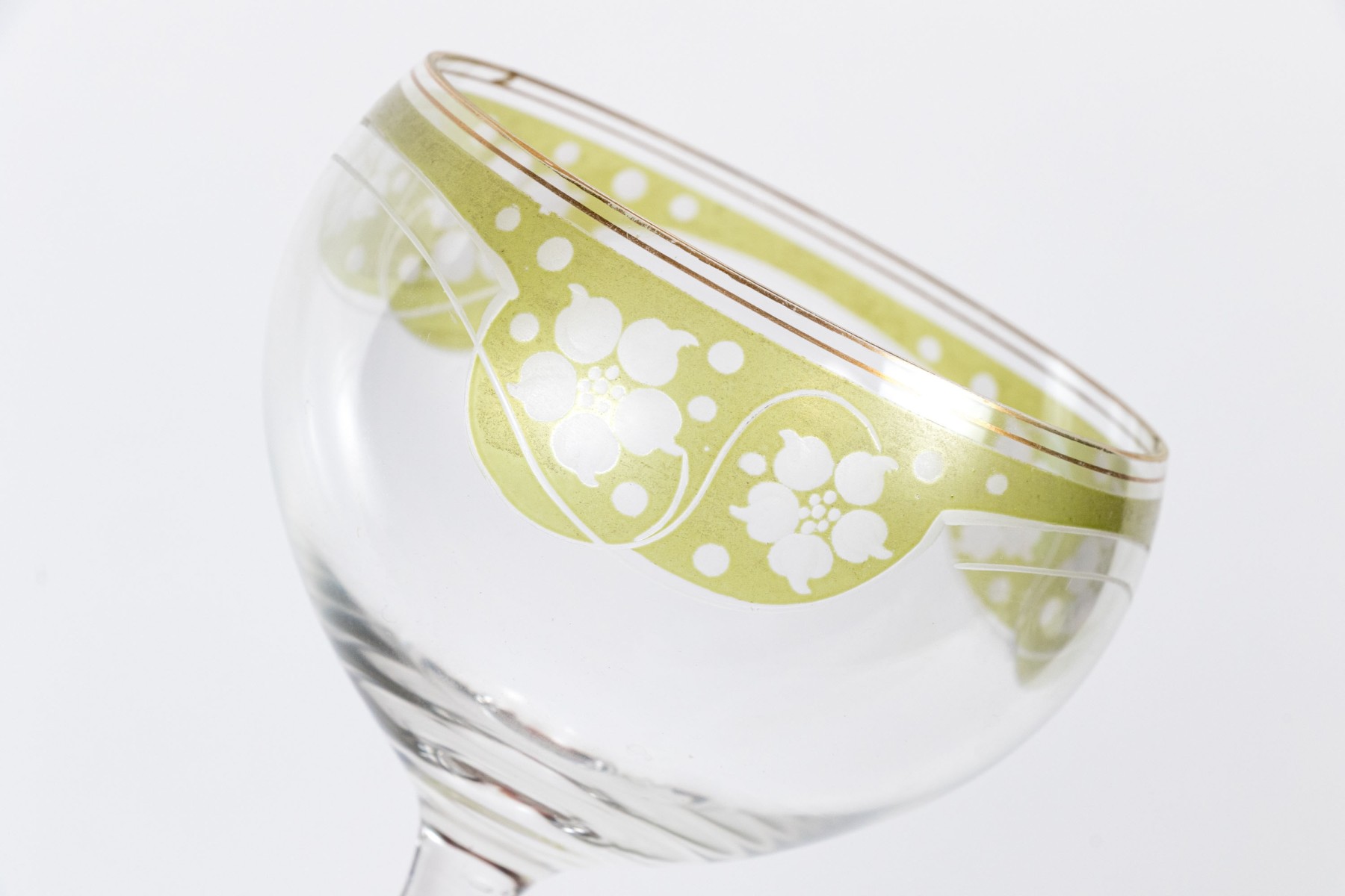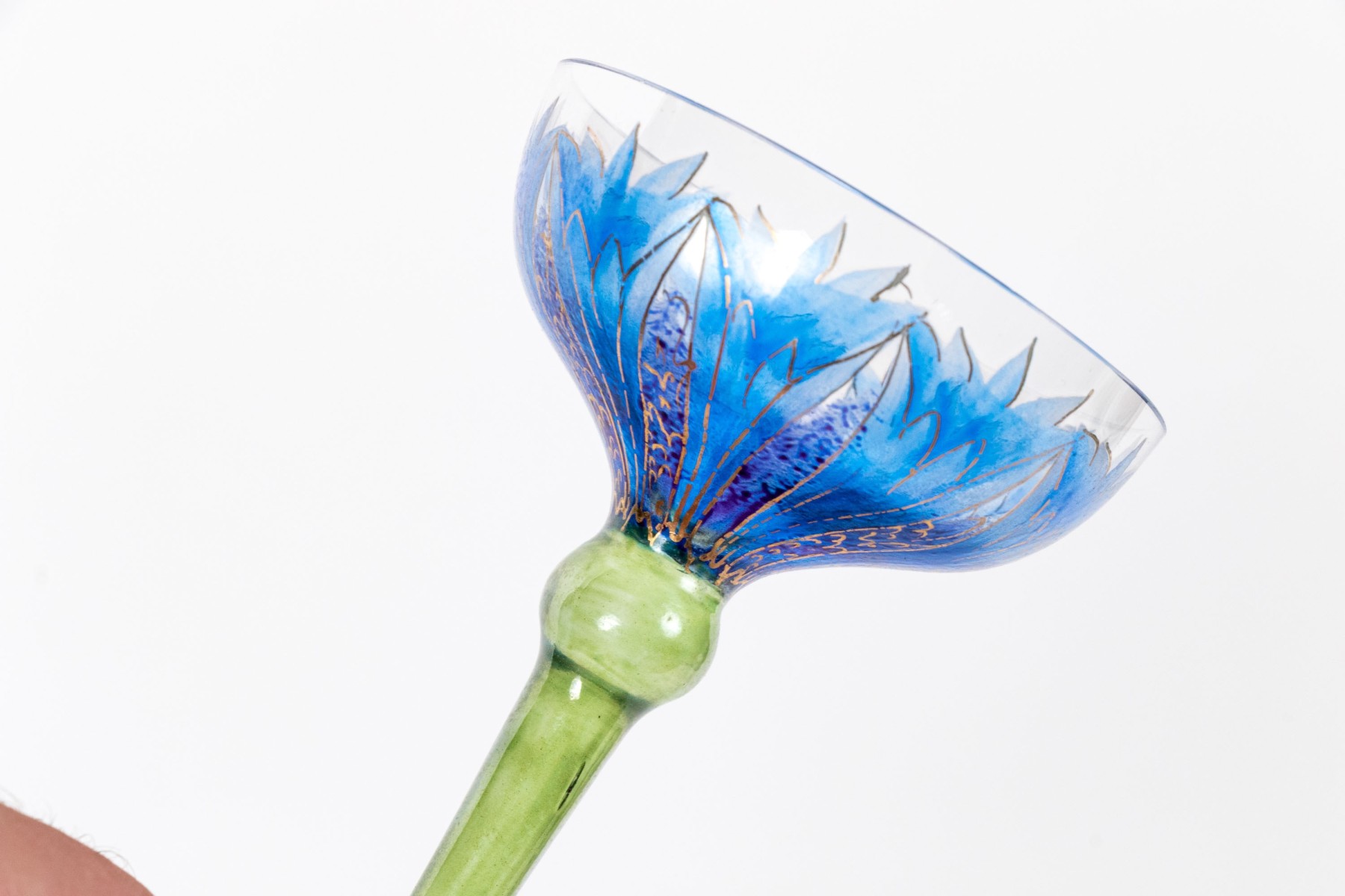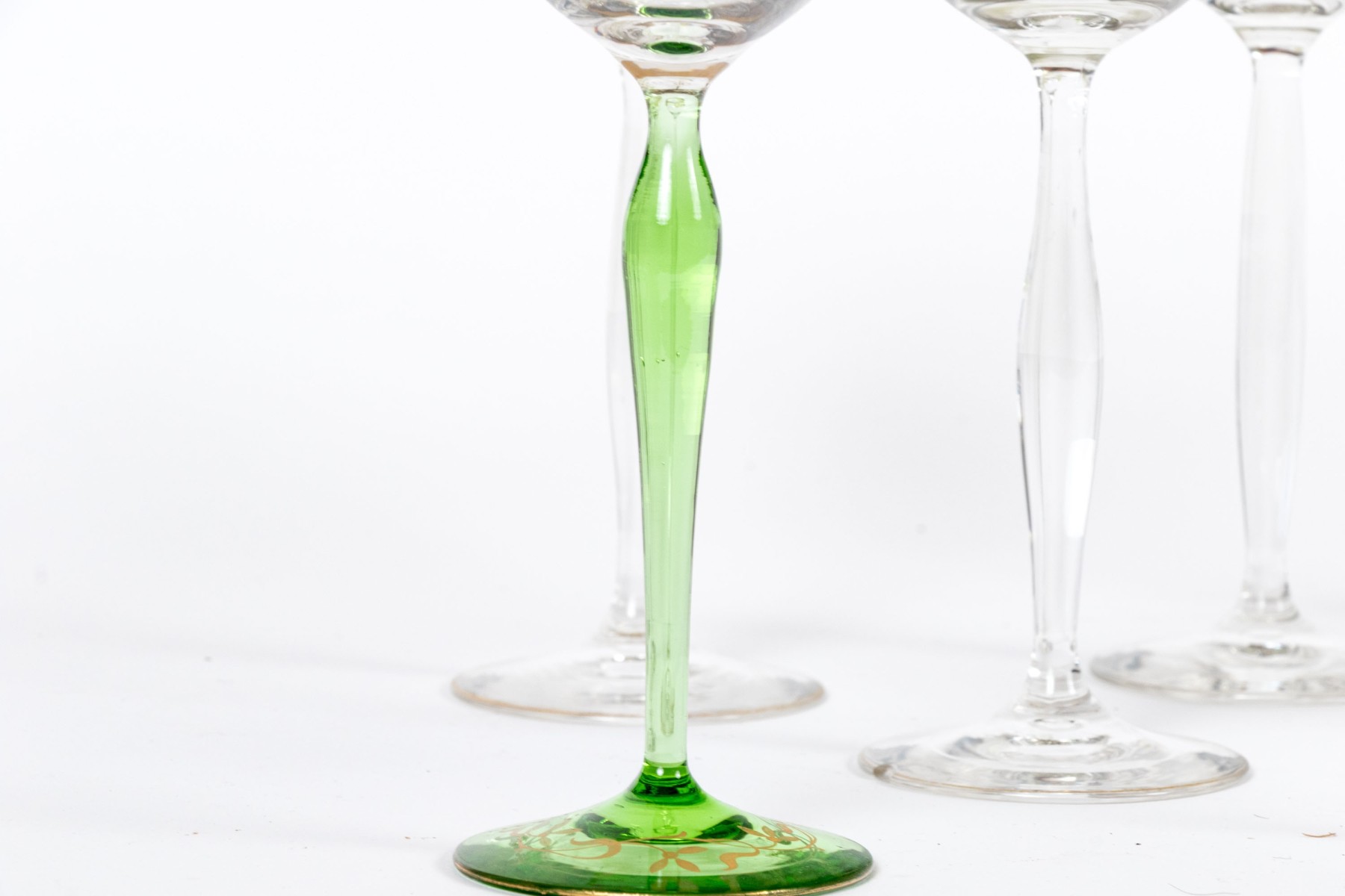 A delightful collection of glass goblets with round bowls, tall and dramatically tapered stems, and circular feet. Beautifully decorated with gilt, green, and blue floral motifs.