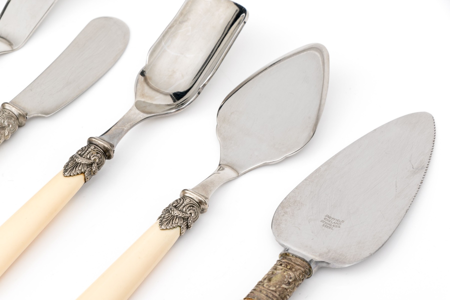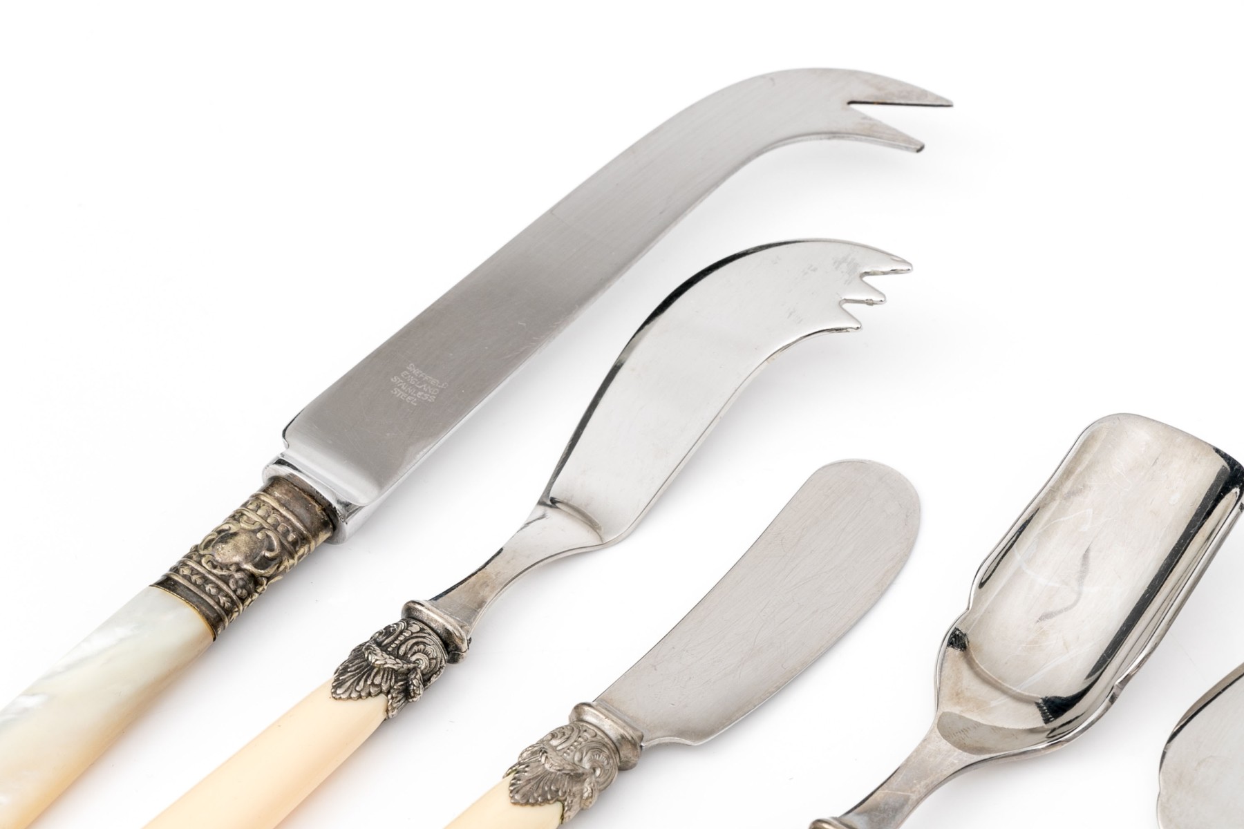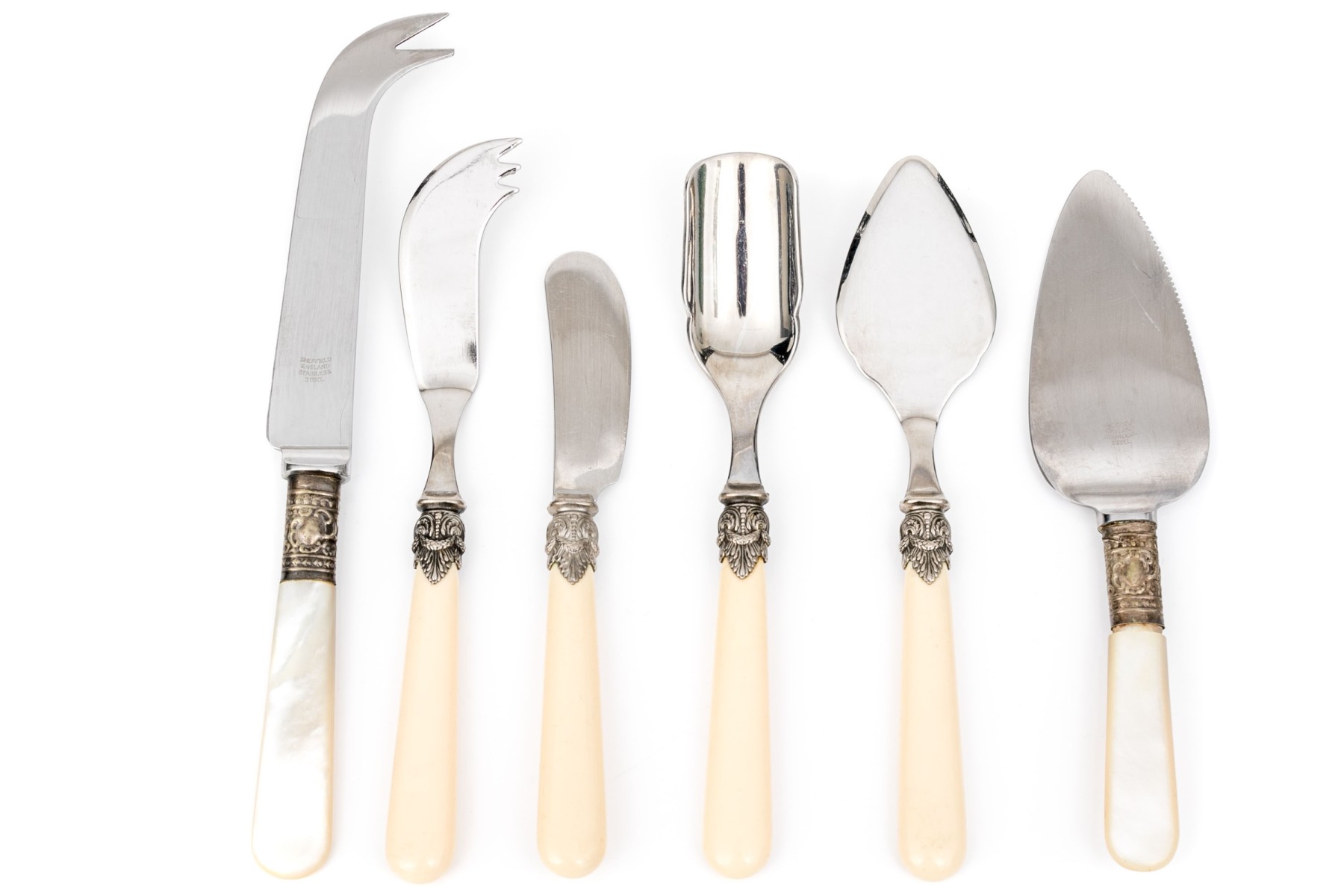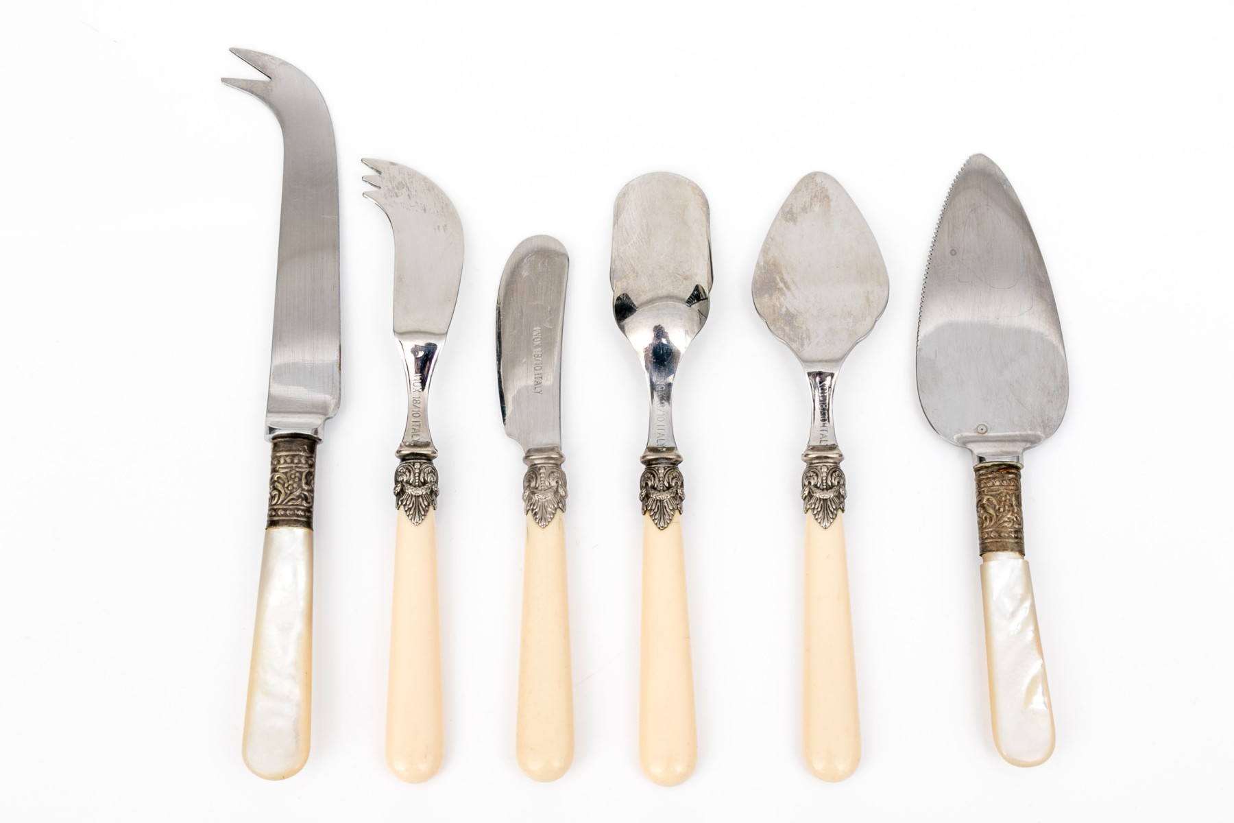 Comprised of four Italian bone handled and stainless serving pieces including a budder knife, marrow spoon, cheese fork and spade slice. Together with two pieces of English mother of pearl handled serving pieces including a cheese fork and slice.