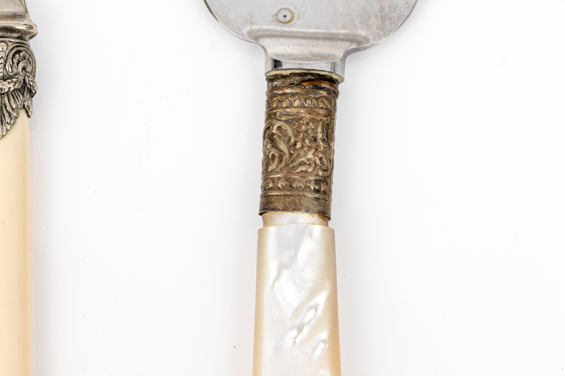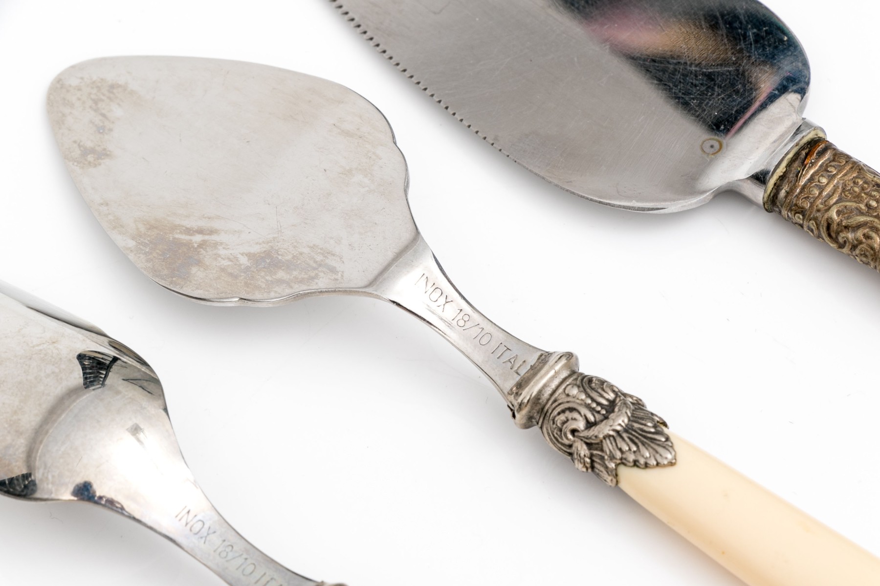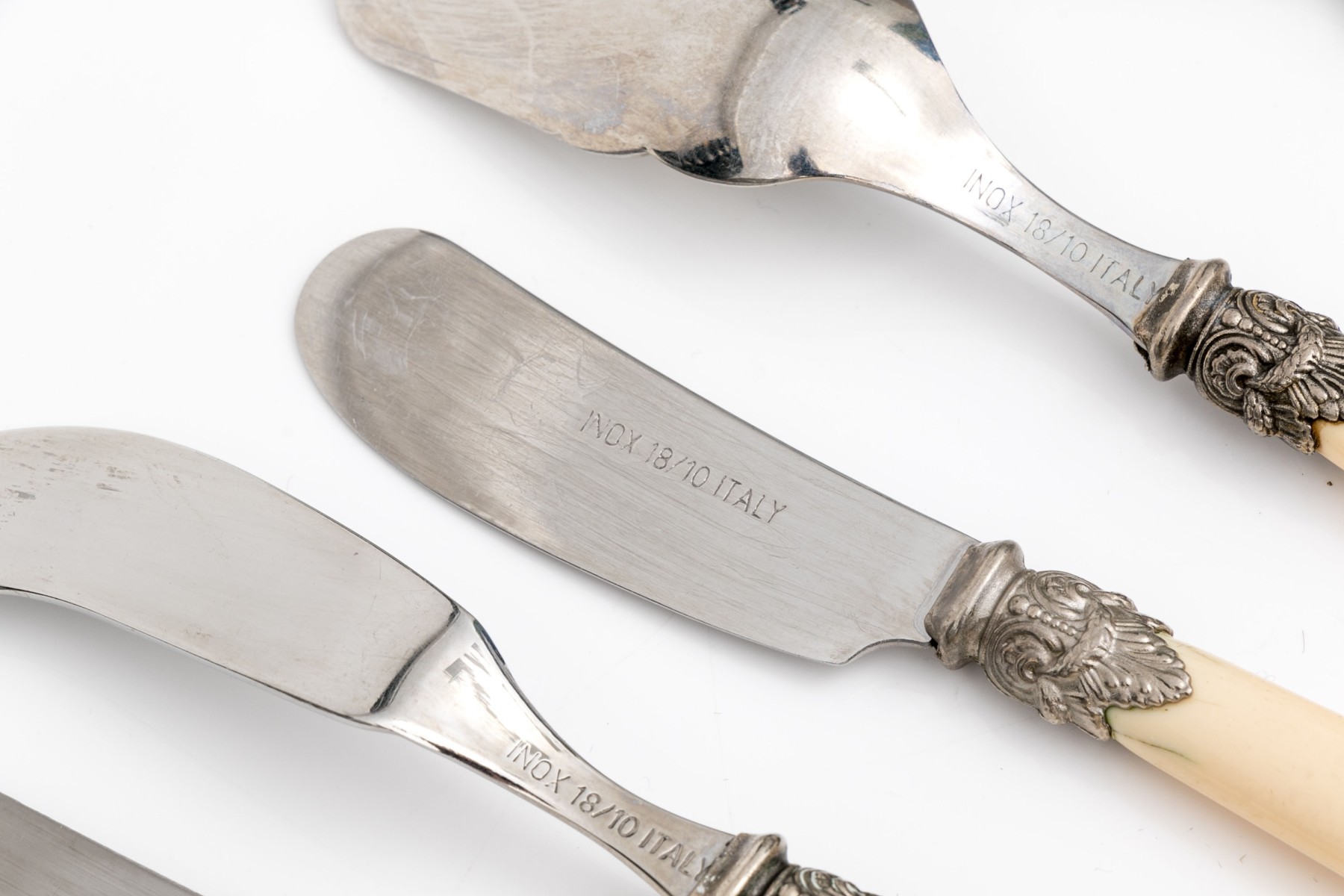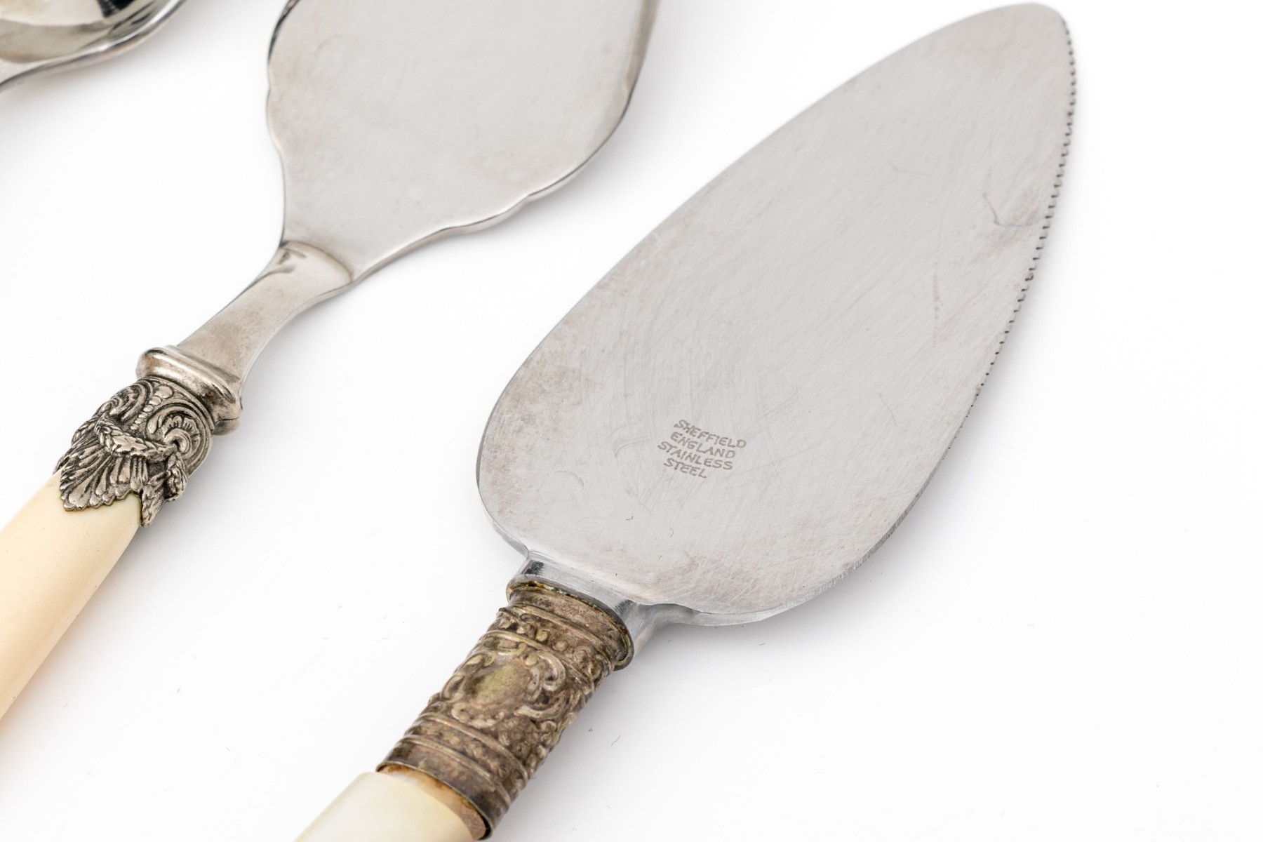 Comprised of four Italian bone handled and stainless serving pieces including a budder knife, marrow spoon, cheese fork and spade slice. Together with two pieces of English mother of pearl handled serving pieces including a cheese fork and slice.