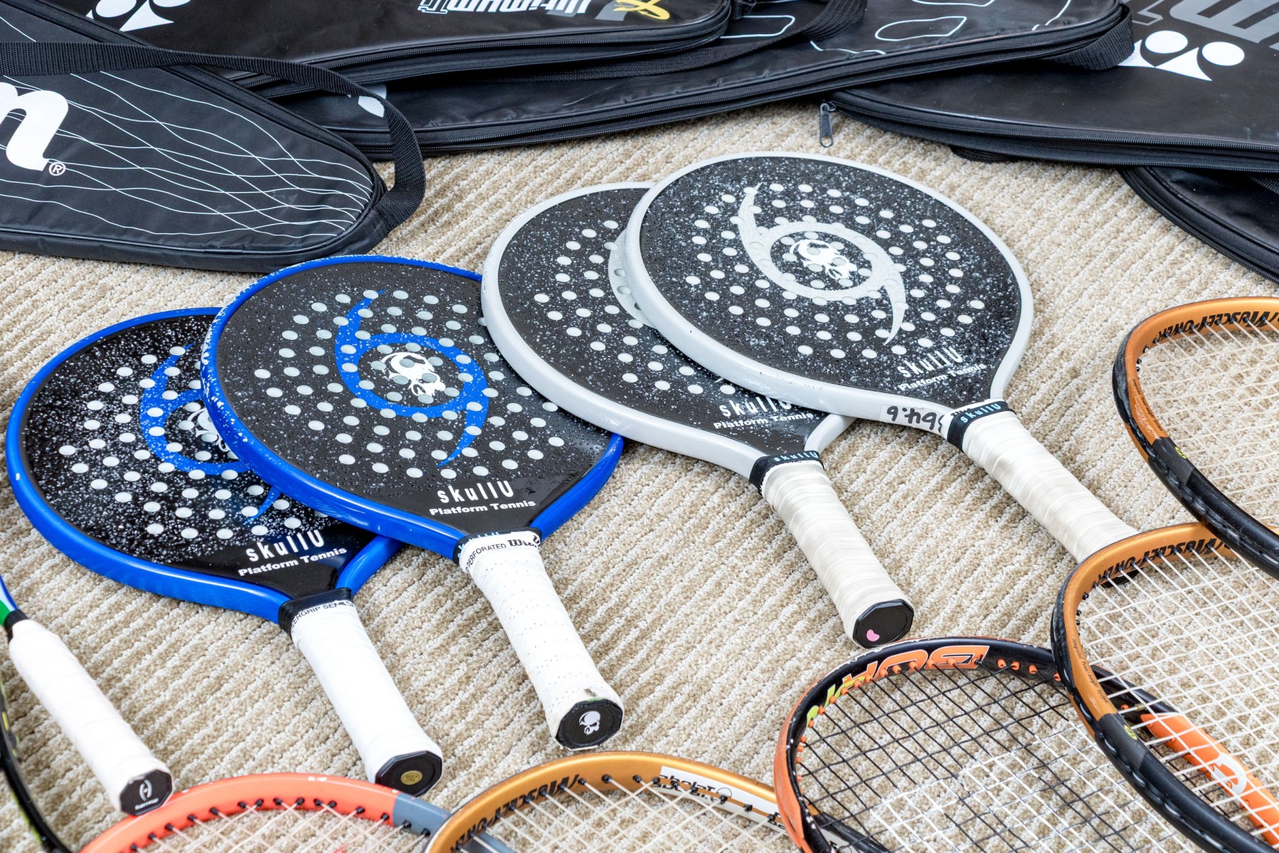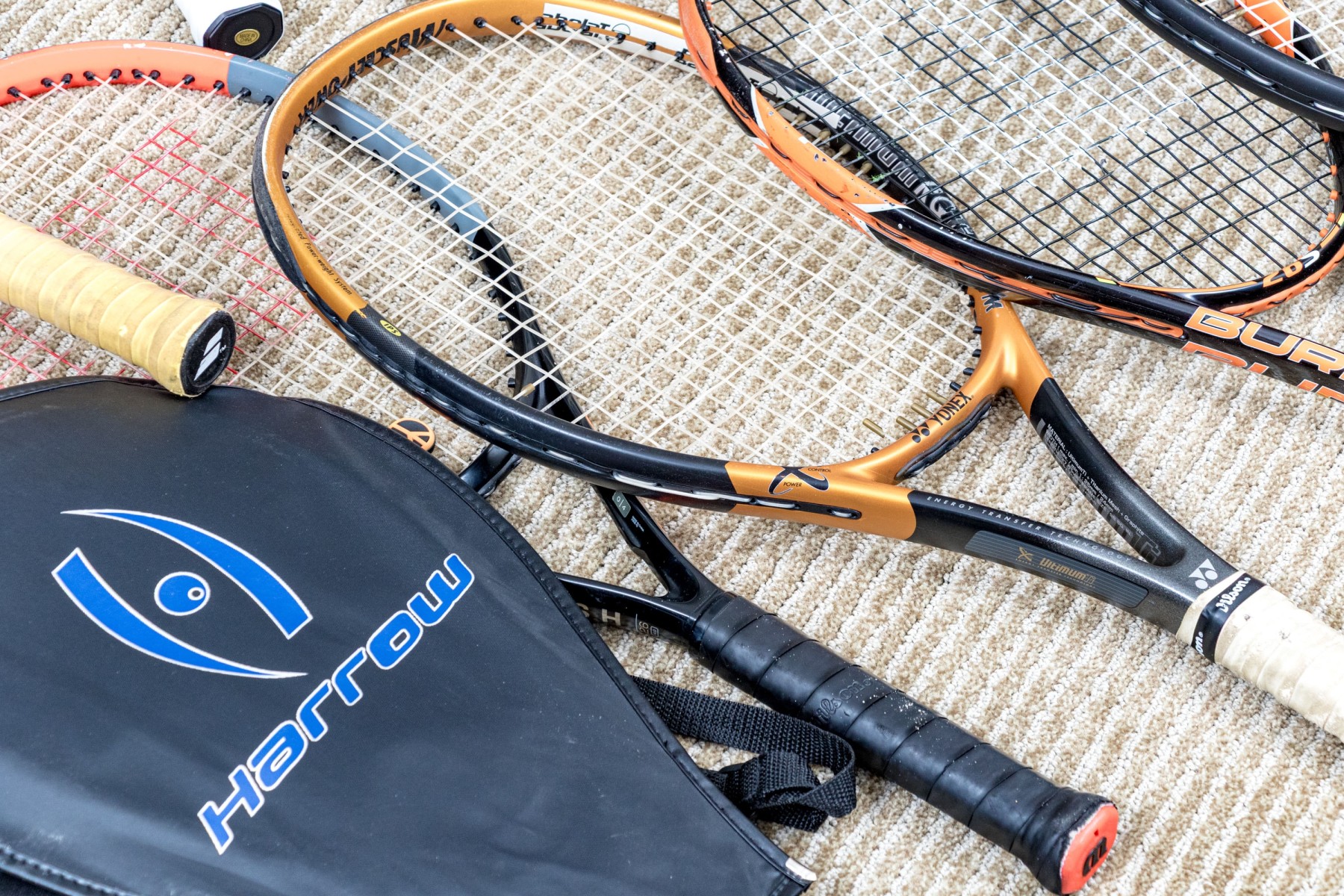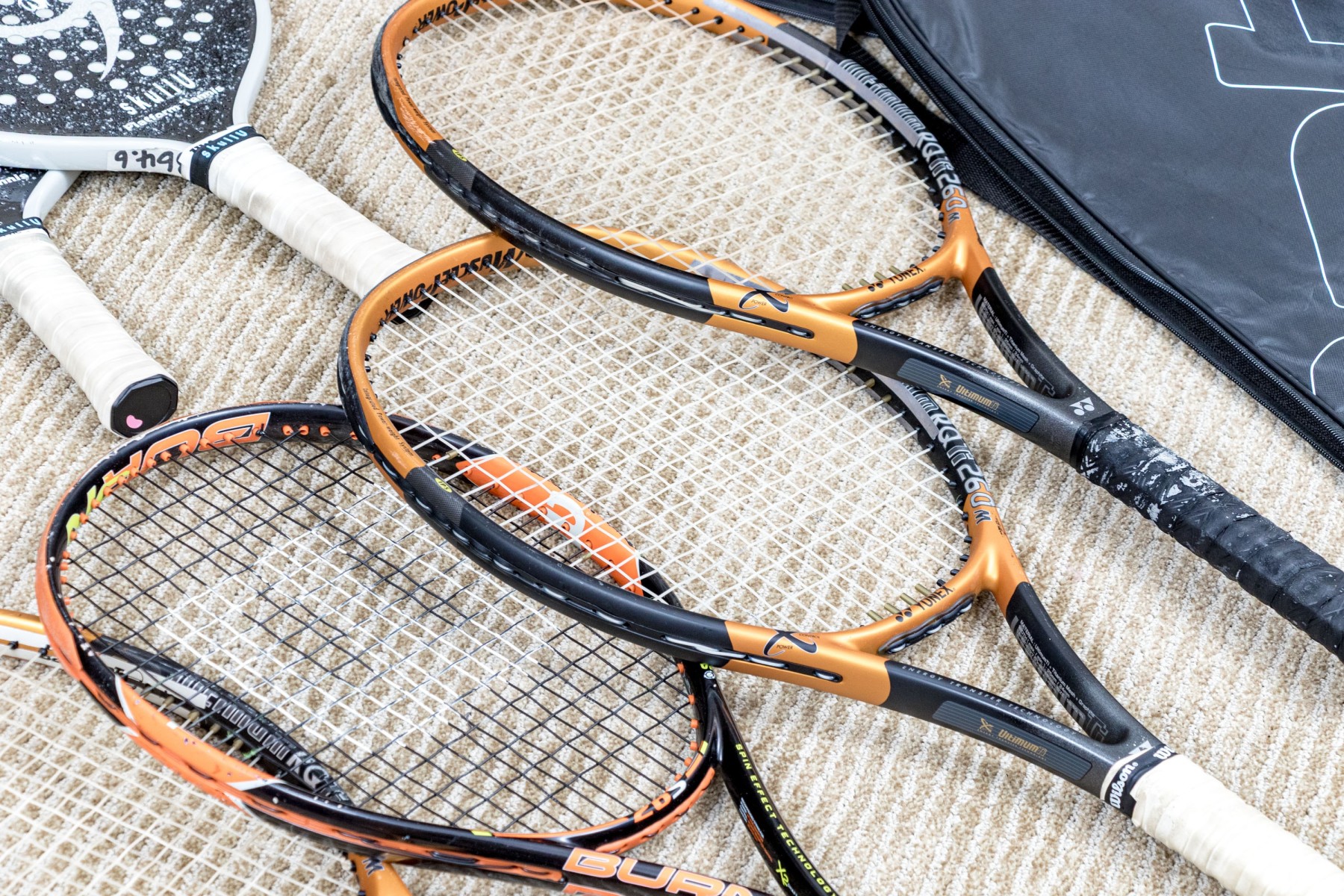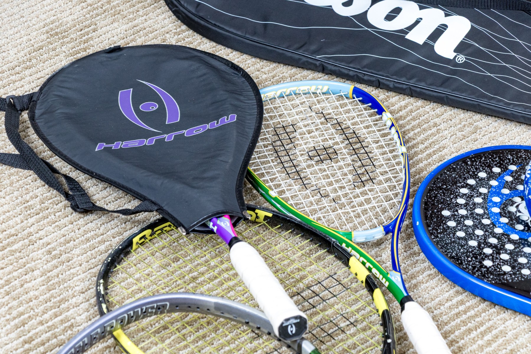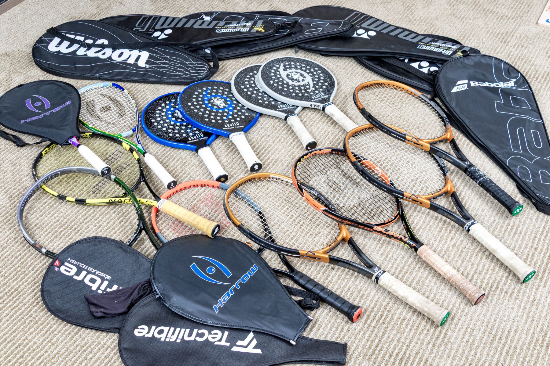 A sizable collection of tennis rackets (one un-strung) and four paddle tennis rackets. Brands including Wilson and SkuIU among others.