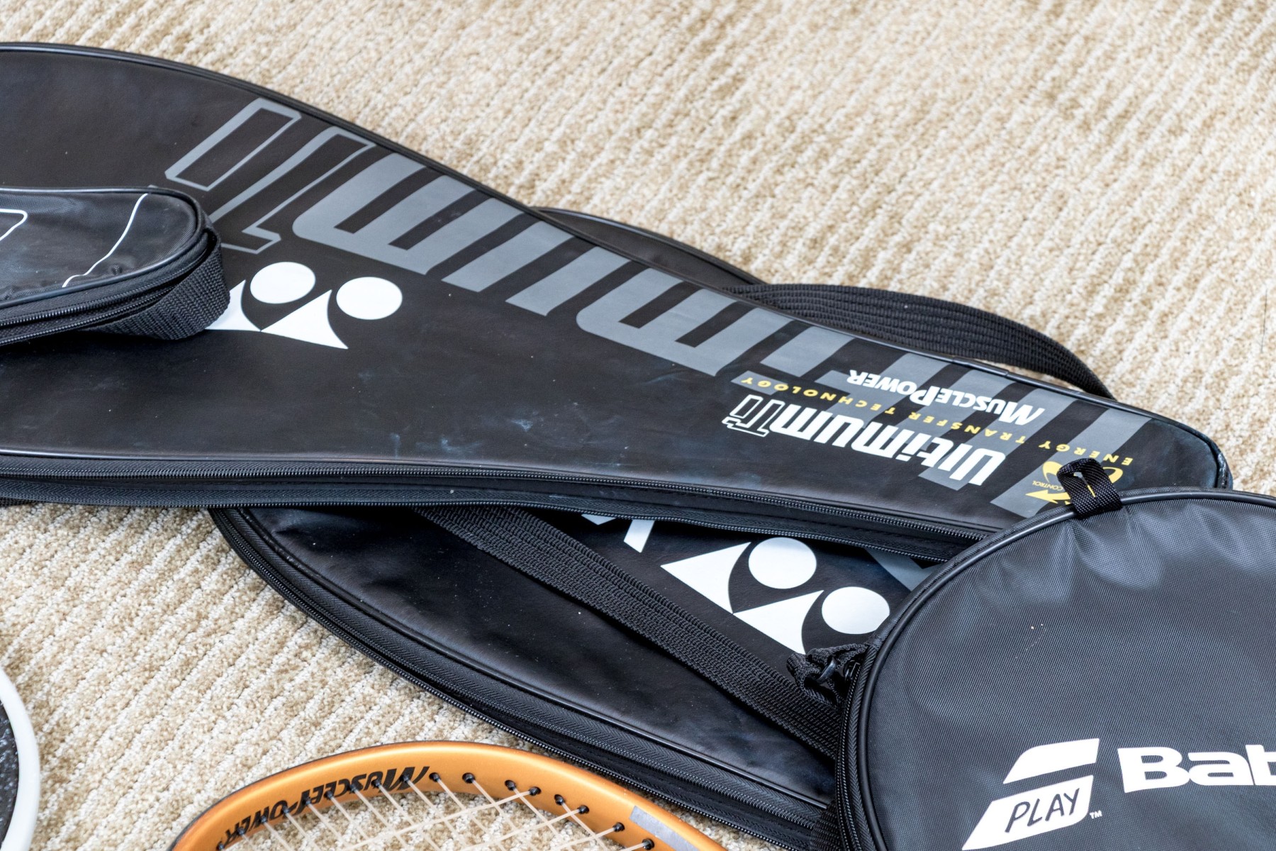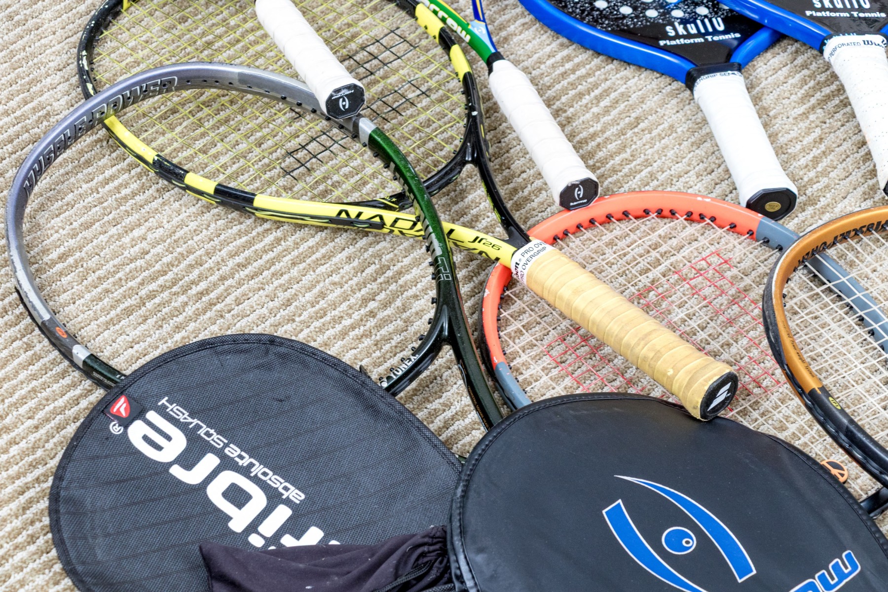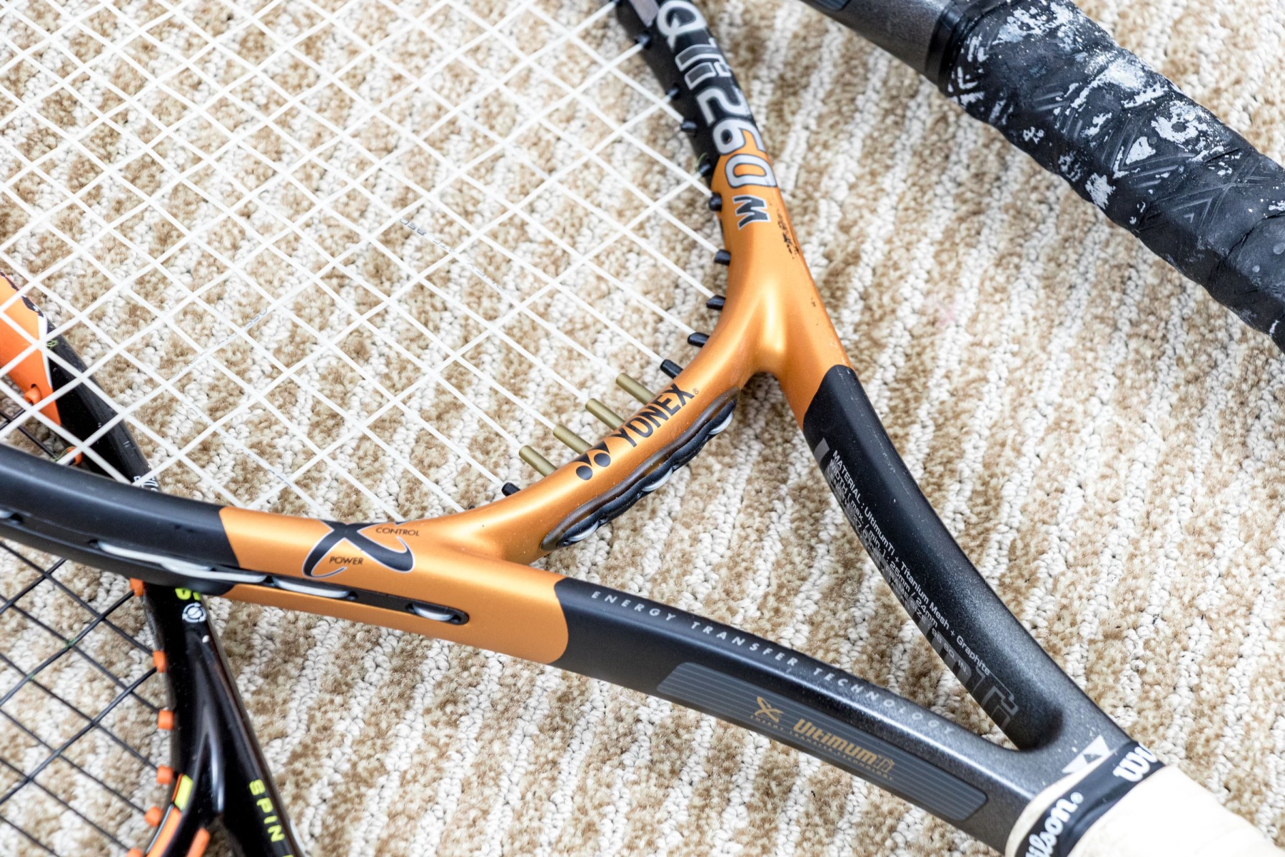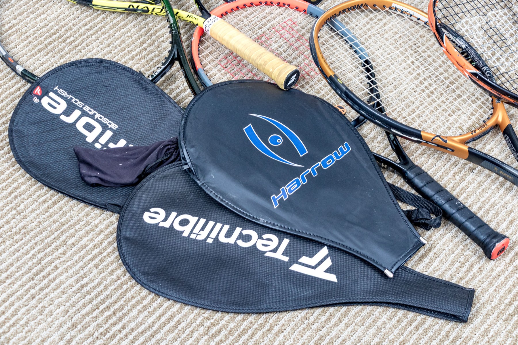 A sizable collection of tennis rackets (one un-strung) and four paddle tennis rackets. Brands including Wilson and SkuIU among others.