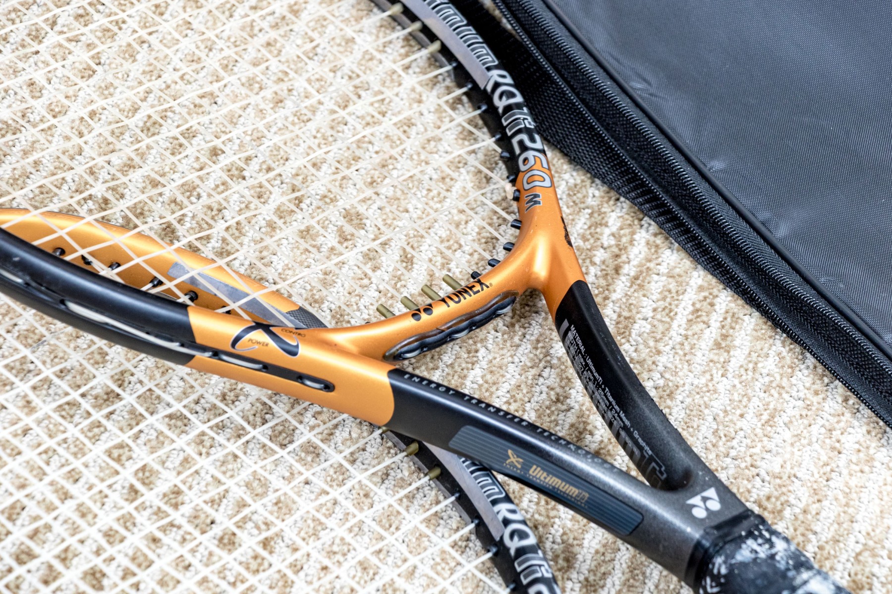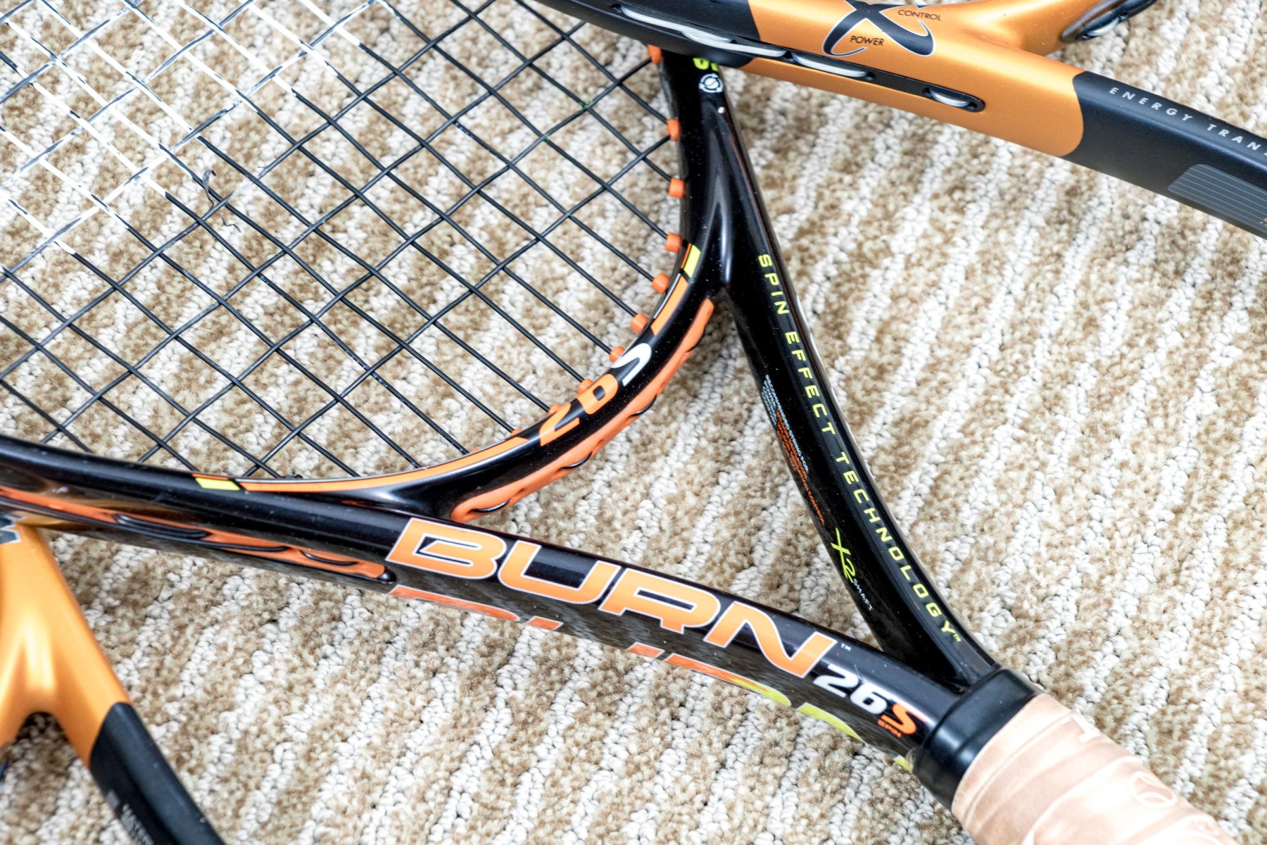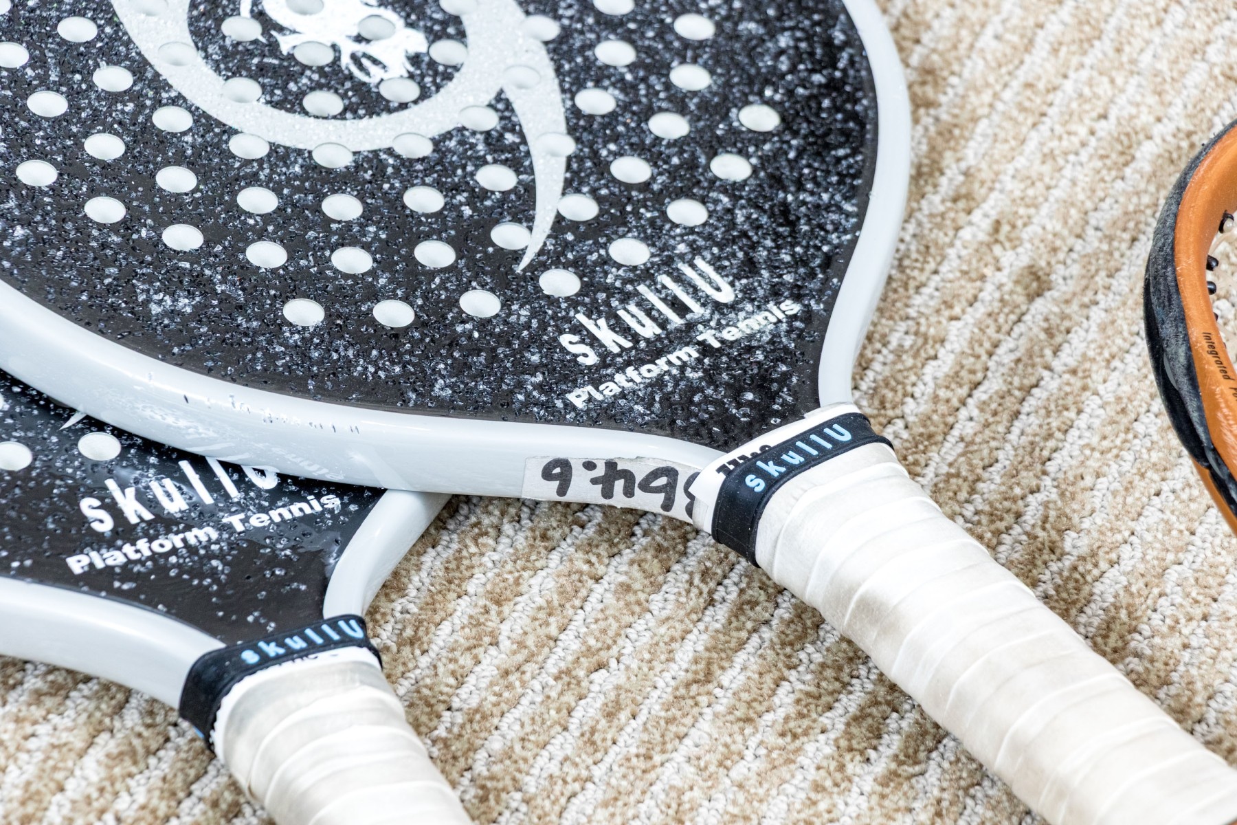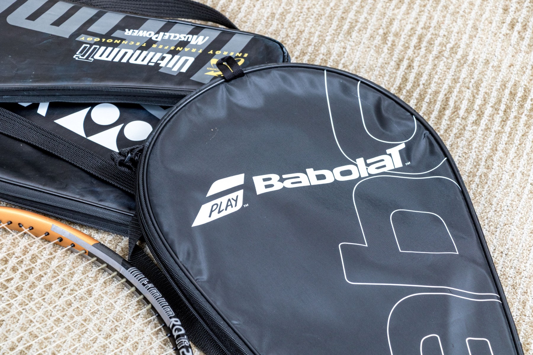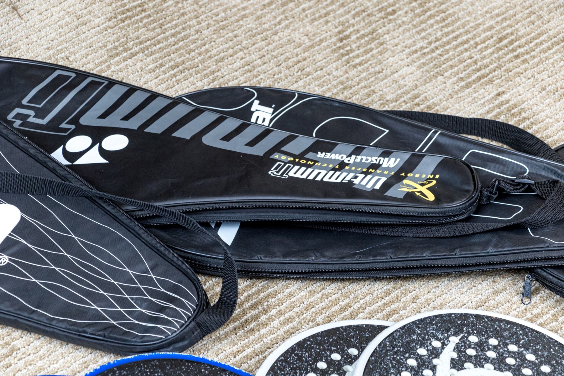 A sizable collection of tennis rackets (one un-strung) and four paddle tennis rackets. Brands including Wilson and SkuIU among others.