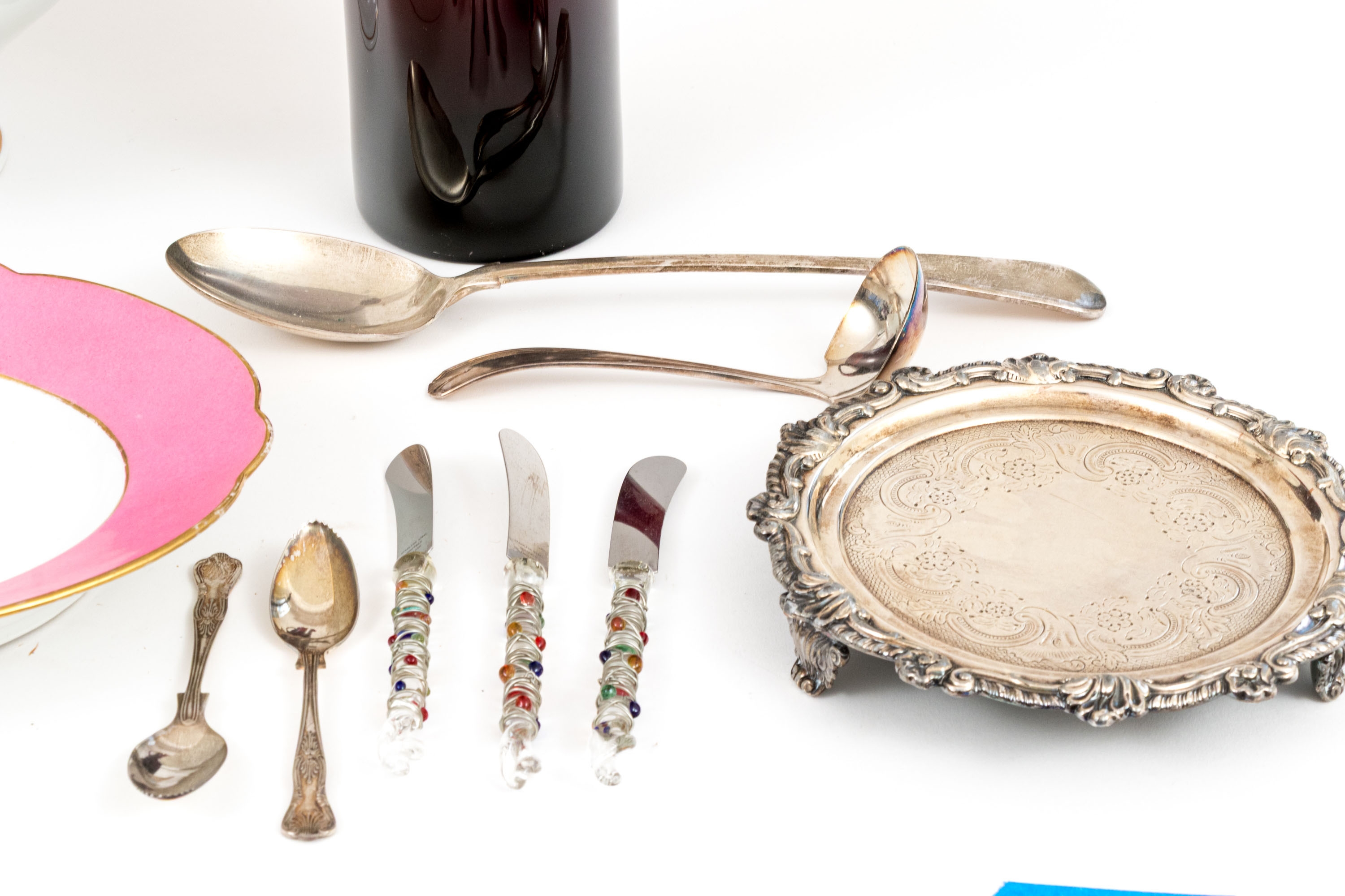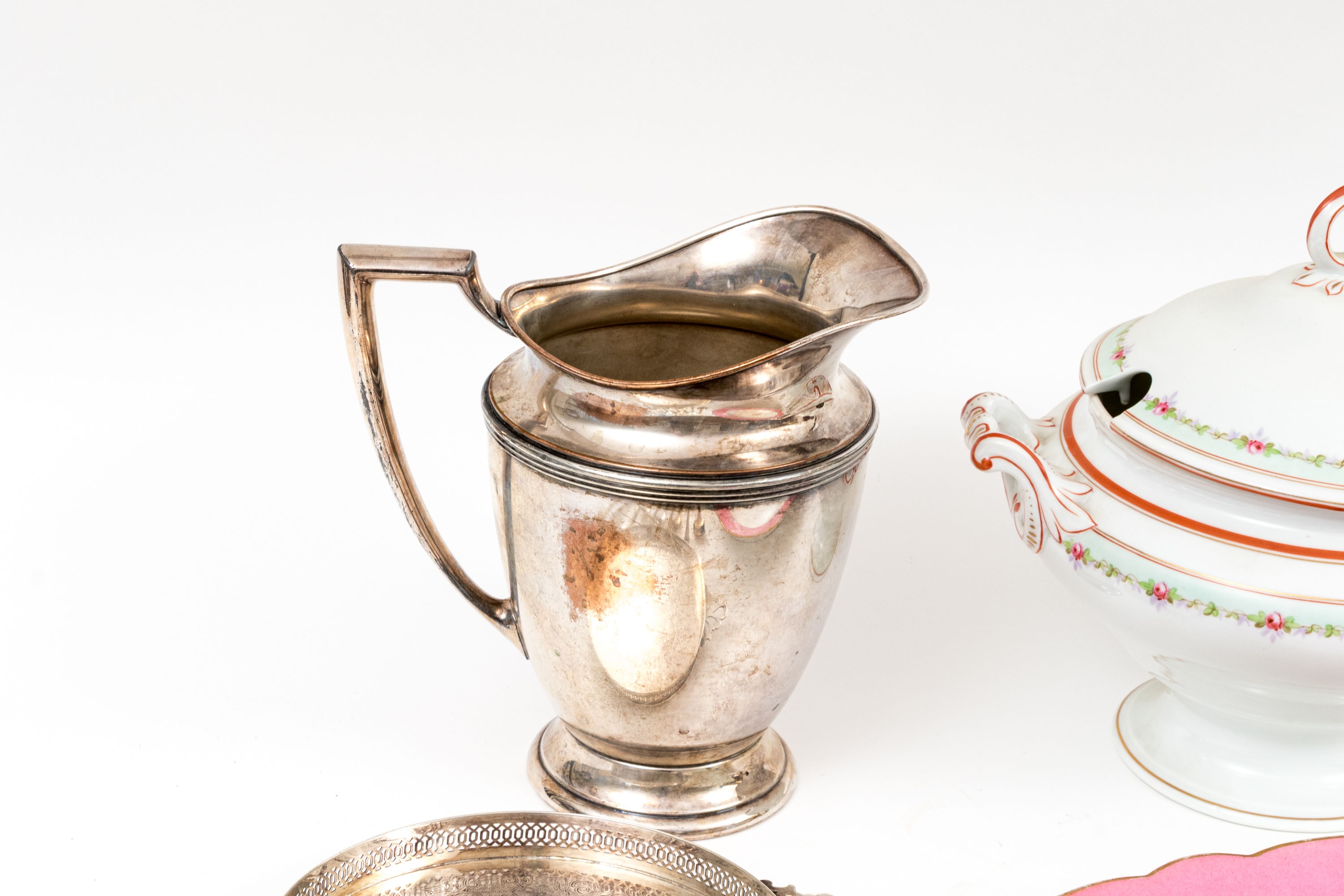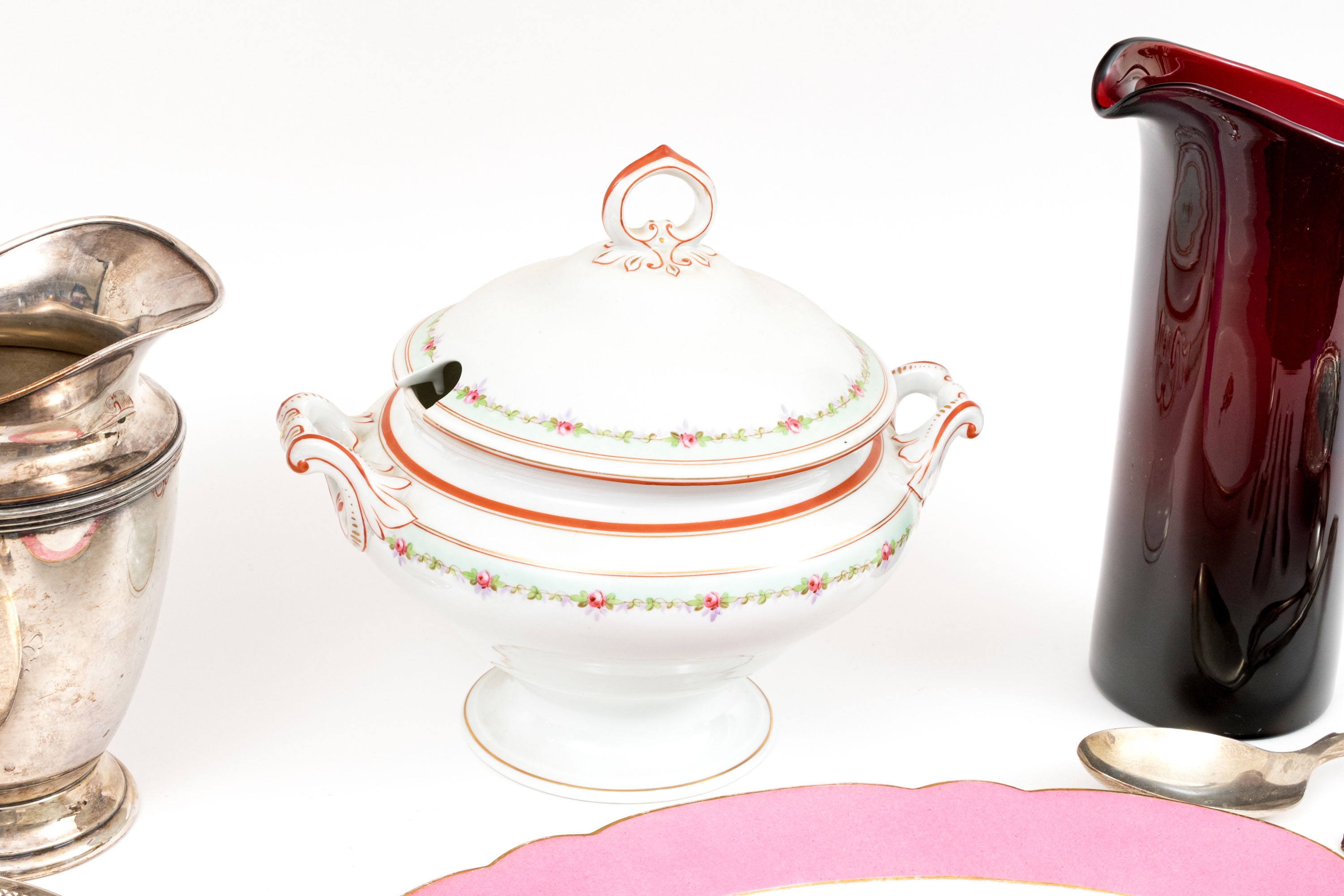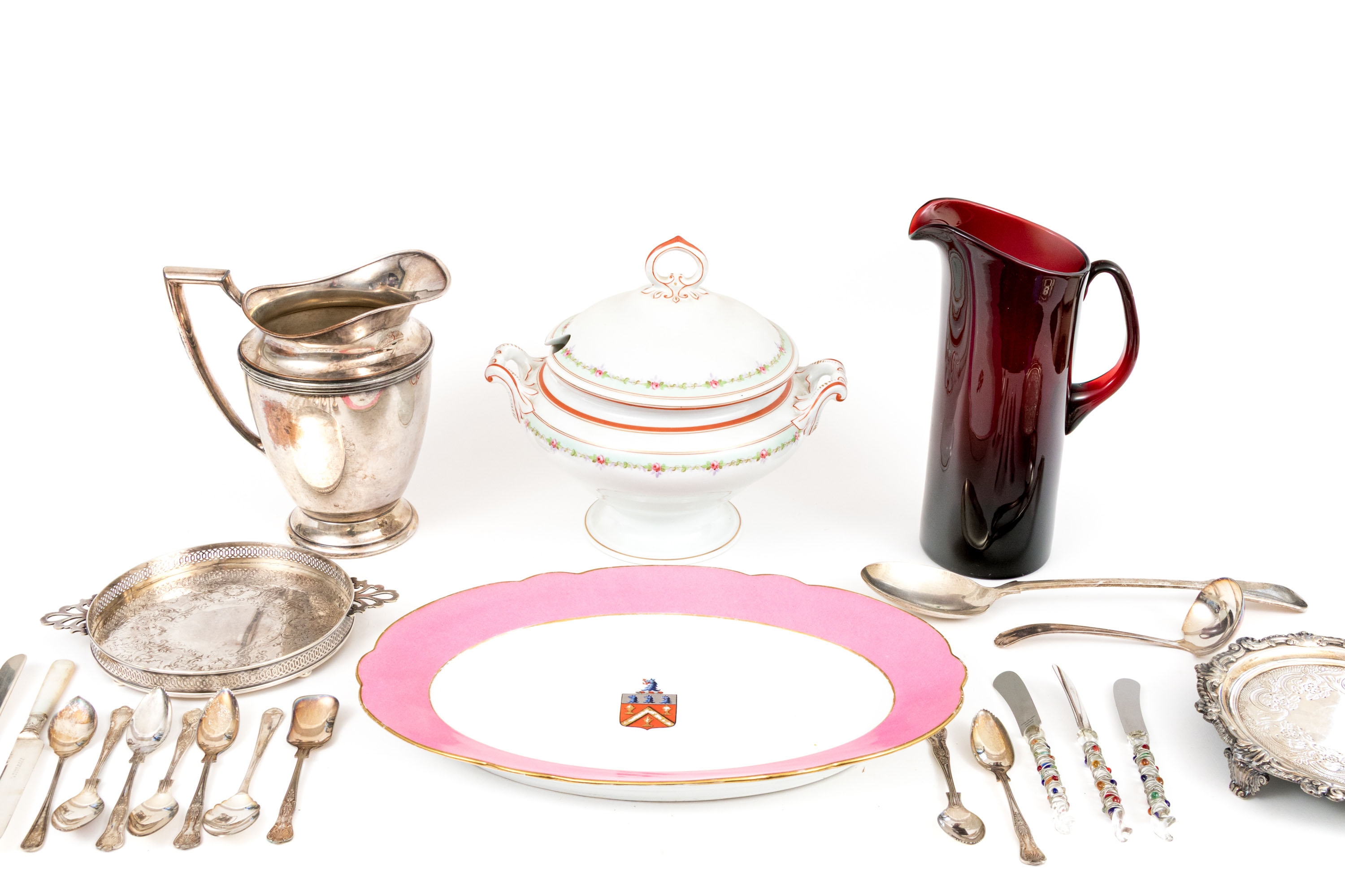Comprised of: William Rogers "Exeter" water pitcher, a ruby glass water pitcher, an oval porcelain serving platter with pink finished rim and gilt finished trim, twin handled and lidded footed tureen, two silver plated waiter trays, 17 assorted flatware.
