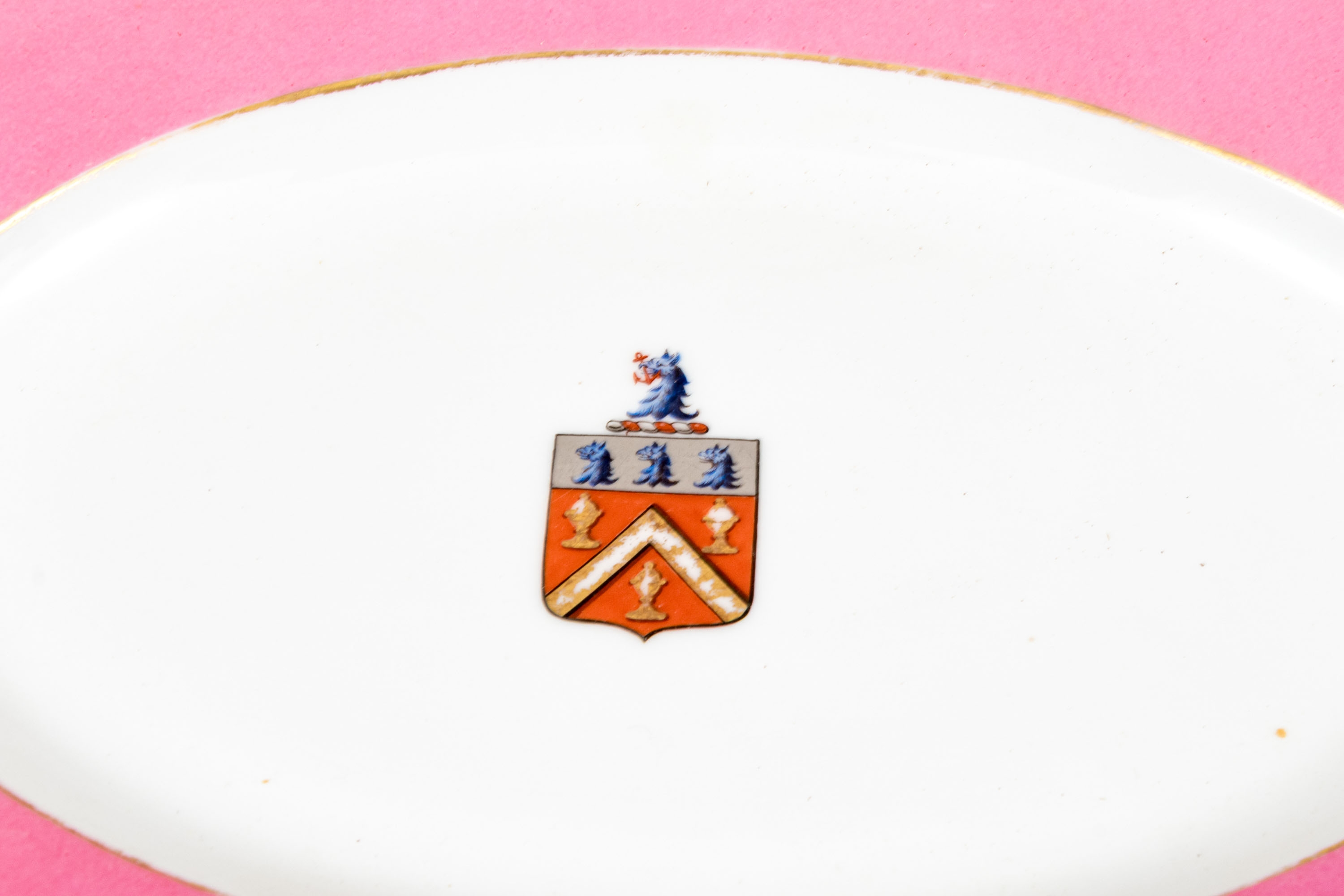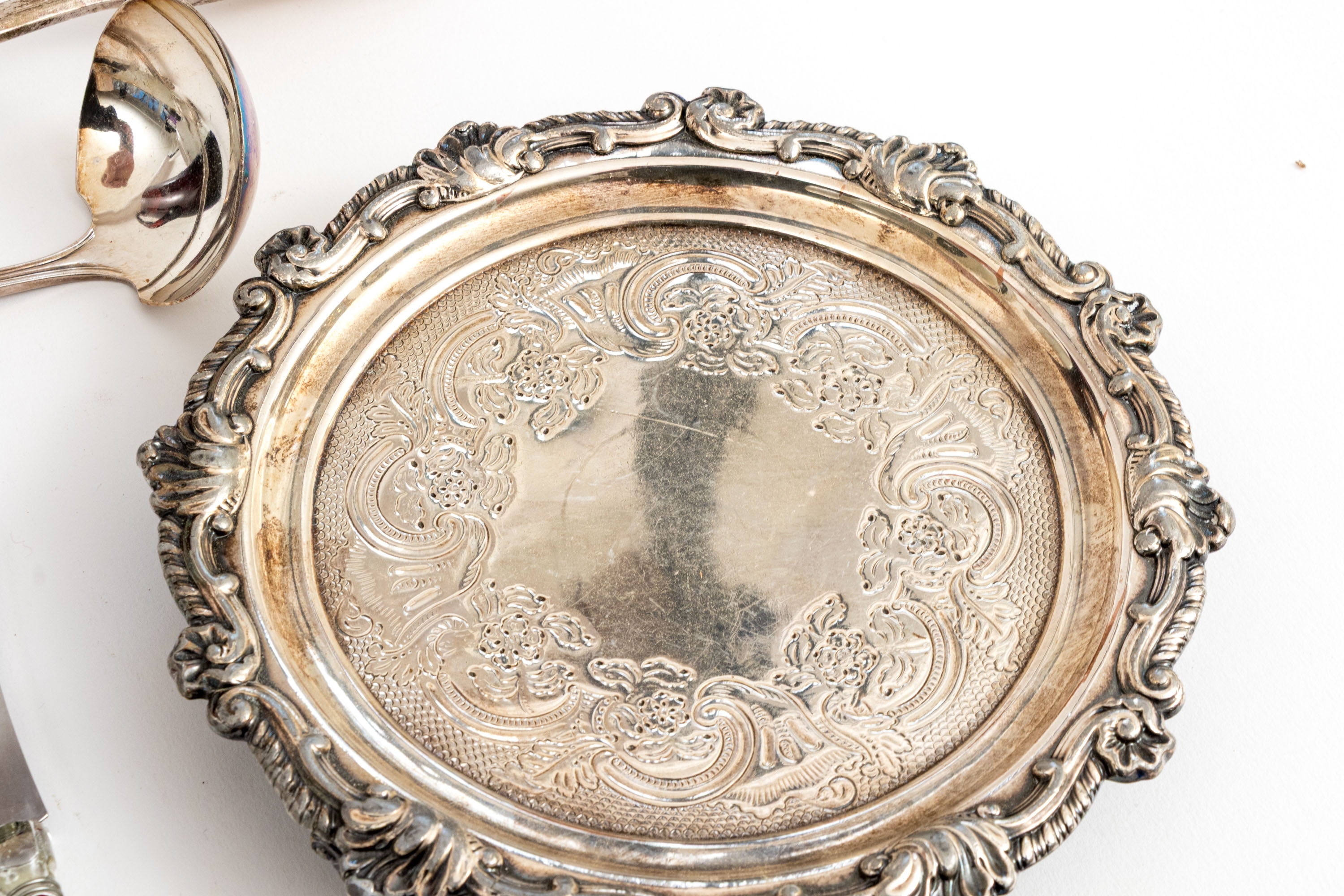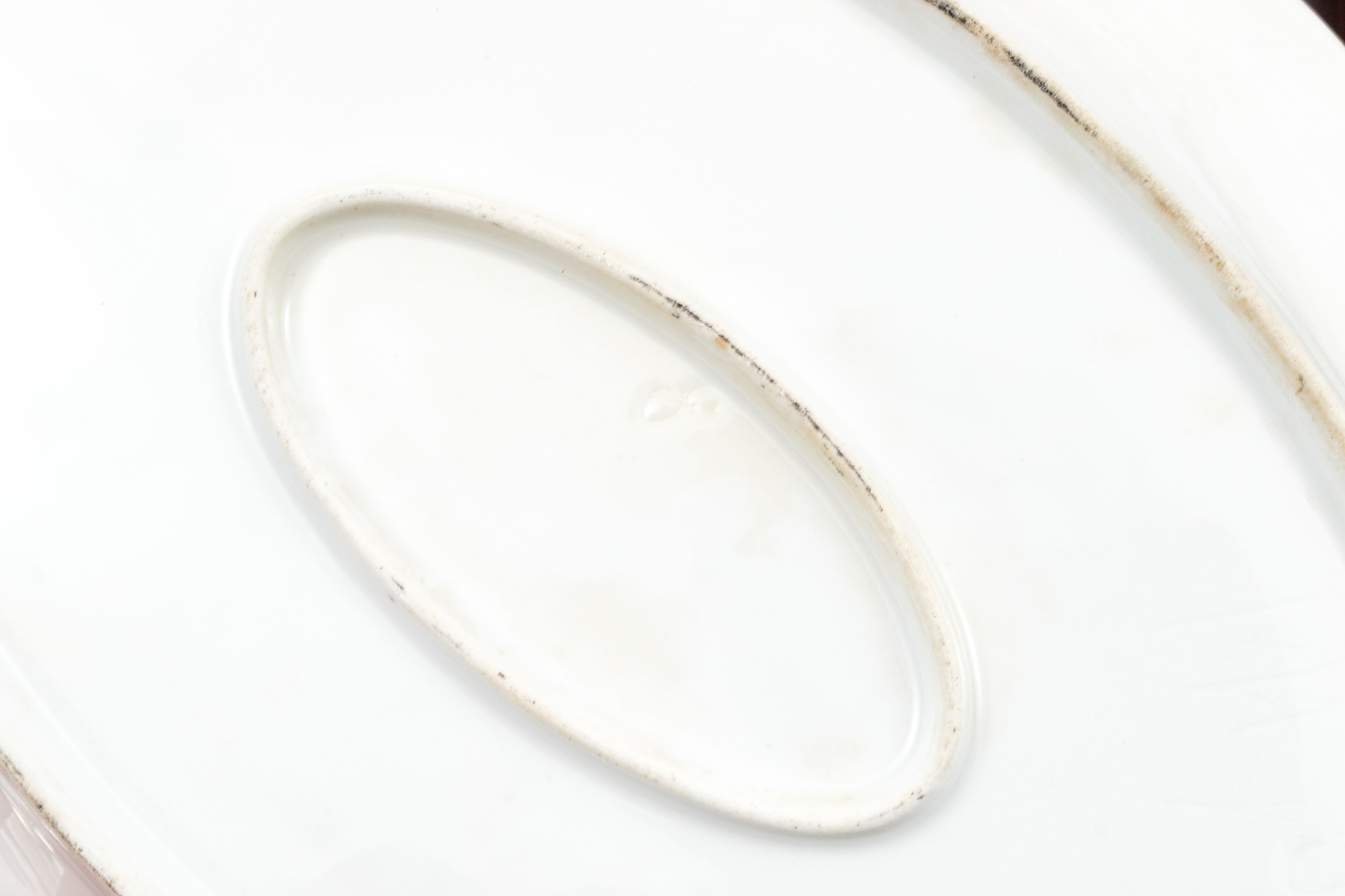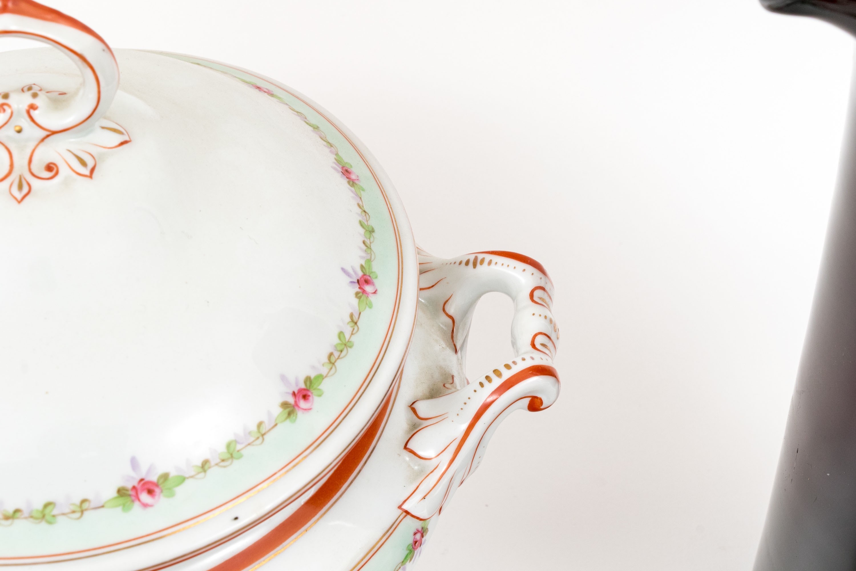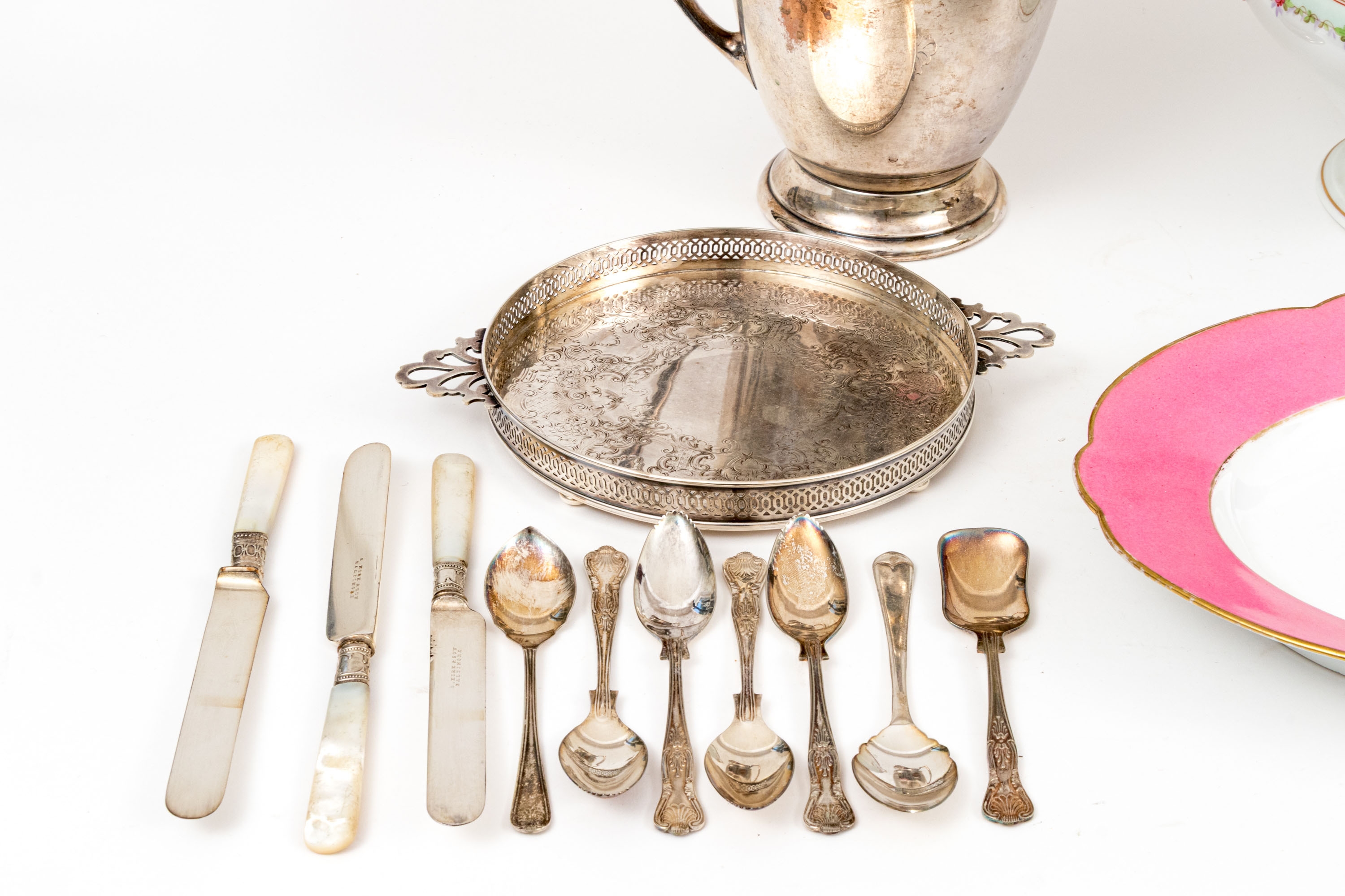 Comprised of: William Rogers "Exeter" water pitcher, a ruby glass water pitcher, an oval porcelain serving platter with pink finished rim and gilt finished trim, twin handled and lidded footed tureen, two silver plated waiter trays, 17 assorted flatware.