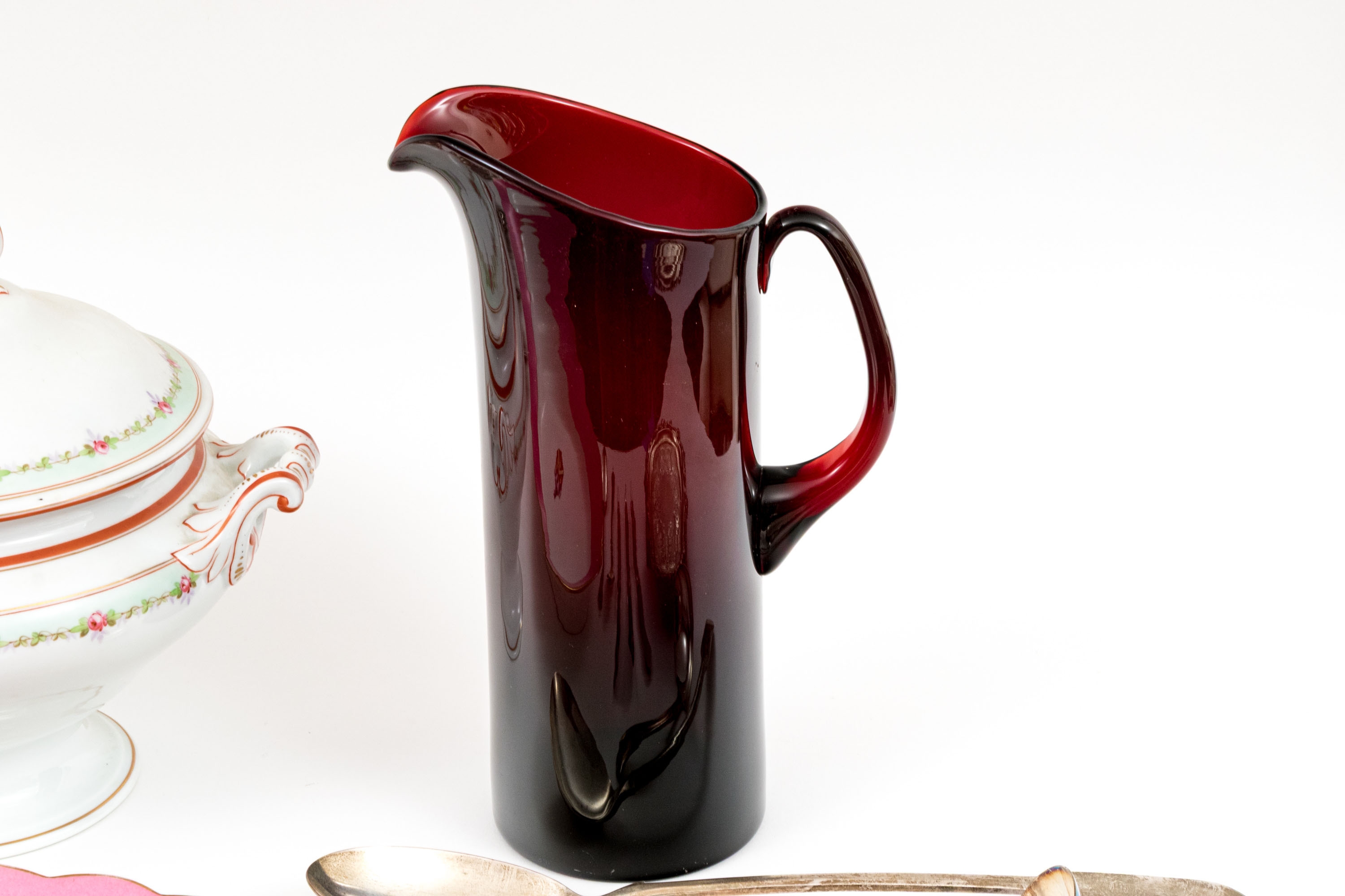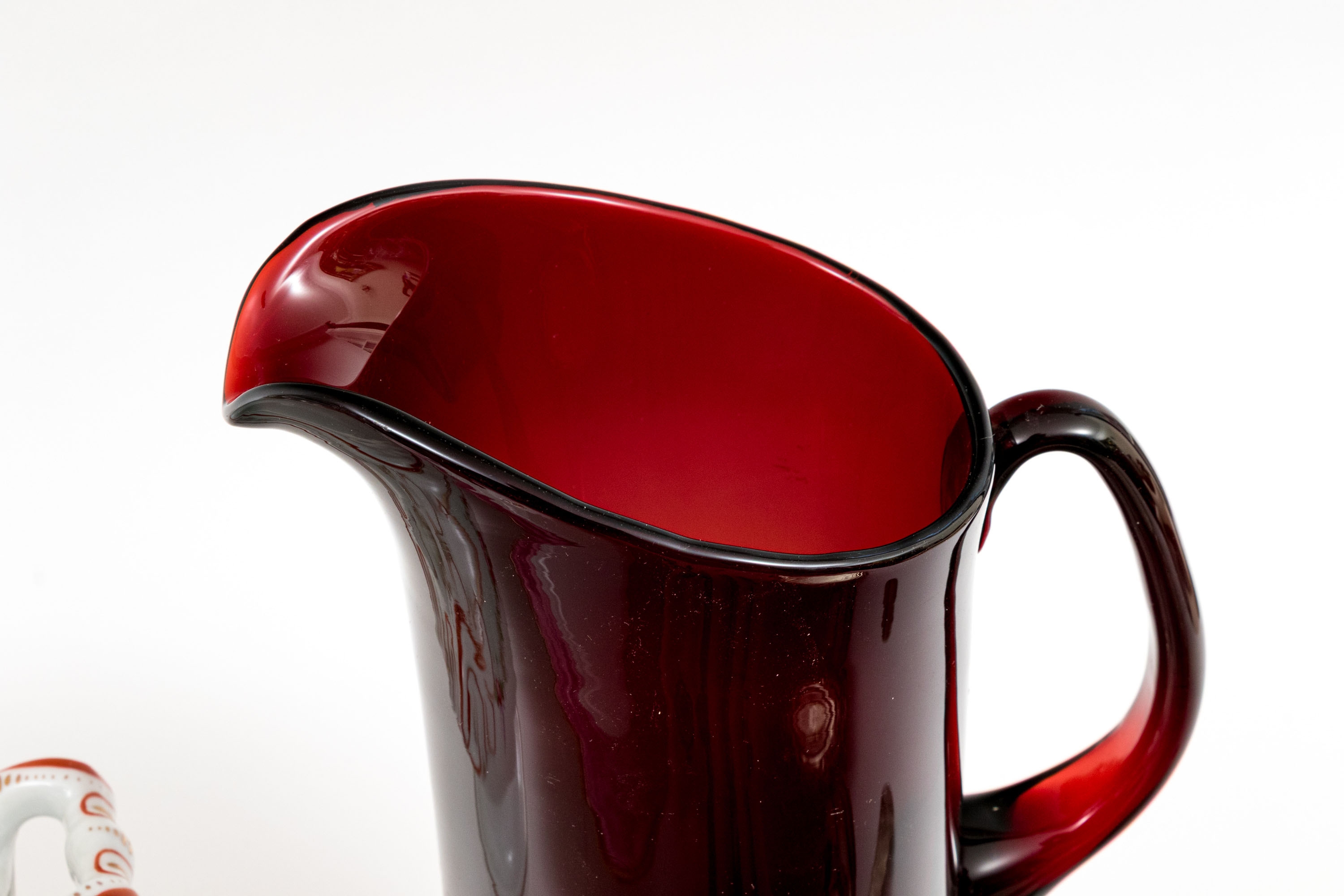 11" H [Ruby glass pitcher] x 15 1/2" L [Serving platter]