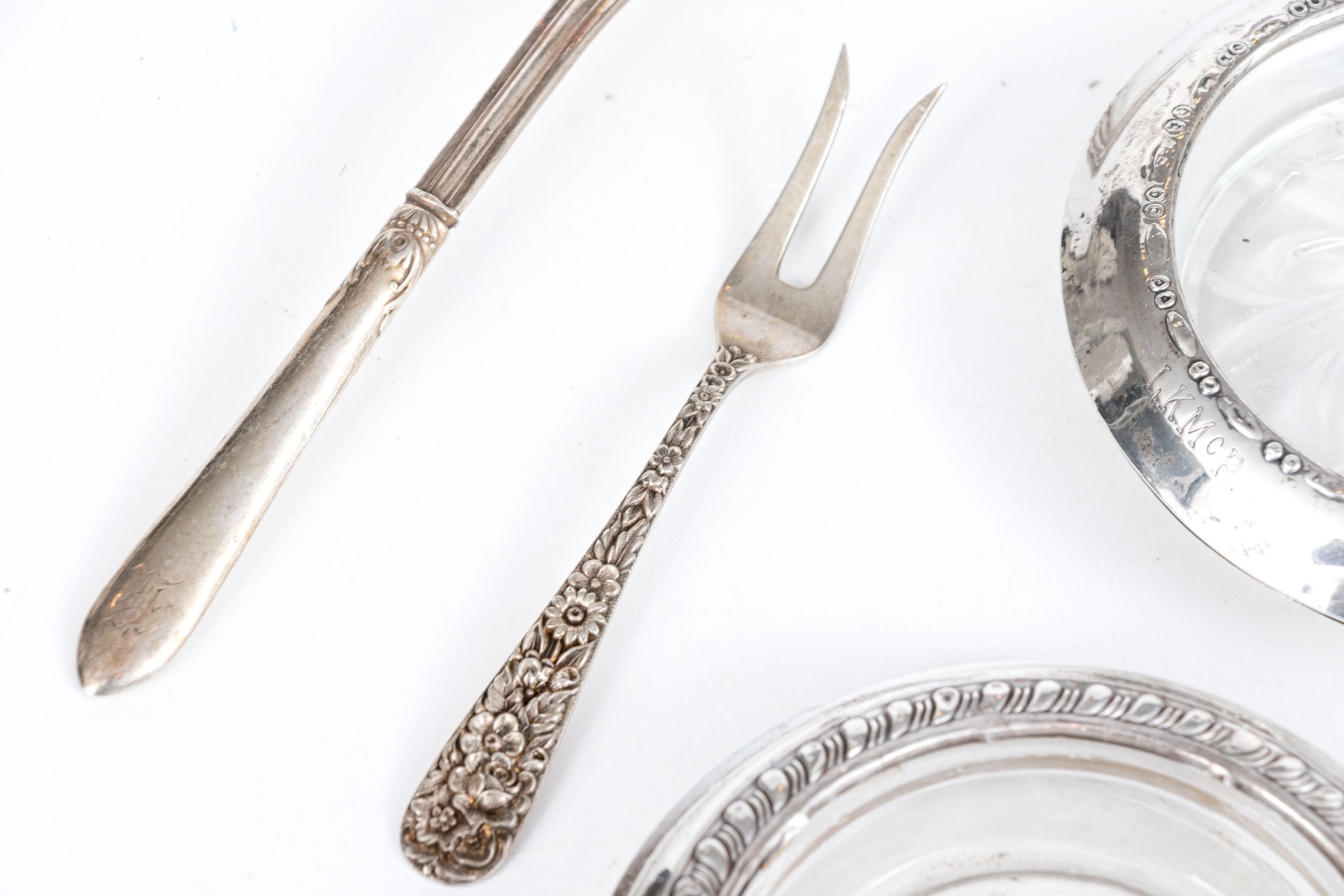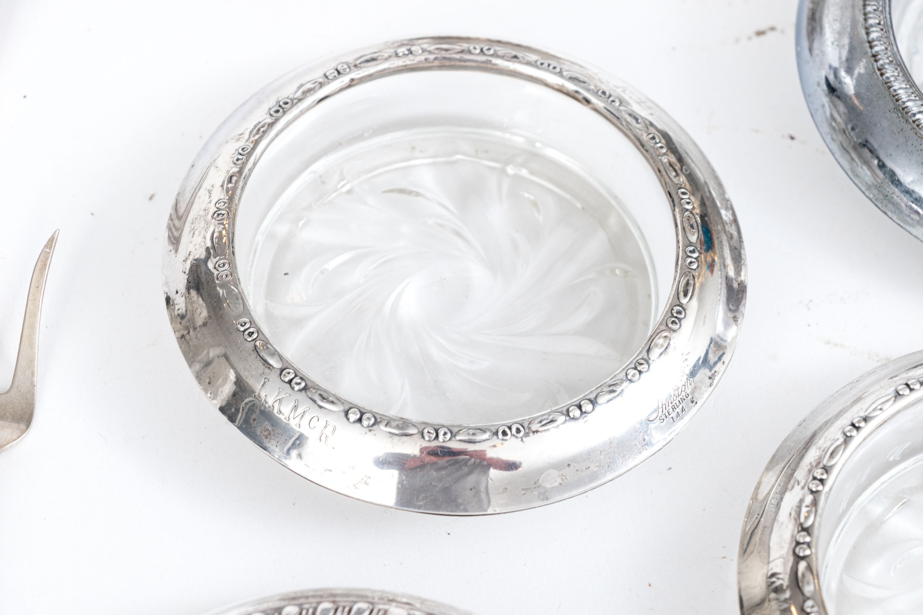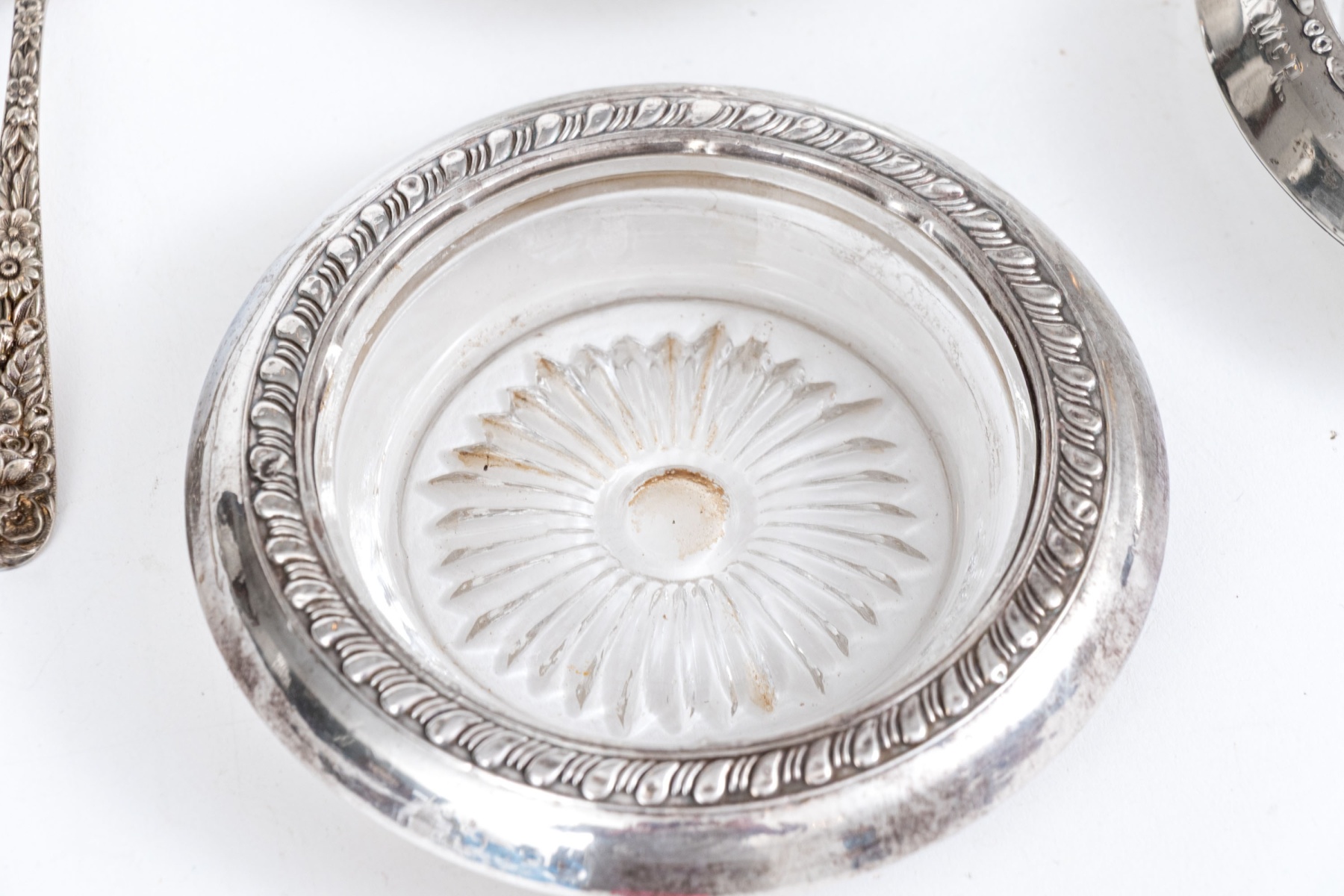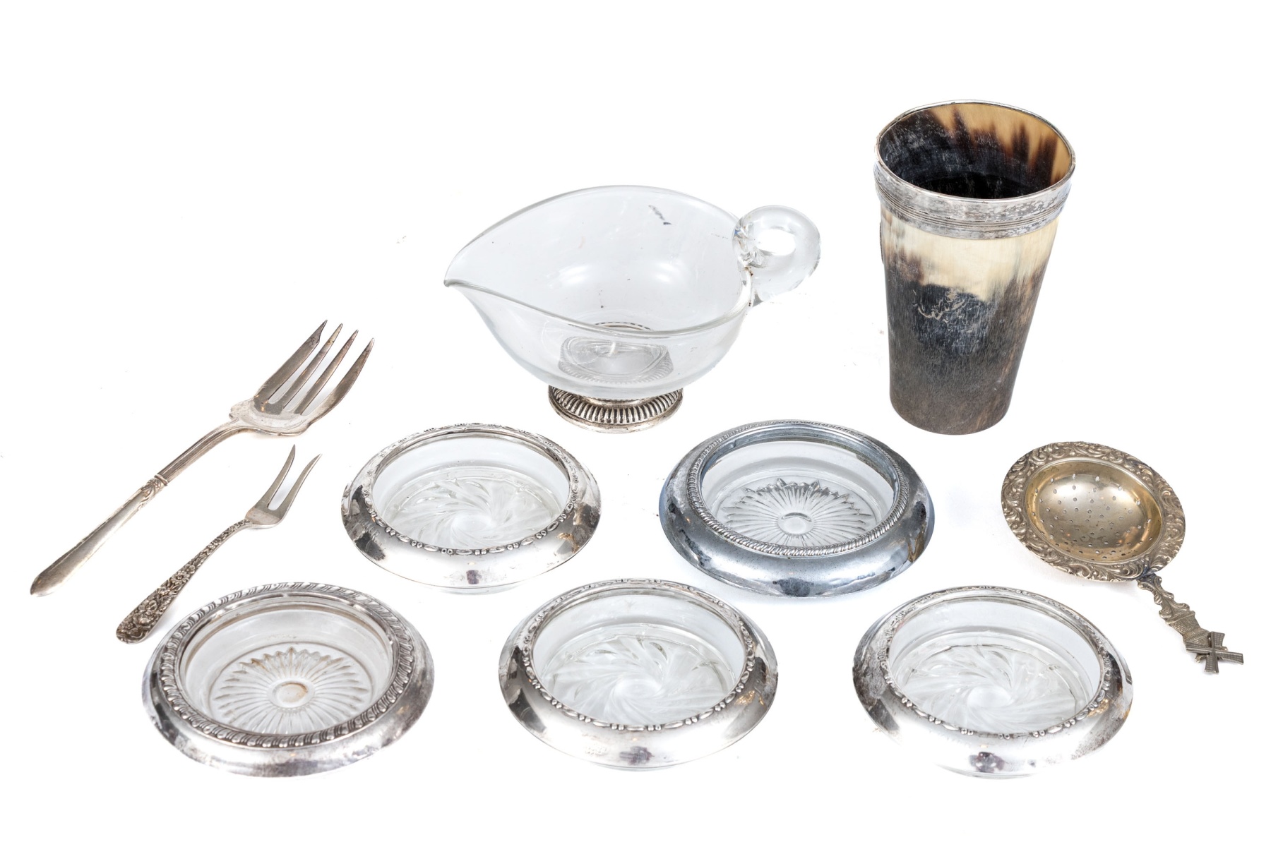 A lovely collection of sterling and sterling mounted table pieces including a horn cup, gravy boat, two forks, a tea strainer, and five coasters.
