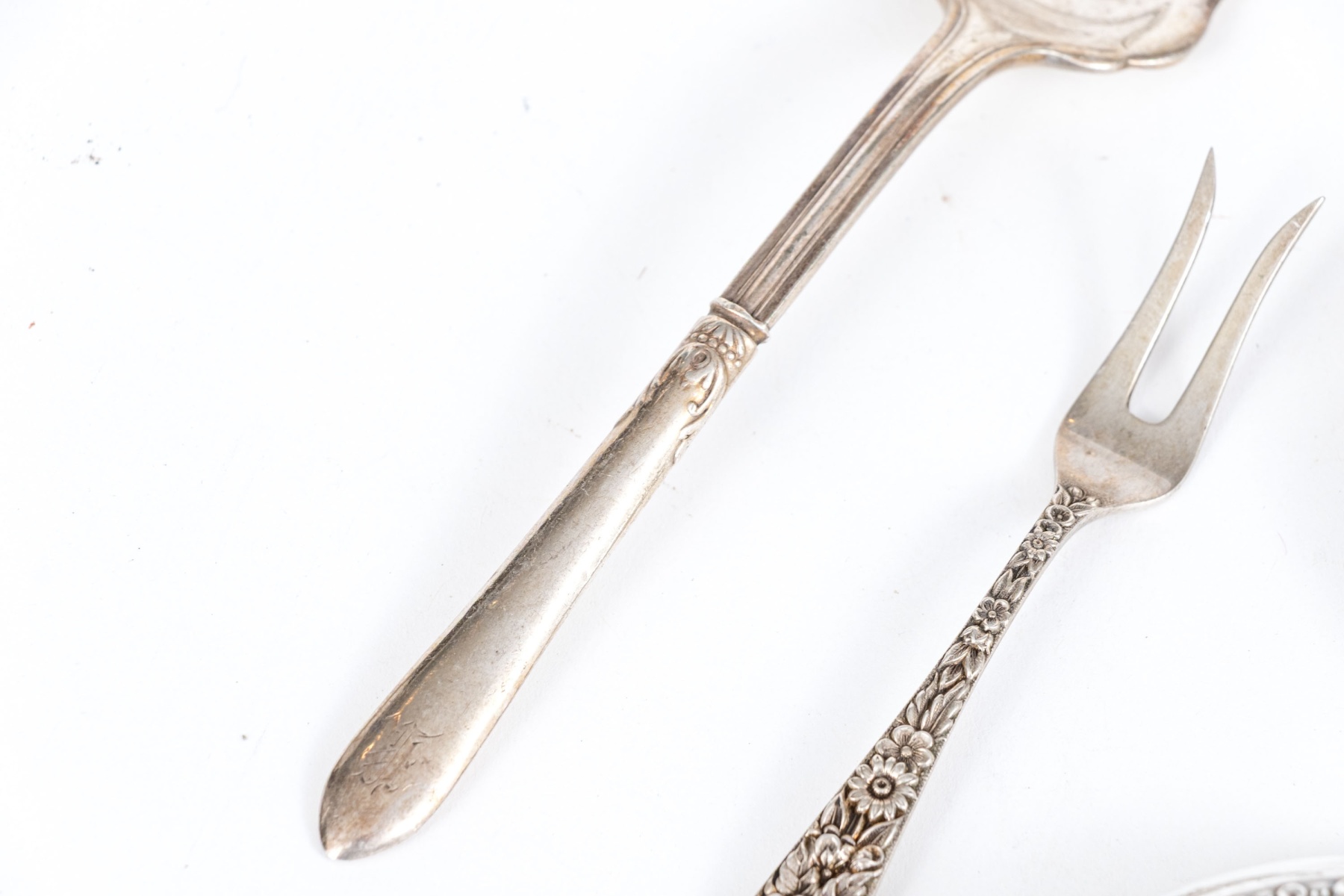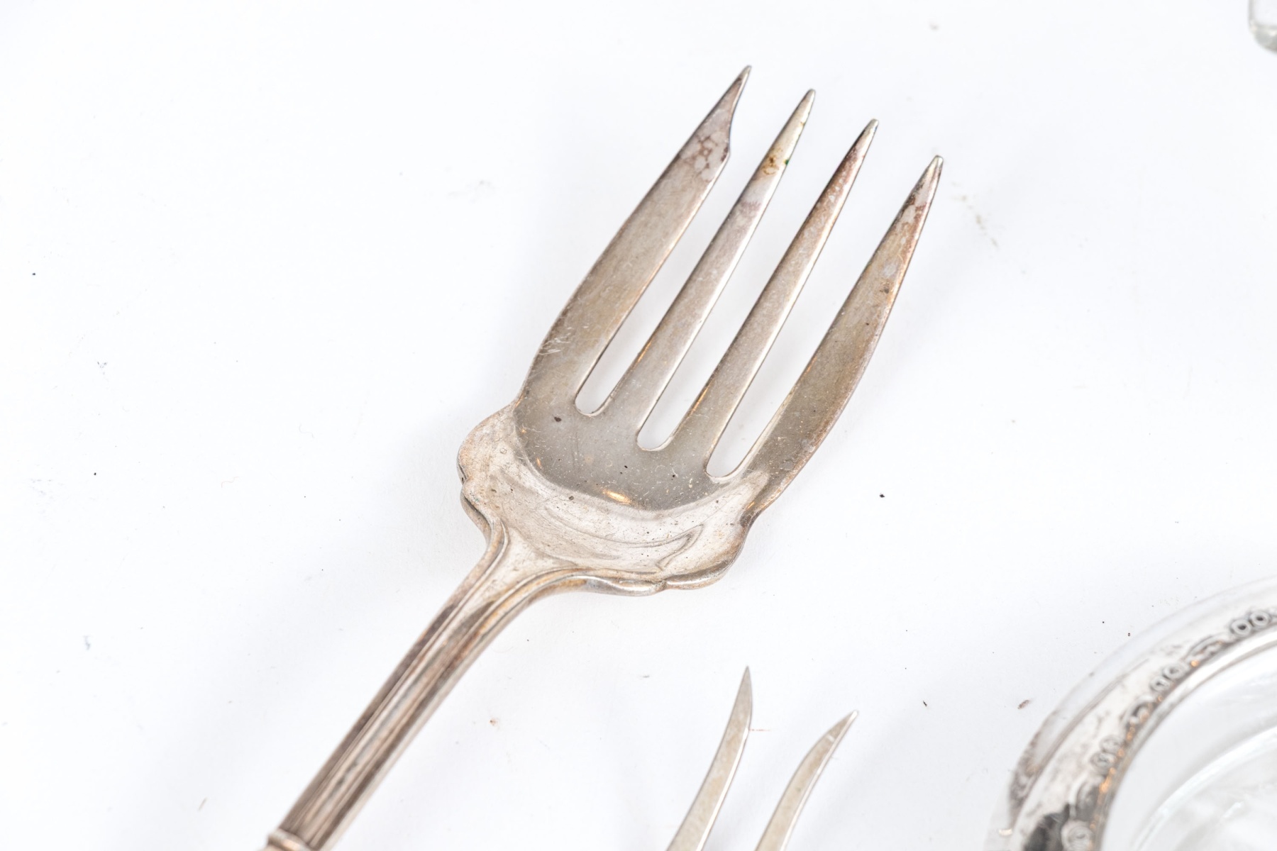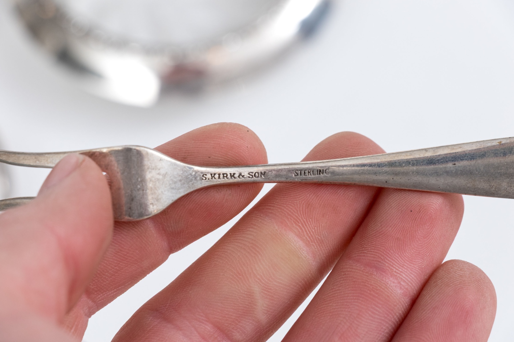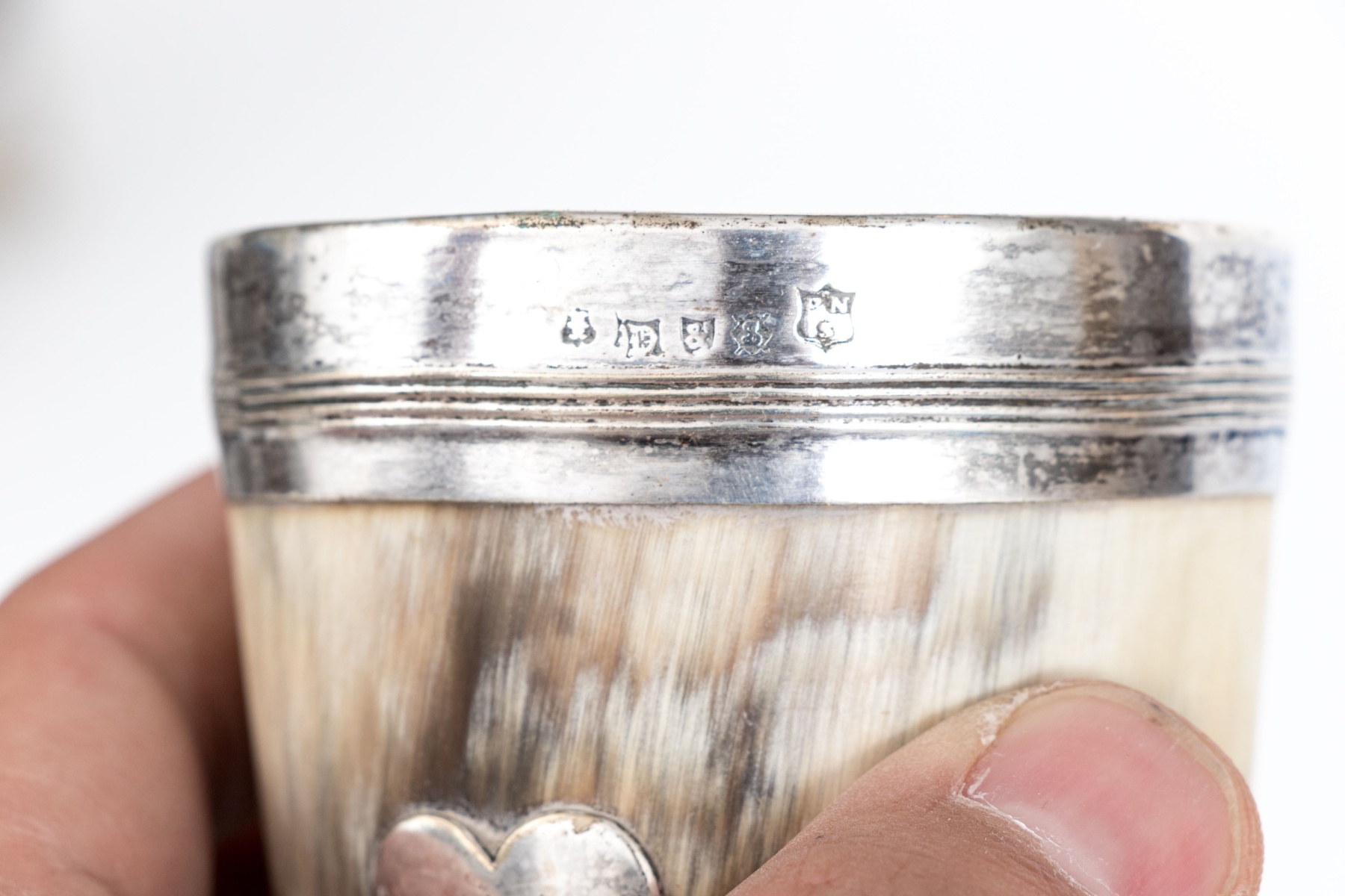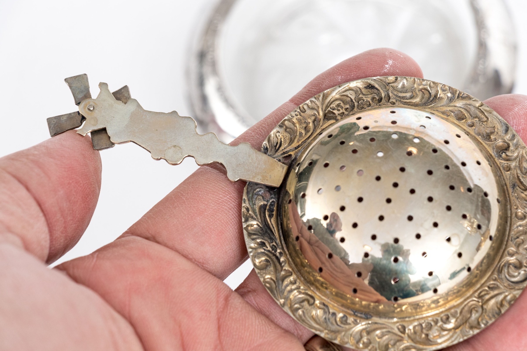 A lovely collection of sterling and sterling mounted table pieces including a horn cup, gravy boat, two forks, a tea strainer, and five coasters.
