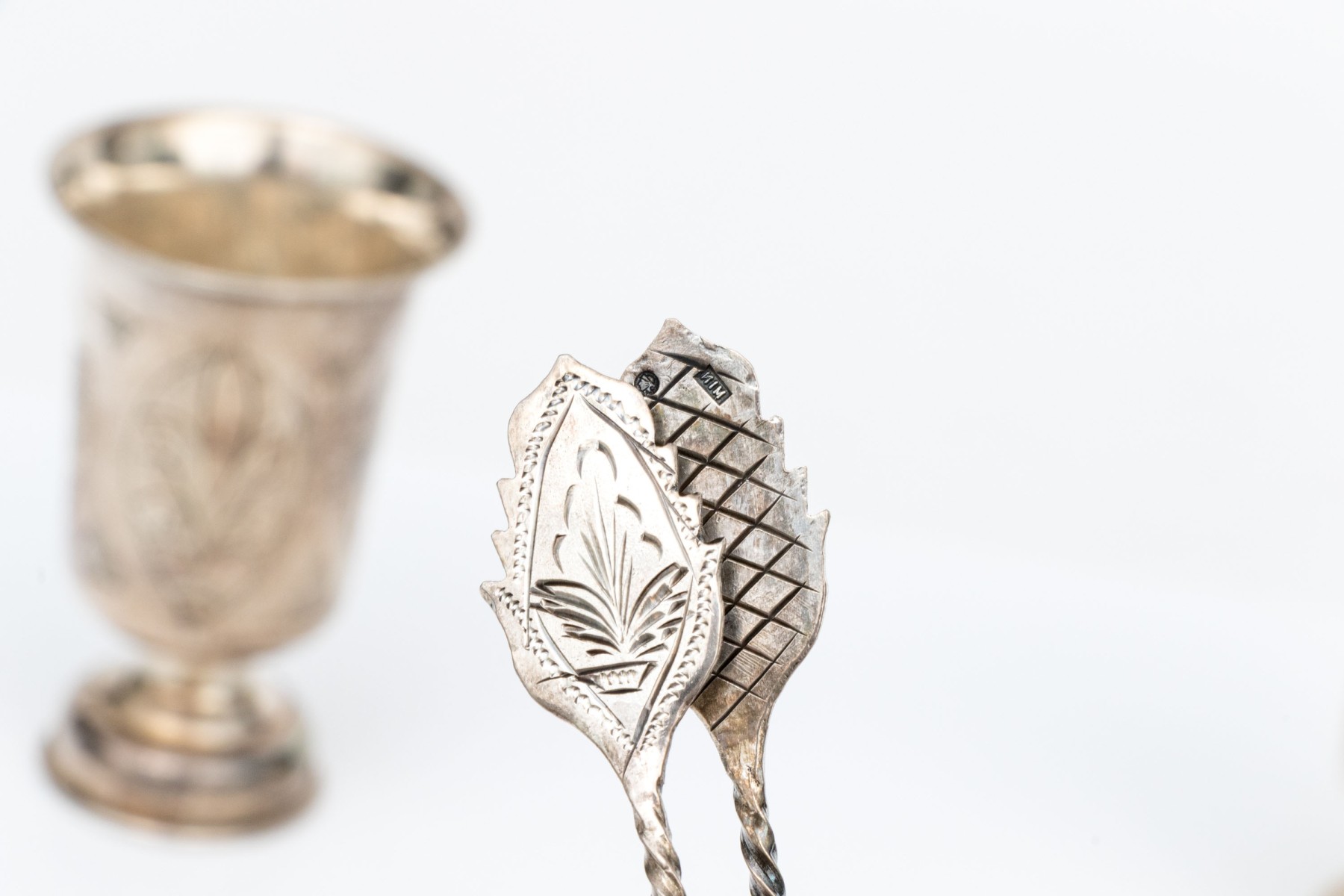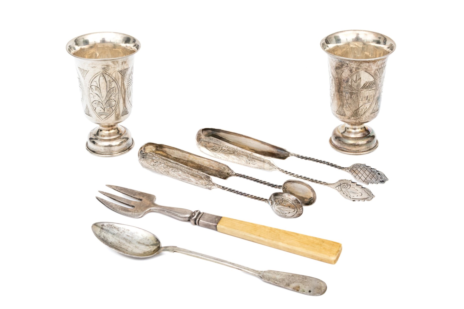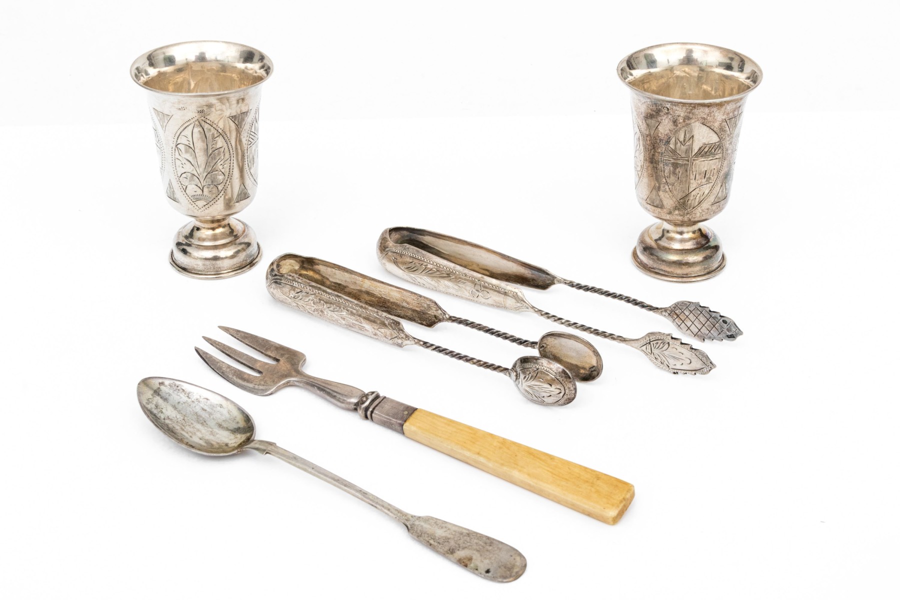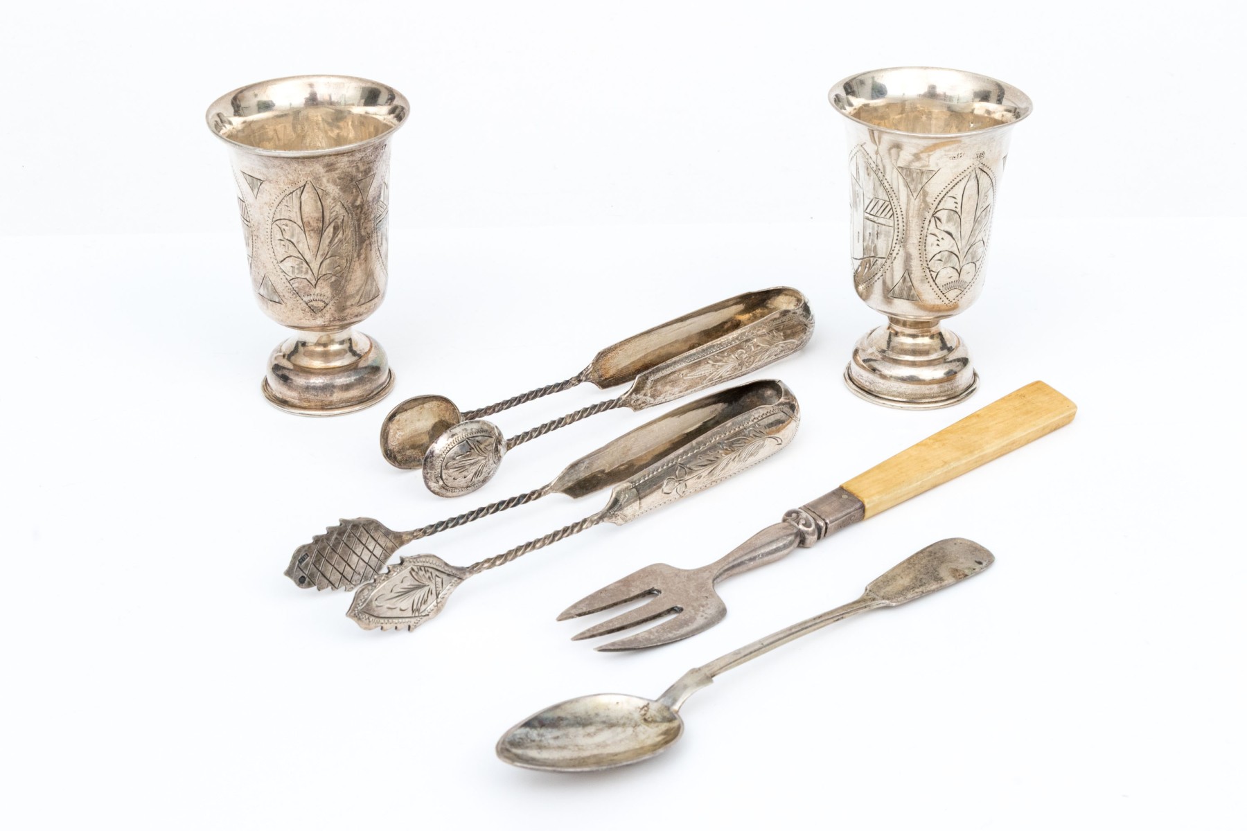 Comprised of two footed cordial cups, a spoon, two pairs of tongs and a bone handled fork.