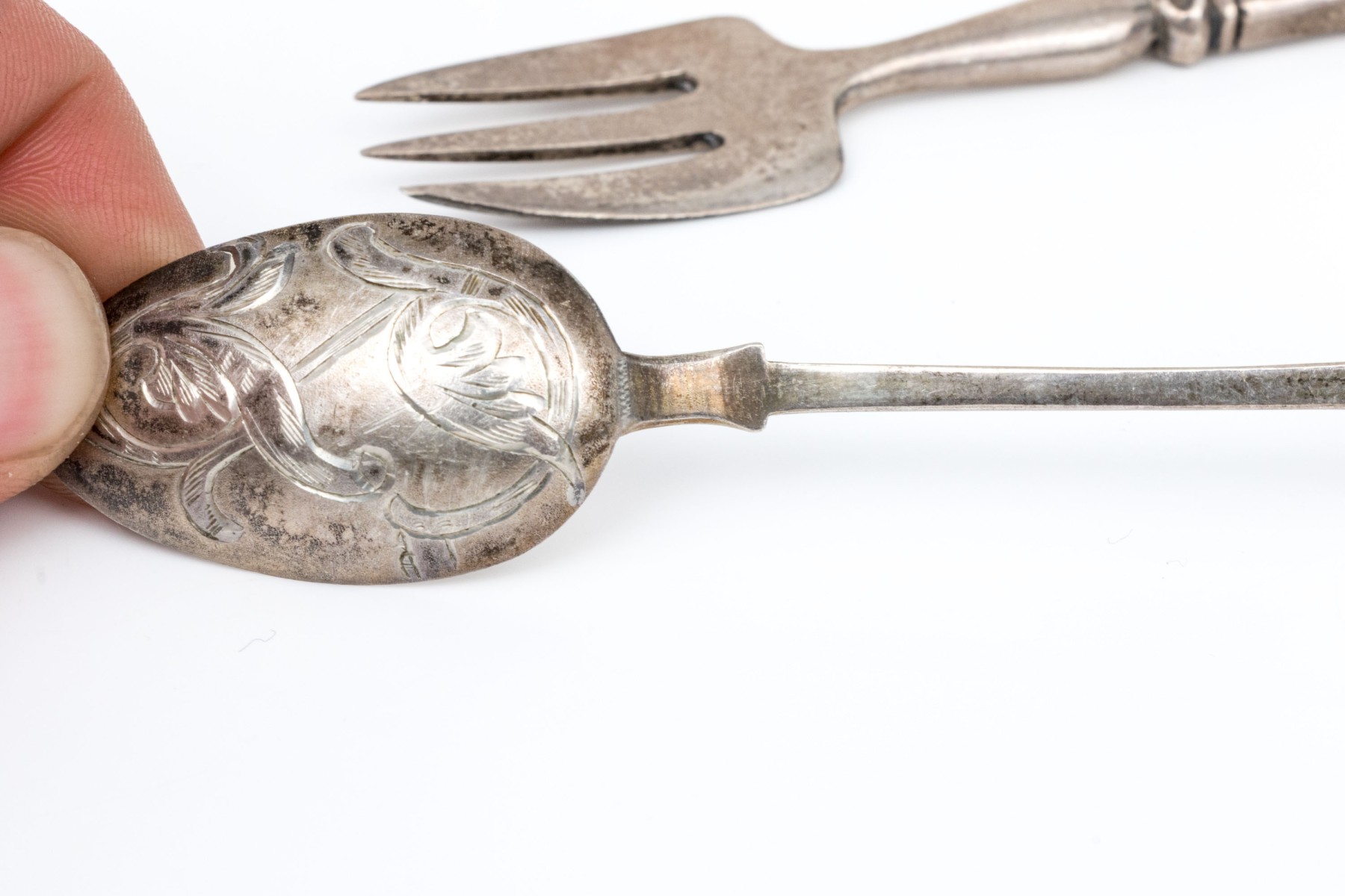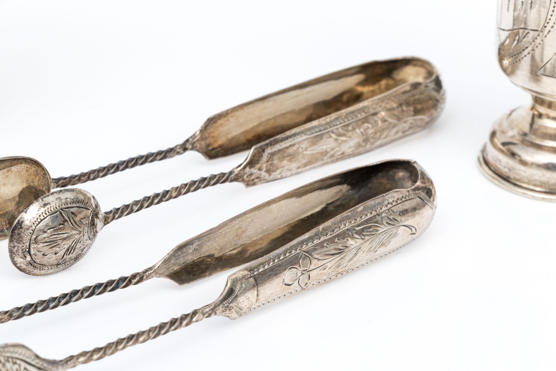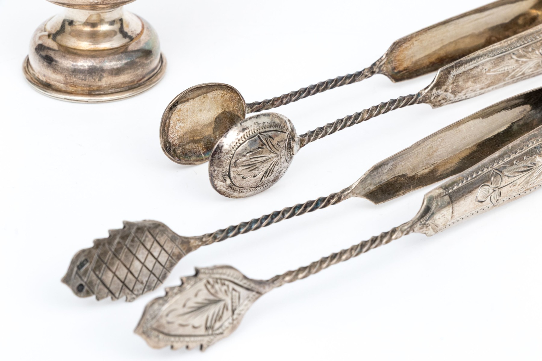 Comprised of two footed cordial cups, a spoon, two pairs of tongs and a bone handled fork.