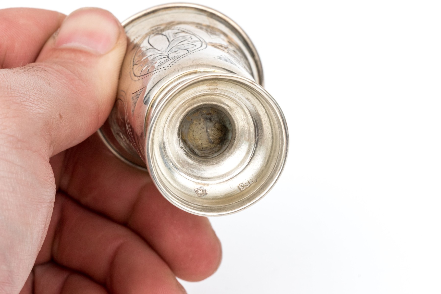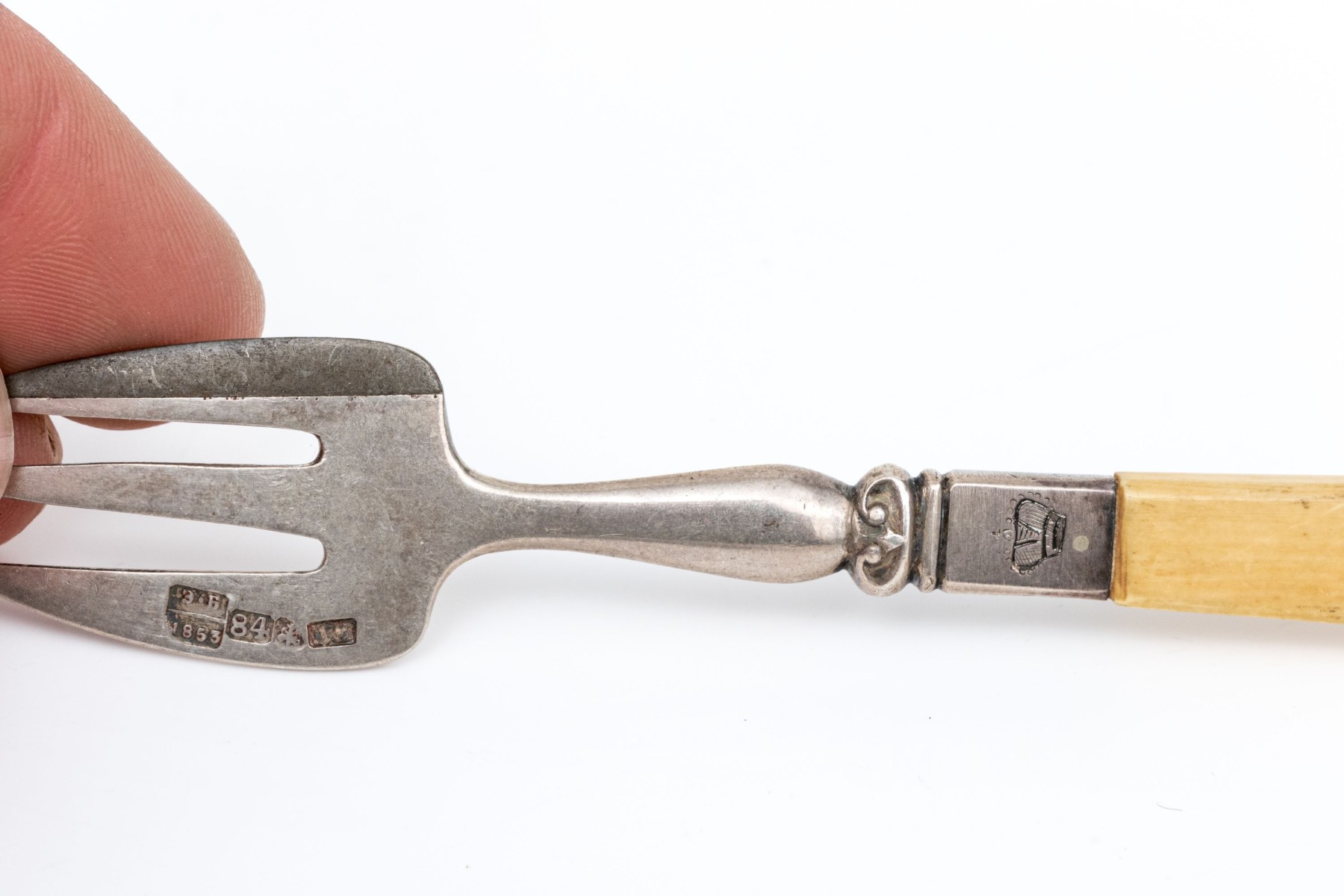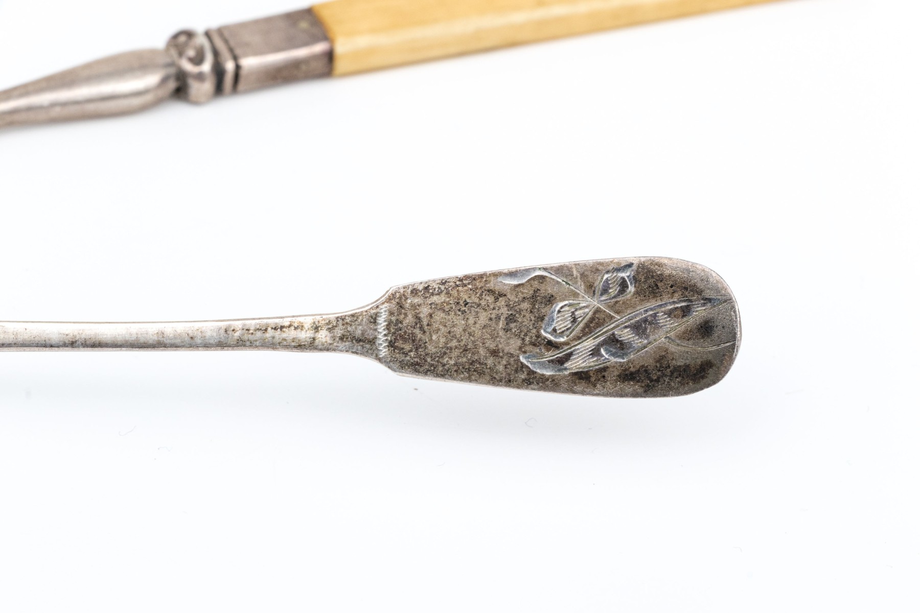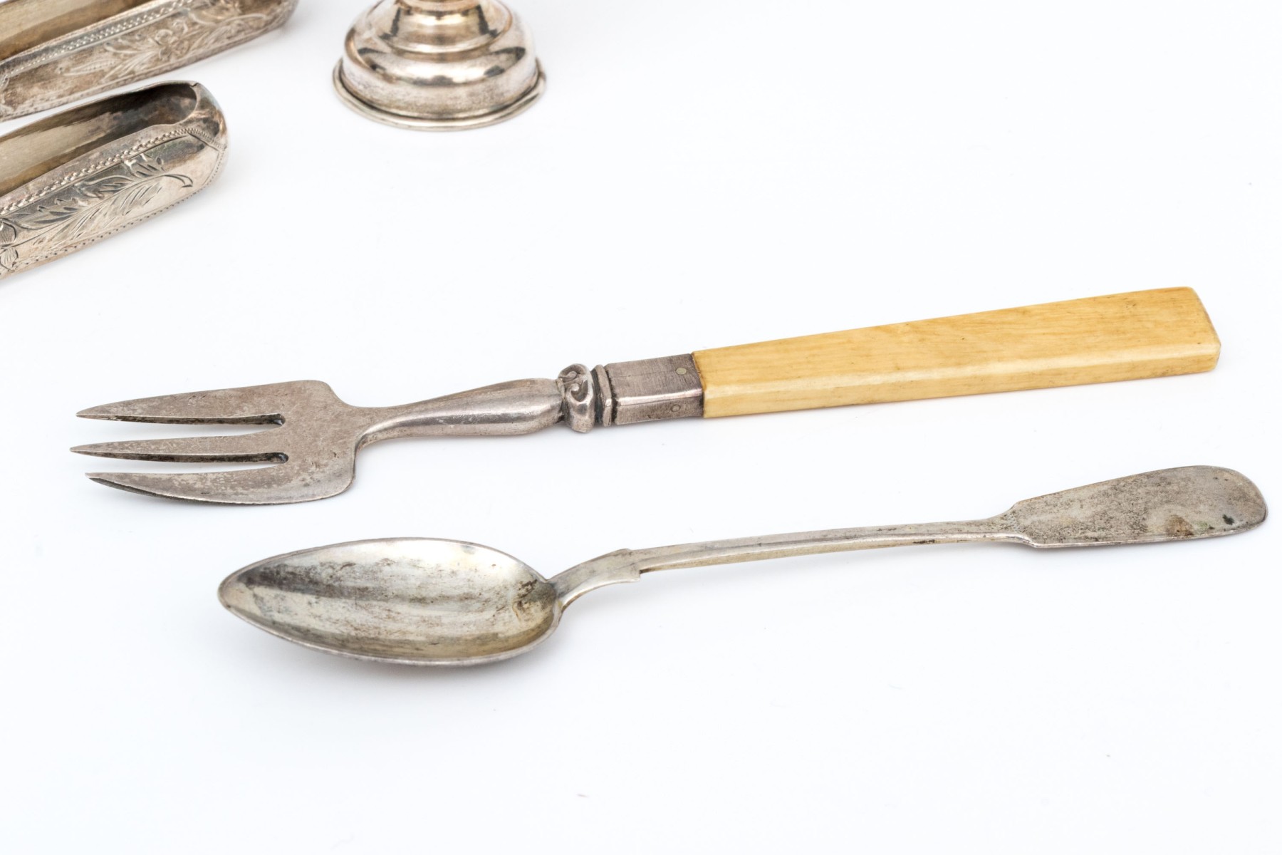 Comprised of two footed cordial cups, a spoon, two pairs of tongs and a bone handled fork.