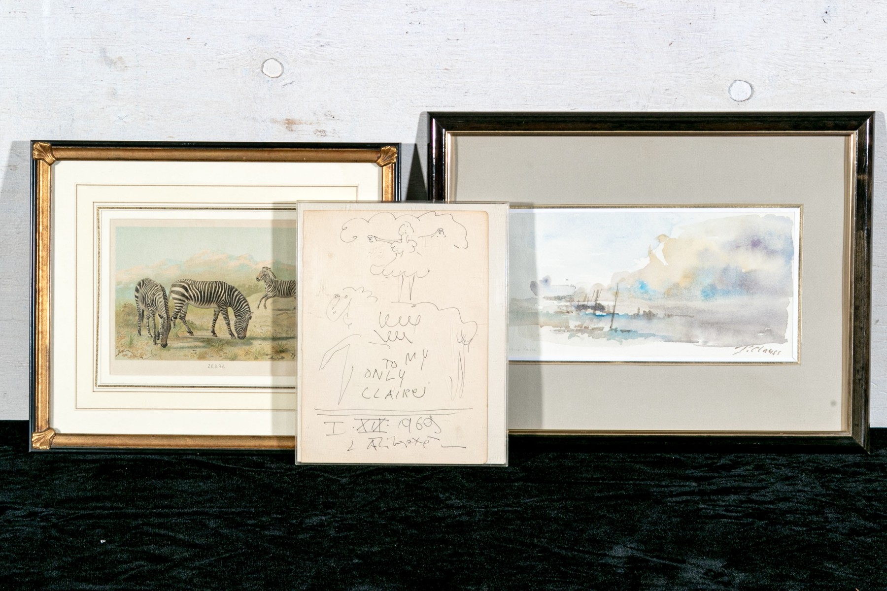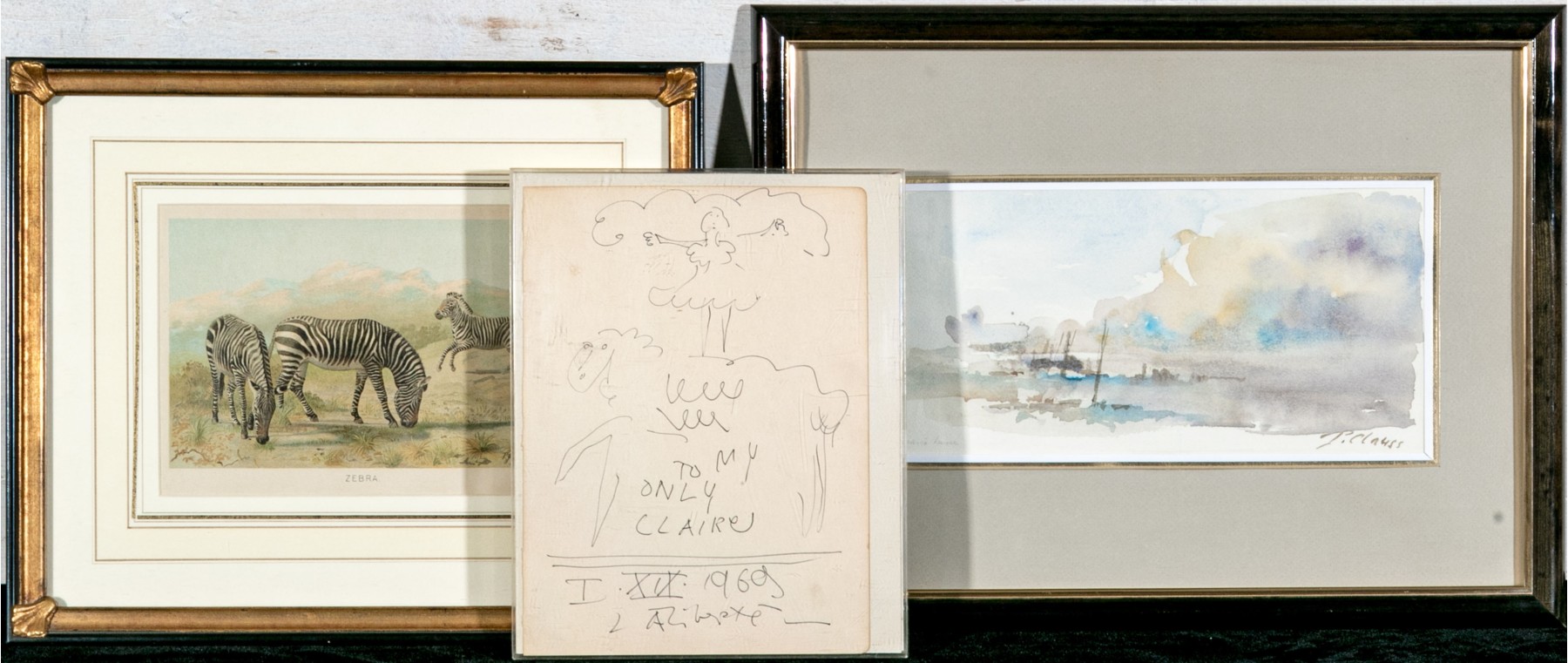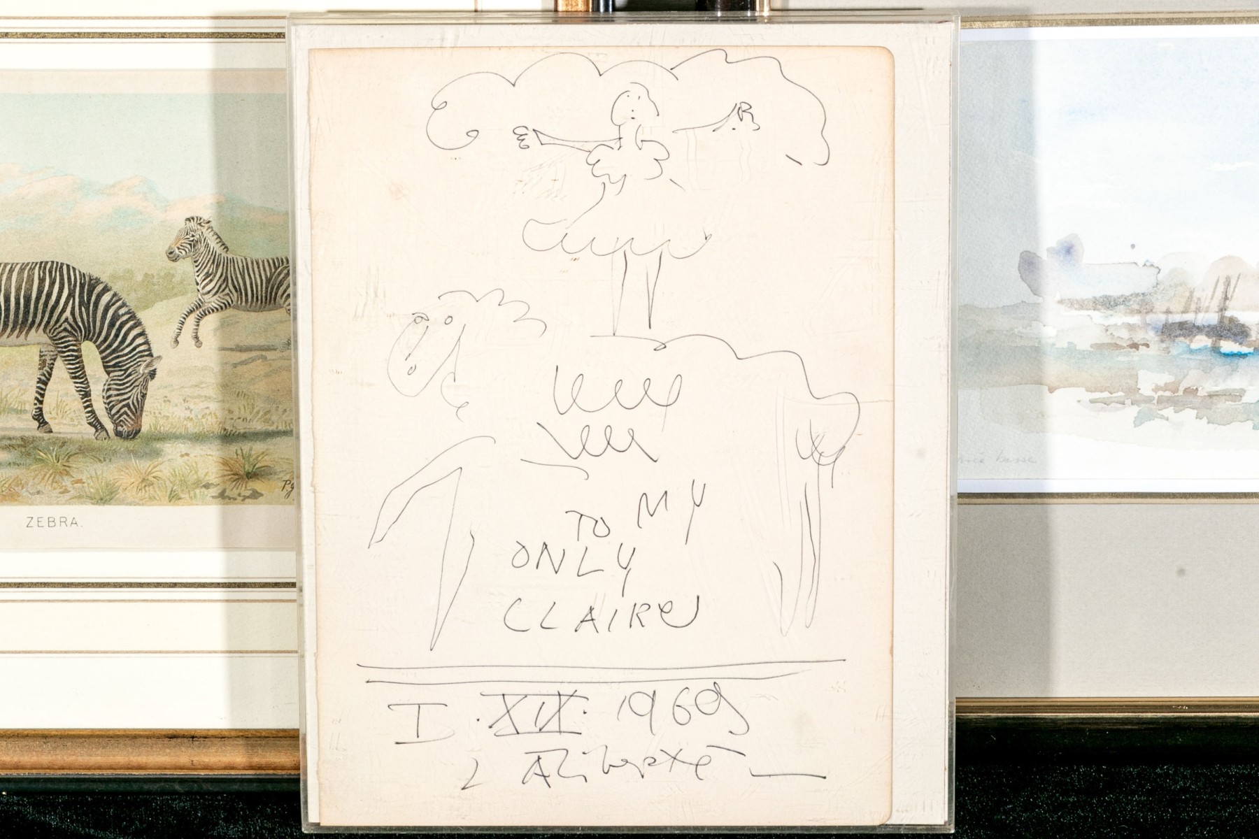 And a signed pencil drawing depicting a woman standing on an animal, displayed in a plexiglass shadowbox frame.