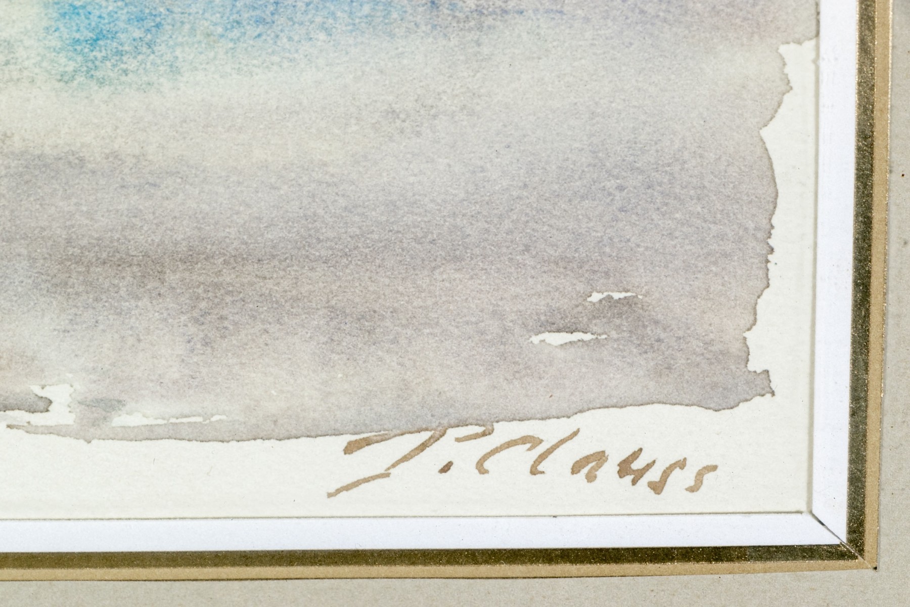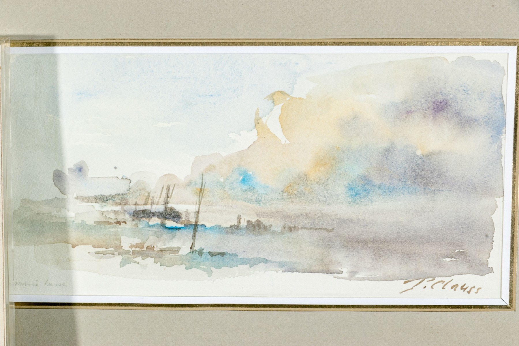 An impressionist watercolor painting of a calm seascape, signed P. or J. Clauss.