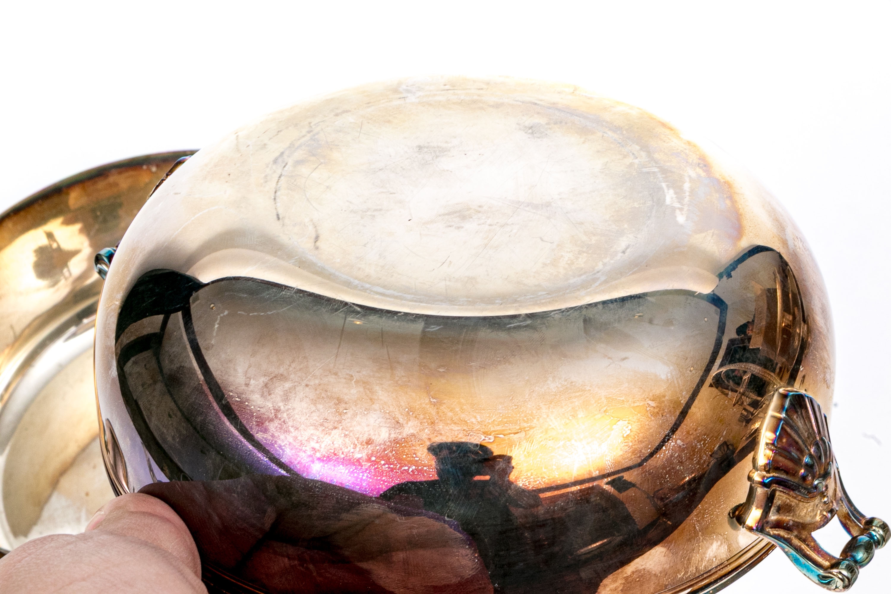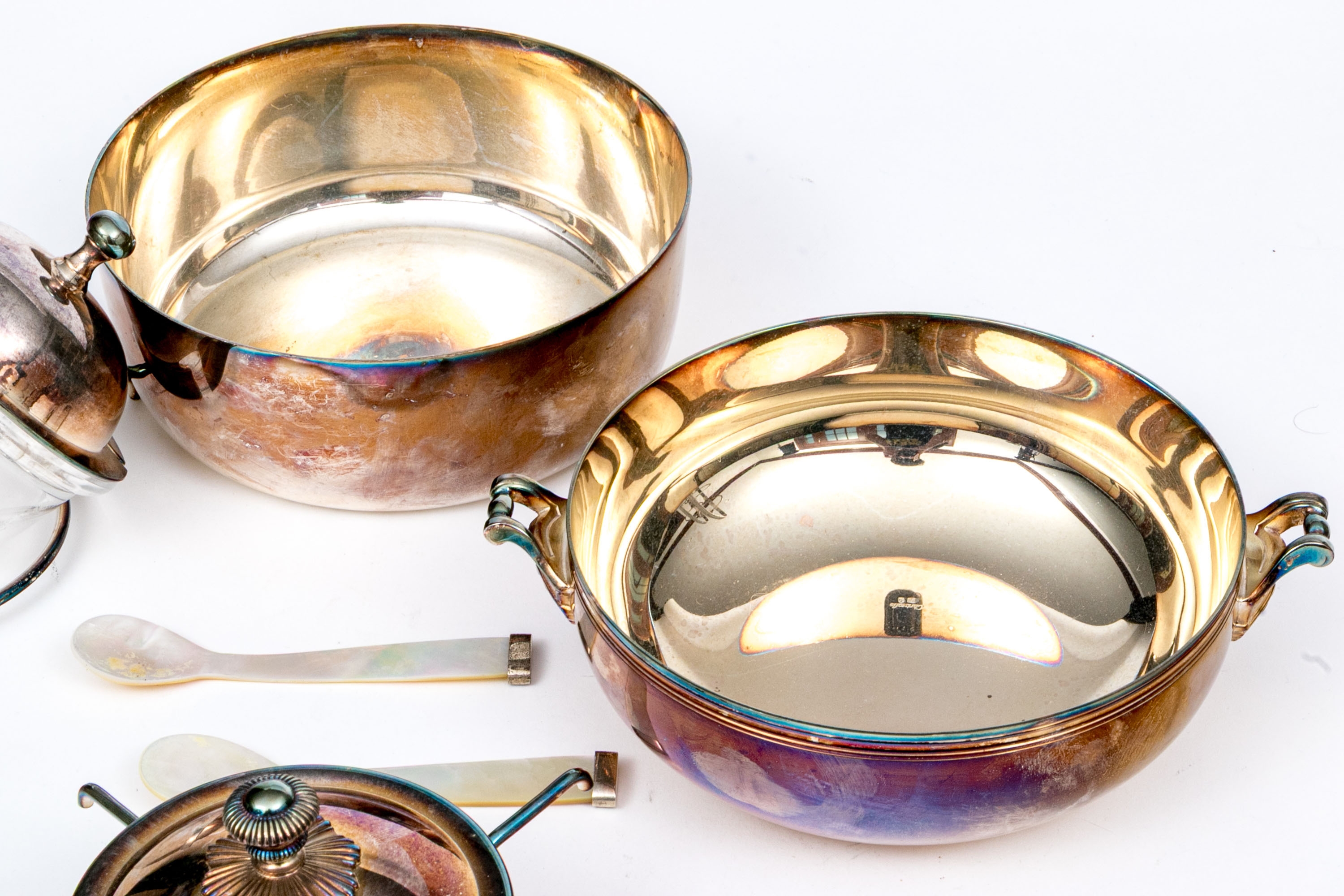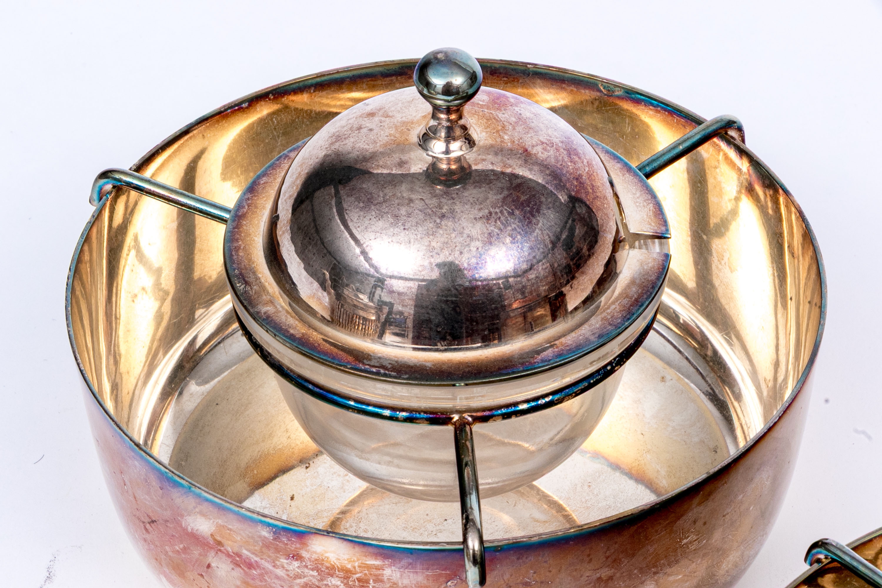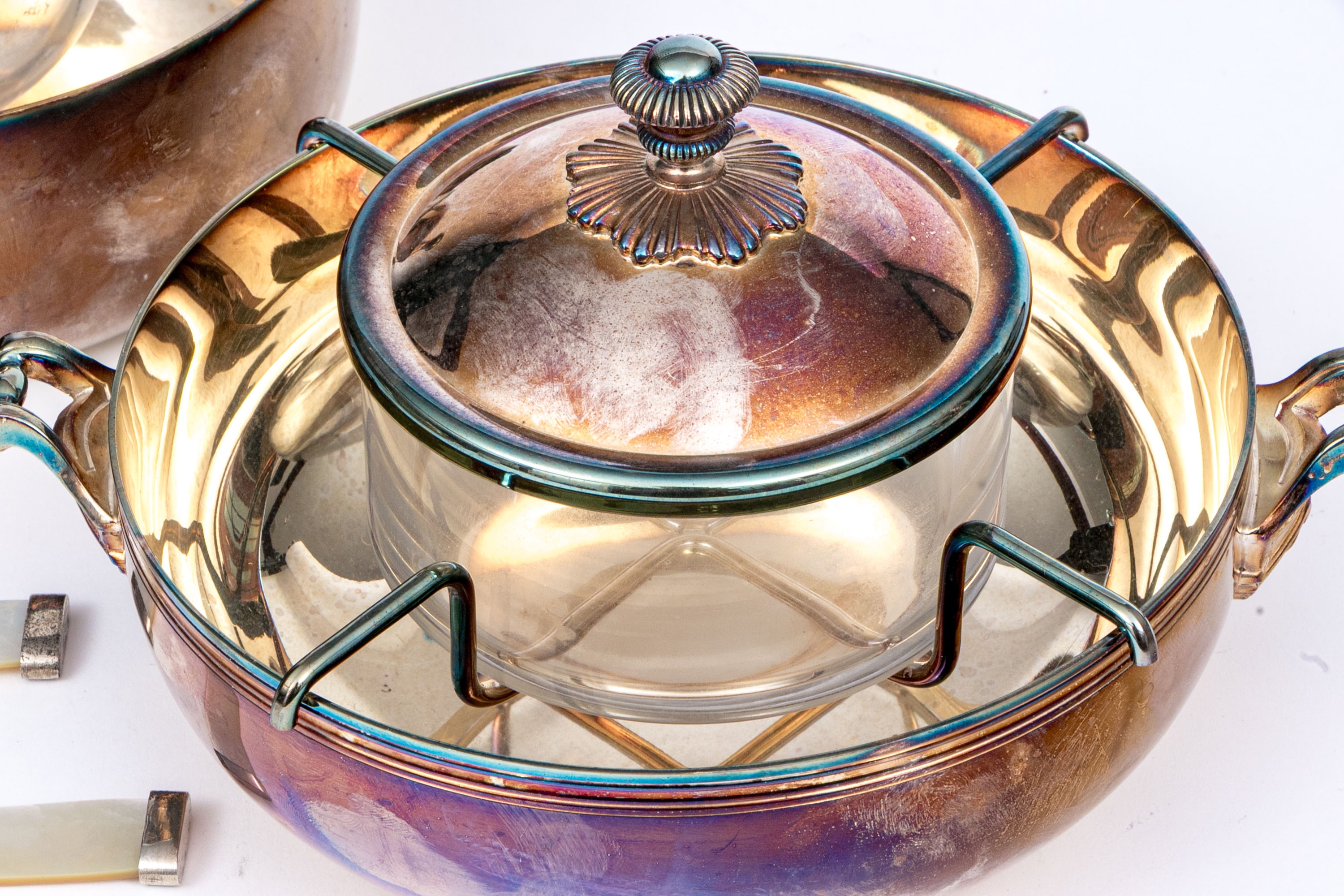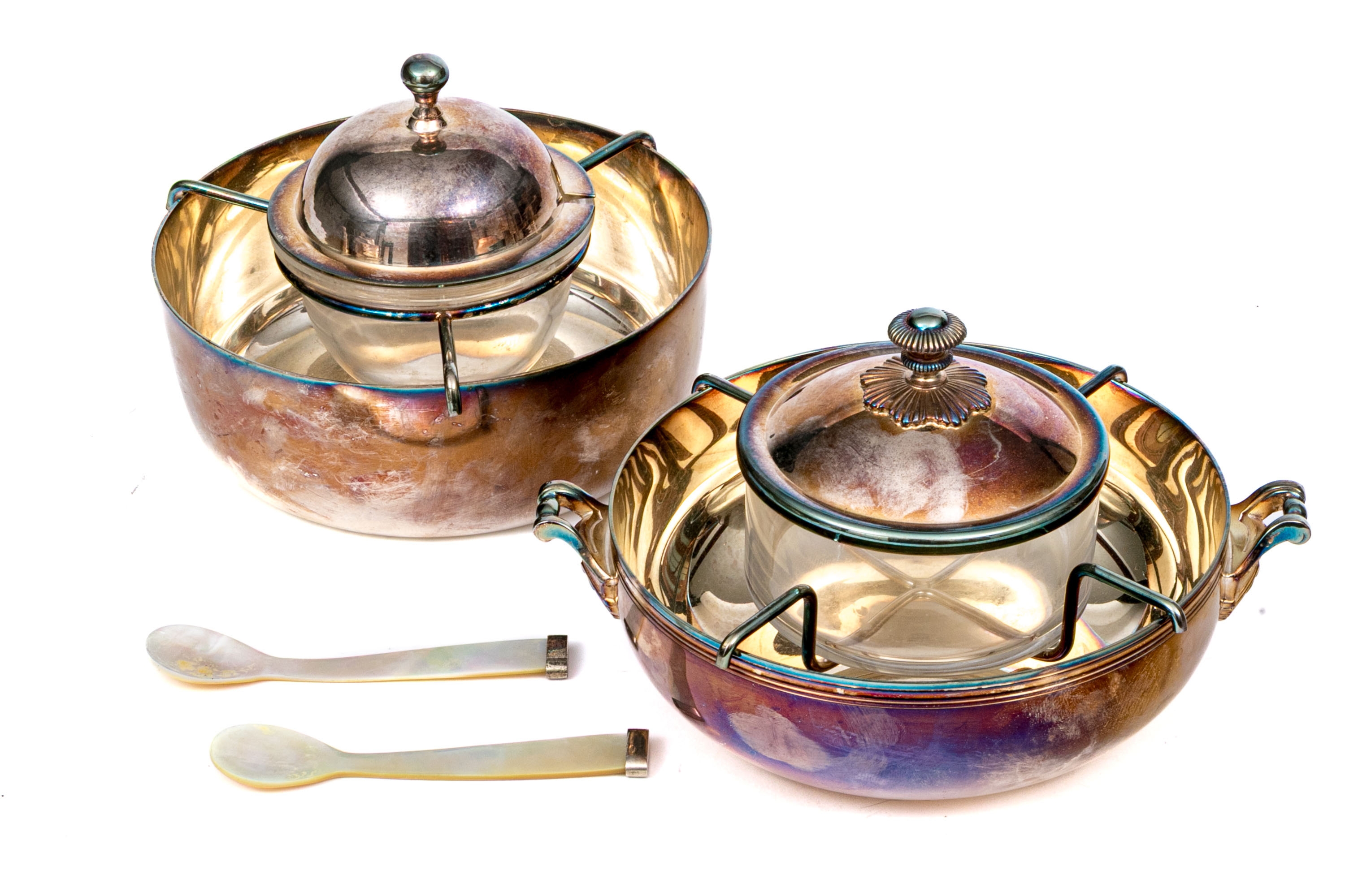 One with its outer silver-plated bowl having two handles with wire support for the glass bowl with silver plated lid with knob form finial.