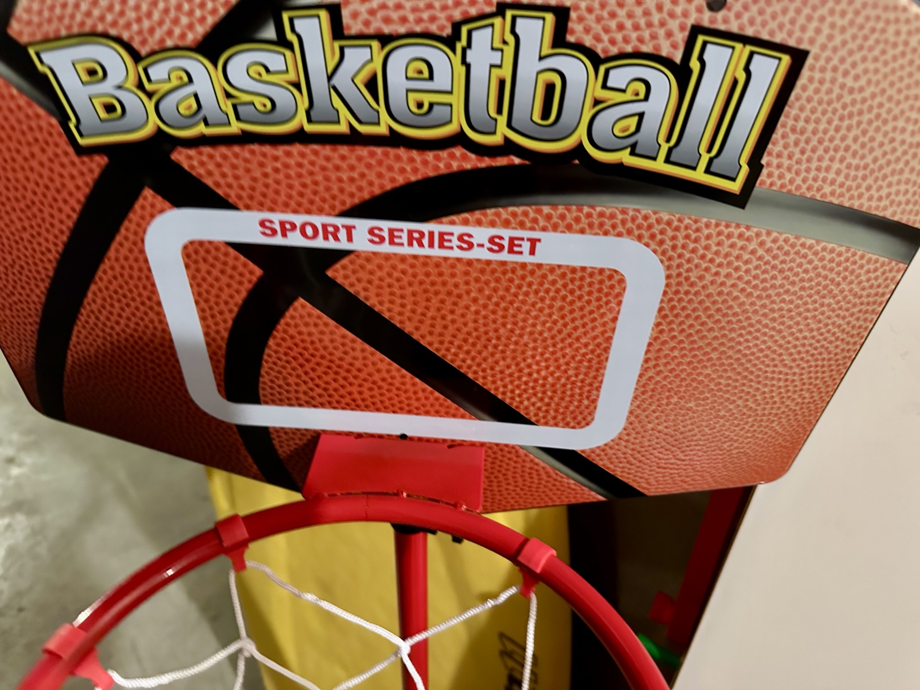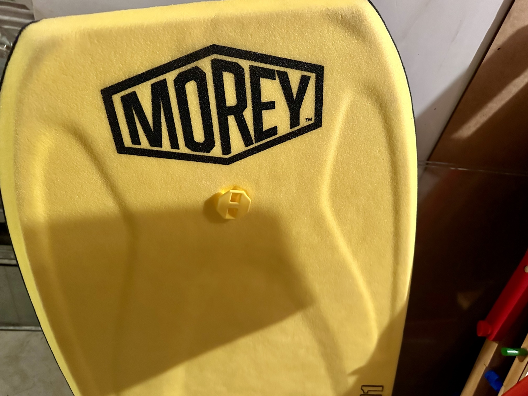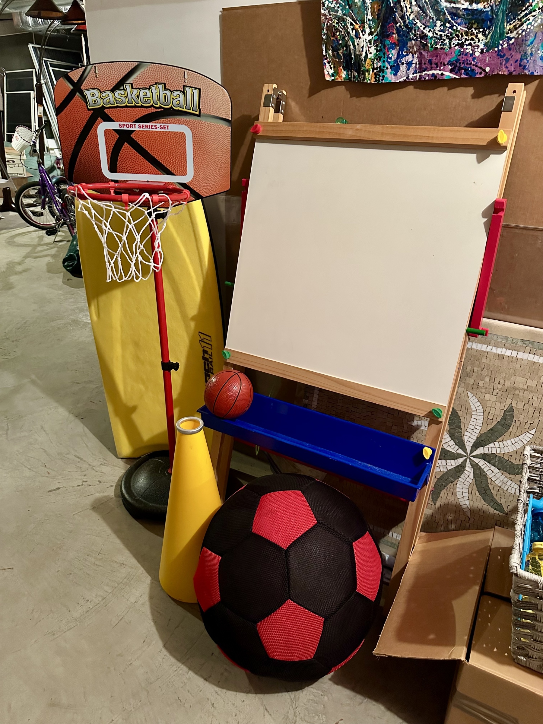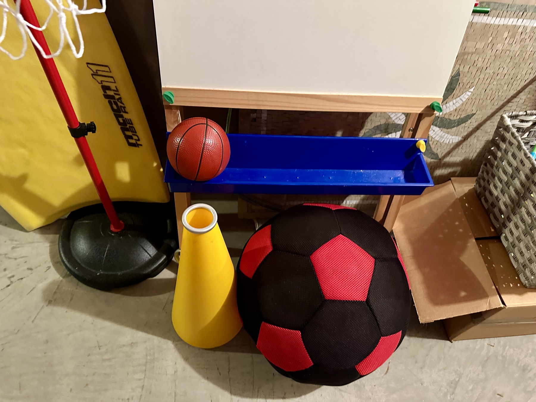 A wonderful assortment of children's toys including a basketball hoop with small basketball, a black and red football, easel whiteboard, yellow megaphone, and a Morey Mach 11 Tube Rail bodyboard.