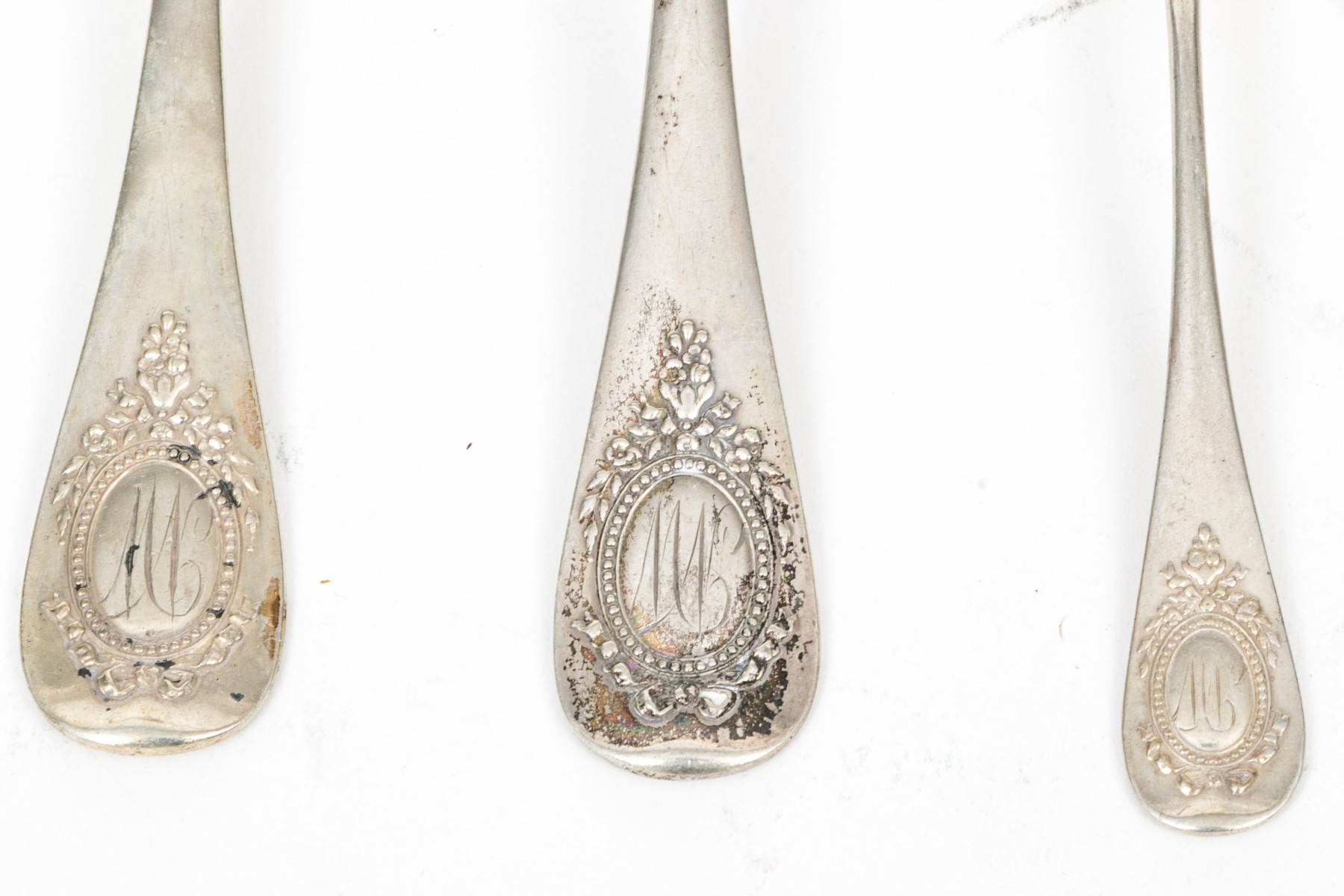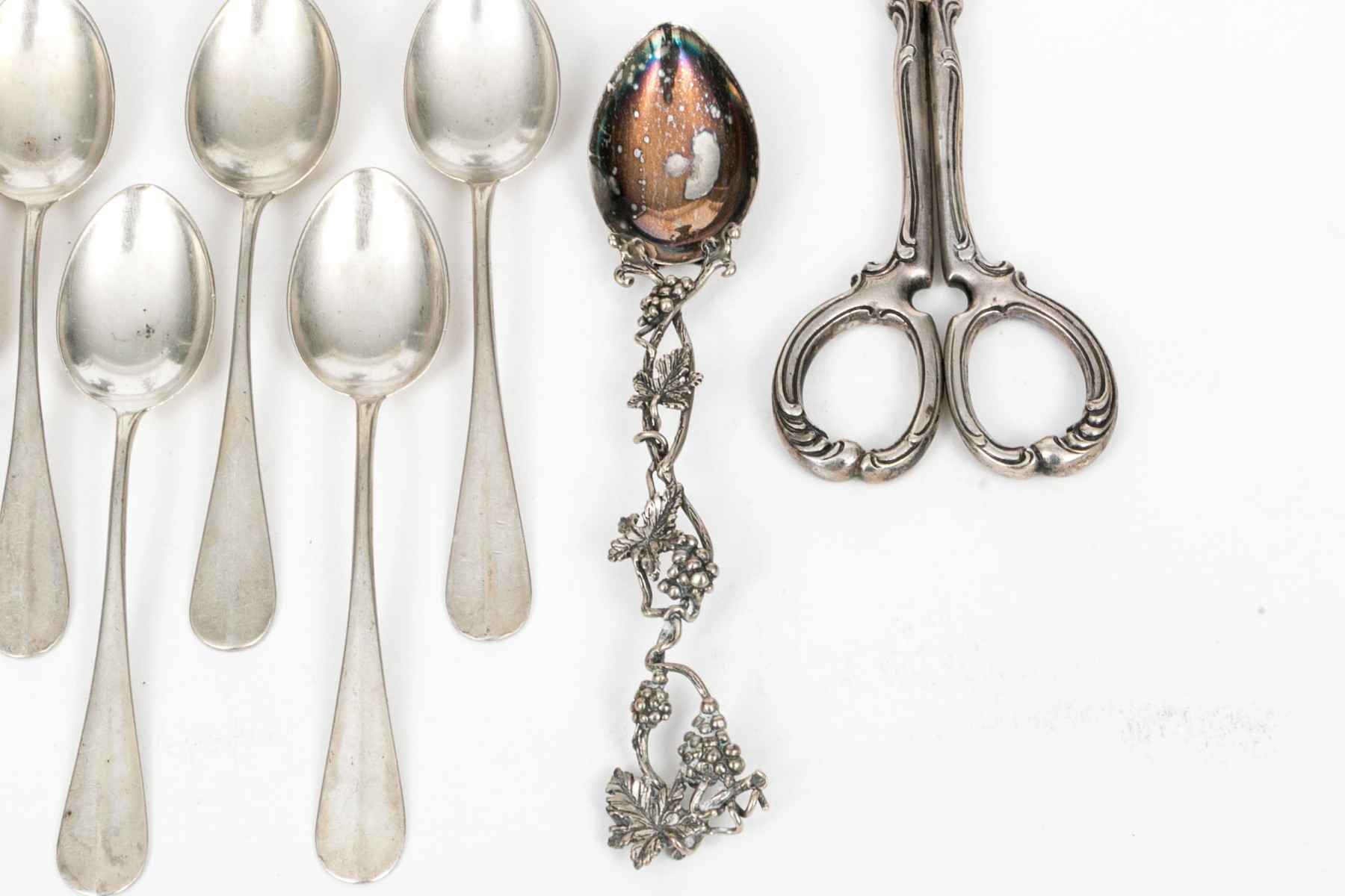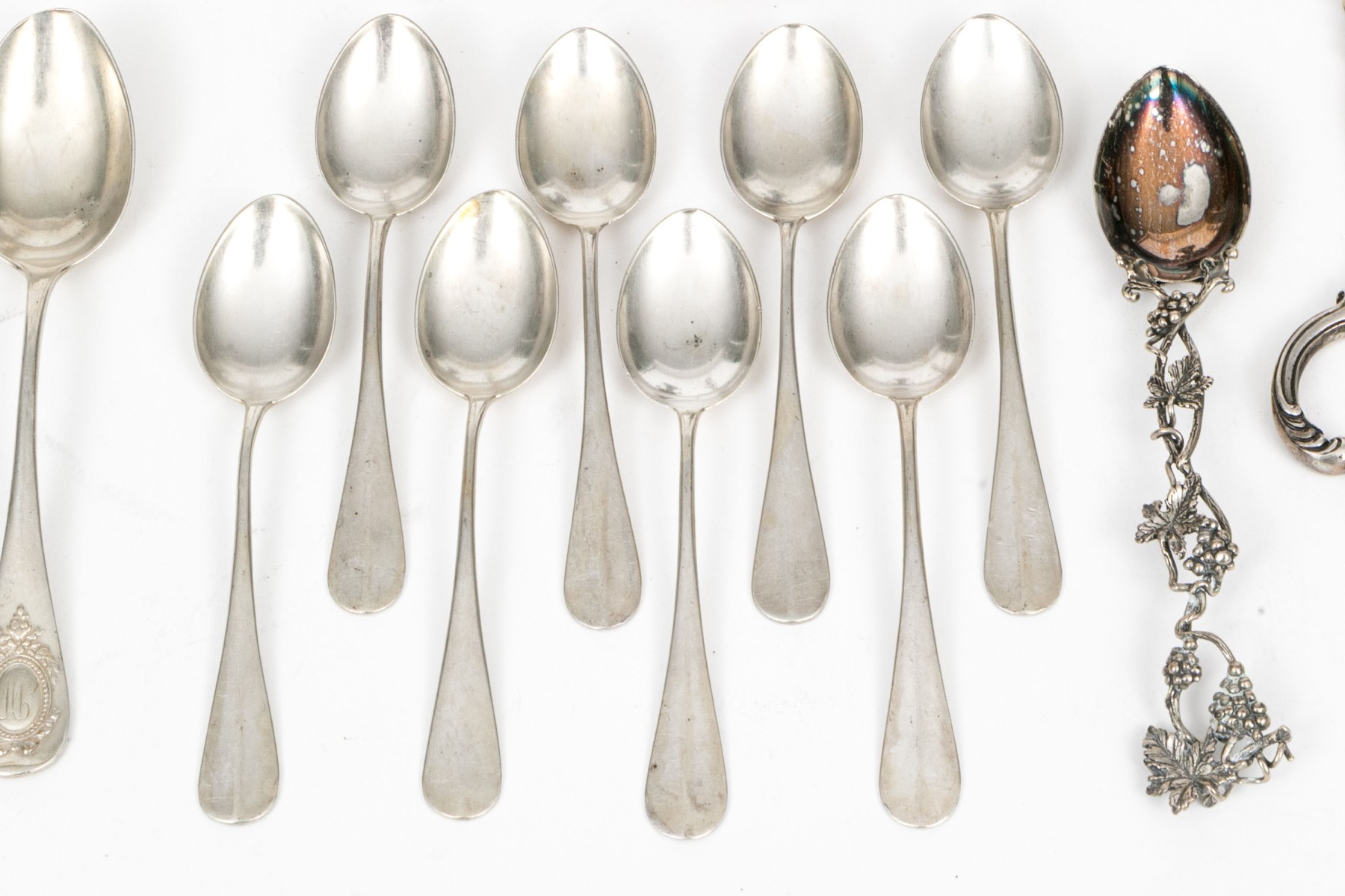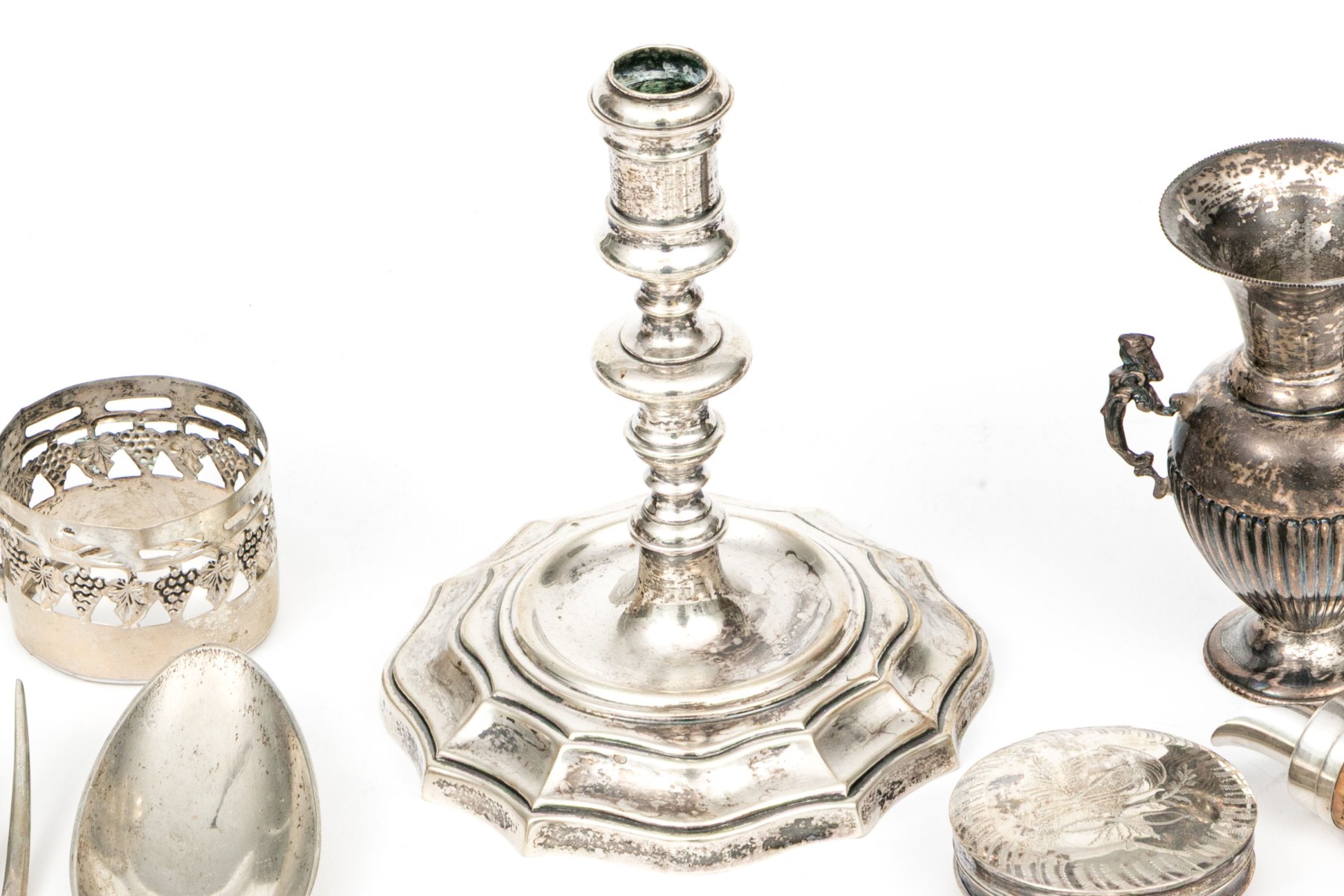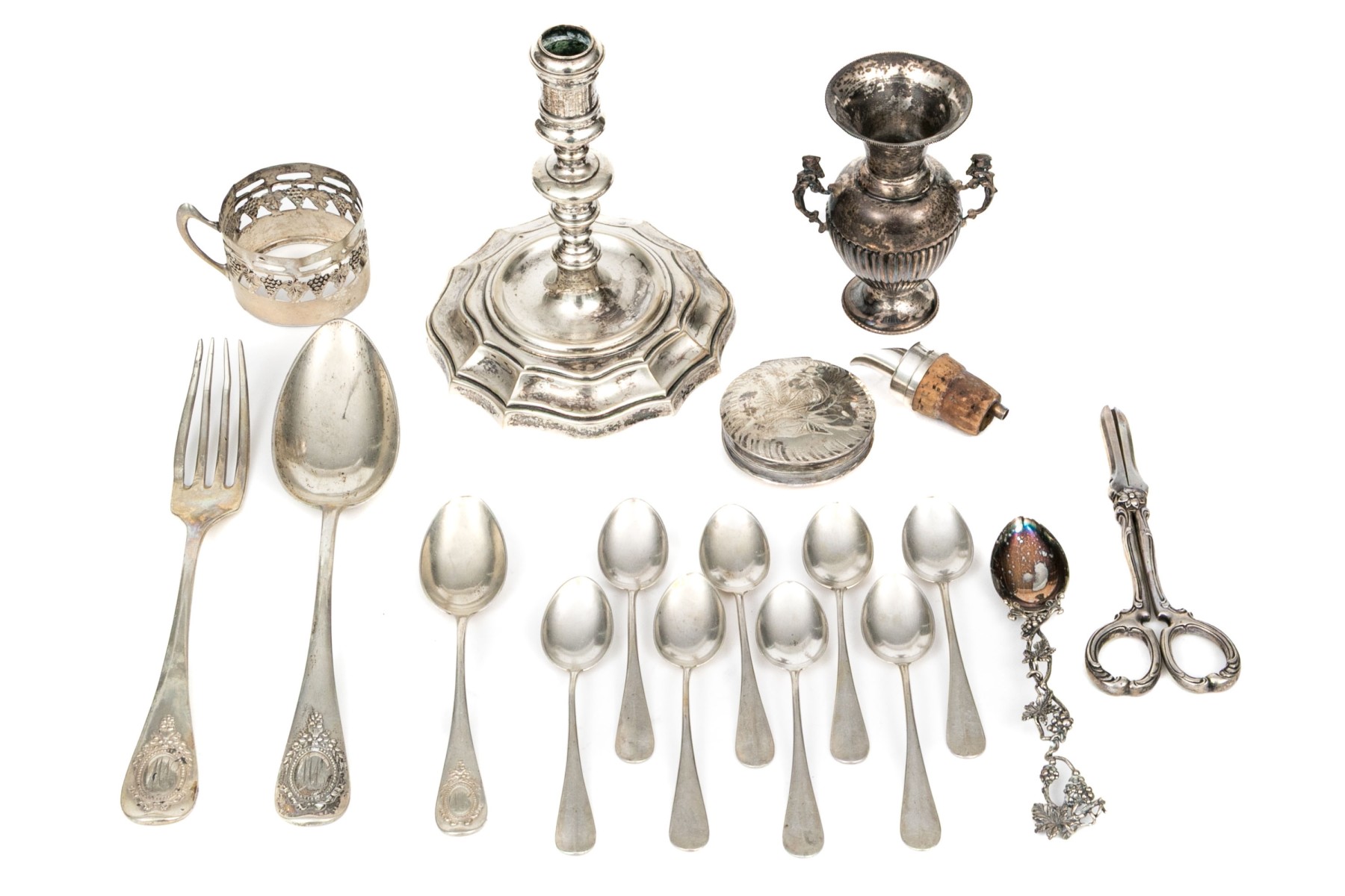 A lovely collection of .800 silver comprised of a single candlestick; forks; a variety of demitasse, tea, and dessert spoons; amongst other items.
