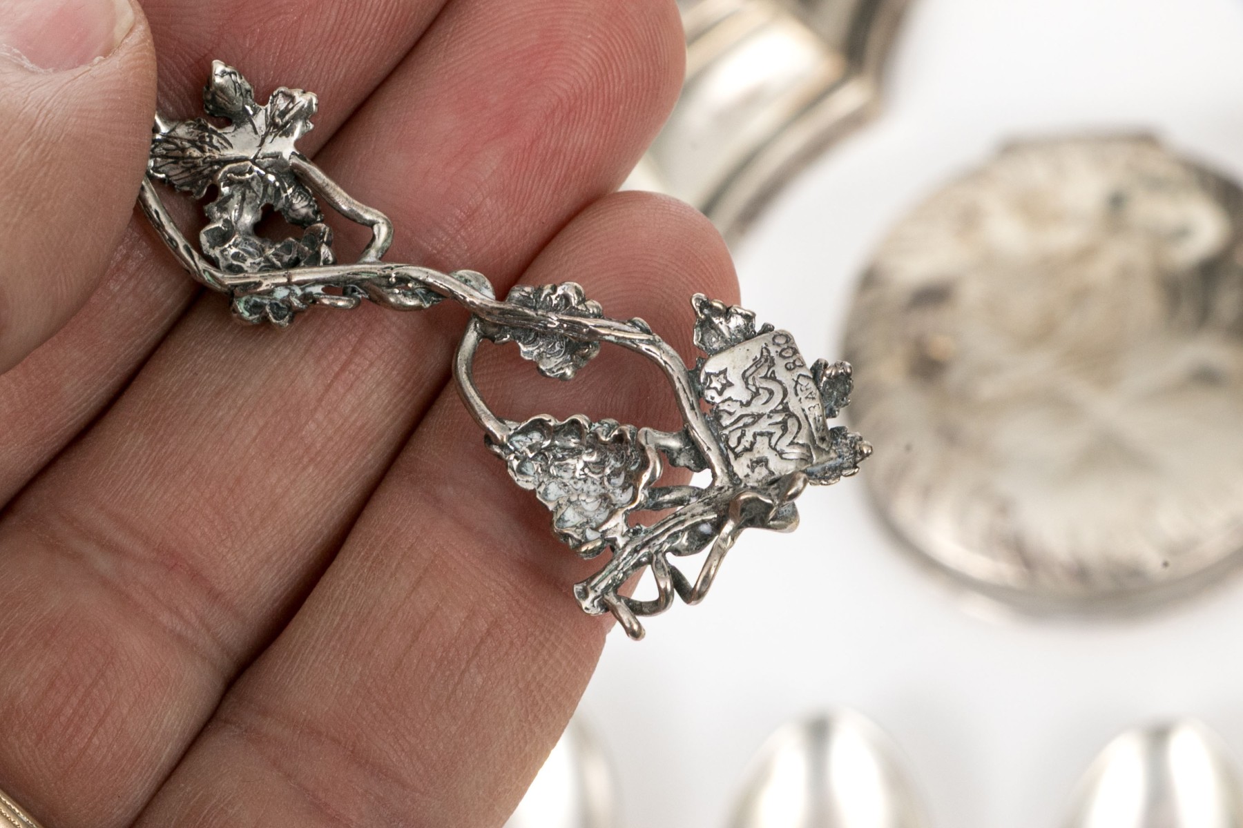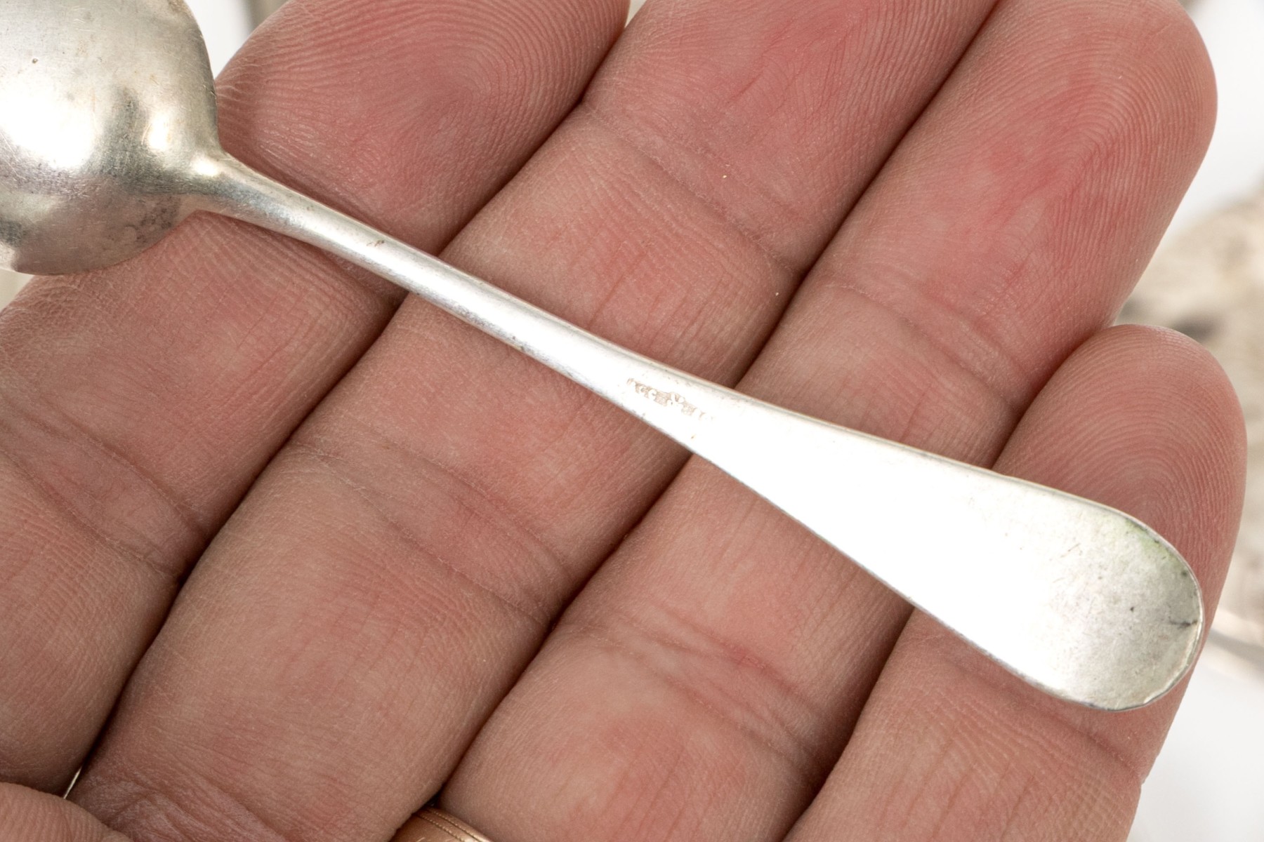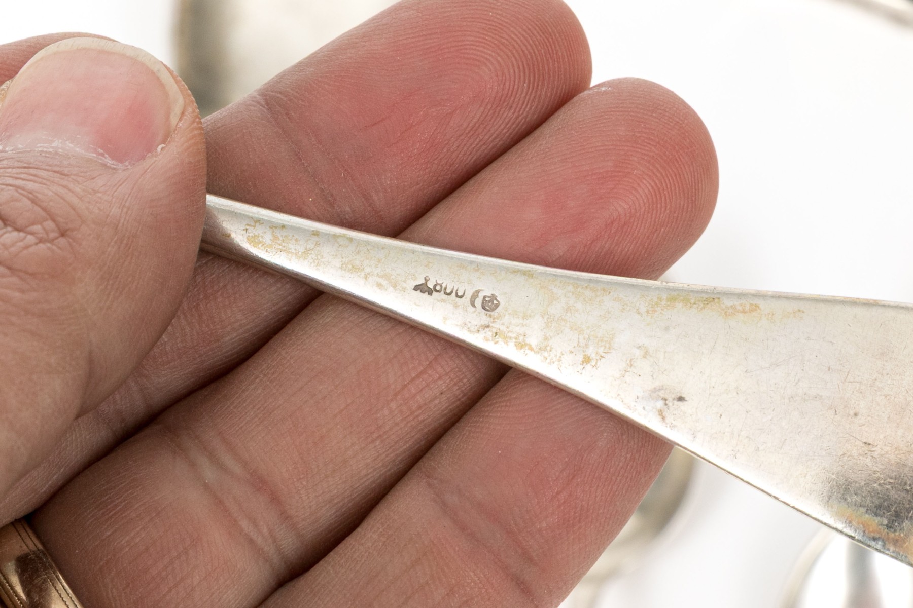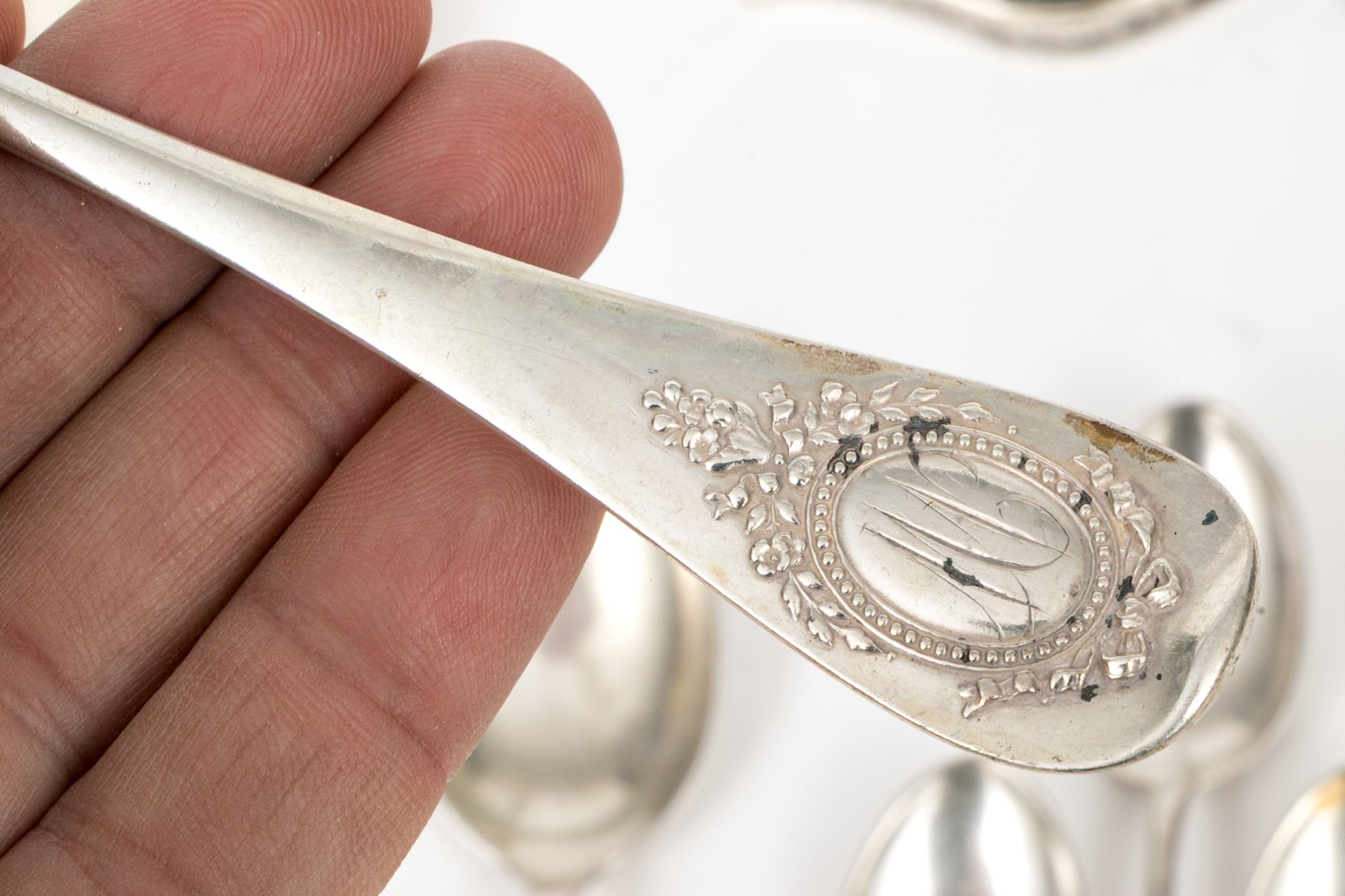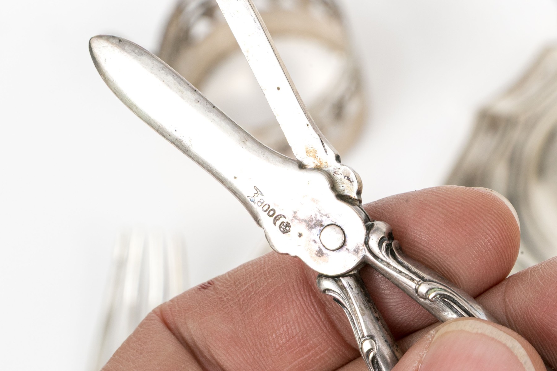 A lovely collection of .800 silver comprised of a single candlestick; forks; a variety of demitasse, tea, and dessert spoons; amongst other items.