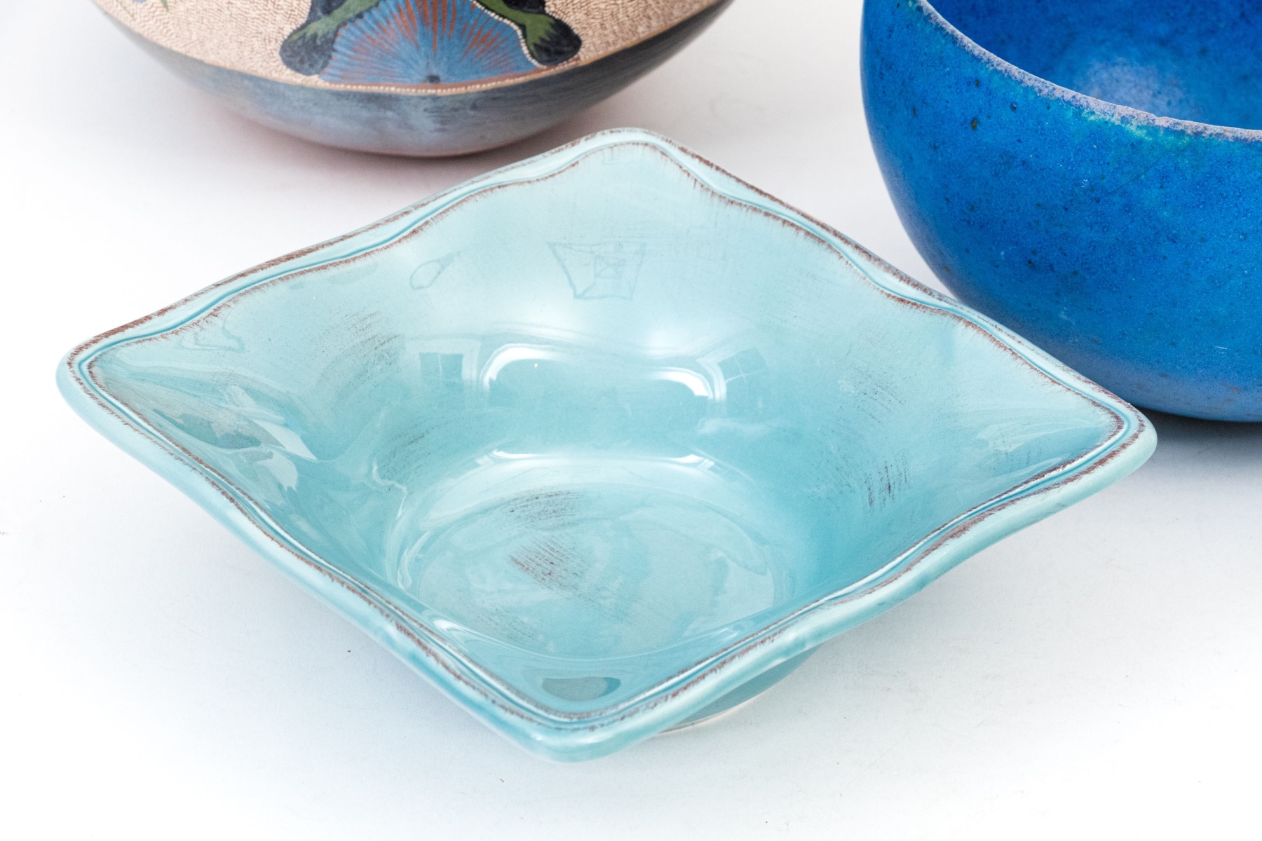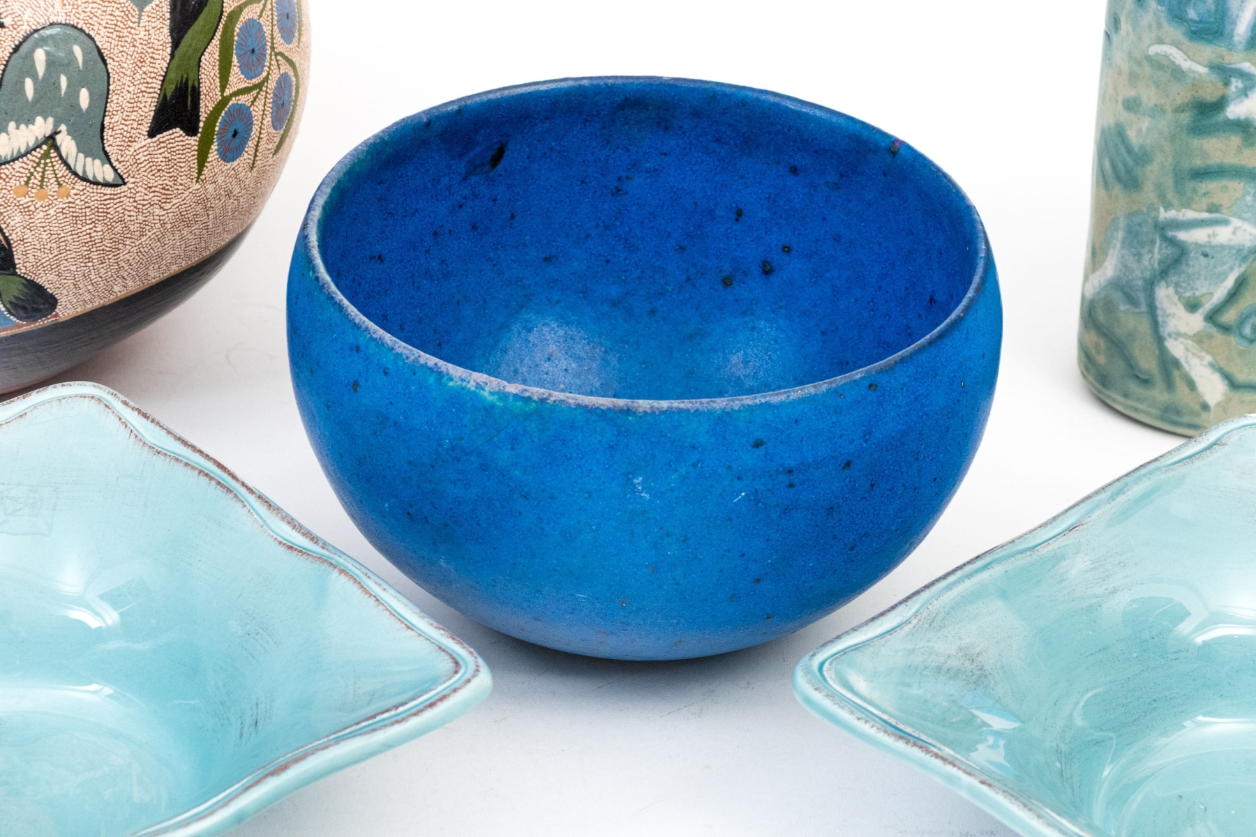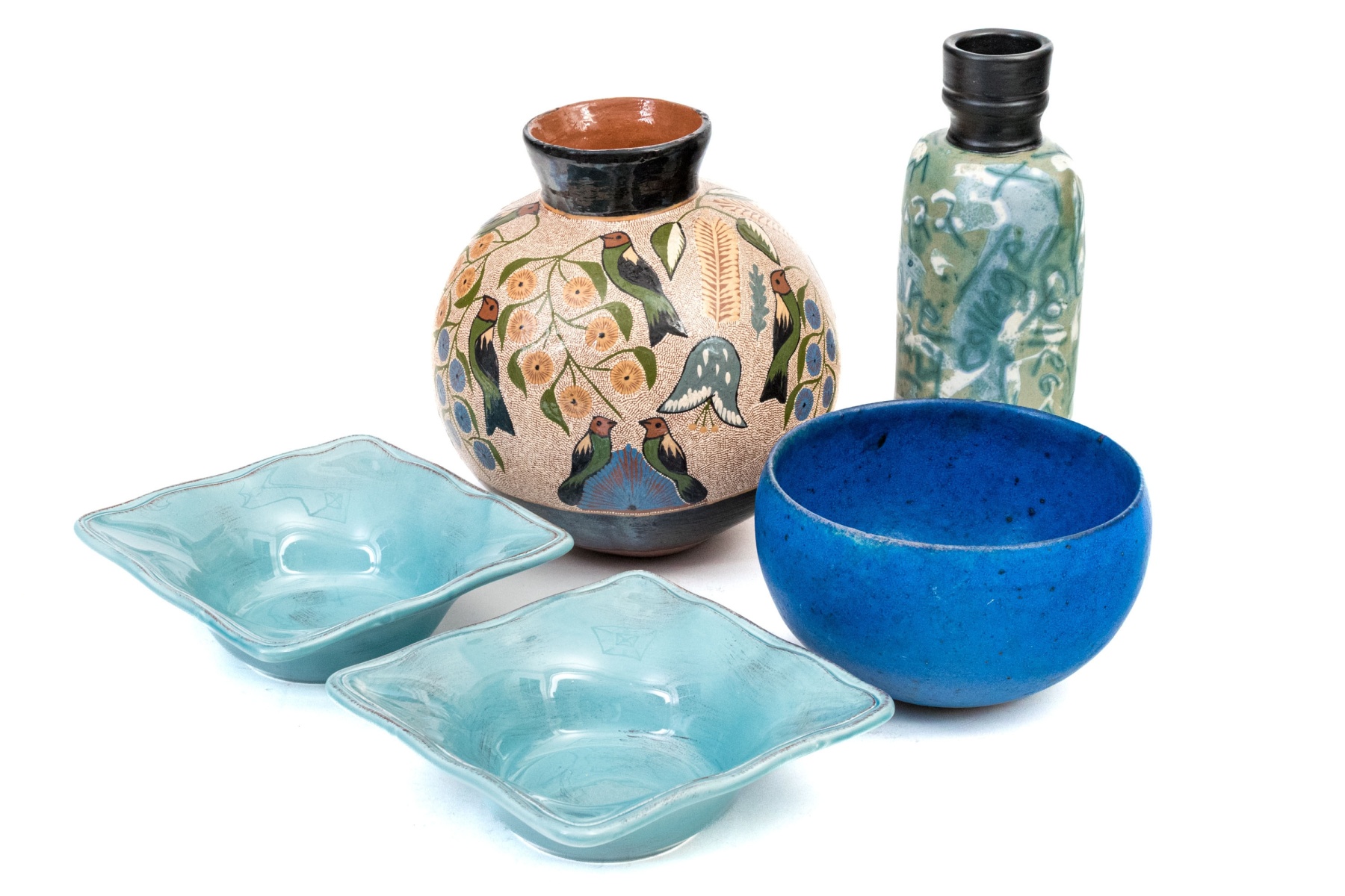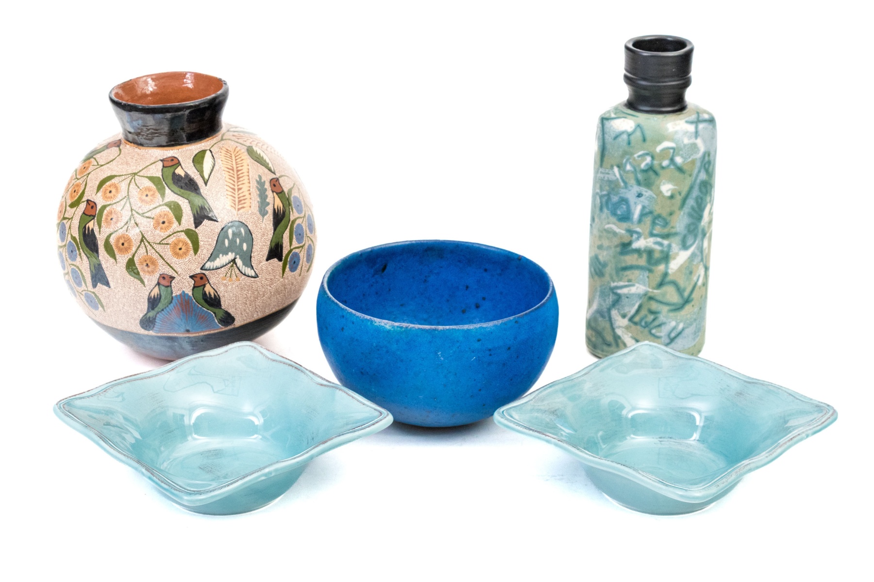 A wonderful collection of ceramic pieces comprised of a pair of celadon glazed square bowls, a blue finished ceramic bowl with small mark to the dark foot, a hand-painted vase with foliage and birds, and an abstract decorated ceramic bottle vase with dark finished neck.