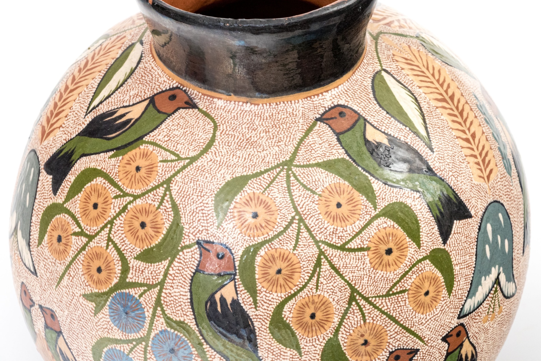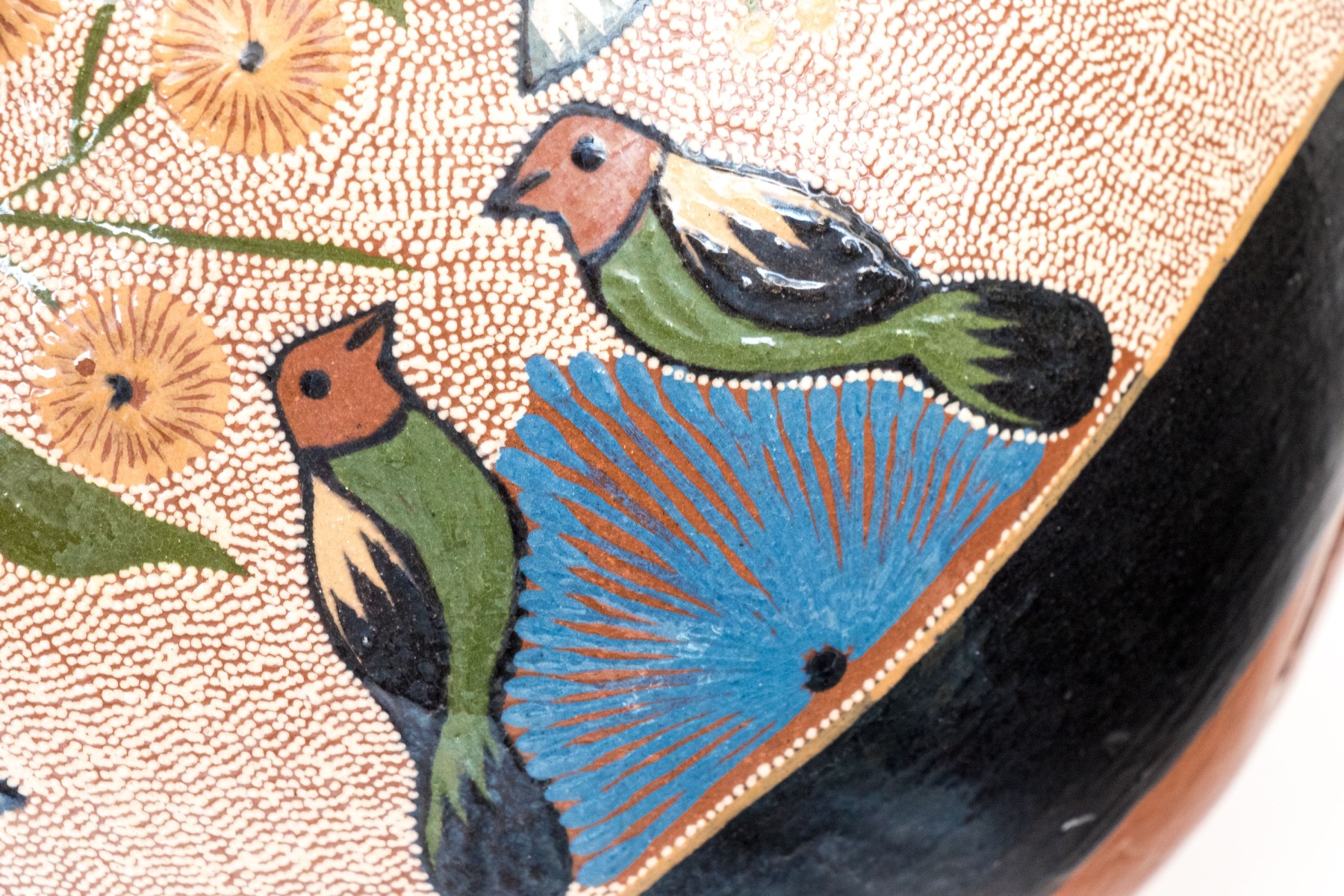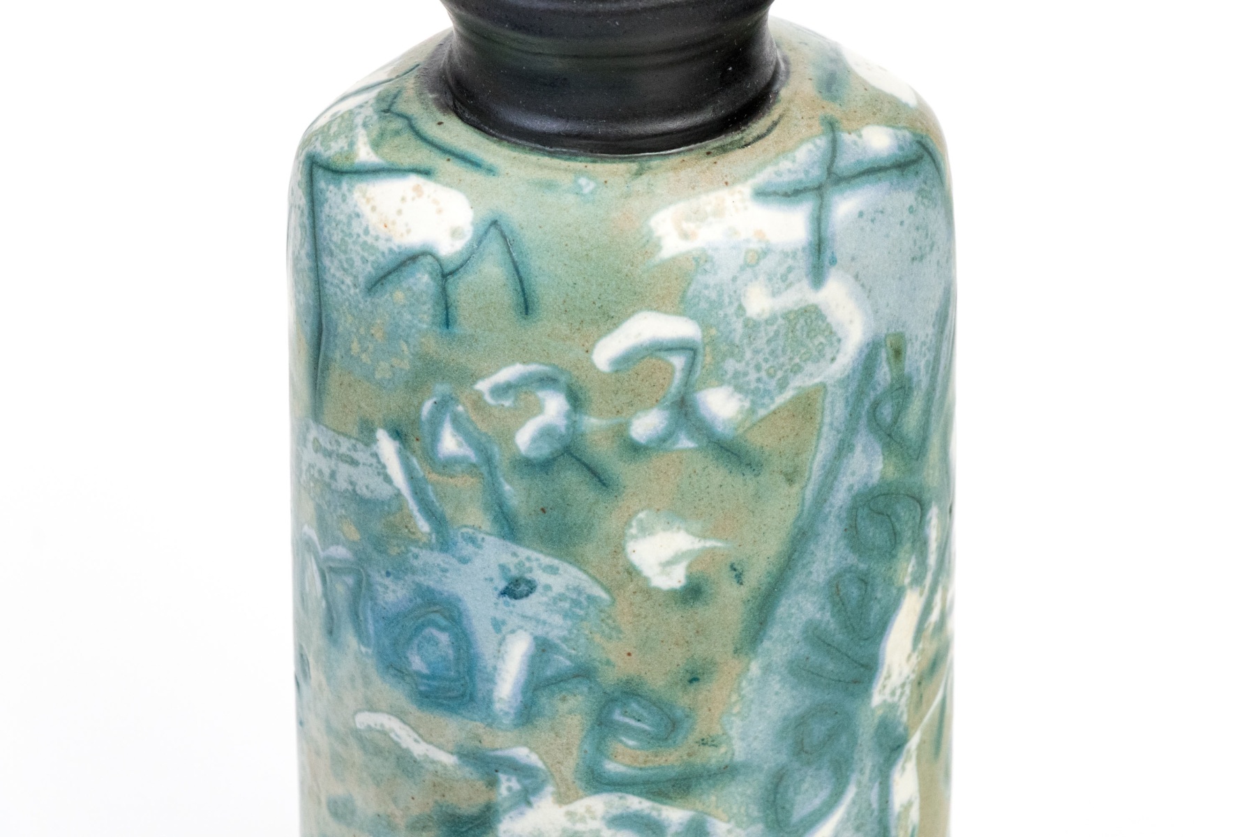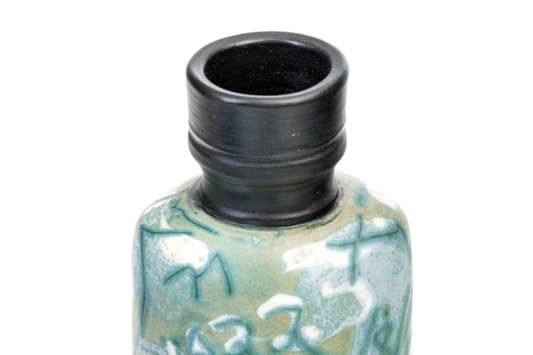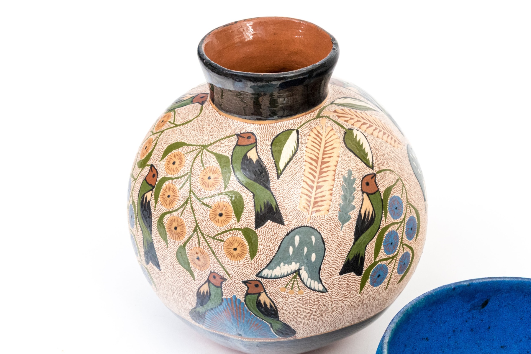 A wonderful collection of ceramic pieces comprised of a pair of celadon glazed square bowls, a blue finished ceramic bowl with small mark to the dark foot, a hand-painted vase with foliage and birds, and an abstract decorated ceramic bottle vase with dark finished neck.