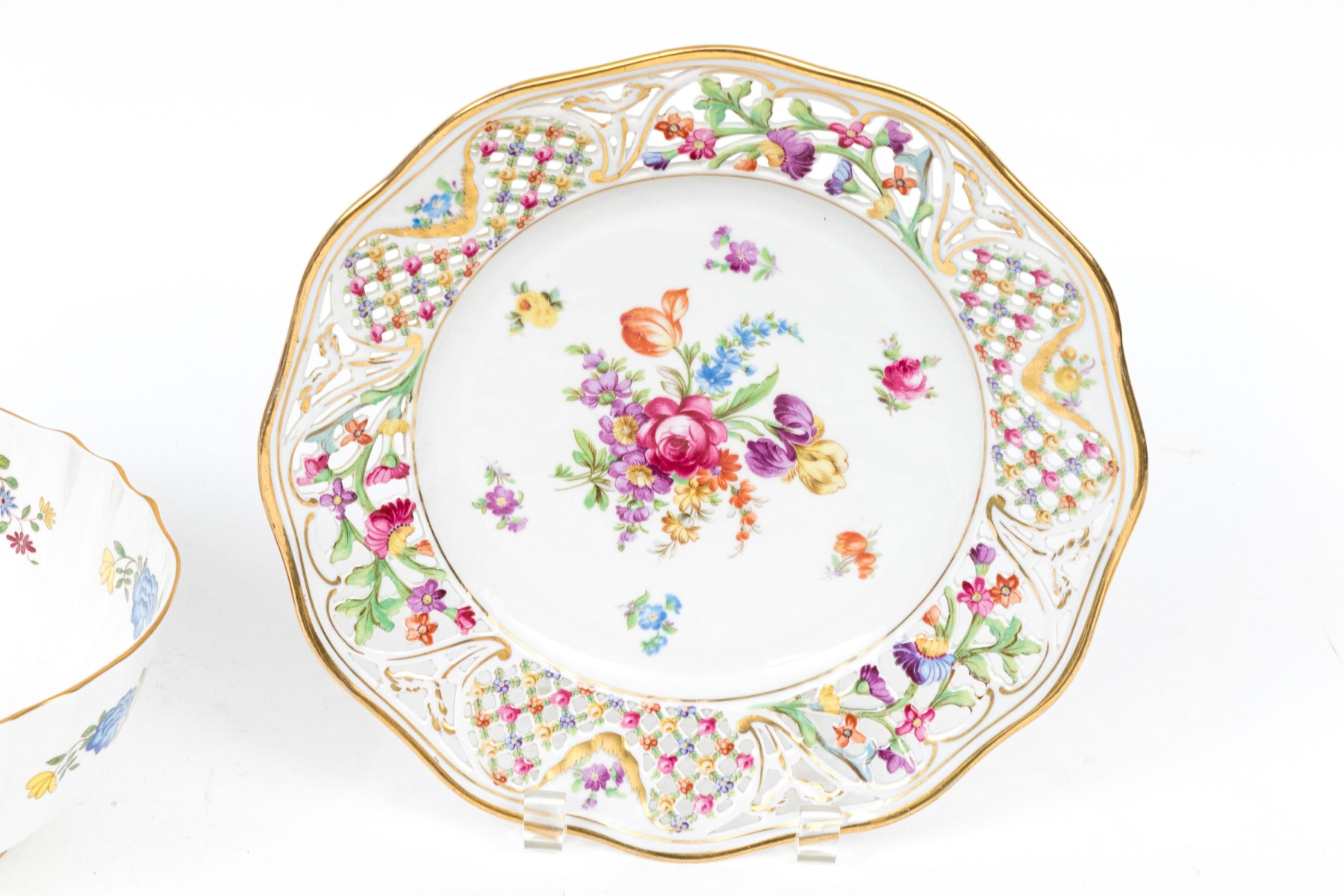 An Schumann Bavaria porcelain pierced plate with flroal spray to center and pierced openwork outer border with scalloped and gilt trim : 10 1/2" dia.