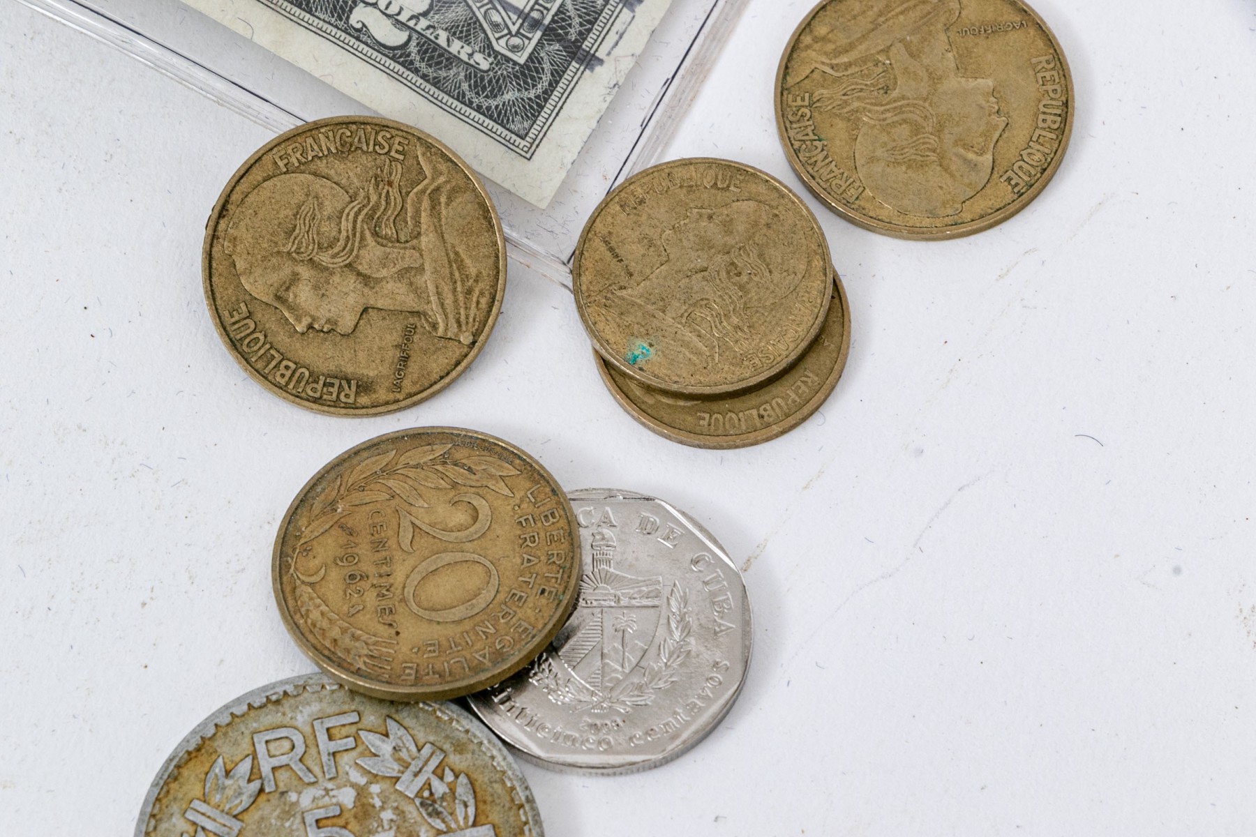 Approx. 30 plus coins with numerous paper bills of assorted origin.