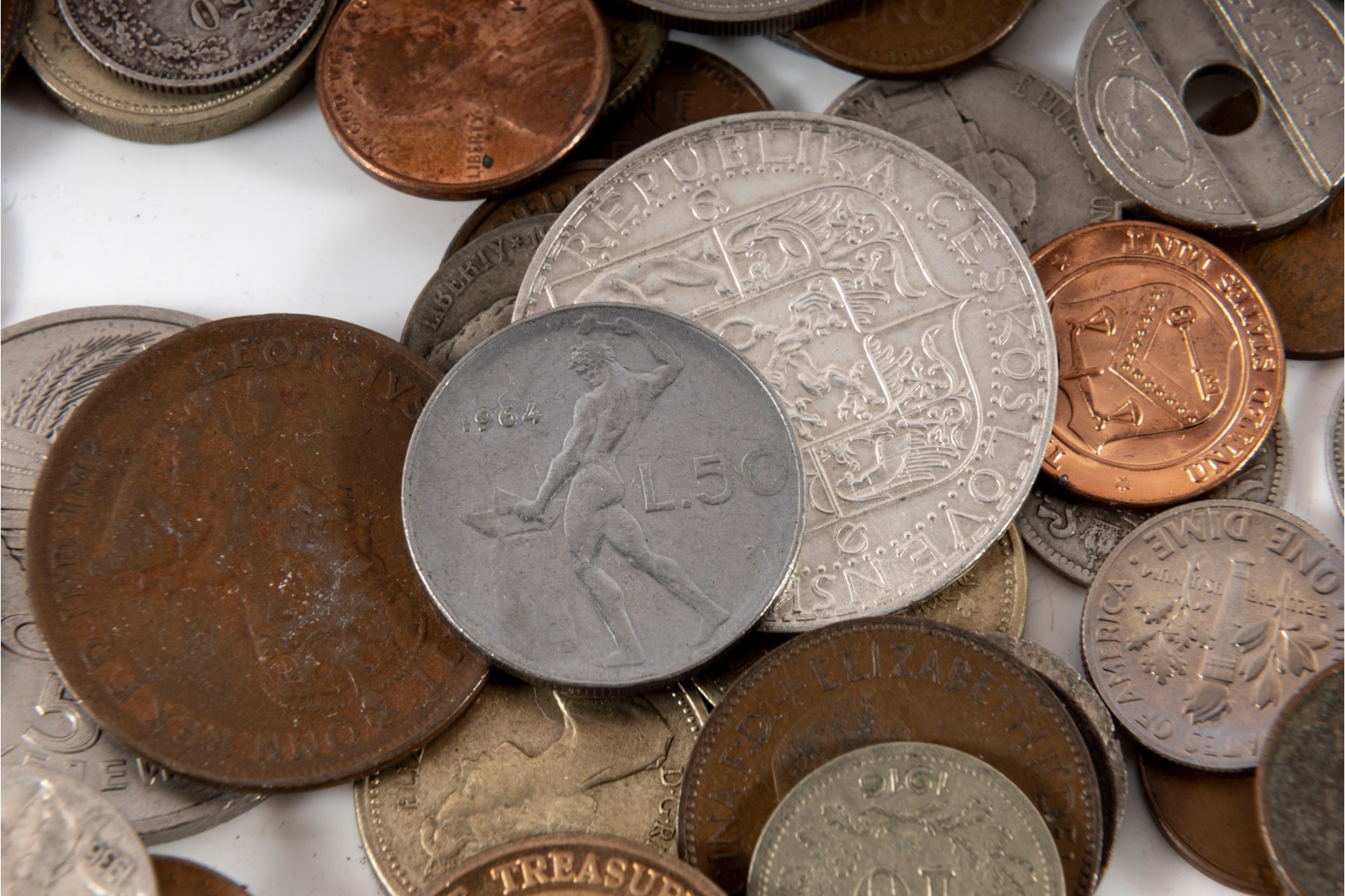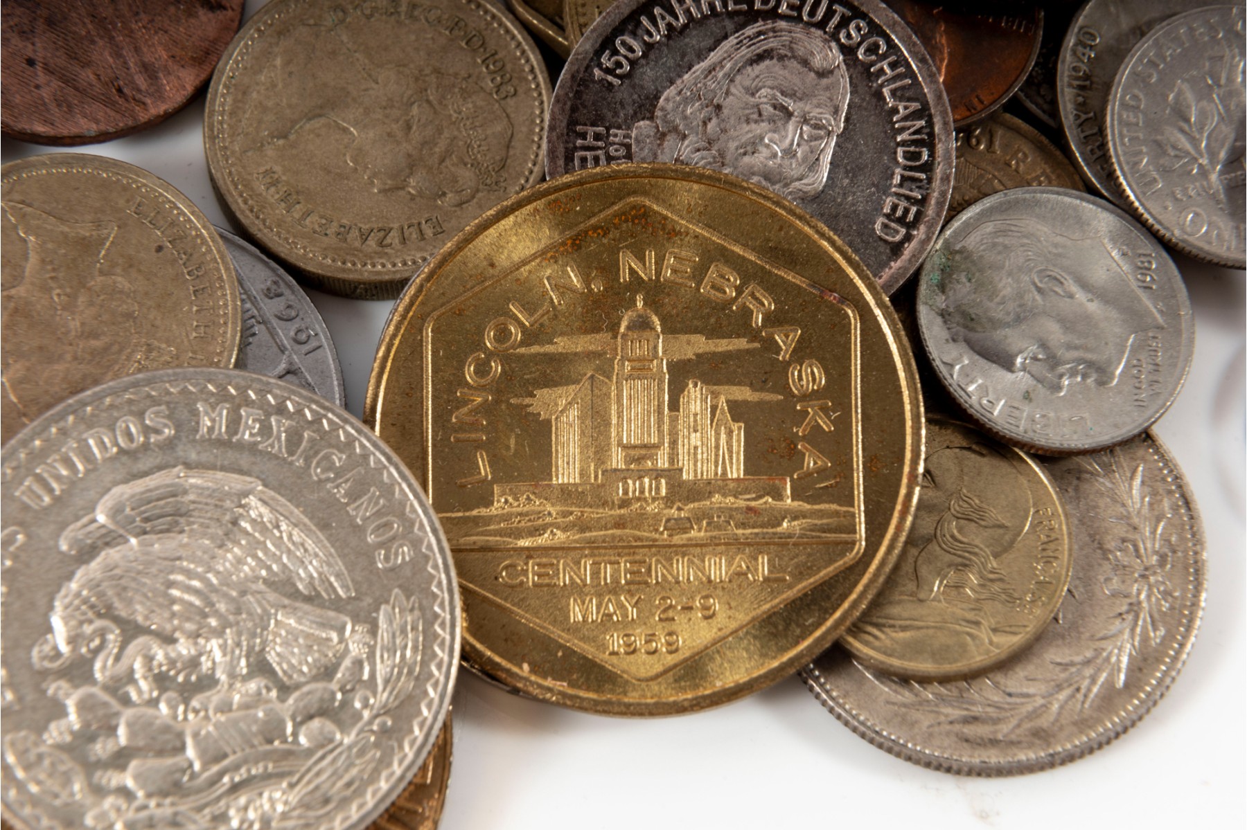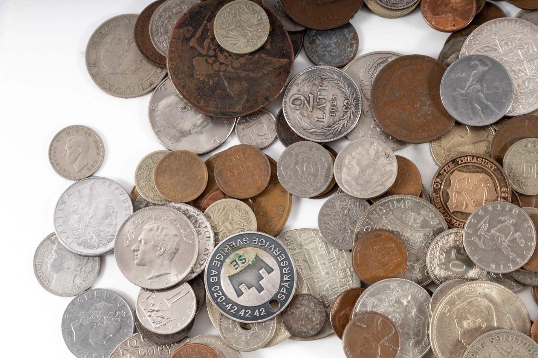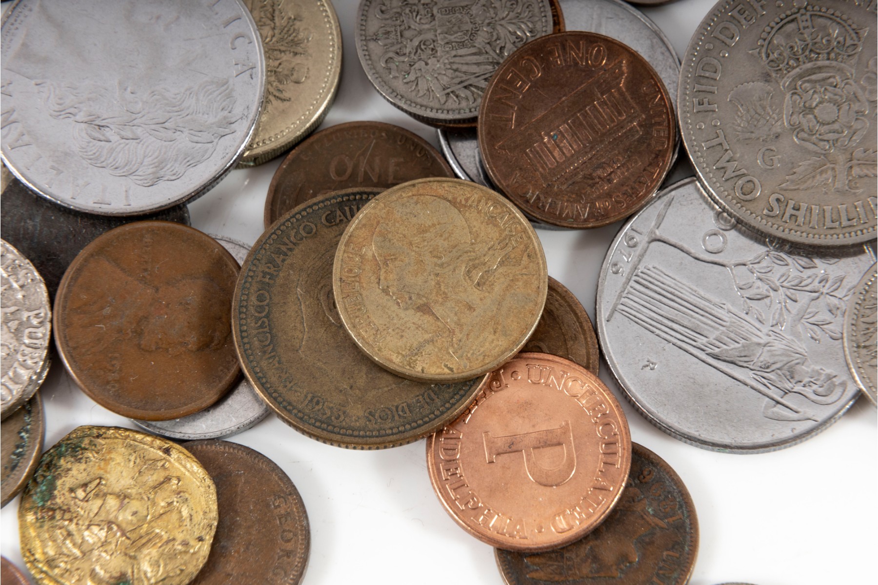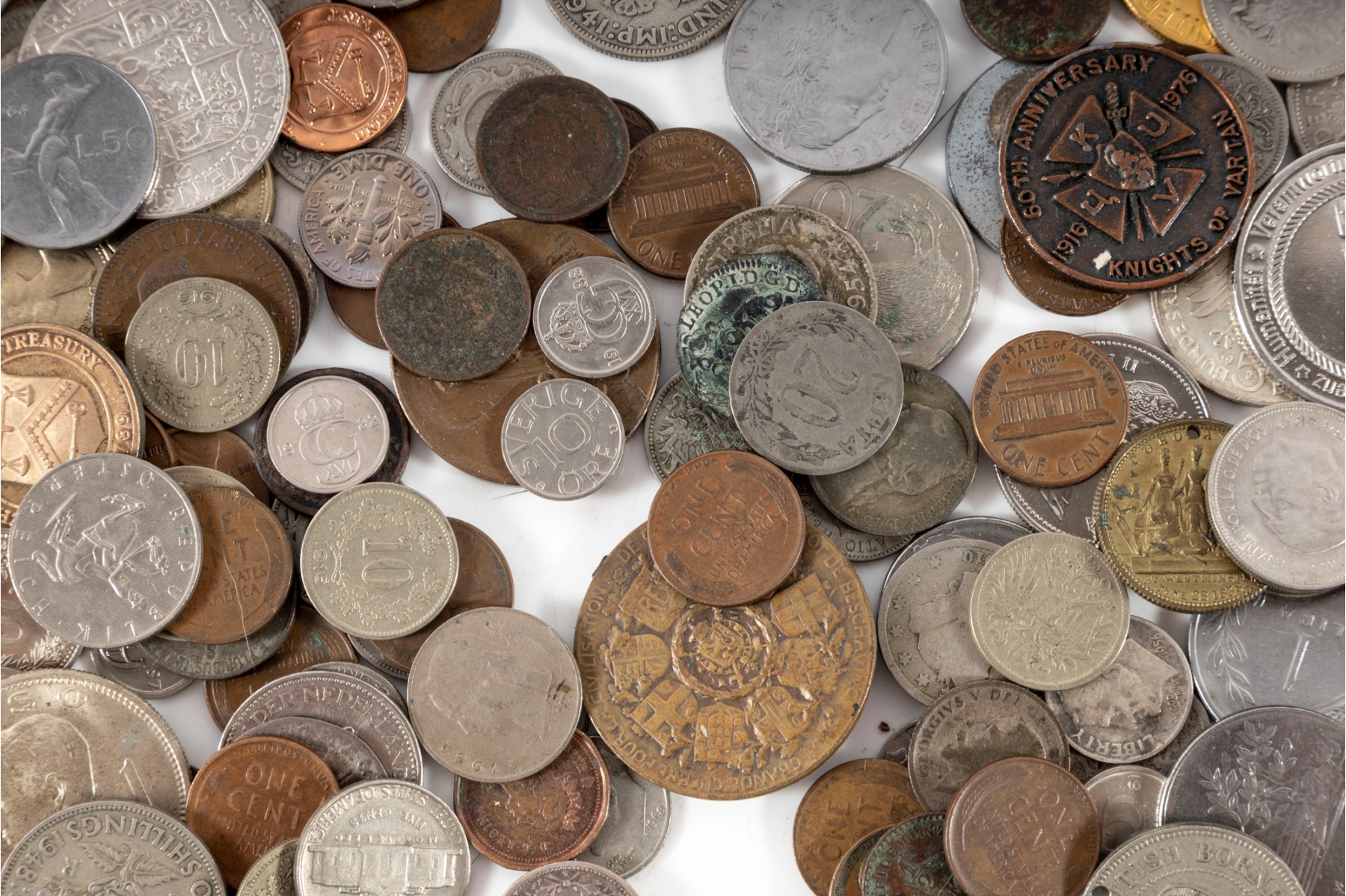 This treasure trove of assorted foreign coins and tokens offers an eclectic mix of currency from around the world. The collection features coins of varying sizes, shapes, and materials—ranging from copper, nickel, and brass to silver. Contents as shown and sold as is, see photos for details.