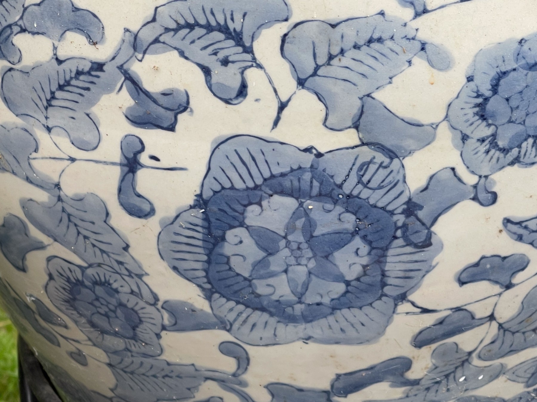 An assorted collection including a blue and white jardiniere, a cauldron form ceramic jardiniere with two handles and bulbous body, a large Chinese style straw glazed ceramic jardiniere, two pairs of black metal plant stands and a small ceramic garden gnome