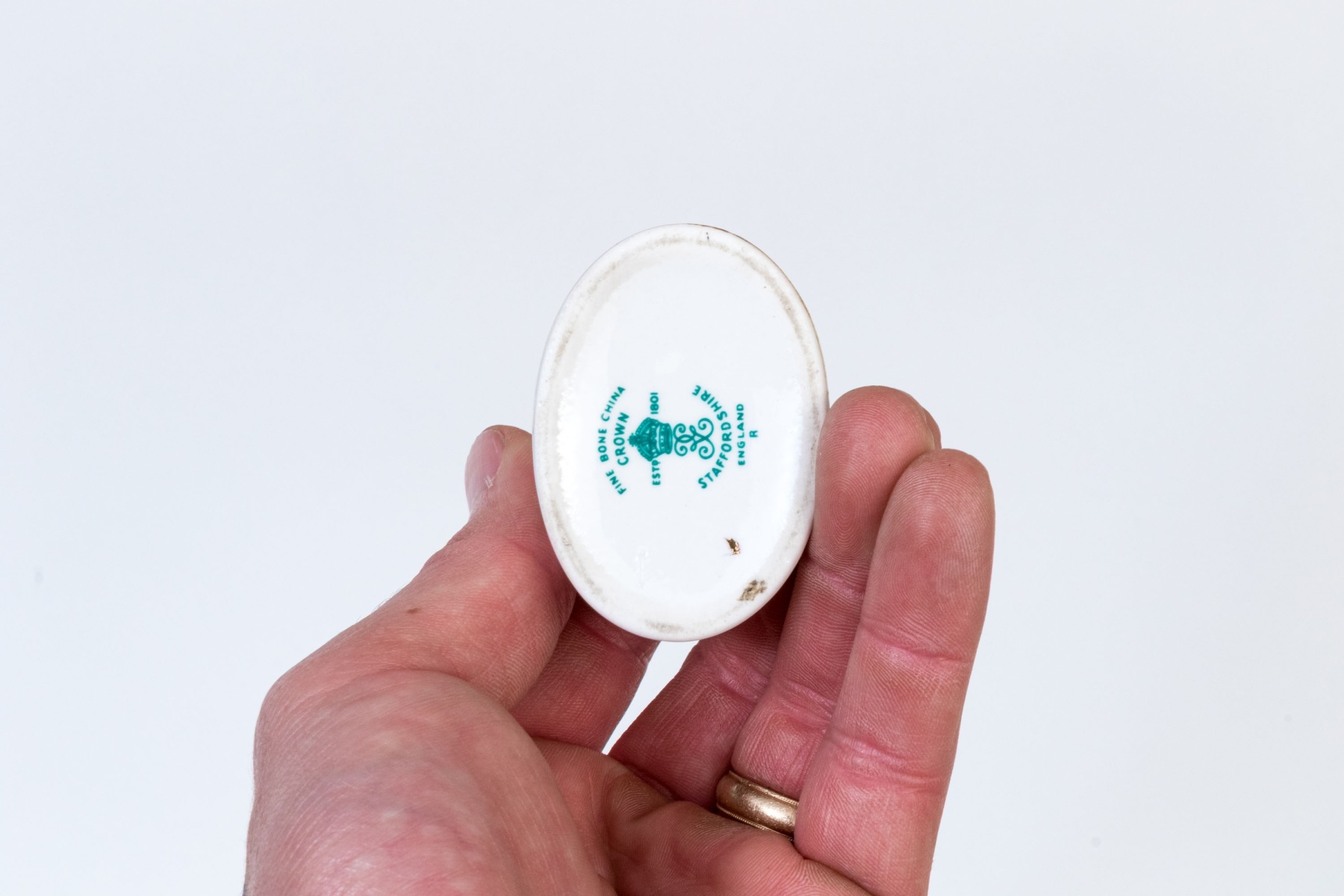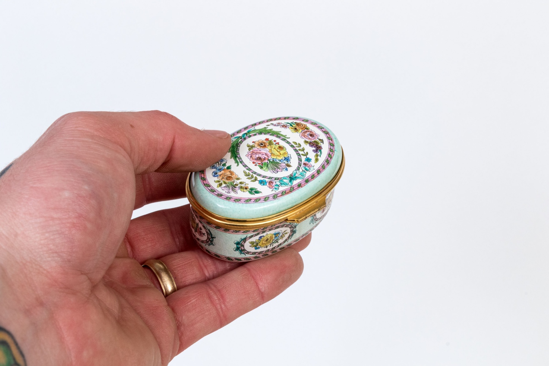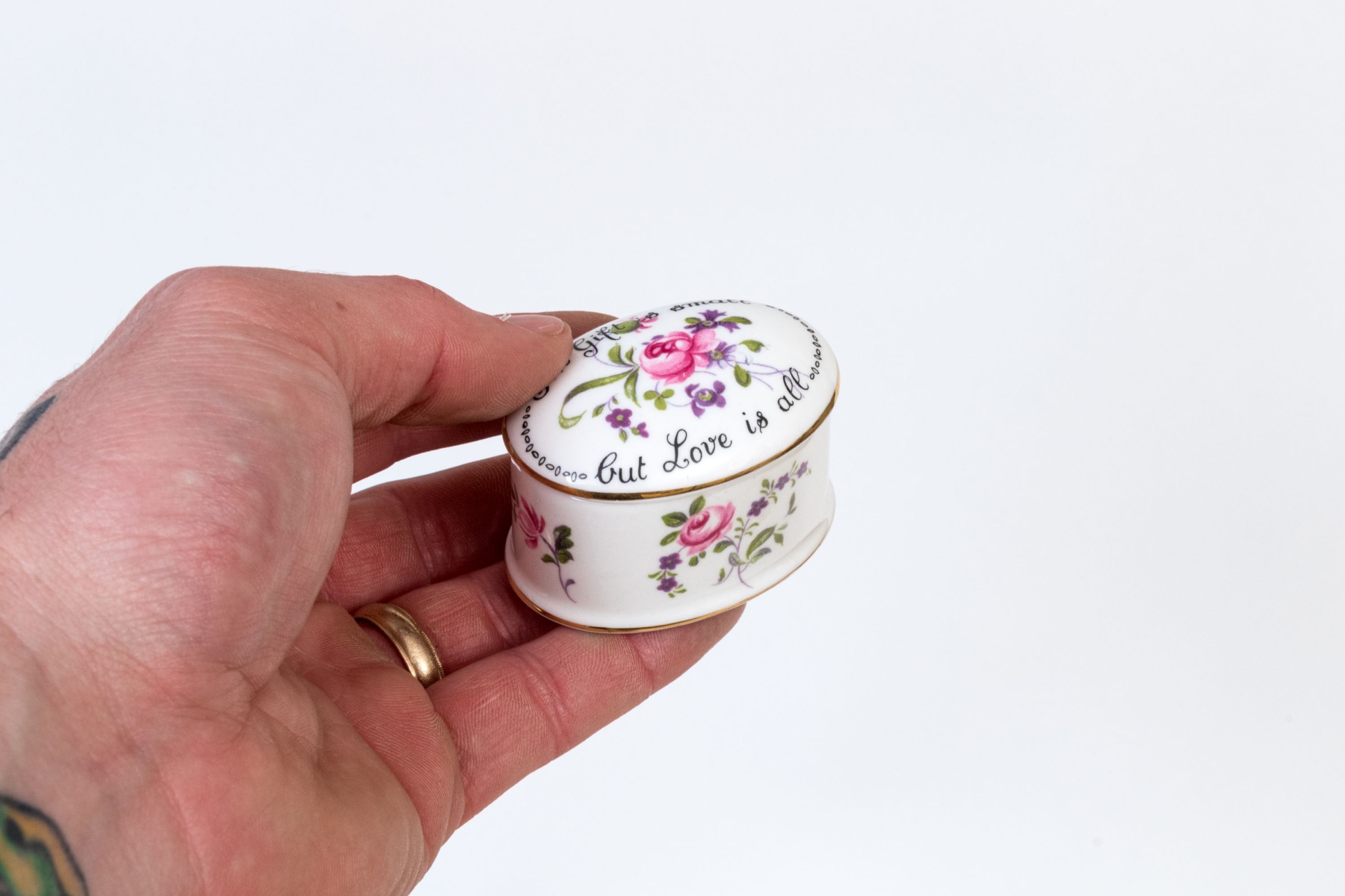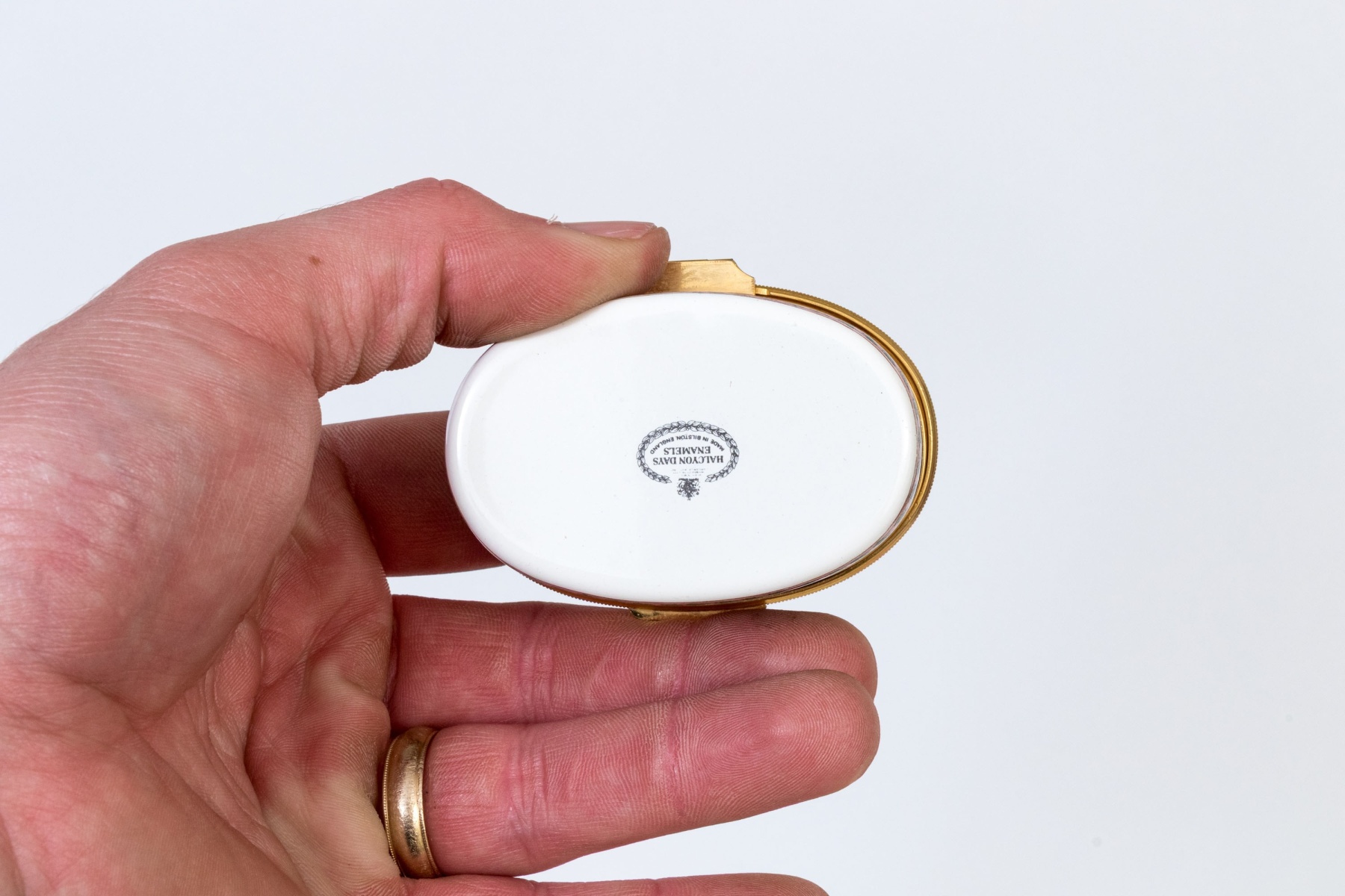 Halcyon days porcelain box: 2 3/4"; lid is loose from base