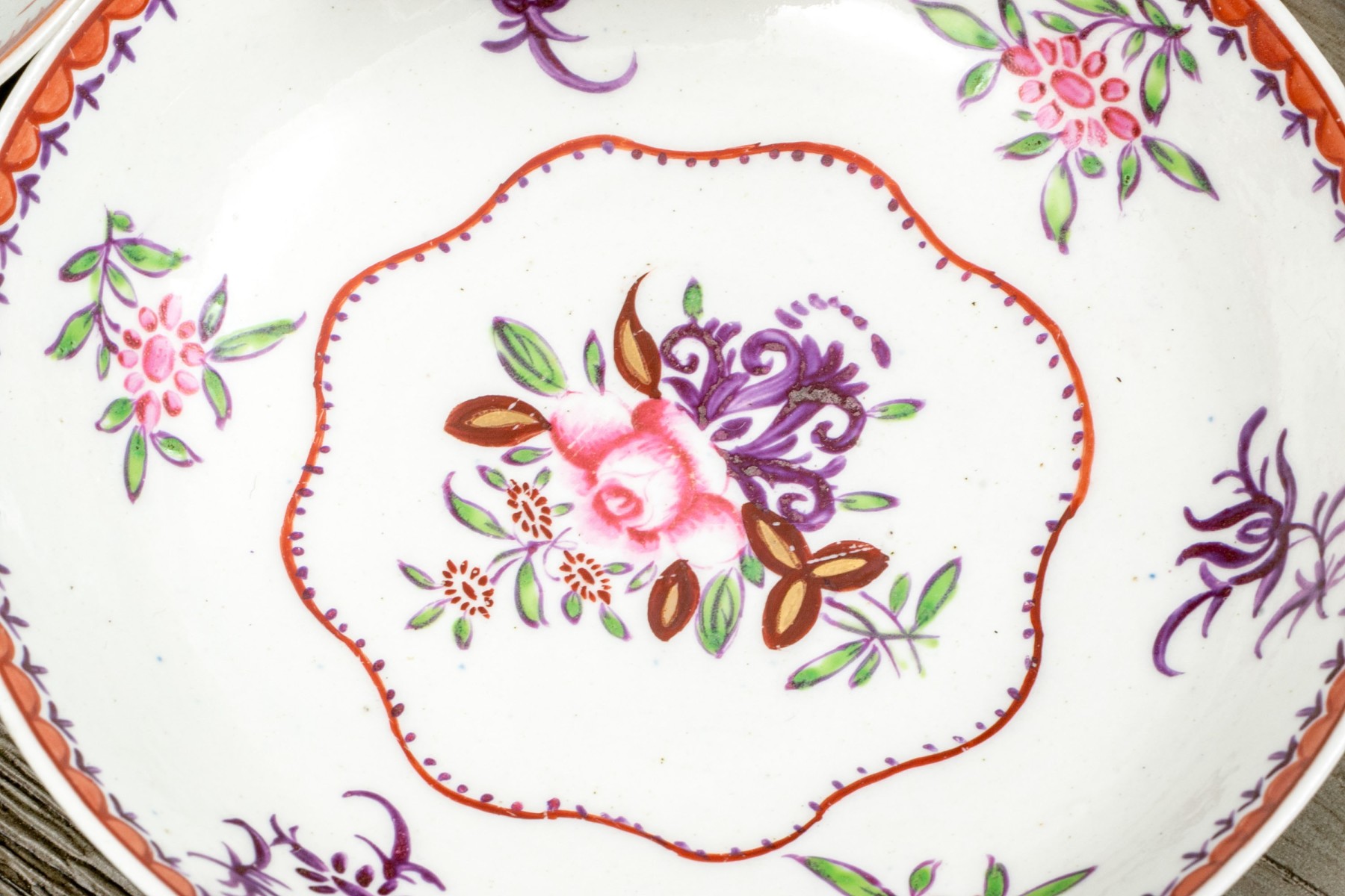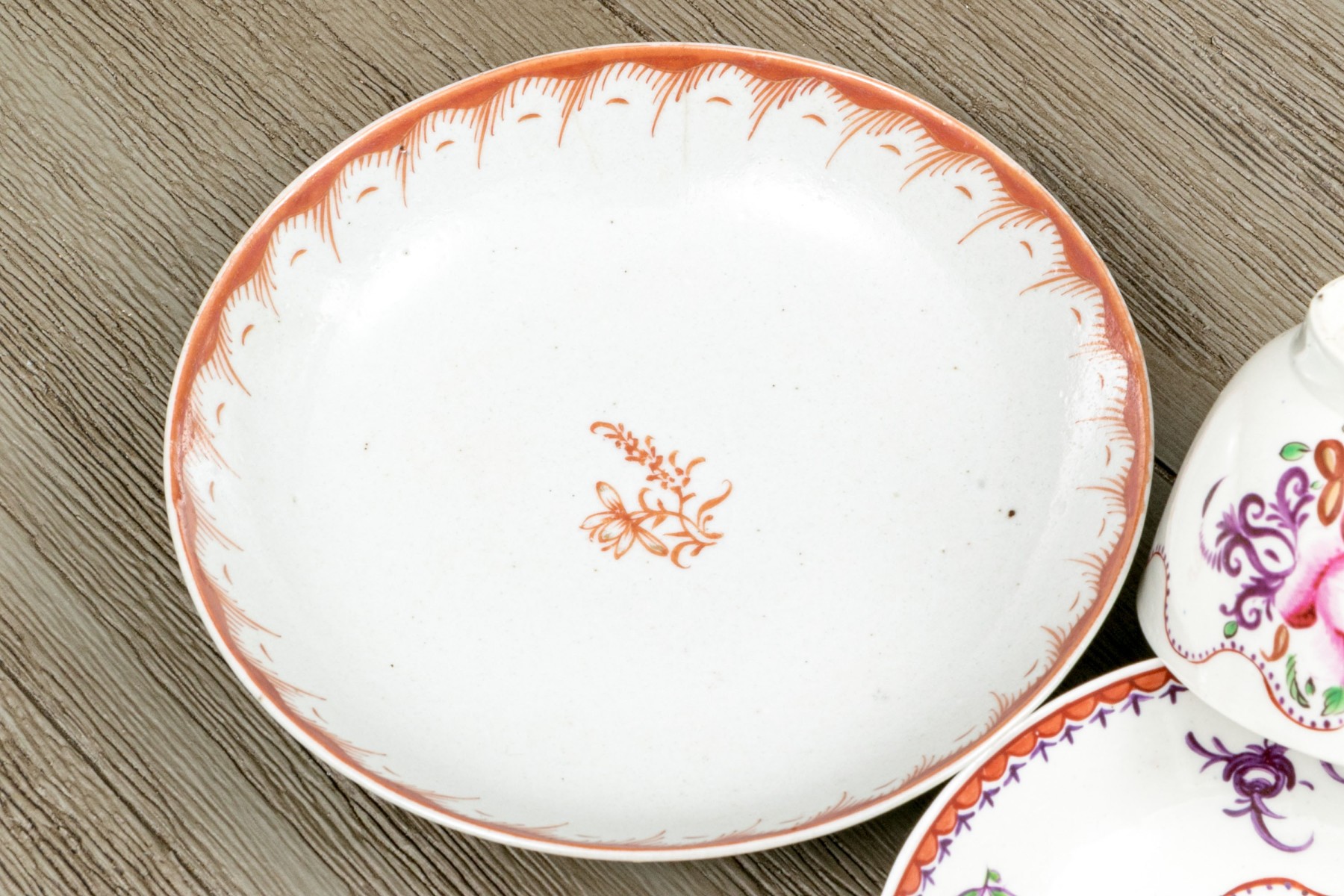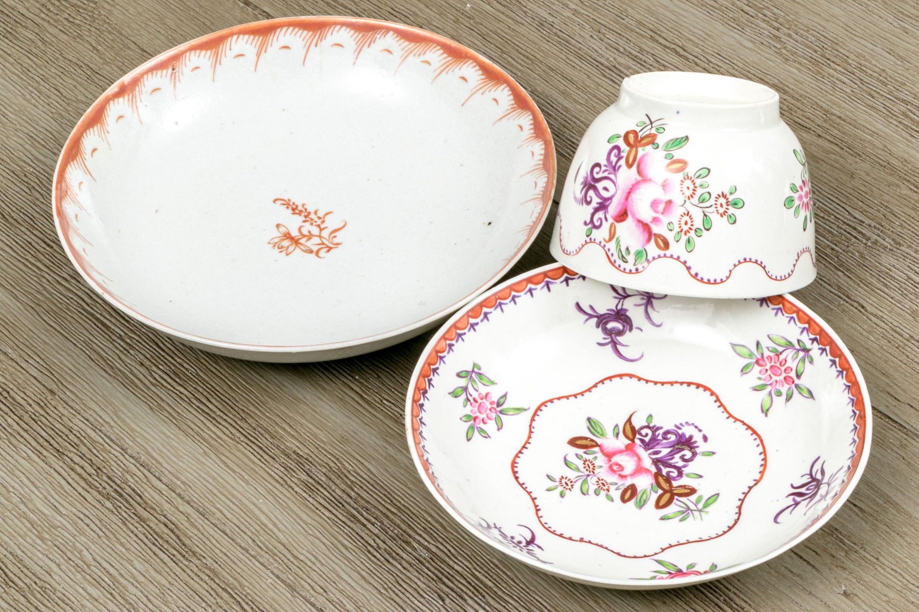 A wonderful group of Chinese export porcelain including a wide, shallow dish with an orange-red decorative border and a dainty floral spray at the center. Accompanied by a teacup and saucer with polychromatic florals and undulating borders.