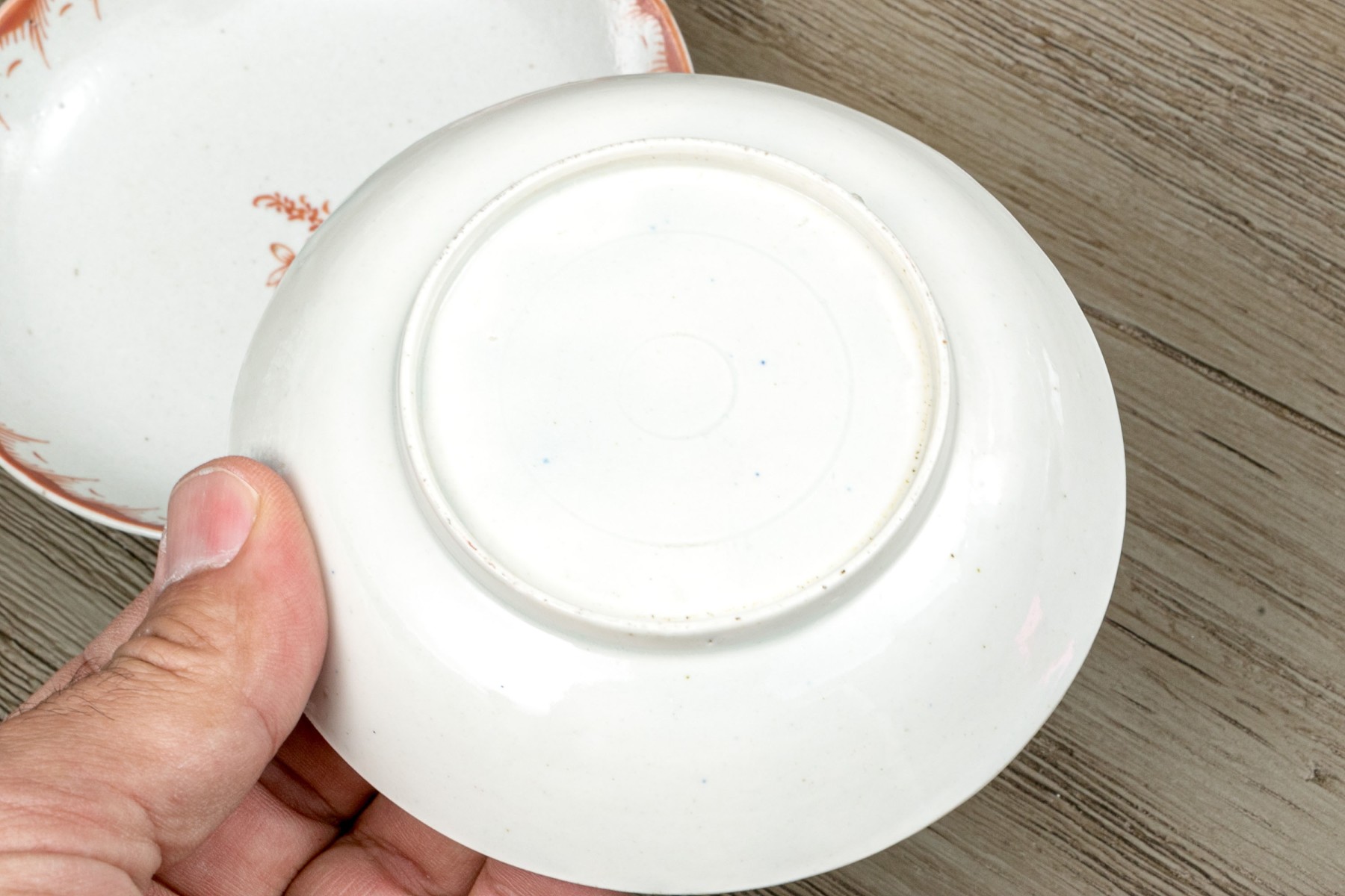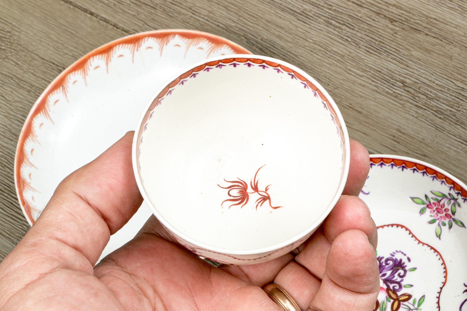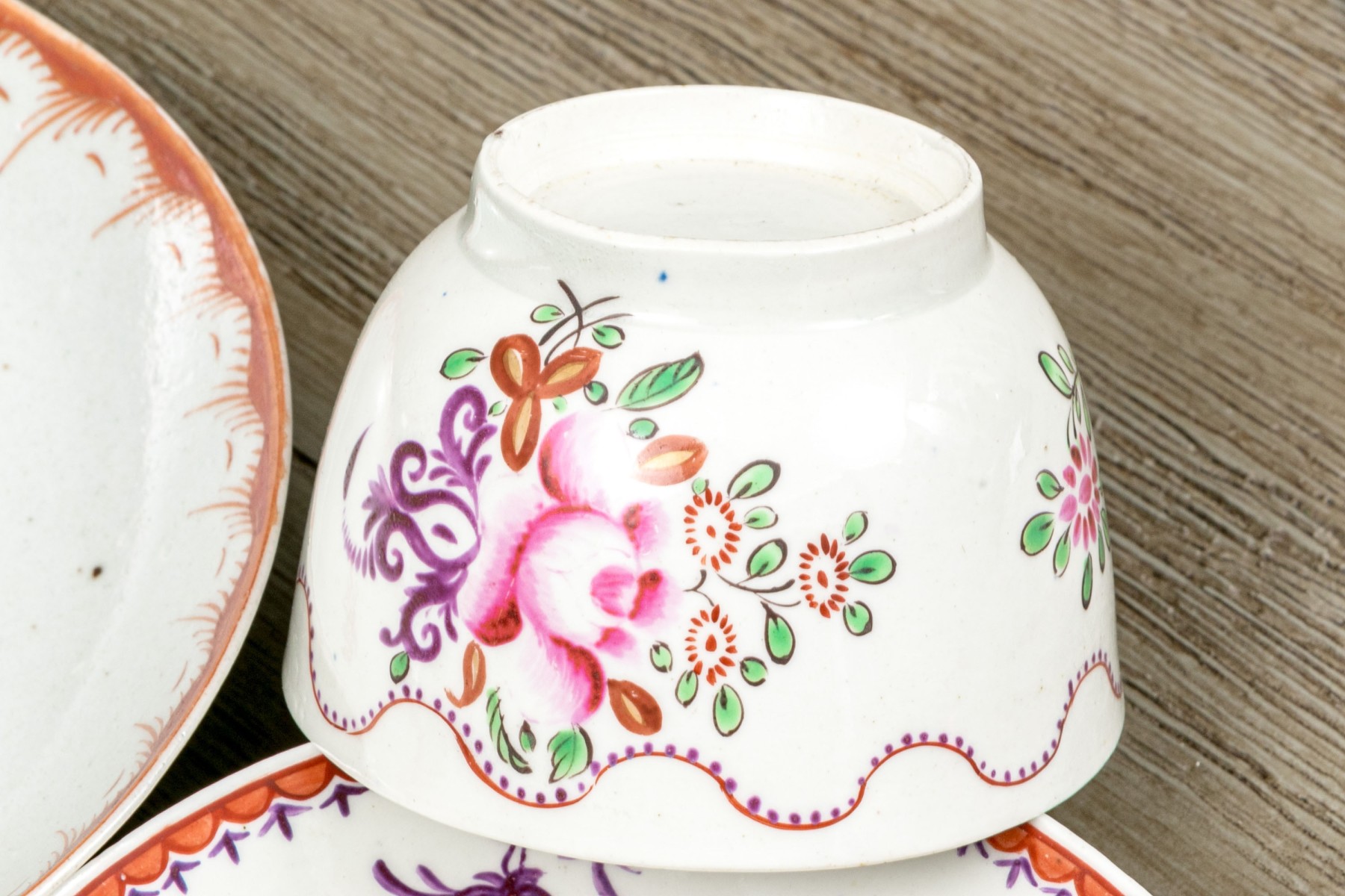 A wonderful group of Chinese export porcelain including a wide, shallow dish with an orange-red decorative border and a dainty floral spray at the center. Accompanied by a teacup and saucer with polychromatic florals and undulating borders.